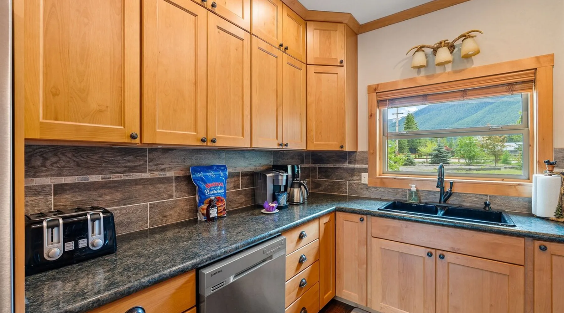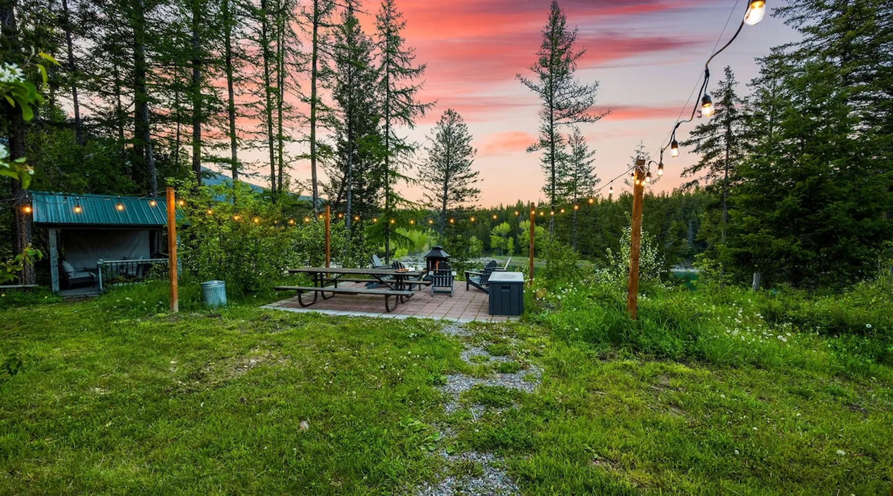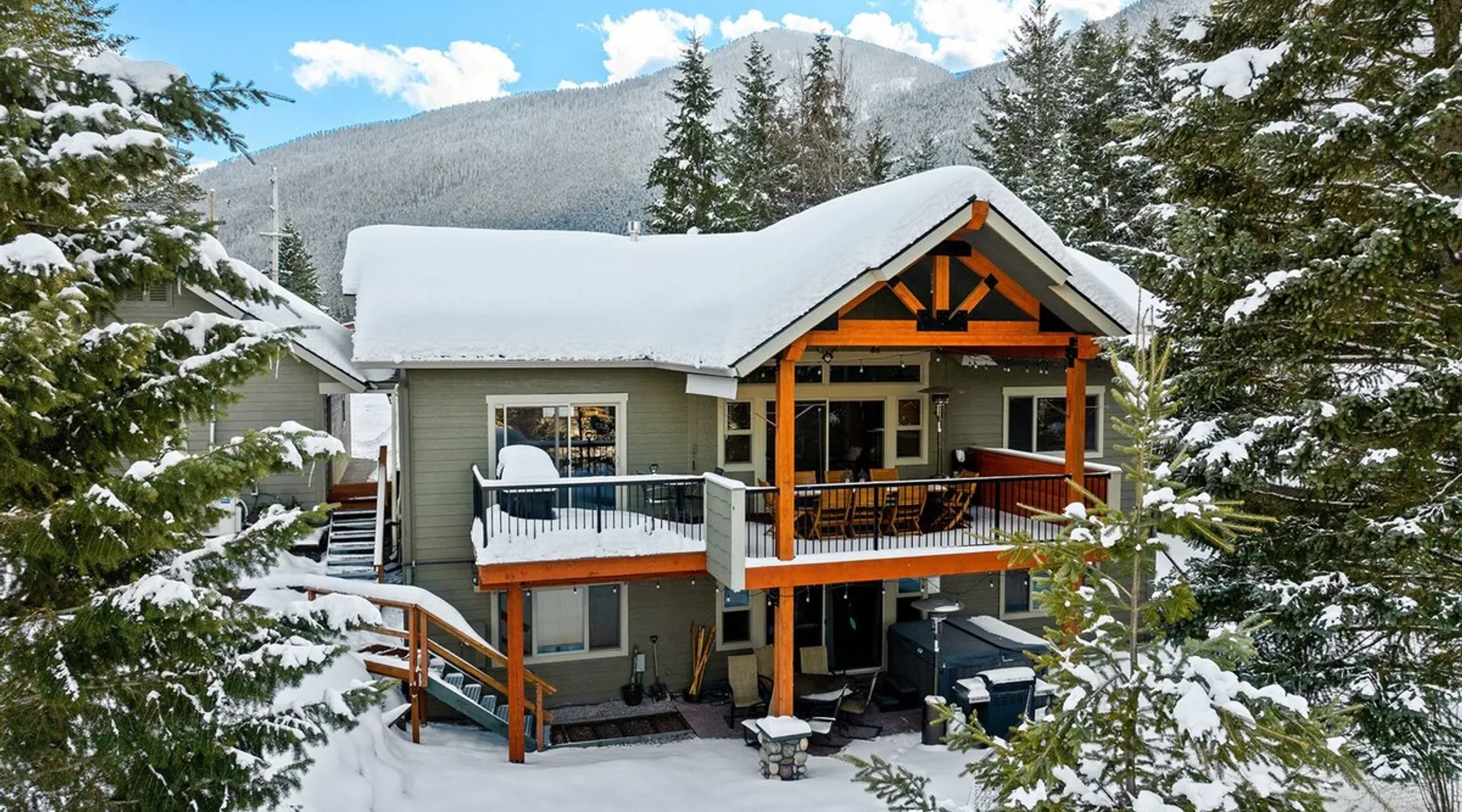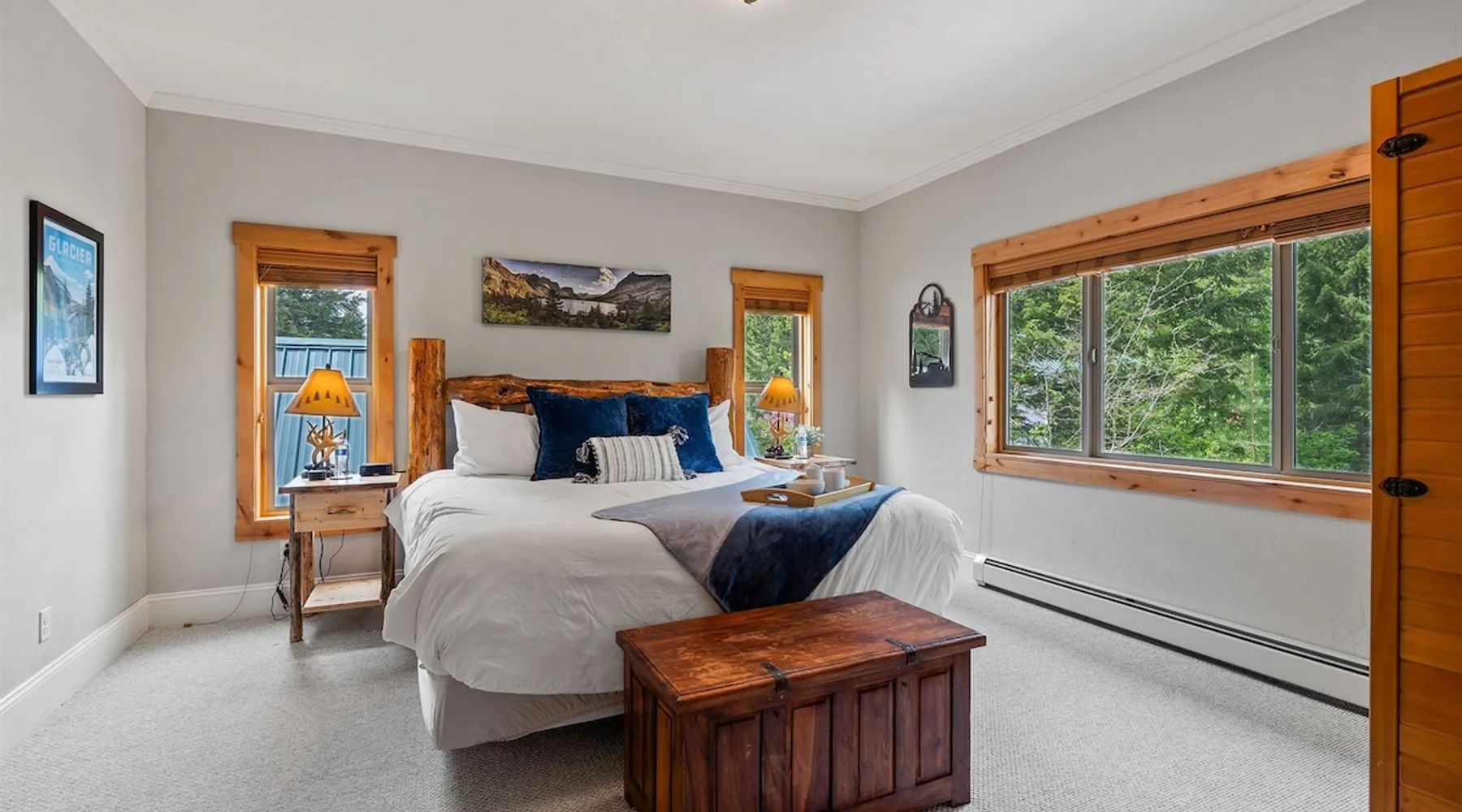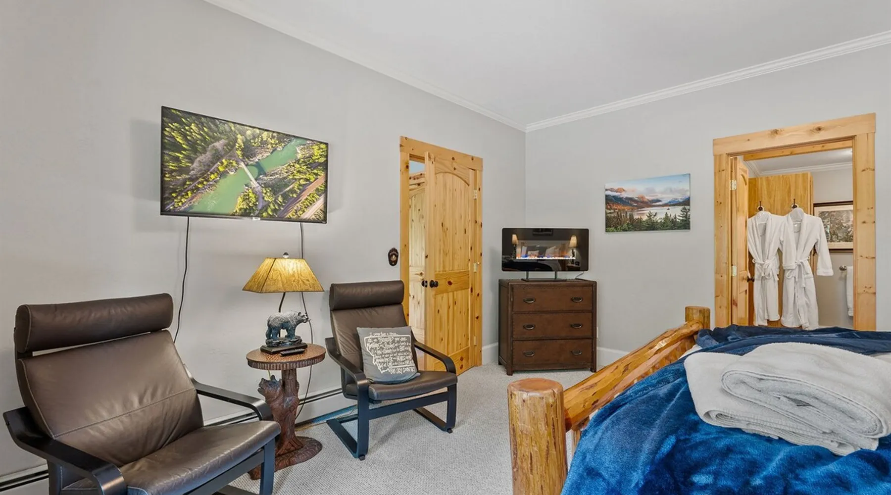 The perfect location to experience it all! Just 10 min from the West entrance of Glacier National Park, 29 miles from Flathead Lake (the largest natural lake in the west), 6 minutes away from two different ziplines and aerial parks, 4 minutes to mini golf, 10 minutes to water slides, along with ample opportunities for white-water rafting, horse-back riding, hiking, fishing, boating, skiing, biking and many other activities. Just 23 mi from Big Mountain, with 3000 acres of World class skiing! The space After a full day of adventure, come home and curl up by the fire or soak away your sore muscles in the large, 6 person hot tub. Enjoy amazing views of the river and mountains from the waterfront gazebo and secluded backyard or treat yourself to a family-style BBQ on the upper deck! There's plenty of space to unwind and relax with family and friends! Conveniently located within walking distance to groceries, fuel and dining and only 14 miles from Glacier International Airport. ☆☆ LUXURY AMENITIES ☆☆ This custom 3200 sq. ft. home combines rustic charm with five-star amenities for an incredible retreat! It offers 3 bedrooms, 3.5 bathrooms, spacious living areas, a well-stocked kitchen and sweeping balconies to help you relax while surrounded by natural beauty with river and mountain views. This home sleeps 10-12 and has been stocked with everything you'll need for an unforgettable vacation! With 43" 4K Smart TVs in every bedroom, a 60" Smart TV in each living room, a 6 person hot tub, stainless steel appliances, pine log beds with luxury mattresses, a fireplace, a fully-stocked kitchen including spices, coffee and tea supplies, a ping-pong table, foosball table, double shot basketball, corn hole, old fashioned popcorn maker, and much more! It even has three refrigerators and two dishwashers for those wanting to do their own meal prep, and a washer and dryer for your convenience. ☆☆ BEDROOMS & SLEEPING ARRANGEMENTS ☆☆ On the upper level you'll find a master suite (nicknamed the Eagle's Nest) with a luxury King size bed and ensuite bathroom including an infrared sauna, with large windows that look over the wooded back yard. On the lower level there is a second master suite (the Bear's Den) with a luxury King size bed and ensuite bathroom, the third bedroom (Moose Hollow) with a Queen size bed, each located conveniently right off the additional kitchenette, living room & bathroom. There is also a brand new sleeper sofa in the downstairs lounge area (Goat Mountain) and 2 rollaway beds and 2 blow up queen sized air mattresses available for extra guests. ☆☆ BATHROOMS ☆☆ This home is perfect for groups of 10-12 for many reasons, and one is because it has 3.5 updated bathrooms. The master bathroom has a gorgeous tiled walk in shower with rain shower features, two sinks with expansive counter space, huge walk-in closet, separate toilet room and designer finishes. The second ensuite bathroom has a walk in shower behind glass doors, rain shower features and double sinks with ample counter space and a large walk-in closet. The third bathroom features a tub/shower combo and a single sink with adequate counter space, while the half bathroom is conveniently located between the dining room and game room. Plush hotel quality towels are provided throughout. ☆☆ KITCHEN & LOUNGE ☆☆ Designed for entertaining groups, this home features multiple lounge spaces indoors and out and a fully stocked, galley style gourmet kitchen. The main living room has a wall of windows that overlook the shady patio and lush green, wooded property. The designer finishes and decor bring the beauty of nature indoors, and the luxury furniture makes this open space the perfect place to get together. Relax in the leather recliners or matching sofa and watch your favorite shows on the sleek 65" flat-screen TV. The gourmet kitchen sits right off the living room and dining room areas. There's room to keep your groceries in the cabinets and any one of the three stainless steel fridges, use the gas range to make homemade meals from scratch or heat leftovers in the microwave. Enjoy using the coffee maker for freshly brewed coffee, the toaster, blender, InstaPot, or any other gadgets to make your family's favorite meals and treats. The formal dining room sits in a sunny alcove of windows and offers comfortable seating for 8. Downstairs, there is even more room to hang out. A kitchenette with a fridge, dishwasher, microwave and slow drip and Kuerig coffee equipment and supplies, making it easy to whip up a quick snack or drink to enjoy in the adjacent secondary lounge area. Sit at the custom log bar with your snacks or set up your laptop here and get some work done. The lounge has a comfortable sofa in front of an electric fireplace, 65" flat screen TV, and sliding glass doors that lead out to the covered patio and hot tub. The final lounge area is a place the kids won't want to leave! Check out the brand new Infinity Game Table with games for all ages! Also features a large sofa/chaise lounger in a carpeted area for watching TV or playing your favorite PS4 game with an old fashioned movie theatre style popcorn popper. It also has an Infinity Game table, ping pong table, foosball table, and large connect four. This area is located in the detached, heated garage which is perfect for keeping the noise down in the main living areas. ☆☆ OUTSIDE SPACE ☆☆ Nothing beats feeling the crisp mountain air on your cheeks, hearing the chirp of a passing robin, the breeze as it ruffles the aspen leaves, and the sound of the river as it traverses down the canyon while sitting in the comfort of your own private deck in solitude. What a feeling of peace and freedom and exhilaration as you experience relaxation like never before! This nature lover's oasis offers multiple ways to enjoy the outdoors. There are two private patios, one on each level of the home. The main patio has soaring wood-paneled ceilings, outdoor lounge furni