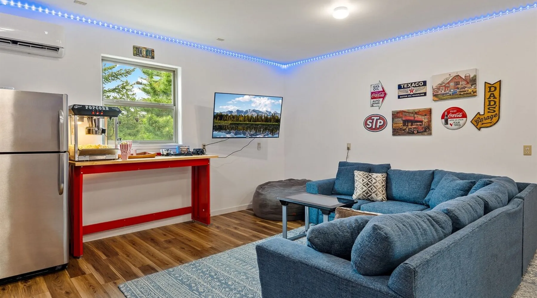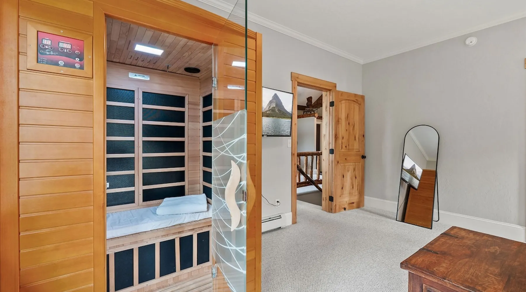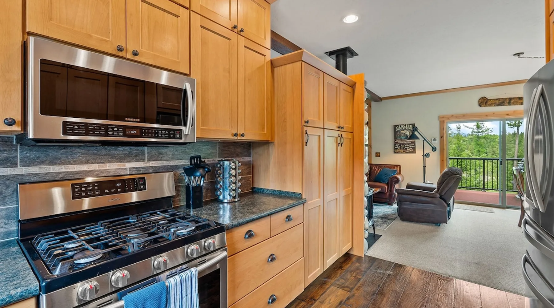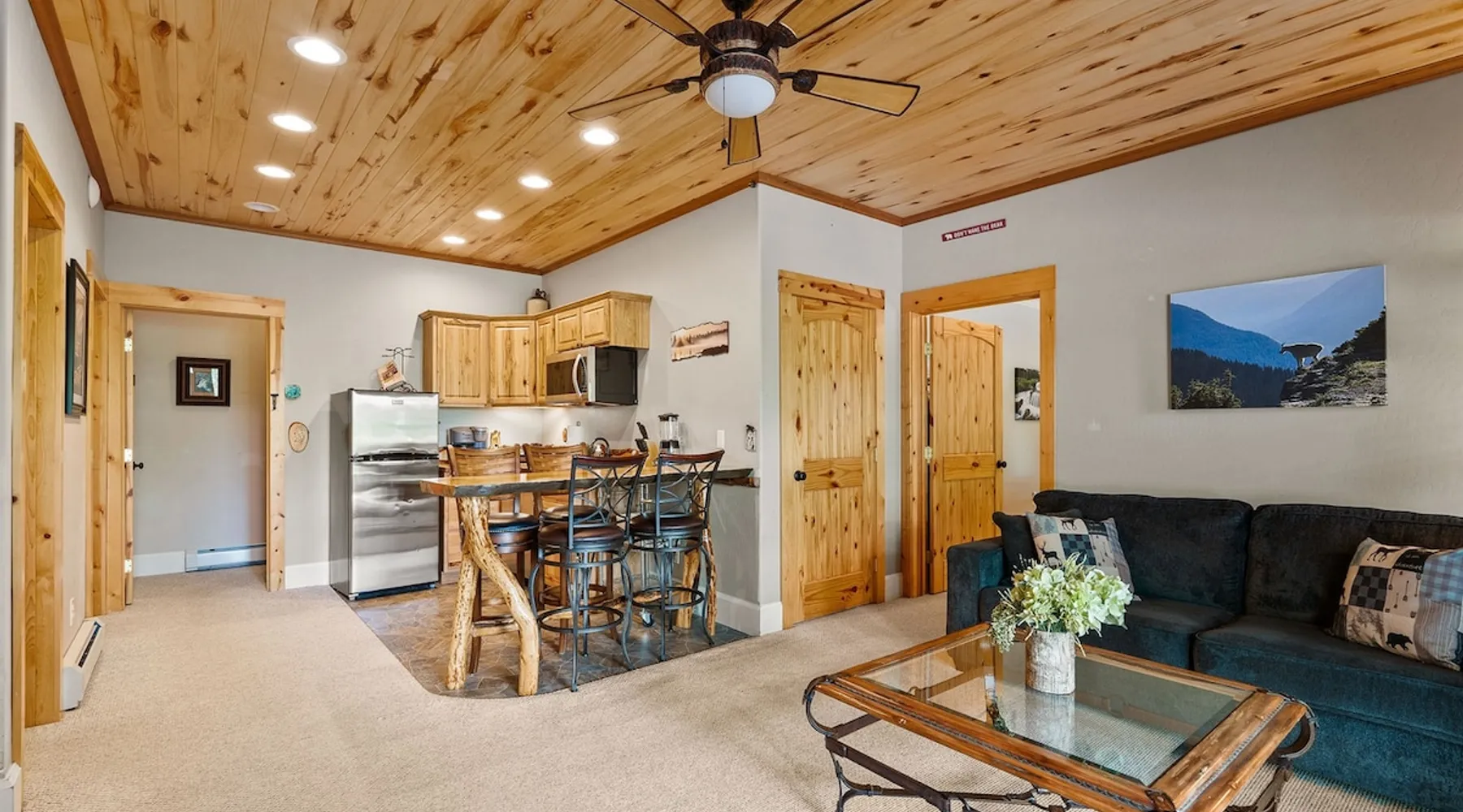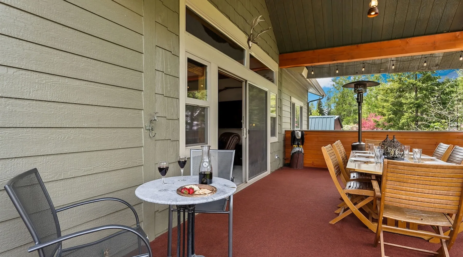 The perfect location to experience it all! Just 10 min from the West entrance of Glacier National Park, 29 miles from Flathead Lake (the largest natural lake in the west), 6 minutes away from two different ziplines and aerial parks, 4 minutes to mini golf, 10 minutes to water slides, along with ample opportunities for white-water rafting, horse-back riding, hiking, fishing, boating, skiing, biking and many other activities. Just 23 mi from Big Mountain, with 3000 acres of World class skiing! The space After a full day of adventure, come home and curl up by the fire or soak away your sore muscles in the large, 6 person hot tub. Enjoy amazing views of the river and mountains from the waterfront gazebo and secluded backyard or treat yourself to a family-style BBQ on the upper deck! There's plenty of space to unwind and relax with family and friends! Conveniently located within walking distance to groceries, fuel and dining and only 14 miles from Glacier International Airport. ☆☆ LUXURY AMENITIES ☆☆ This custom 3200 sq. ft. home combines rustic charm with five-star amenities for an incredible retreat! It offers 3 bedrooms, 3.5 bathrooms, spacious living areas, a well-stocked kitchen and sweeping balconies to help you relax while surrounded by natural beauty with river and mountain views. This home sleeps 10-12 and has been stocked with everything you'll need for an unforgettable vacation! With 43" 4K Smart TVs in every bedroom, a 60" Smart TV in each living room, a 6 person hot tub, stainless steel appliances, pine log beds with luxury mattresses, a fireplace, a fully-stocked kitchen including spices, coffee and tea supplies, a ping-pong table, foosball table, double shot basketball, corn hole, old fashioned popcorn maker, and much more! It even has three refrigerators and two dishwashers for those wanting to do their own meal prep, and a washer and dryer for your convenience. ☆☆ BEDROOMS & SLEEPING ARRANGEMENTS ☆☆ On the upper level you'll find a master suite (nicknamed the Eagle's Nest) with a luxury King size bed and ensuite bathroom including an infrared sauna, with large windows that look over the wooded back yard. On the lower level there is a second master suite (the Bear's Den) with a luxury King size bed and ensuite bathroom, the third bedroom (Moose Hollow) with a Queen size bed, each located conveniently right off the additional kitchenette, living room & bathroom. There is also a brand new sleeper sofa in the downstairs lounge area (Goat Mountain) and 2 rollaway beds and 2 blow up queen sized air mattresses available for extra guests. ☆☆ BATHROOMS ☆☆ This home is perfect for groups of 10-12 for many reasons, and one is because it has 3.5 updated bathrooms. The master bathroom has a gorgeous tiled walk in shower with rain shower features, two sinks with expansive counter space, huge walk-in closet, separate toilet room and designer finishes. The second ensuite bathroom has a walk in shower behind glass doors, rain shower features and double sinks with ample counter space and a large walk-in closet. The third bathroom features a tub/shower combo and a single sink with adequate counter space, while the half bathroom is conveniently located between the dining room and game room. Plush hotel quality towels are provided throughout. ☆☆ KITCHEN & LOUNGE ☆☆ Designed for entertaining groups, this home features multiple lounge spaces indoors and out and a fully stocked, galley style gourmet kitchen. The main living room has a wall of windows that overlook the shady patio and lush green, wooded property. The designer finishes and decor bring the beauty of nature indoors, and the luxury furniture makes this open space the perfect place to get together. Relax in the leather recliners or matching sofa and watch your favorite shows on the sleek 65" flat-screen TV. The gourmet kitchen sits right off the living room and dining room areas. There's room to keep your groceries in the cabinets and any one of the three stainless steel fridges, use the gas range to make homemade meals from scratch or heat leftovers in the microwave. Enjoy using the coffee maker for freshly brewed coffee, the toaster, blender, InstaPot, or any other gadgets to make your family's favorite meals and treats. The formal dining room sits in a sunny alcove of windows and offers comfortable seating for 8. Downstairs, there is even more room to hang out. A kitchenette with a fridge, dishwasher, microwave and slow drip and Kuerig coffee equipment and supplies, making it easy to whip up a quick snack or drink to enjoy in the adjacent secondary lounge area. Sit at the custom log bar with your snacks or set up your laptop here and get some work done. The lounge has a comfortable sofa in front of an electric fireplace, 65" flat screen TV, and sliding glass doors that lead out to the covered patio and hot tub. The final lounge area is a place the kids won't want to leave! Check out the brand new Infinity Game Table with games for all ages! Also features a large sofa/chaise lounger in a carpeted area for watching TV or playing your favorite PS4 game with an old fashioned movie theatre style popcorn popper. It also has an Infinity Game table, ping pong table, foosball table, and large connect four. This area is located in the detached, heated garage which is perfect for keeping the noise down in the main living areas. ☆☆ OUTSIDE SPACE ☆☆ Nothing beats feeling the crisp mountain air on your cheeks, hearing the chirp of a passing robin, the breeze as it ruffles the aspen leaves, and the sound of the river as it traverses down the canyon while sitting in the comfort of your own private deck in solitude. What a feeling of peace and freedom and exhilaration as you experience relaxation like never before! This nature lover's oasis offers multiple ways to enjoy the outdoors. There are two private patios, one on each level of the home. The main patio has soaring wood-paneled ceilings, outdoor lounge furni