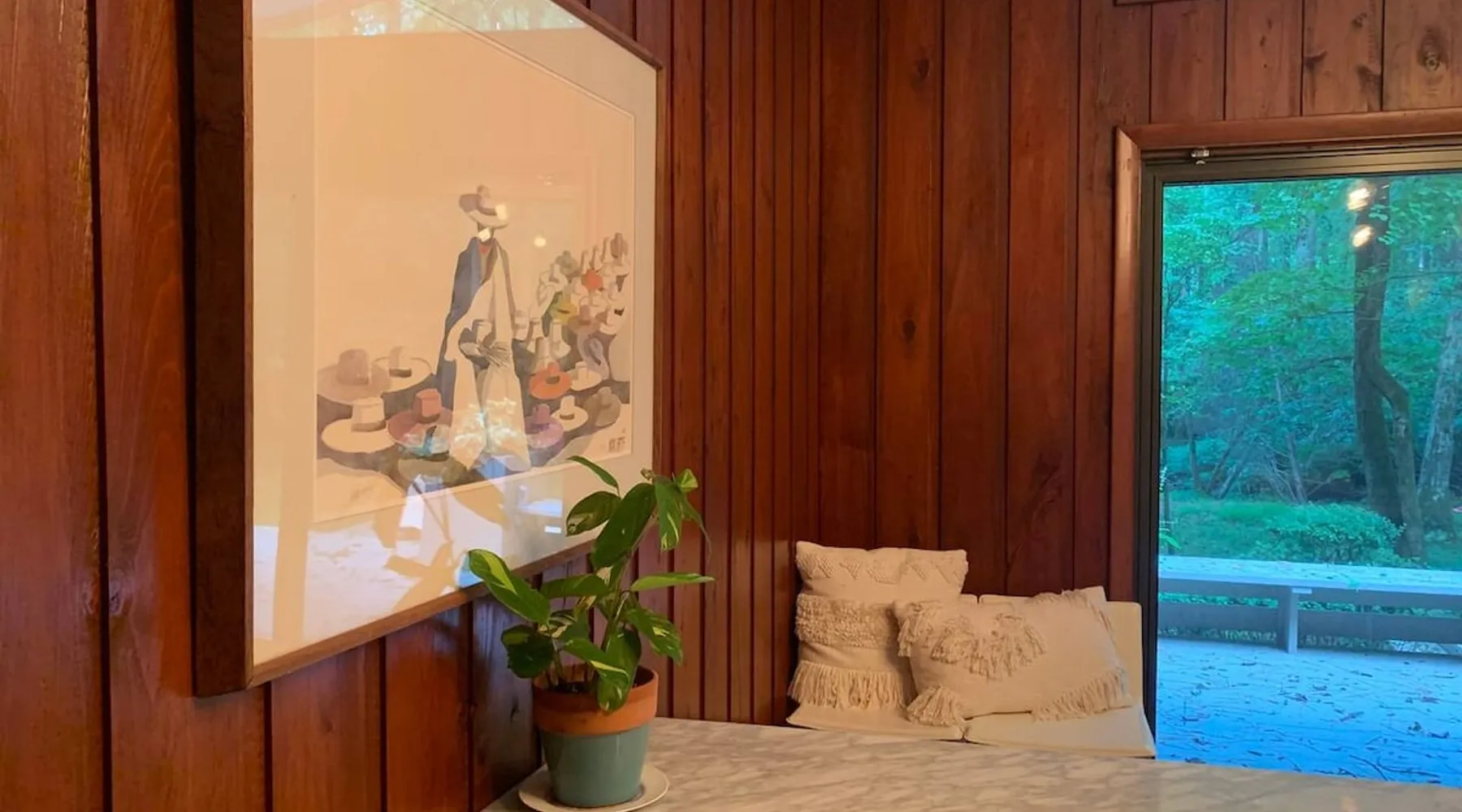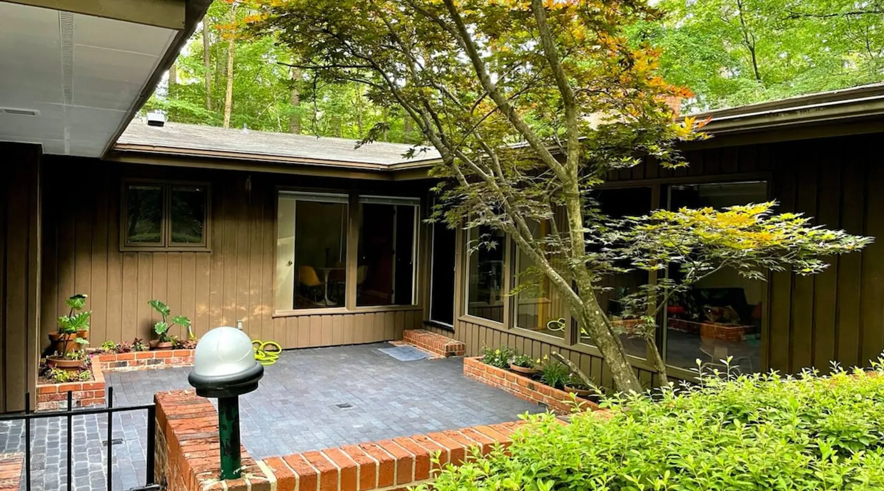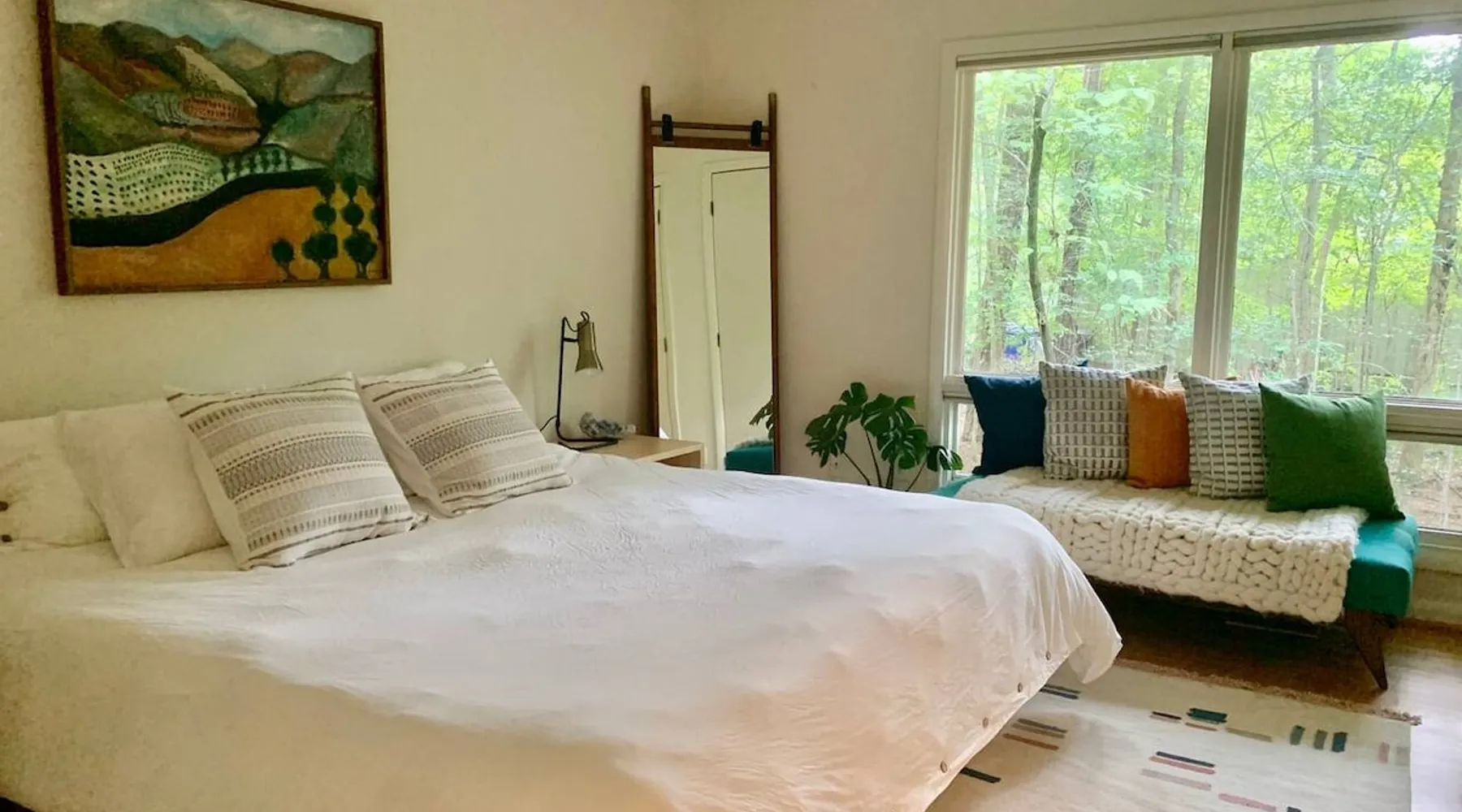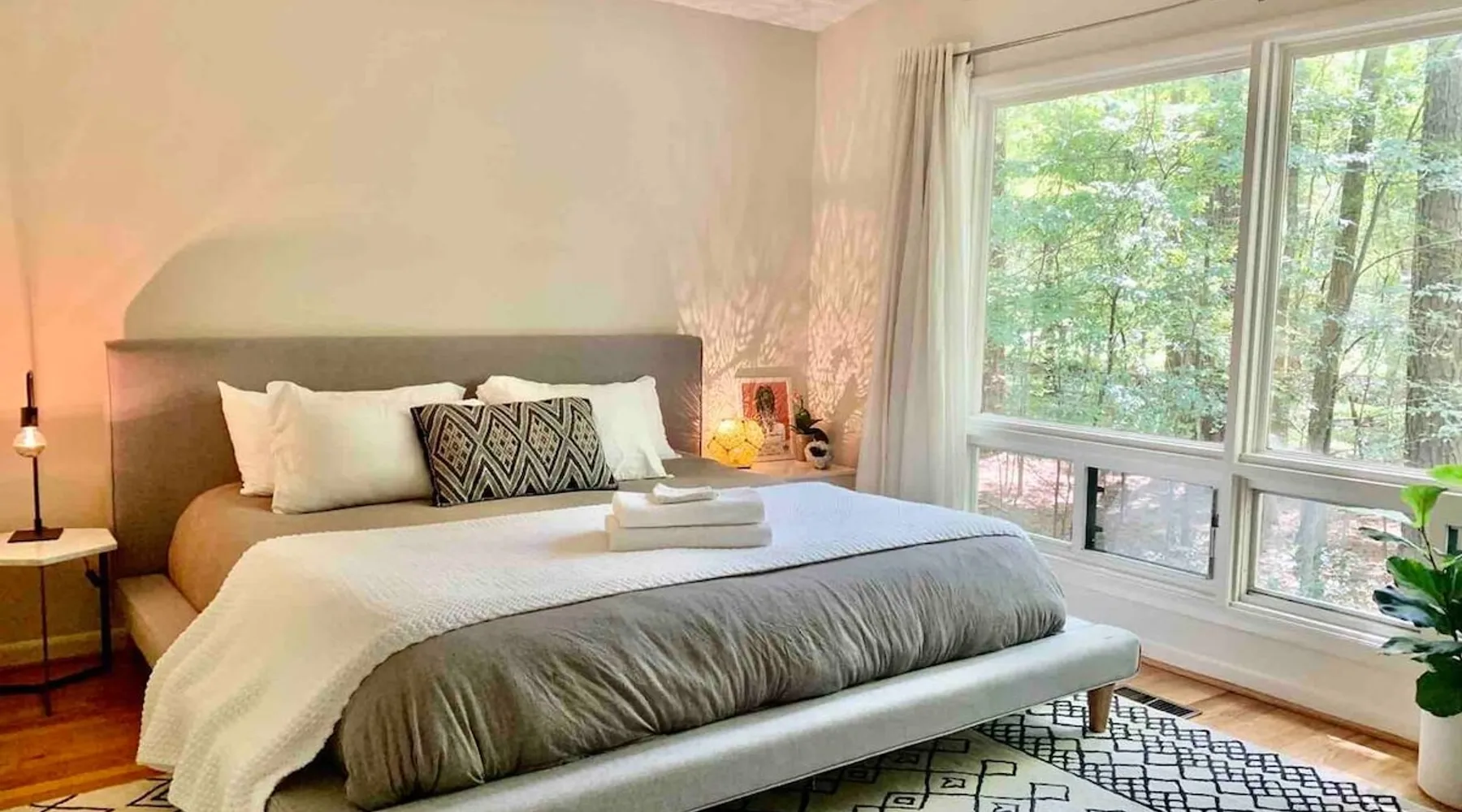 This curated 3BR/2BA mid-century modern Chapel Hill home blends comfort, style, and nature in perfect harmony. Designed by renowned local architect JP Goforth, the home sits on a wooded acre with a private creek and features king beds in every room, Sonos audio, and fiber WiFi. Relax on the deck, fire up the grill, or unwind inside surrounded by stunning hand-selected art and furnishings. Minutes from UNC, Whole Foods, and Eastwood Lake, it’s a true retreat for anyone craving serenity and style. The space Designed by local legend and architect JP Goforth and wrapped in nature, this one-level mid-century gem blends iconic design with thoughtful hospitality. Mid-Century Designer is thoughtfully managed by me and my team at The Brighthouse, local hospitality experts known for warm, elevated guest experiences. It’s a tranquil retreat, steps from Eastwood Lake, 10 minutes drive to UNC, and perfect for peaceful escapes or connecting with loved ones. ✨ Key Features - 3 spacious bedrooms, all with king beds and premium linens - 2 bathrooms with rainfall shower, tub/shower combo, and bidets - Kitchen with gas range, Fellow Kettle, French press + drip coffee (coffee provided) - Formal dining room with CB2 marble table (seats 9) - Eat-in kitchen with second CB2 marble table + leather seating - Living room with handwoven Moroccan rugs, live plants, 65” Apple TV - Fiber internet (404+ Mbps), Sonos sound system - Multiple indoor reading and relaxing nooks - Each room features original, signed artwork - Back deck with gas grill, seating, and forest views - Private wooded lot with babbling creek and wildlife ✨ Bedrooms & Bathrooms Overview This thoughtfully designed one-level home offers three spacious bedrooms and two full bathrooms, all positioned for comfort, privacy, and style. Primary Bedroom + Ensuite Bath - King bed with premium linens - Vaulted ceiling and curated artwork - Ensuite bath with rainfall shower, transom window for natural light, and bidet - Located near the kitchen with private and shared access Second Bedroom + Shared Bath Access - California king bed (ideal for taller guests) - Roku TV, closet and dresser - Shares hallway access to full bath with tub/shower combo and bidet Third Bedroom + Shared Bath Access - King bed with West Elm frame, luxurious linens, and down pillows - Backyard views and cozy lounge couch - Shares access to hallway full bath - Both bathrooms are stocked with plush towels, body wash, shampoo, conditioner, and bidets for added comfort. ✨Outdoor Space - Private wooded acre with seasonal creek - Deck with built-in seating and gas grill - Wildlife sightings: blue herons, deer, hawks, owls - Front courtyard patio with a mature Japanese Maple tree for morning coffee - Steps from walkable, quiet roads and trail connections Guest access You’ll receive a door code for self-check-in. Arrival instructions will be sent the morning your reservation begins. Other things to note The home has several fireplaces. These may be used with prior permission only. Due to the expensive items in the home, it is generally not suitable for young kids. If you'd like to bring young children with you, please get in touch so that we can make sure this will be a good fit for all. Because this is an older home from the 70s and that it sits on wooded acre in NC, outdoor bugs may sometimes find their way indoors, especially if the deck sliders are left open. The house is regularly treated for pests and is thoroughly and professionally cleaned weekly. NOTE: Absolutely no parties. All guests must be registered. QUIET HOURS Quiet hours after 10pm and before 8am as part of our good neighbors policy.