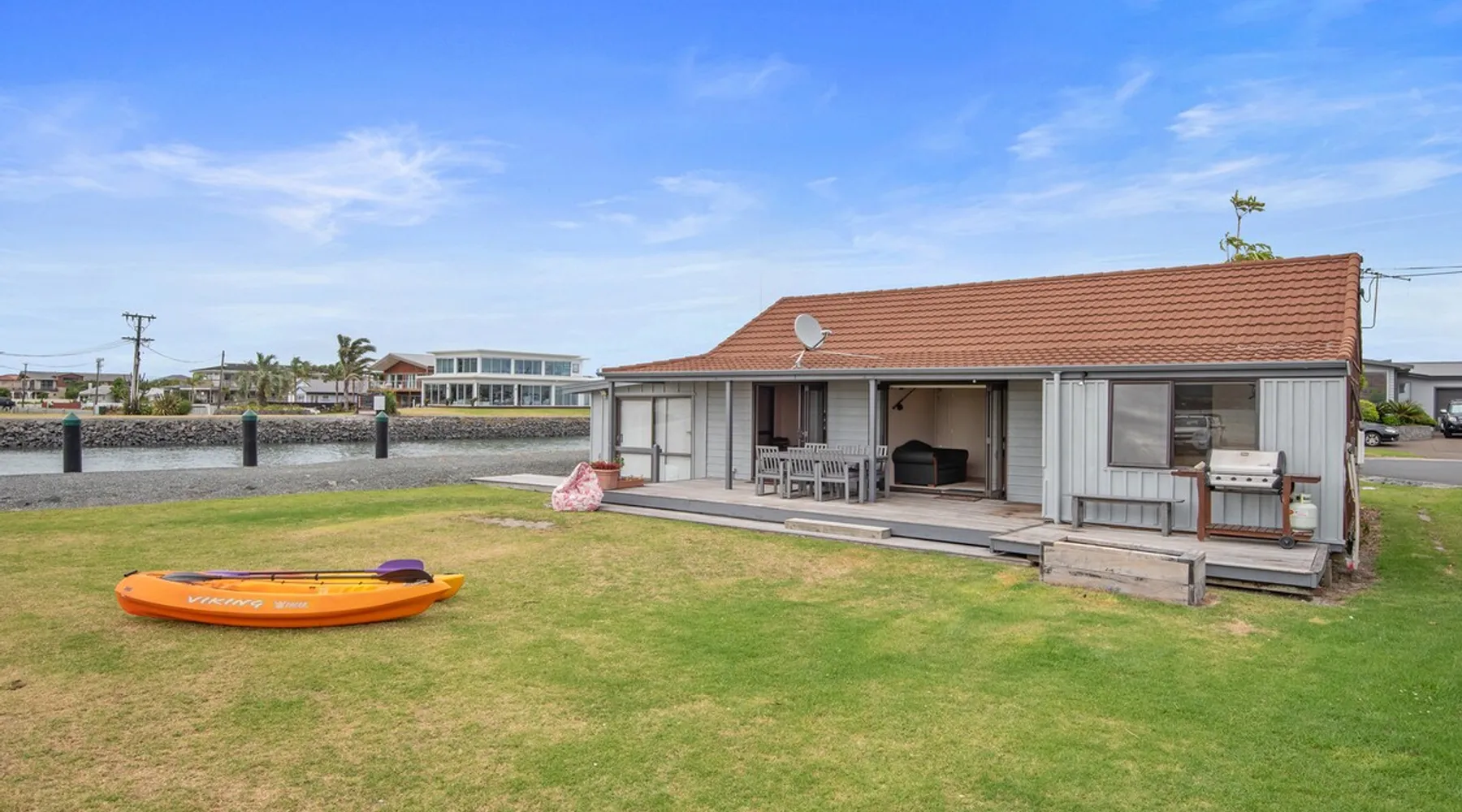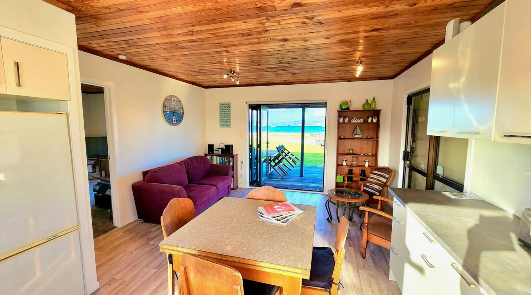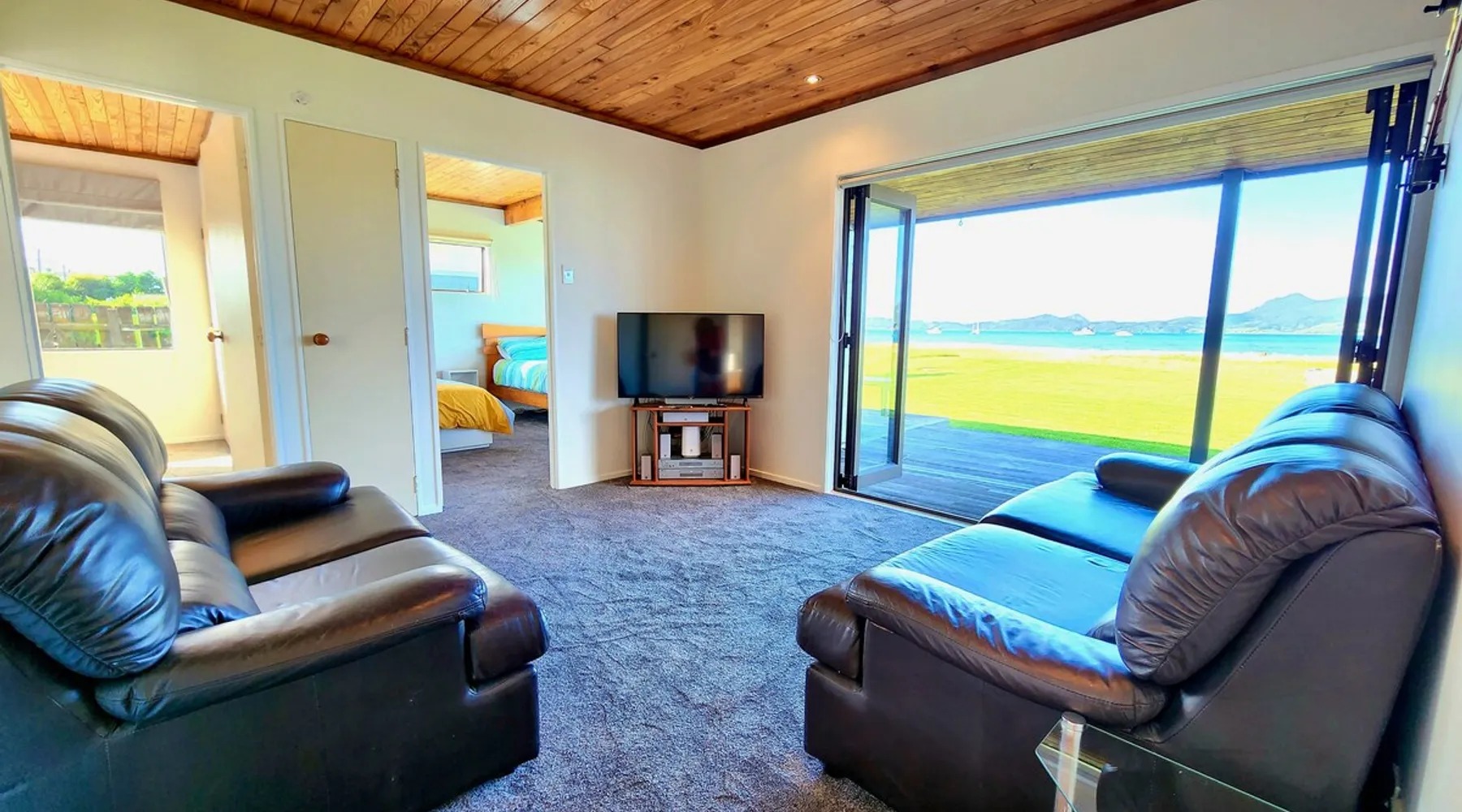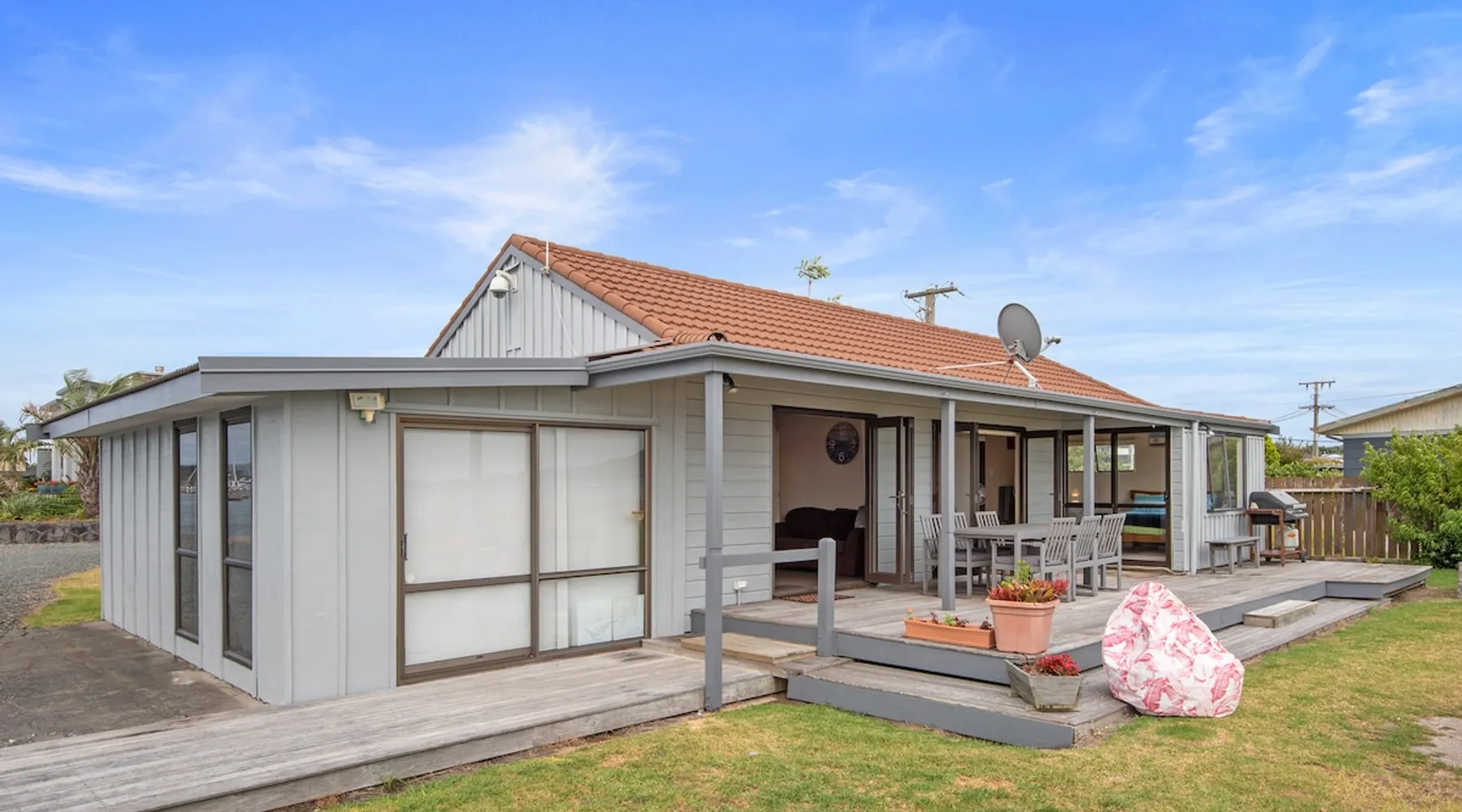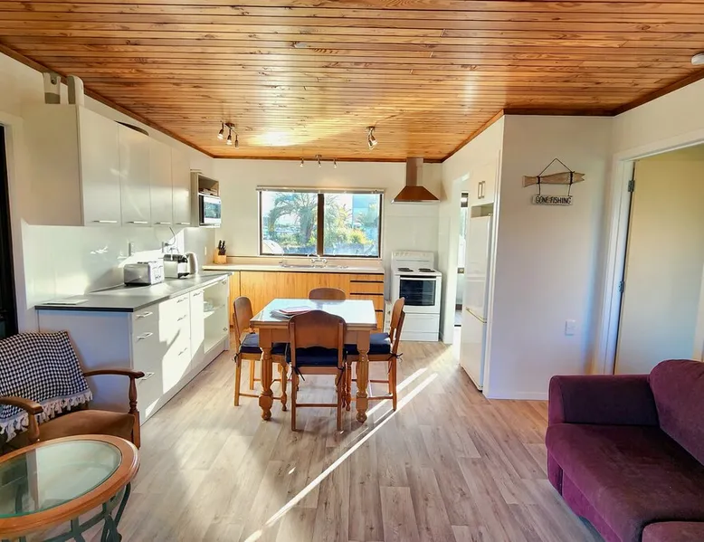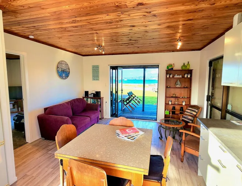 Wake up to the sound of the rolling waves at this two-bedroom bach, offering a beachfront location that sleeps up to six guests, and packed with all the holiday must-haves. Welcome to The Sunrise Bach! The space Wake up to the sound of the rolling waves at this two-bedroom bach, offering a beachfront location that sleeps up to six guests, and packed with all the holiday must-haves. Welcome to The Sunrise Bach! Sip on your hot drink out on the spacious deck as the sun fills the sky, and take in the fresh morning air with mountain landscapes and blue ocean as your backdrop. You'll feel right at home here. You’ll love the pops of colour and retro vibe here at Sunrise Bach, with comfortable furnishings in the living spaces and endless entertainment including books, board games, a Smart TV with built in Chromecast, and a DVD player with a great selection of DVD’s. After your days of soaking up the sun, whip up some sides in the well-equipped kitchen, spark up the BBQ, and enjoy a meal alfresco on the sheltered deck. Enjoy spending your days on the large lawn, perfect for a game of backyard cricket or rugby, or take the available kayak out for a paddle with easy beach access. Two bedrooms and a sofa bed in the family room comfortably sleep up to seven guests here at The Sunrise Bach, making this the ideal base for a small family or couples' getaway. The bathroom offers the convenience of a separate toilet and shower. There is plenty of room to park your boat here, then launch it on the beach just outside with a four-wheel drive vehicle, and set out for the day to find your fresh catch. The Sunrise Bach is located directly adjacent to the canal that leads to Marsden Cove Marina. If you are wanting a change of scene further afield, Ruakākā Beach is 15 minutes away by car for a fun day of sunshine and swims. You’re just a four-minute drive away from the local cafes, restaurants, and supermarket, if you're wanting a bite to eat, or needing to top up on supplies. For a holiday to remember, The Sunrise Bach awaits! Other things to note There is one kayak available, but guests must bring their own life-jackets to access it. Please contact us to request the kayak. Please note a bond may be charged at certain times of the year. One of our team members will contact you if this is required for your booking. Also note that the third room, which is closed and not available for use, is a garage which has the lawnmower, paints, and tools for the bach.