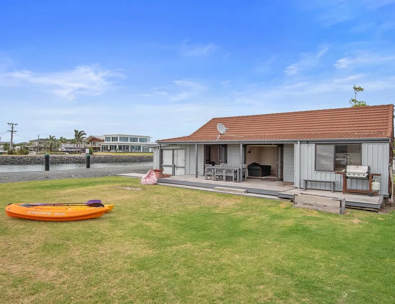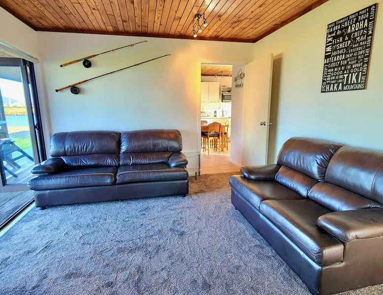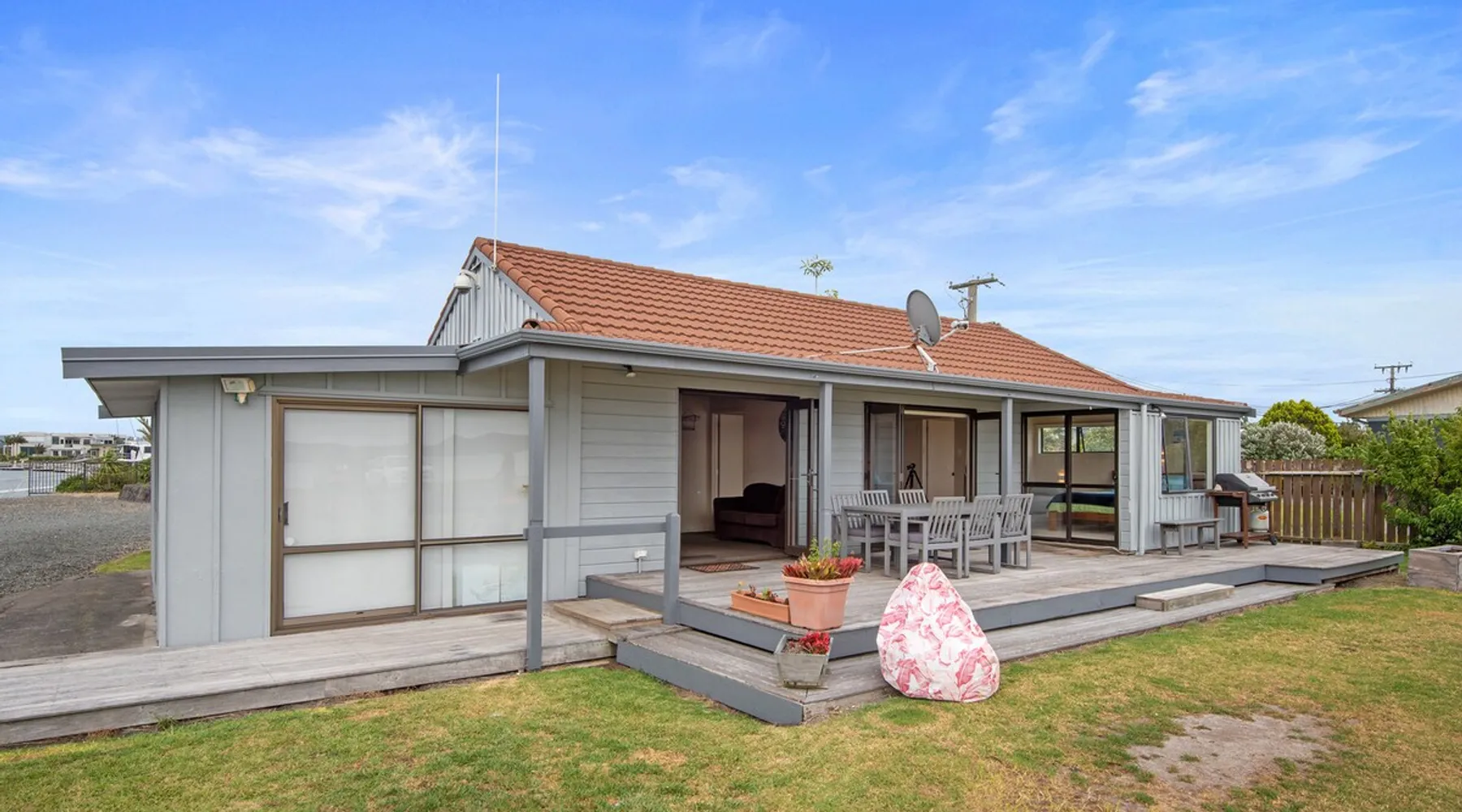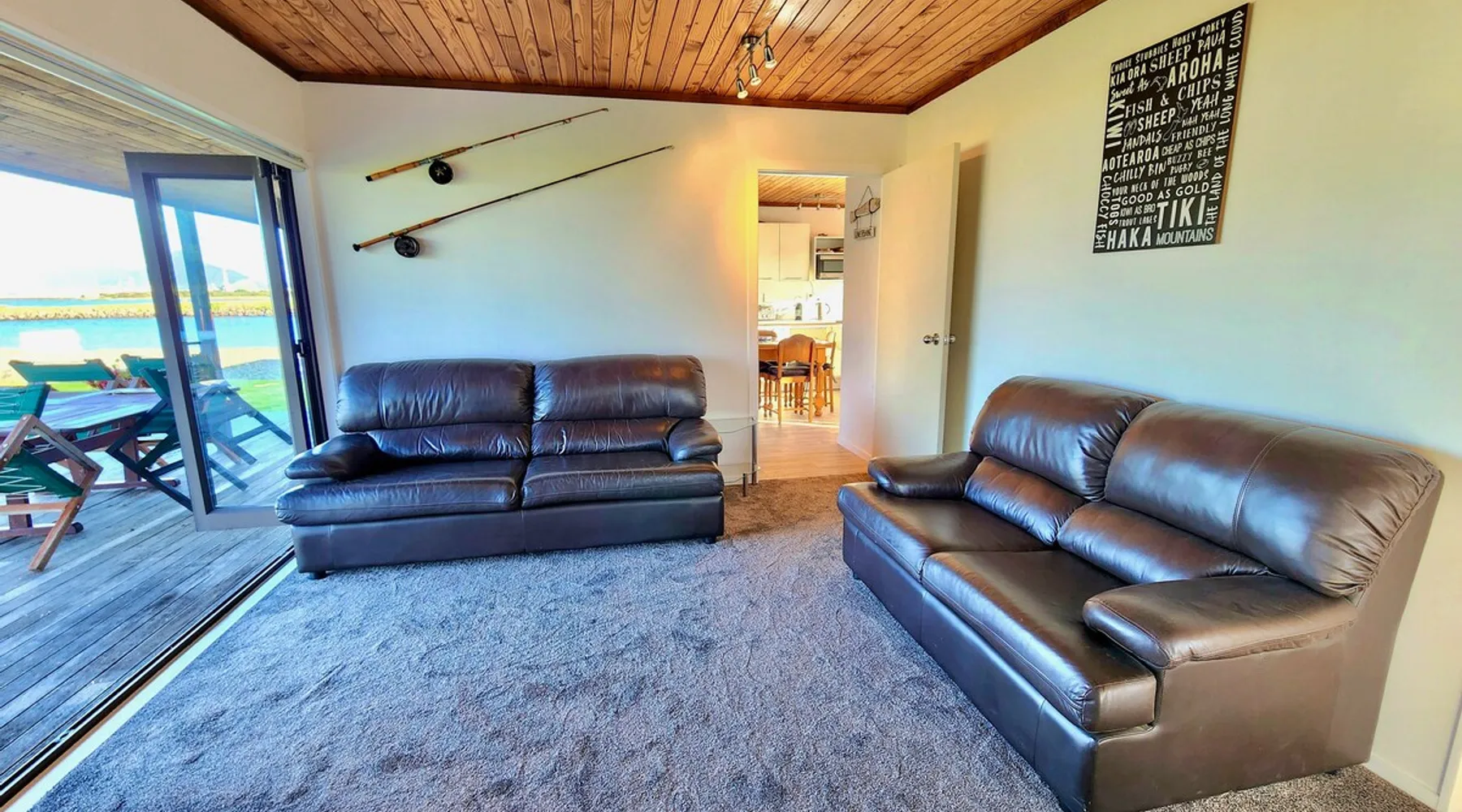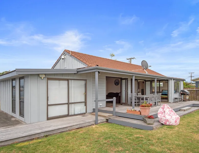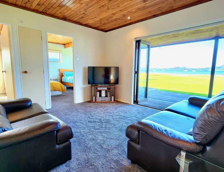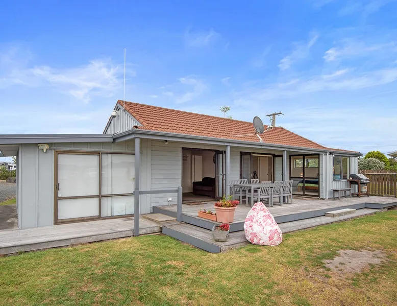 Wake up to the sound of the rolling waves at this two-bedroom bach, offering a beachfront location that sleeps up to six guests, and packed with all the holiday must-haves. Welcome to The Sunrise Bach! The space Wake up to the sound of the rolling waves at this two-bedroom bach, offering a beachfront location that sleeps up to six guests, and packed with all the holiday must-haves. Welcome to The Sunrise Bach! Sip on your hot drink out on the spacious deck as the sun fills the sky, and take in the fresh morning air with mountain landscapes and blue ocean as your backdrop. You'll feel right at home here. You’ll love the pops of colour and retro vibe here at Sunrise Bach, with comfortable furnishings in the living spaces and endless entertainment including books, board games, a Smart TV with built in Chromecast, and a DVD player with a great selection of DVD’s. After your days of soaking up the sun, whip up some sides in the well-equipped kitchen, spark up the BBQ, and enjoy a meal alfresco on the sheltered deck. Enjoy spending your days on the large lawn, perfect for a game of backyard cricket or rugby, or take the available kayak out for a paddle with easy beach access. Two bedrooms and a sofa bed in the family room comfortably sleep up to seven guests here at The Sunrise Bach, making this the ideal base for a small family or couples' getaway. The bathroom offers the convenience of a separate toilet and shower. There is plenty of room to park your boat here, then launch it on the beach just outside with a four-wheel drive vehicle, and set out for the day to find your fresh catch. The Sunrise Bach is located directly adjacent to the canal that leads to Marsden Cove Marina. If you are wanting a change of scene further afield, Ruakākā Beach is 15 minutes away by car for a fun day of sunshine and swims. You’re just a four-minute drive away from the local cafes, restaurants, and supermarket, if you're wanting a bite to eat, or needing to top up on supplies. For a holiday to remember, The Sunrise Bach awaits! Other things to note There is one kayak available, but guests must bring their own life-jackets to access it. Please contact us to request the kayak. Please note a bond may be charged at certain times of the year. One of our team members will contact you if this is required for your booking. Also note that the third room, which is closed and not available for use, is a garage which has the lawnmower, paints, and tools for the bach.