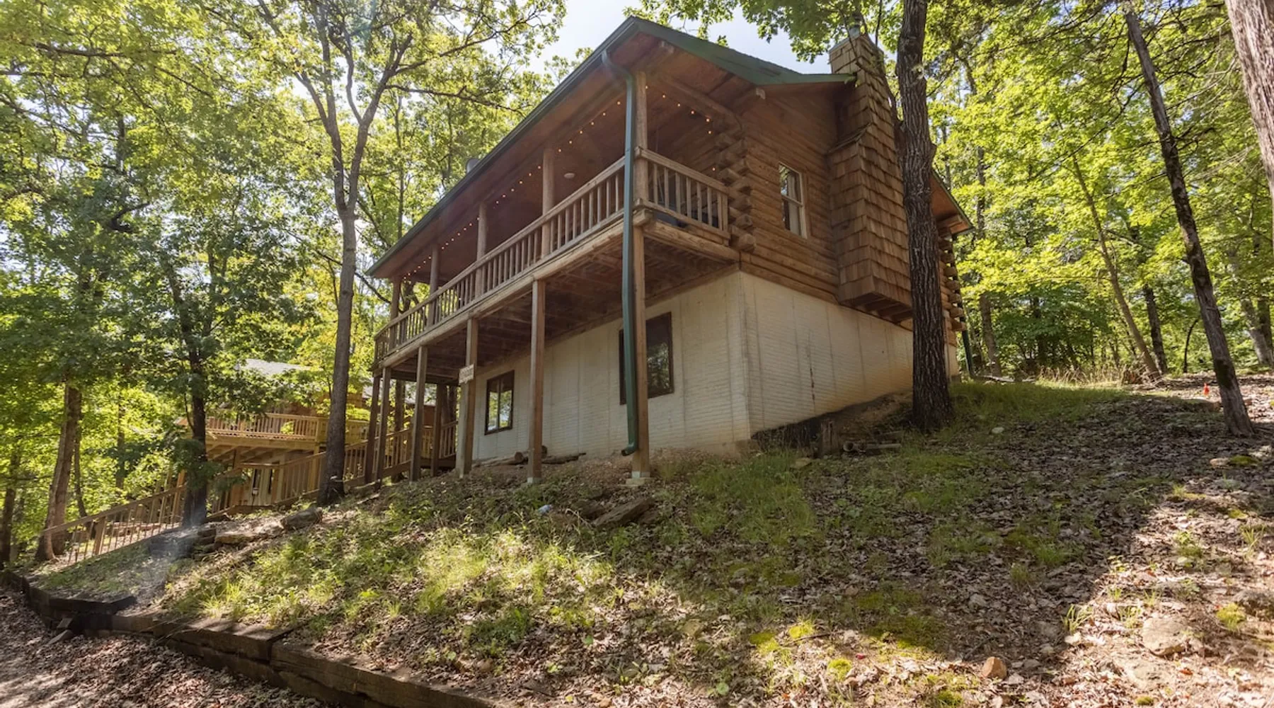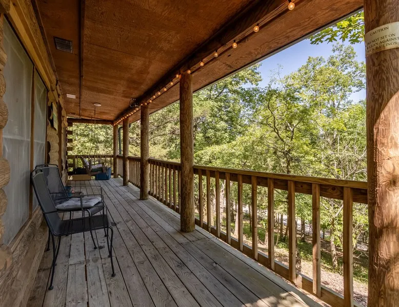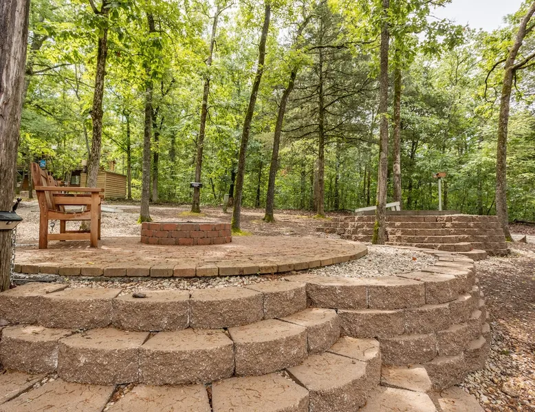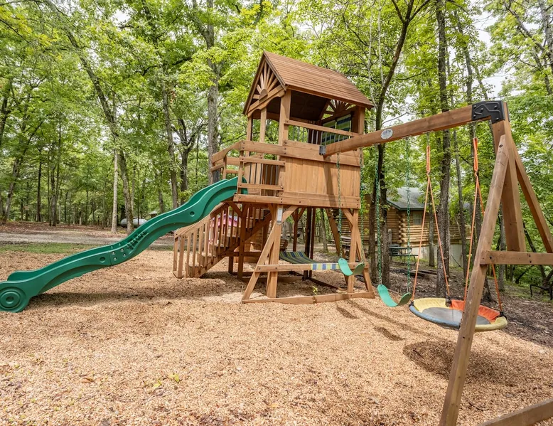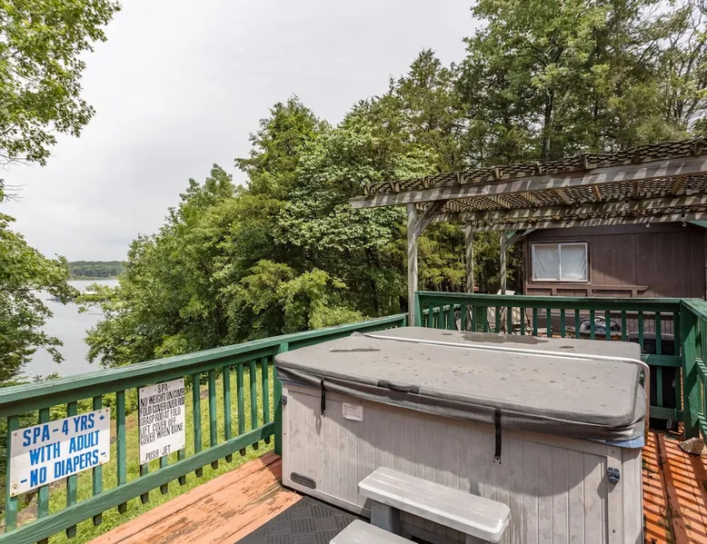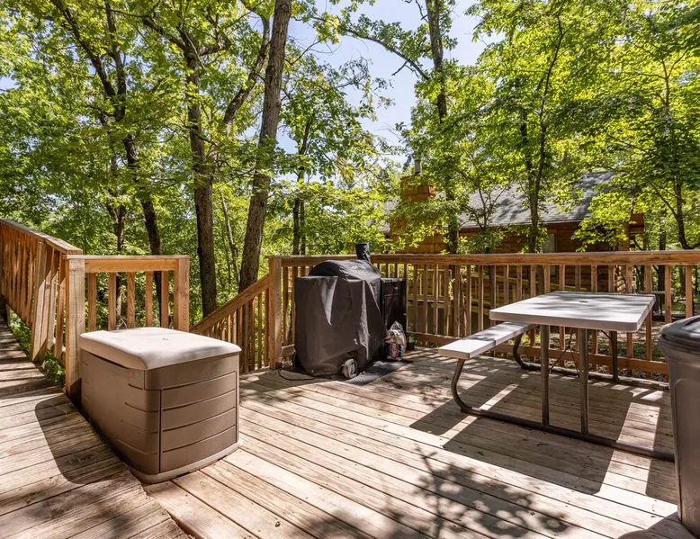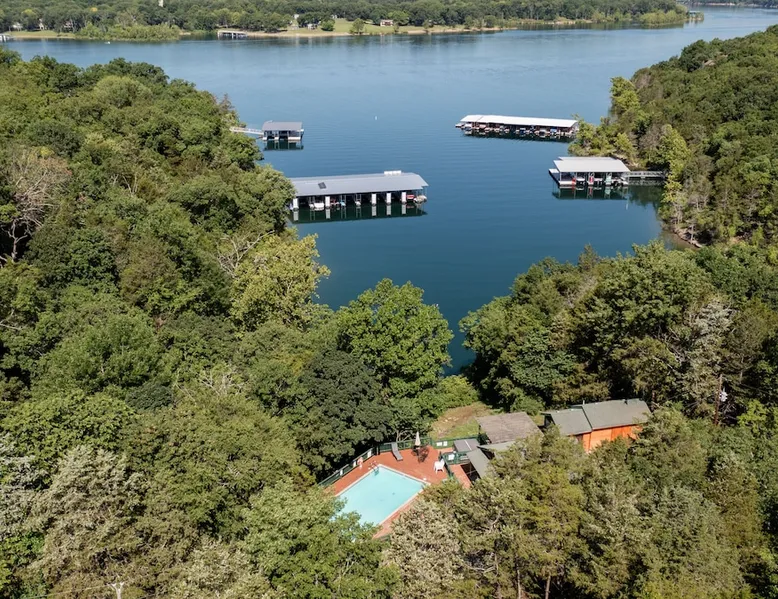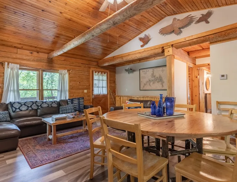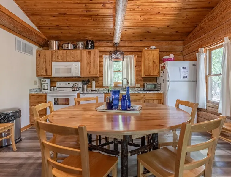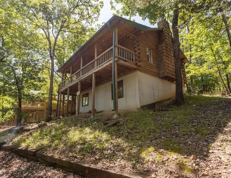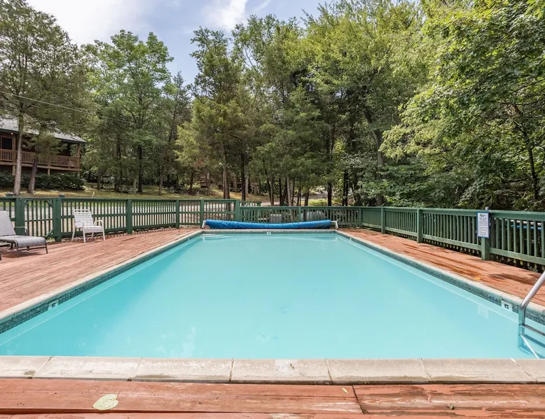 Old Hickory #7 is a great cabin for a large family or group. This cabin has an open concept kitchen, dining and living space with a wood burning fireplace and ceiling fan. On the main floor is a king bedroom, a queen bedroom and a hall bathroom. In the basement are 2 bedrooms with 2 queen beds in each and a hall bathroom. The cabin is situated close to the playground, so the little ones can have fun and adults can sit near by and watch. The space - THE PROPERTY - 1320 Sq Ft | Community Outdoor Pool | Table Rock Lake Access | Walking Trails Get away from it all on the shores of Table Rock Lake and enjoy family and friends while swimming, boating, hiking, fishing and exploring all the amazing attractions. BEDROOMS: #1: 1 King | #2: 1 Queen | Basement #1: 2 Queens| Basement #2: 2 Queens INDOOR LIVING: Open Concept Kitchen, Dining and Living space with wood burning fireplace and ceiling fan. KITCHEN: Fully Equipped with Microwave, Electric Range/Oven, drip coffee maker with coffee and filters, toaster, blender, dishwasher, dishware/flatware, complementary spices OUTDOOR LIVING: Covered Porch, charcoal grill, outdoor dining and lounging, fire pit, porch swing COMMUNITY AMENITIES: Pool, Laundry, lake access, play area. The Hot Tub and pool are winterized for the winter months. They are open Memorial Day weekend to Labor Day weekend. The laundry facilities are winterized November through March. GENERAL: Free wifi located at the communal pool and rec area, linens/bath towels, keyless entry, air conditioning, complementary toiletries. Max Guests 12 PARKING: 2-3 car parking next to cabin - THE LOCATION – TABLE ROCK LAKE (on site access): swimming, fishing, Boating with ramp access via Campbell point Marina (3.2 miles) or Table Rock Lake Ramp (3.9 miles), MarineCorp US (5.7 miles) Guest access Seasonal Laundry March-November, there is a laundromat nearby. Other things to note This Cabin has Fully equipped kitchen and dining are. Cozy living room on the main level. Two bedrooms one king master suite with private bathroom. One queen with shared common bath. The lower level has two bedrooms each having queen beds in each. You'll enjoy a lovely wooded setting from the front porch area , and a shared playground for the kids in the back of the cabin. Just down the lane is a lakeside pool with a lovely view of the lake.