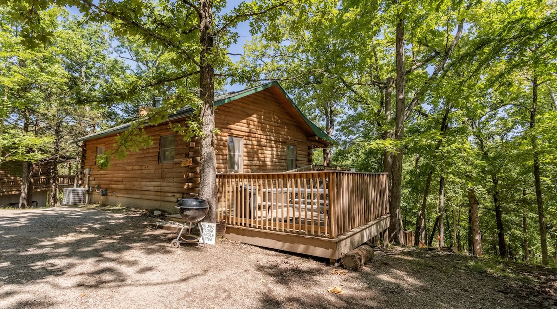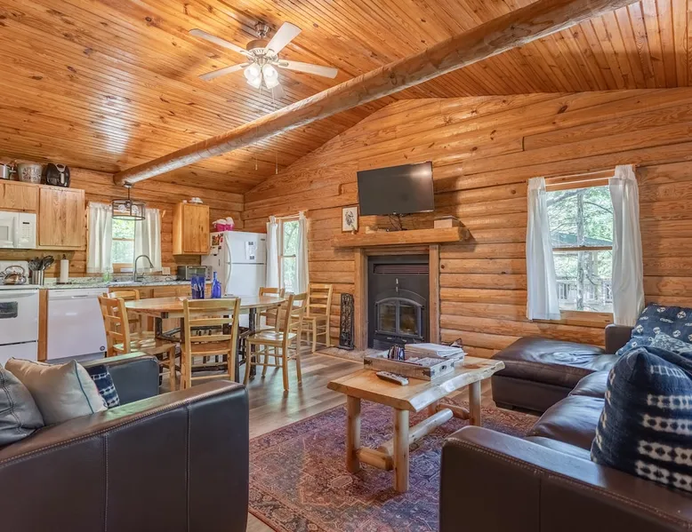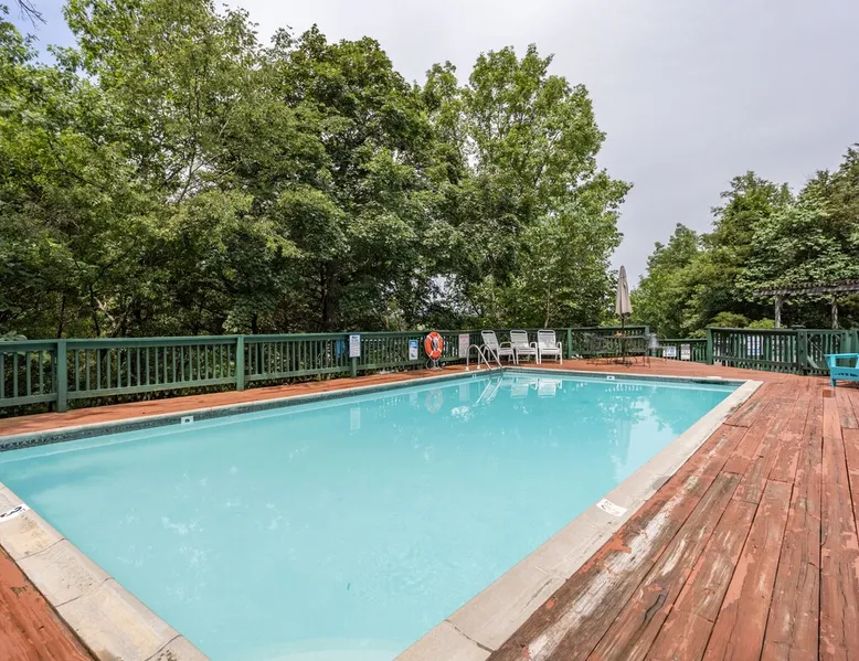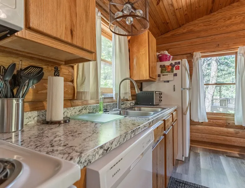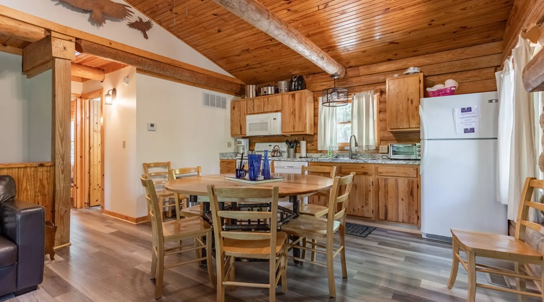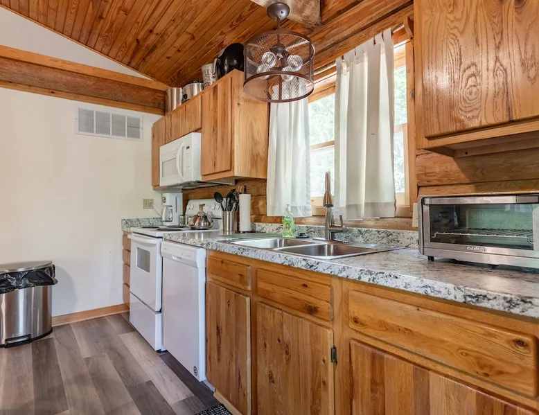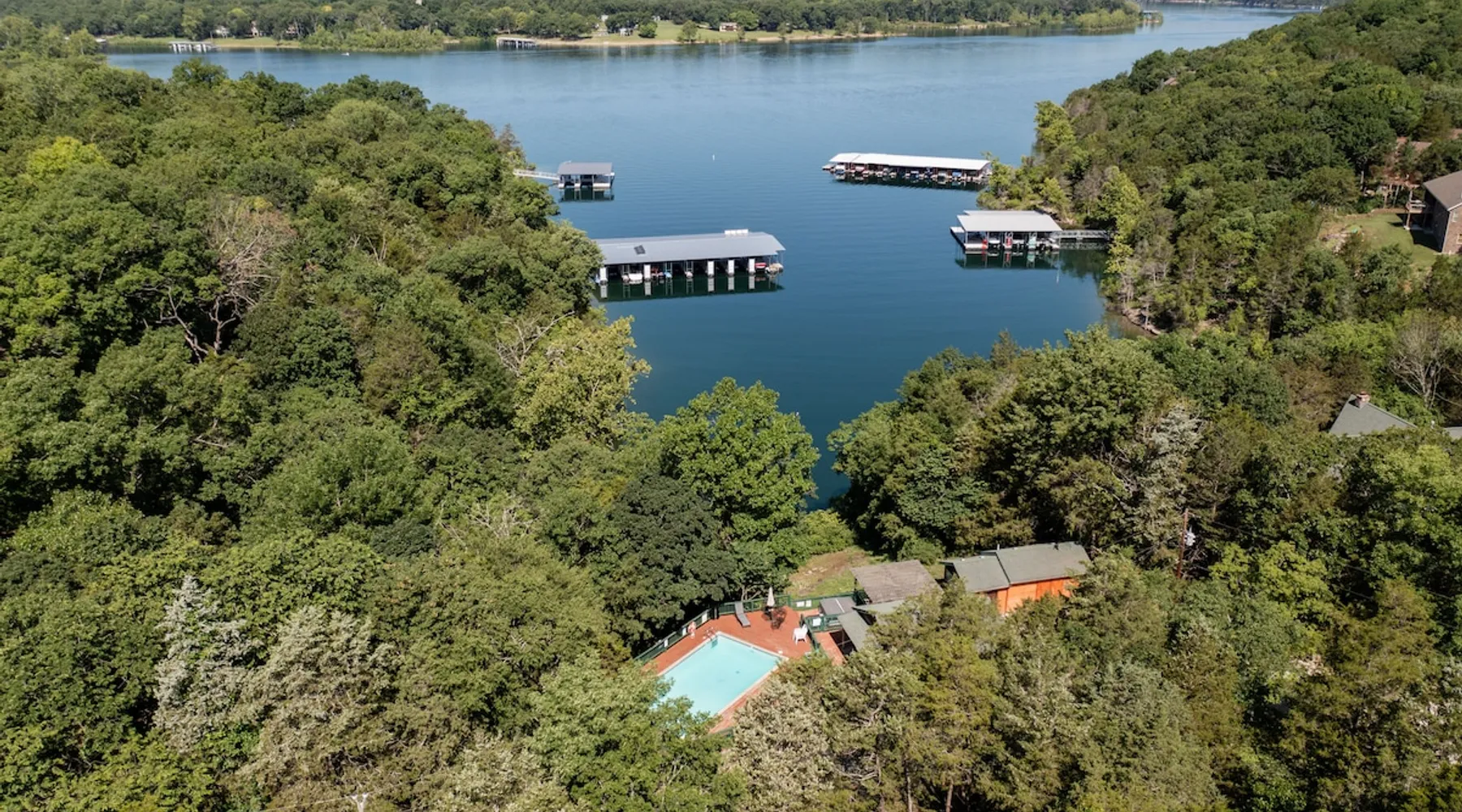 Old Hickory #7 is a great cabin for a large family or group. This cabin has an open concept kitchen, dining and living space with a wood burning fireplace and ceiling fan. On the main floor is a king bedroom, a queen bedroom and a hall bathroom. In the basement are 2 bedrooms with 2 queen beds in each and a hall bathroom. The cabin is situated close to the playground, so the little ones can have fun and adults can sit near by and watch. The space - THE PROPERTY - 1320 Sq Ft | Community Outdoor Pool | Table Rock Lake Access | Walking Trails Get away from it all on the shores of Table Rock Lake and enjoy family and friends while swimming, boating, hiking, fishing and exploring all the amazing attractions. BEDROOMS: #1: 1 King | #2: 1 Queen | Basement #1: 2 Queens| Basement #2: 2 Queens INDOOR LIVING: Open Concept Kitchen, Dining and Living space with wood burning fireplace and ceiling fan. KITCHEN: Fully Equipped with Microwave, Electric Range/Oven, drip coffee maker with coffee and filters, toaster, blender, dishwasher, dishware/flatware, complementary spices OUTDOOR LIVING: Covered Porch, charcoal grill, outdoor dining and lounging, fire pit, porch swing COMMUNITY AMENITIES: Pool, Laundry, lake access, play area. The Hot Tub and pool are winterized for the winter months. They are open Memorial Day weekend to Labor Day weekend. The laundry facilities are winterized November through March. GENERAL: Free wifi located at the communal pool and rec area, linens/bath towels, keyless entry, air conditioning, complementary toiletries. Max Guests 12 PARKING: 2-3 car parking next to cabin - THE LOCATION – TABLE ROCK LAKE (on site access): swimming, fishing, Boating with ramp access via Campbell point Marina (3.2 miles) or Table Rock Lake Ramp (3.9 miles), MarineCorp US (5.7 miles) Guest access Seasonal Laundry March-November, there is a laundromat nearby. Other things to note This Cabin has Fully equipped kitchen and dining are. Cozy living room on the main level. Two bedrooms one king master suite with private bathroom. One queen with shared common bath. The lower level has two bedrooms each having queen beds in each. You'll enjoy a lovely wooded setting from the front porch area , and a shared playground for the kids in the back of the cabin. Just down the lane is a lakeside pool with a lovely view of the lake.