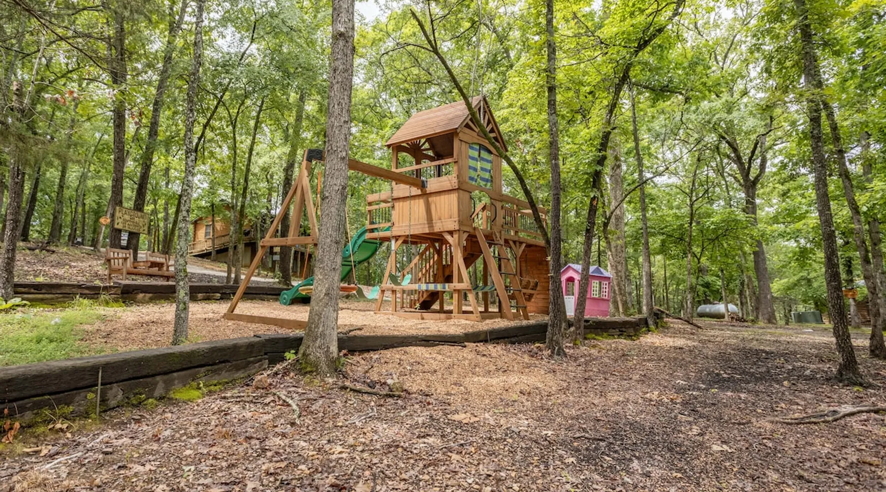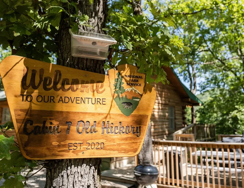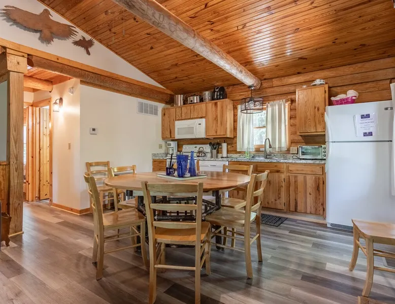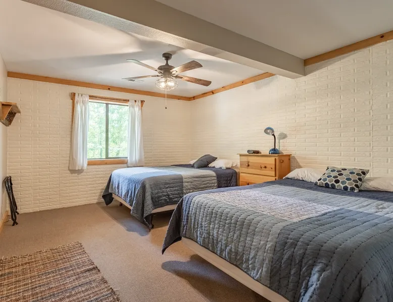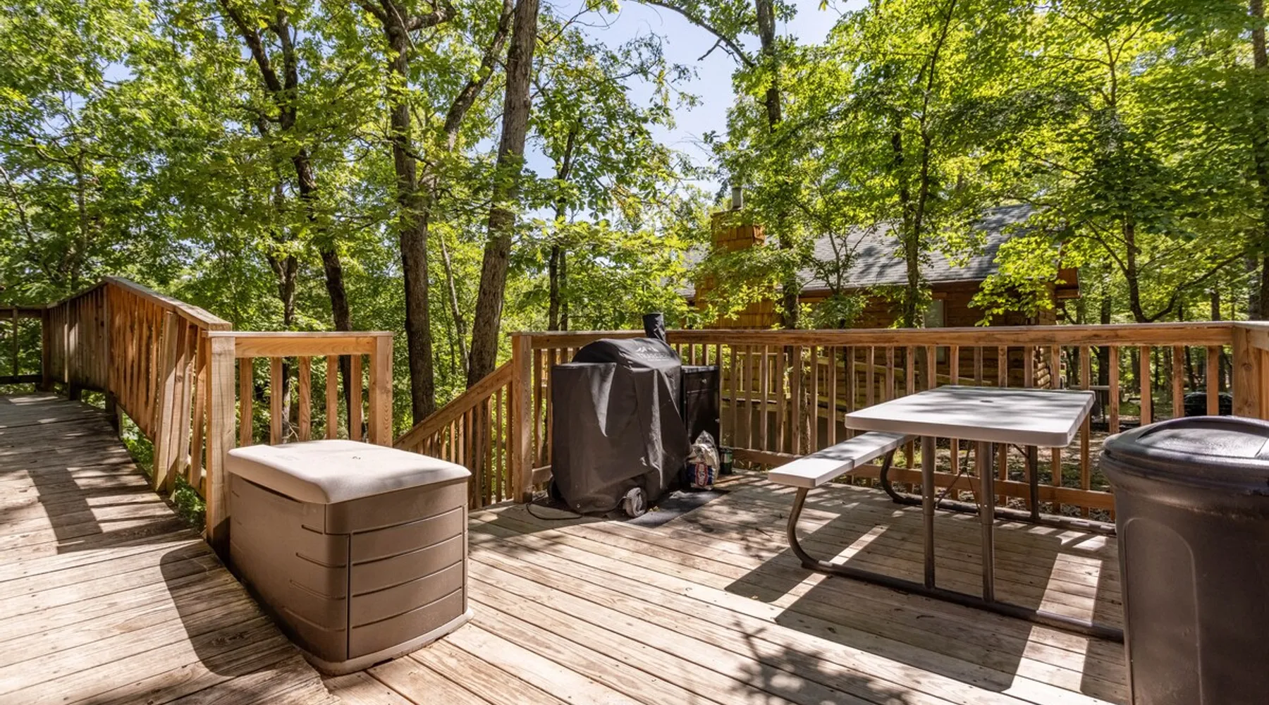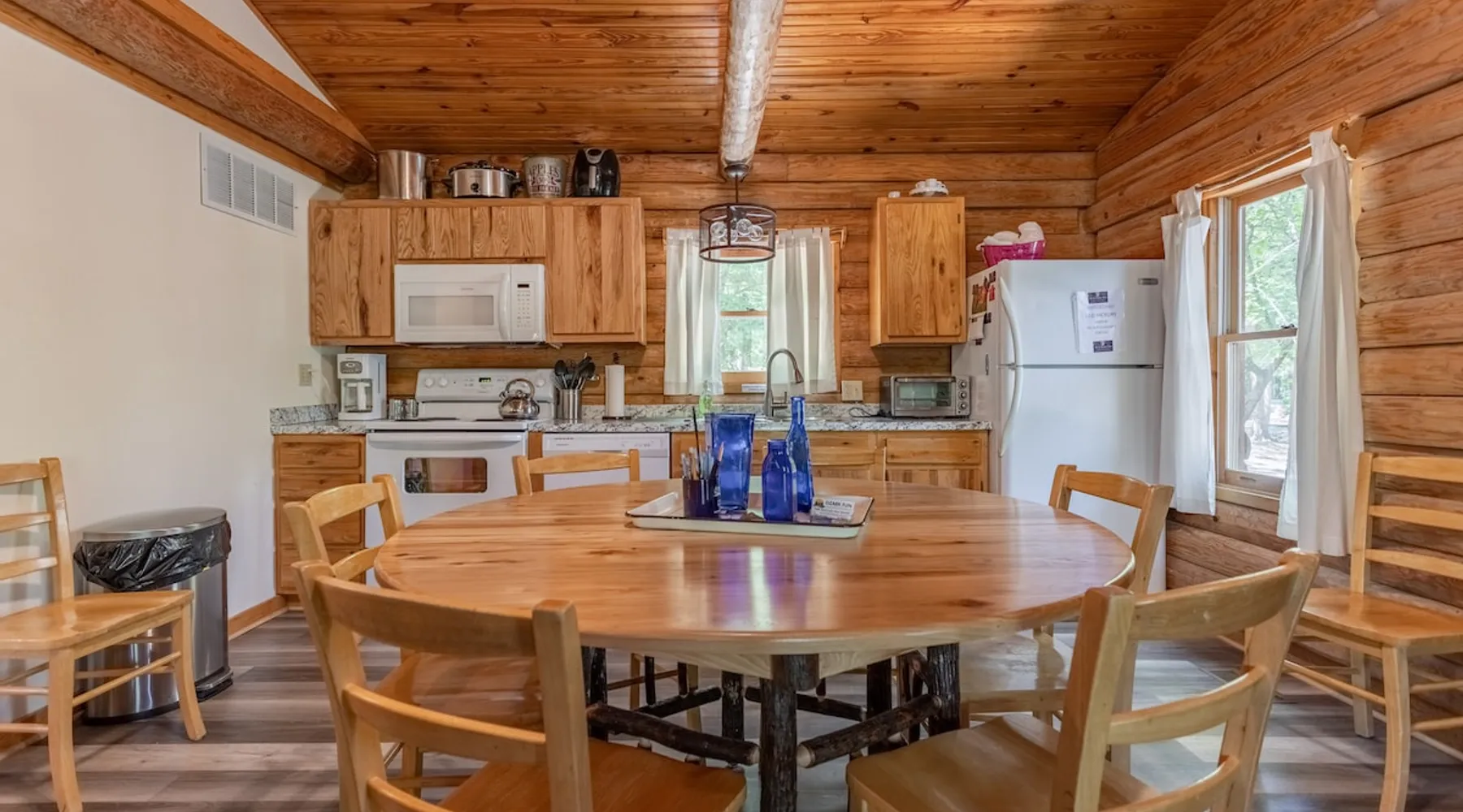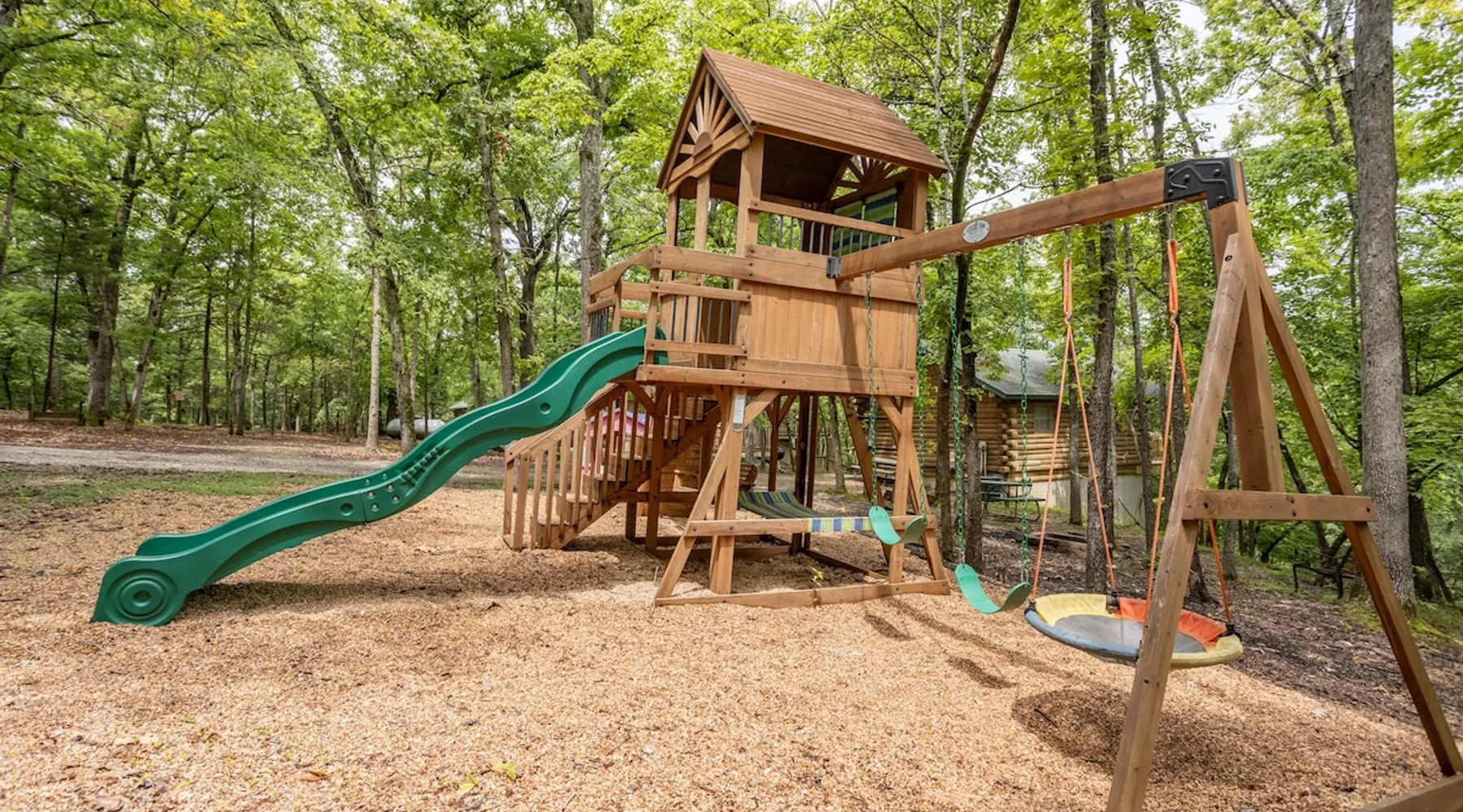 Old Hickory #7 is a great cabin for a large family or group. This cabin has an open concept kitchen, dining and living space with a wood burning fireplace and ceiling fan. On the main floor is a king bedroom, a queen bedroom and a hall bathroom. In the basement are 2 bedrooms with 2 queen beds in each and a hall bathroom. The cabin is situated close to the playground, so the little ones can have fun and adults can sit near by and watch. The space - THE PROPERTY - 1320 Sq Ft | Community Outdoor Pool | Table Rock Lake Access | Walking Trails Get away from it all on the shores of Table Rock Lake and enjoy family and friends while swimming, boating, hiking, fishing and exploring all the amazing attractions. BEDROOMS: #1: 1 King | #2: 1 Queen | Basement #1: 2 Queens| Basement #2: 2 Queens INDOOR LIVING: Open Concept Kitchen, Dining and Living space with wood burning fireplace and ceiling fan. KITCHEN: Fully Equipped with Microwave, Electric Range/Oven, drip coffee maker with coffee and filters, toaster, blender, dishwasher, dishware/flatware, complementary spices OUTDOOR LIVING: Covered Porch, charcoal grill, outdoor dining and lounging, fire pit, porch swing COMMUNITY AMENITIES: Pool, Laundry, lake access, play area. The Hot Tub and pool are winterized for the winter months. They are open Memorial Day weekend to Labor Day weekend. The laundry facilities are winterized November through March. GENERAL: Free wifi located at the communal pool and rec area, linens/bath towels, keyless entry, air conditioning, complementary toiletries. Max Guests 12 PARKING: 2-3 car parking next to cabin - THE LOCATION – TABLE ROCK LAKE (on site access): swimming, fishing, Boating with ramp access via Campbell point Marina (3.2 miles) or Table Rock Lake Ramp (3.9 miles), MarineCorp US (5.7 miles) Guest access Seasonal Laundry March-November, there is a laundromat nearby. Other things to note This Cabin has Fully equipped kitchen and dining are. Cozy living room on the main level. Two bedrooms one king master suite with private bathroom. One queen with shared common bath. The lower level has two bedrooms each having queen beds in each. You'll enjoy a lovely wooded setting from the front porch area , and a shared playground for the kids in the back of the cabin. Just down the lane is a lakeside pool with a lovely view of the lake.