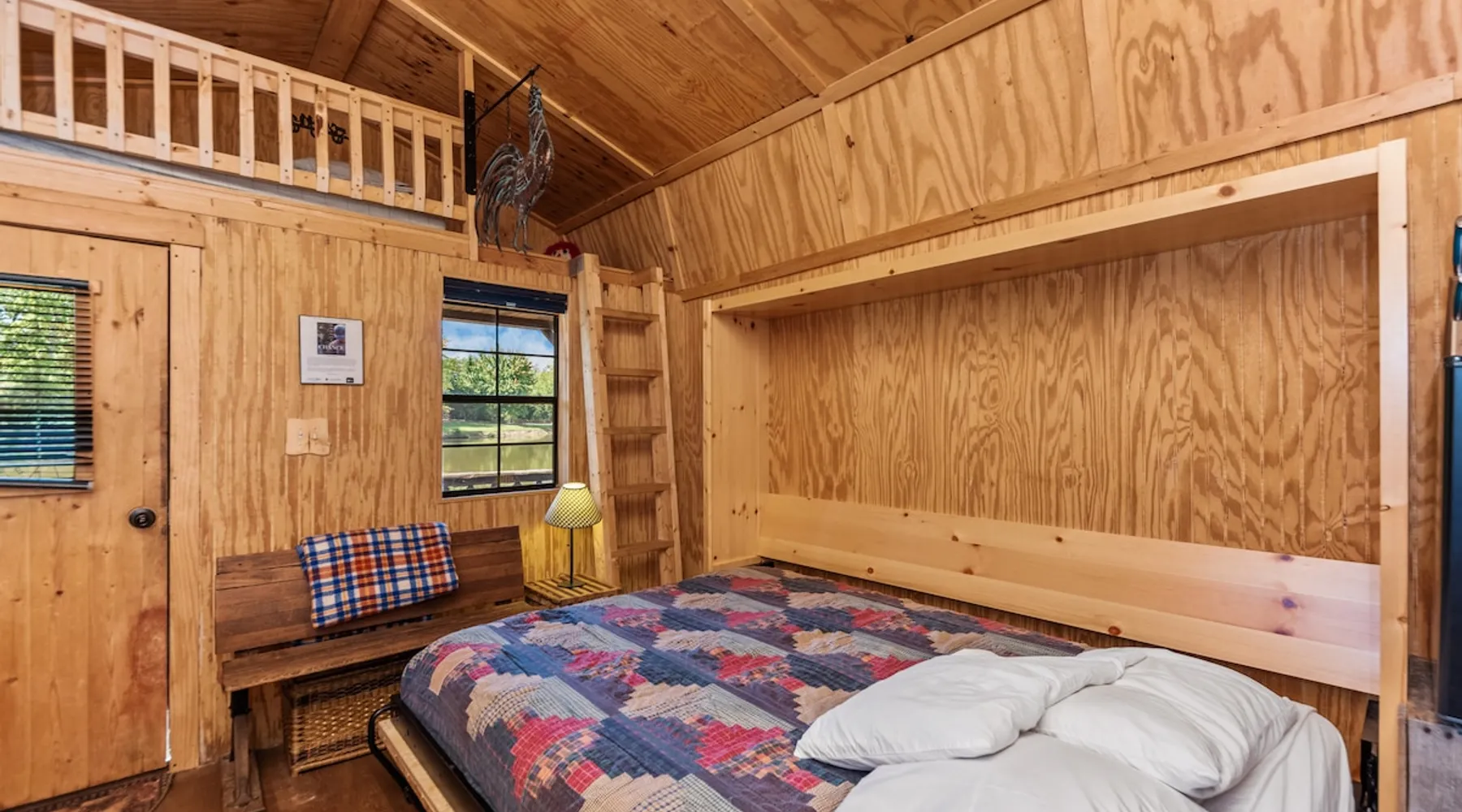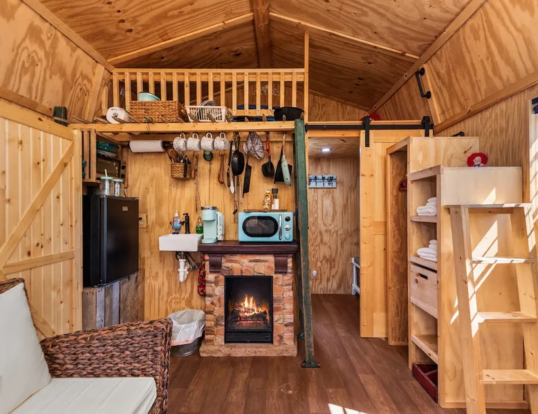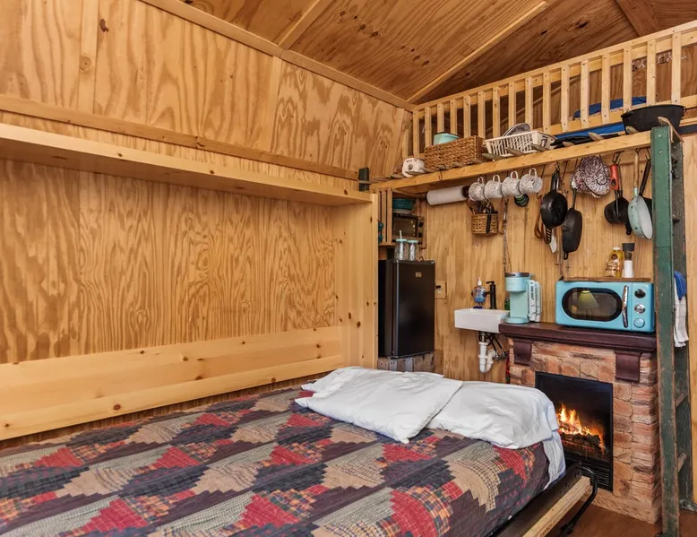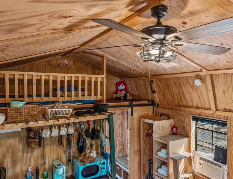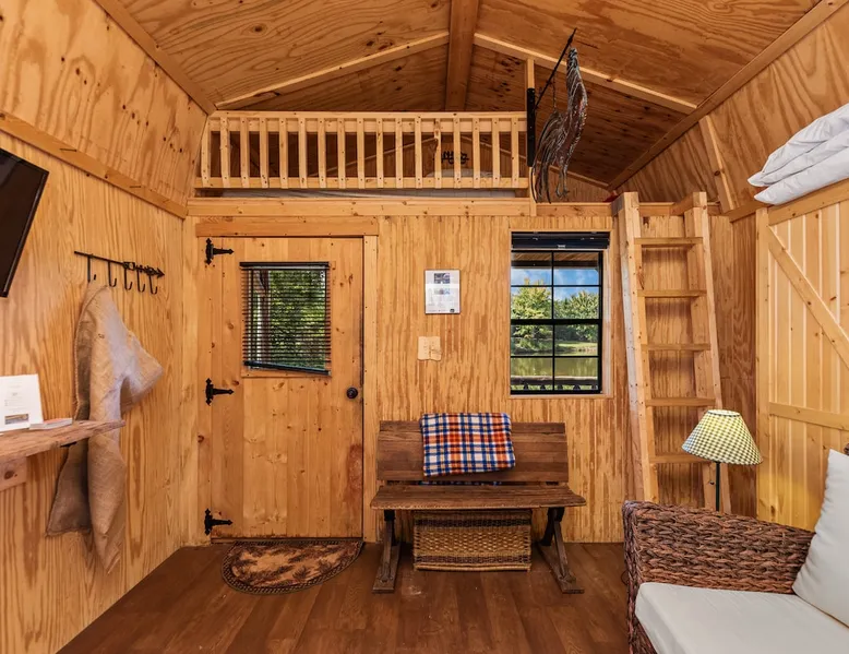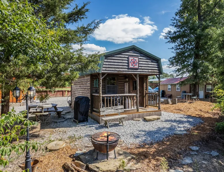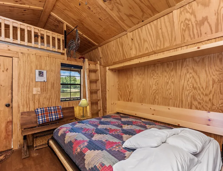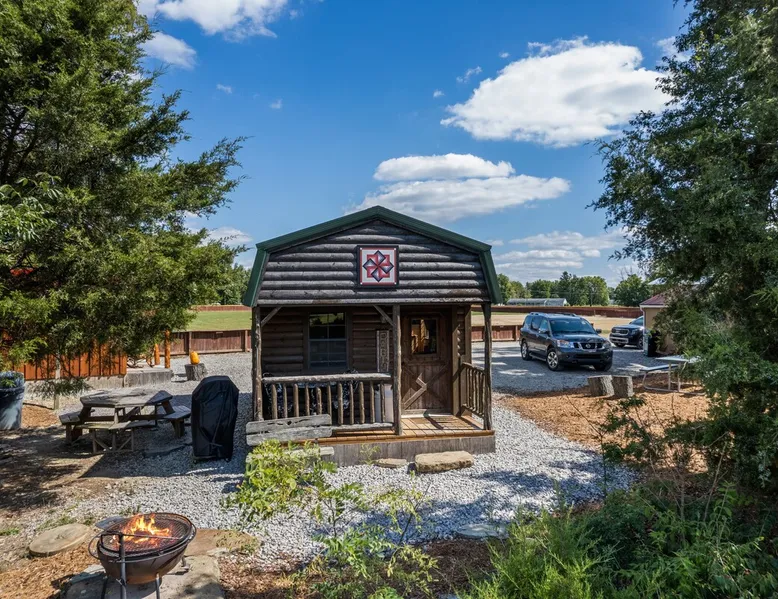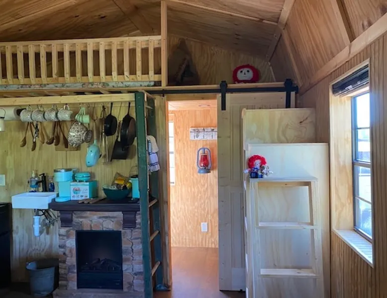 Housed by the brand new Flash Softball Diamonds. Sun rises and sunsets are spectacular. Amazing wildlife. Adorable Old Barn Decor. Outdoor cooking on cast iron fire pit w/upper grill, cast iron fry pans & dutch oven, & all cooking utensils to make an outdoor feast. Firewood provided. Refrigerator/freezer, microwave, toaster oven, Keurig coffee maker, air conditioner, smart tv, fireplace heater. The space Quaint barn decor includes 2 twin loft beds and custom made Murphy bed. A stone's throw away from the newly reopened Flash Softball diamonds. Guest access You will need to tuck your car right next to the cabin during ball games to protect it from any stray foul balls. Or park behind the outfield. Parking is at own risk. Other things to note Dogs are allowed but there is a $50 per pet charge. 2 dog limit.