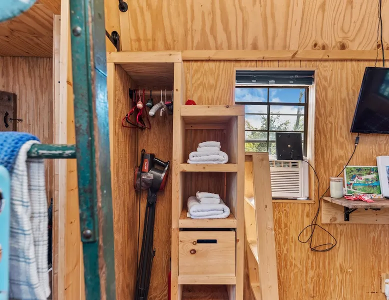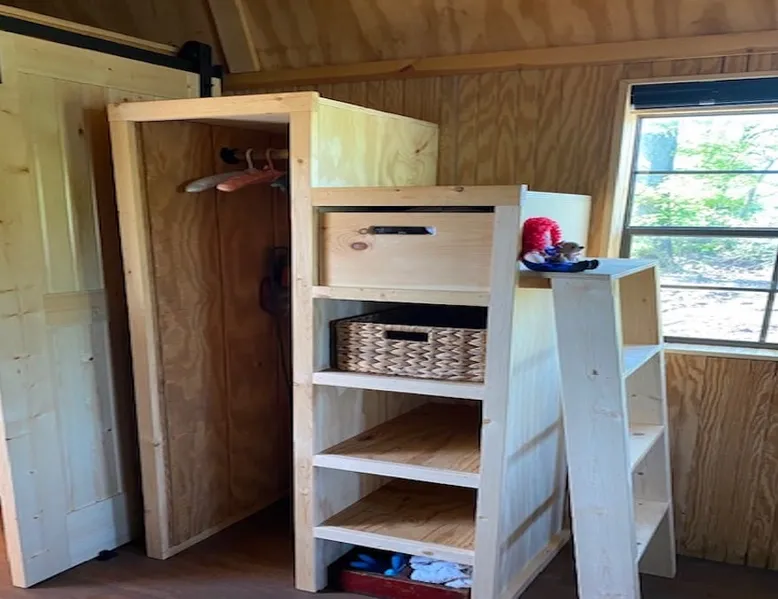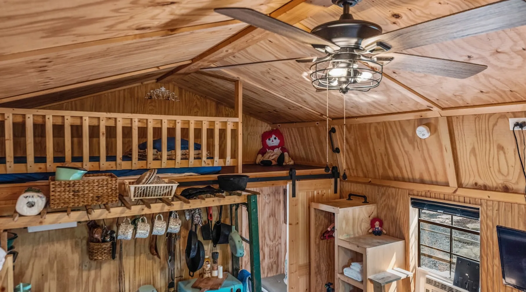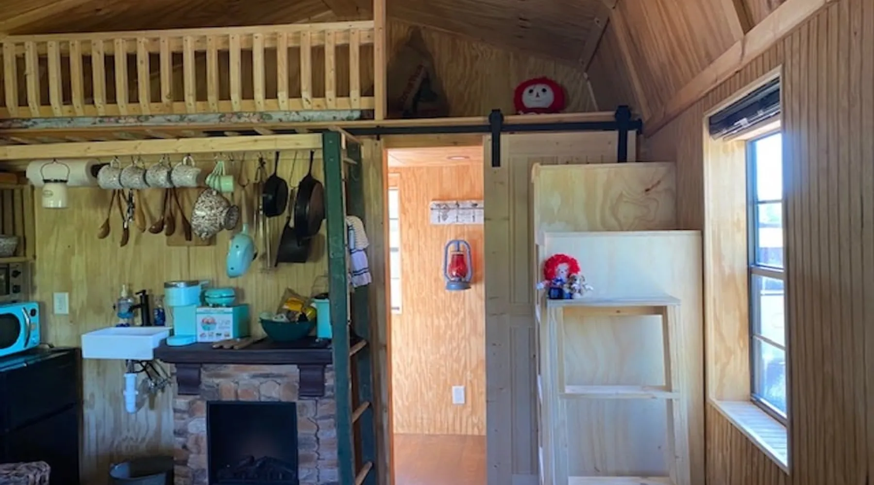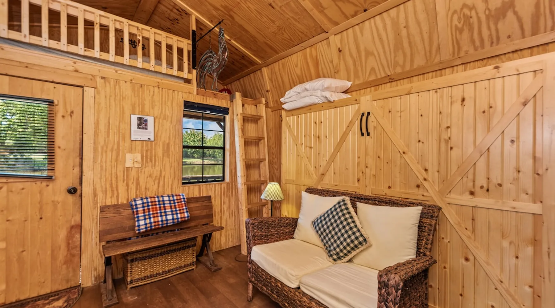 Housed by the brand new Flash Softball Diamonds. Sun rises and sunsets are spectacular. Amazing wildlife. Adorable Old Barn Decor. Outdoor cooking on cast iron fire pit w/upper grill, cast iron fry pans & dutch oven, & all cooking utensils to make an outdoor feast. Firewood provided. Refrigerator/freezer, microwave, toaster oven, Keurig coffee maker, air conditioner, smart tv, fireplace heater. The space Quaint barn decor includes 2 twin loft beds and custom made Murphy bed. A stone's throw away from the newly reopened Flash Softball diamonds. Guest access You will need to tuck your car right next to the cabin during ball games to protect it from any stray foul balls. Or park behind the outfield. Parking is at own risk. Other things to note Dogs are allowed but there is a $50 per pet charge. 2 dog limit.
