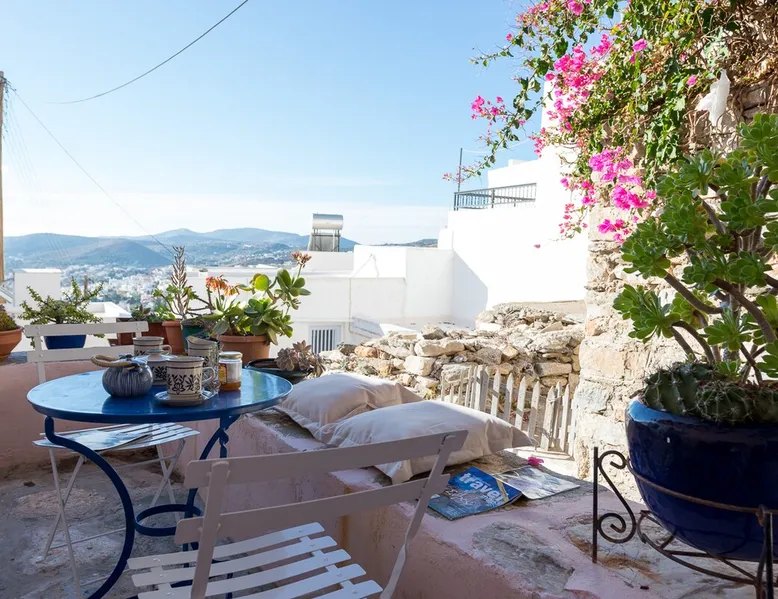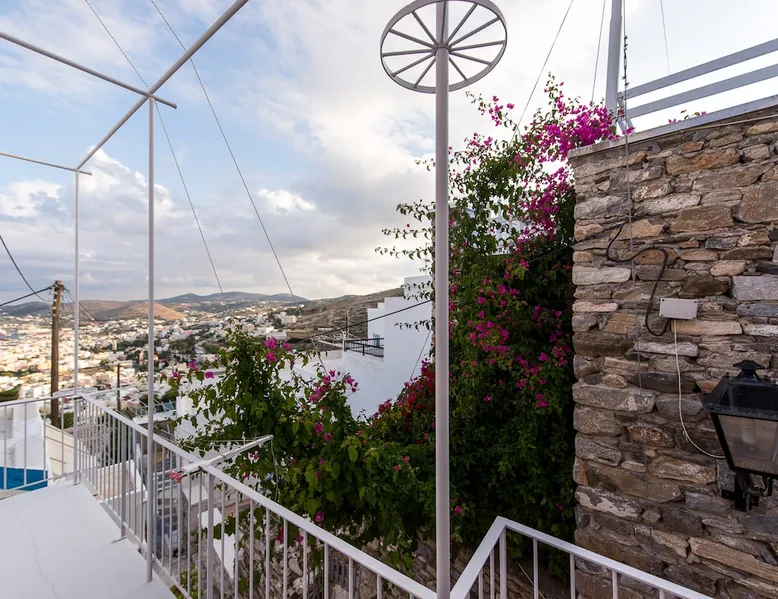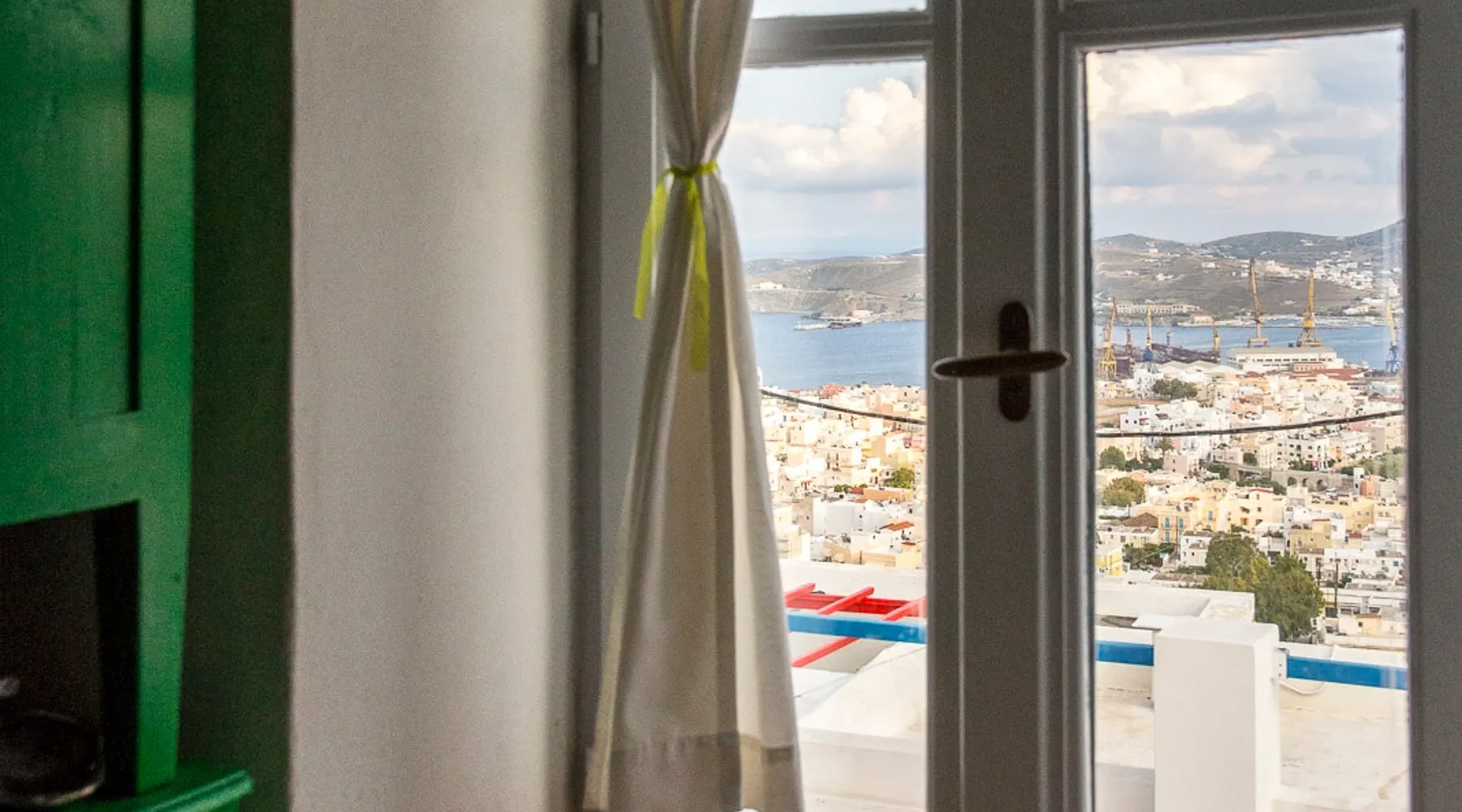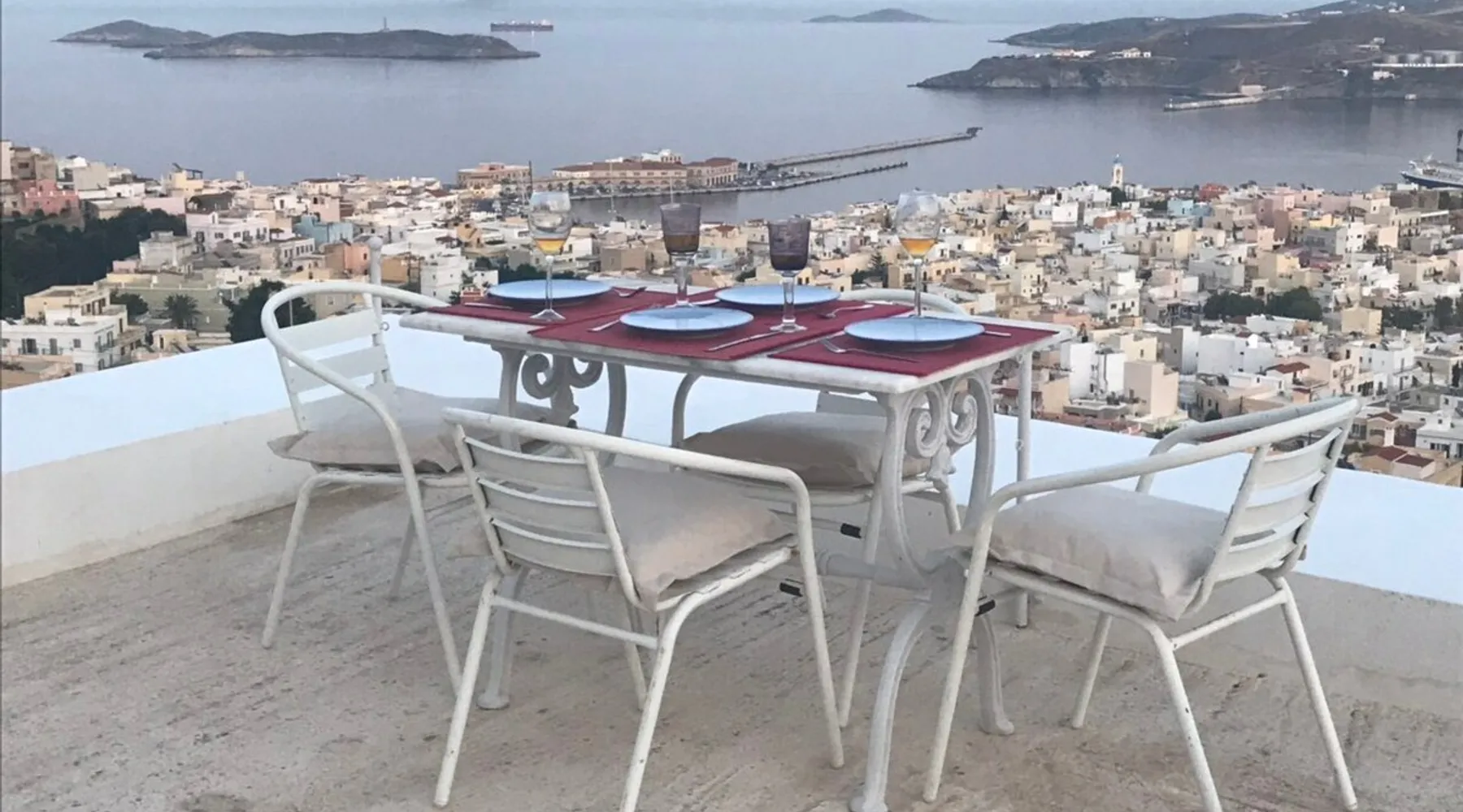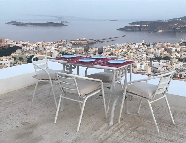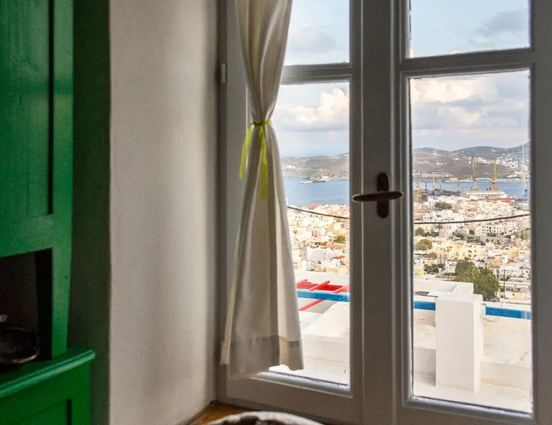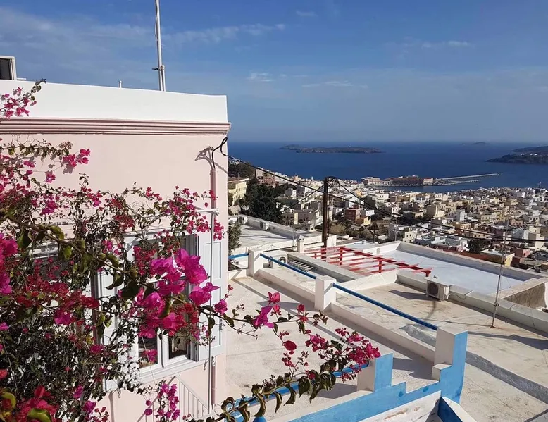This 2floor traditional house dating from the late 19th century is located in Ano Syros, the medieval town of Syros which is blissfully free of motor vehicles. It is situated right on the Square of Markos Vamvakaris, next to Piazza, the main street of the settlement, along which there are restaurants, cafés, a grocery store and cozy shops selling handicrafts. The space This 2floor traditional house, dating from the late 19th century, is located in Ano Syros, the medieval town of the island of Syros. It is located right on the Markos Vamvakaris Square, 50 m. away from the Piazza, the main commercial street of the town, where the visitor can find restaurants, cafés, a grocery store and cozy handicrafts stores. There is a pharmacy close by the Kamara (URL HIDDEN) be noted that no vehicles are allowed in Ano Syros. This exceptional house (119m2), was renovated in 2003. It includes 2 bedrooms with one king size bed each, and one sofa double bed in the living room. There is one WC with shower on the first floor and one en suite bathroom on the ground floor bedroom. The kitchen is bright, comfortable and fully equipped while from the living room’s windows or the large terrace you can enjoy the view to the town of Ermoupolis, the port and the fantastic deep blue sea water, overlooking Tinos, Mykonos and Paros islands. The house is an excellent choice for families, couples on romantic getaways or a group of people up to 6 persons. Guest access Kamara entrance in Ano Syros is just 10min from town by mini bus. You can also get there by taxi, car or motorbike, choosing Portara entrance, in a 5min drive. In Portara there is a parking area and the house is in 200m distance. Other things to note Washing machine and dishwasher are available for use to our hosts. Prefer to drink bottled water. For hot water, turn on the water heater for 15 mins. Please do not forget to turn off water heater and air condition, saving energy and respecting the environment. Remember to lock the main entrance when you leave from the house. Please leave rubbish seperately in the trash cans on both entrances. We provide you with clean bed linens and towels. In case of long term reservations, bed linens and towels are available once a week. Registration details 00000217352