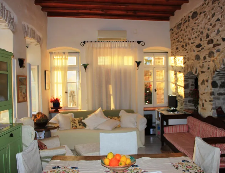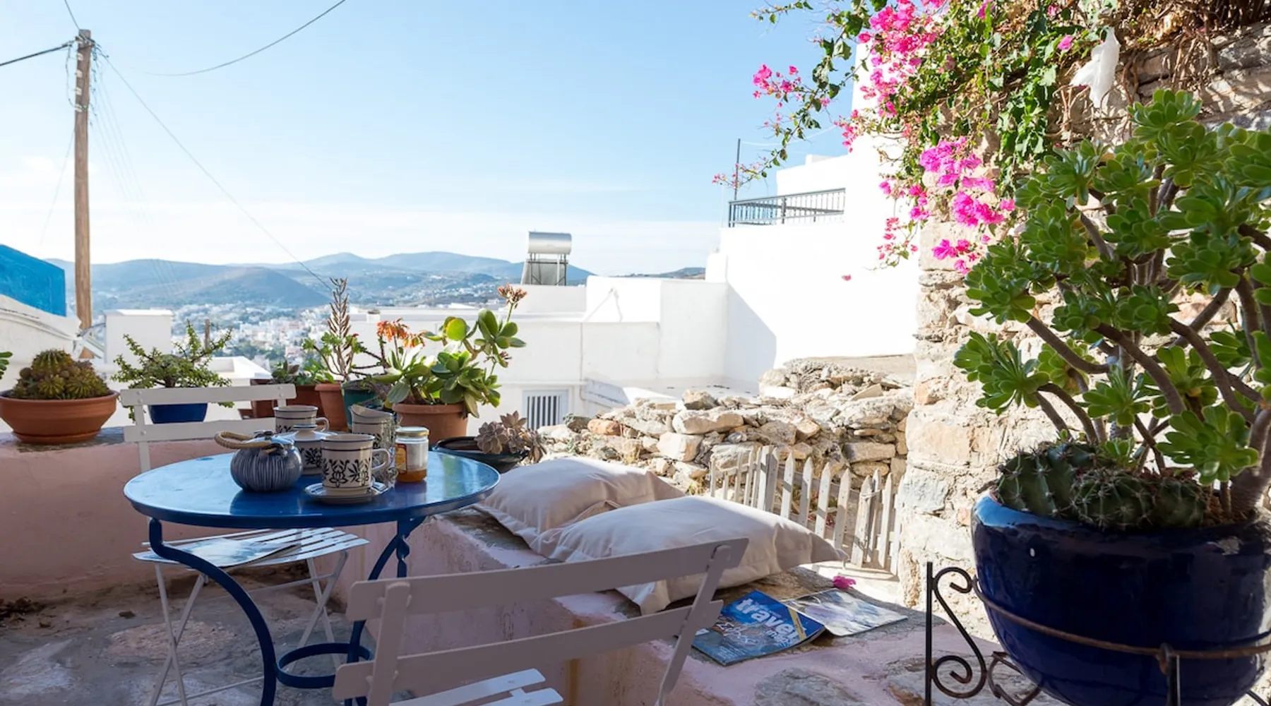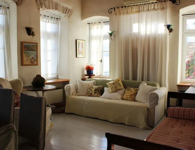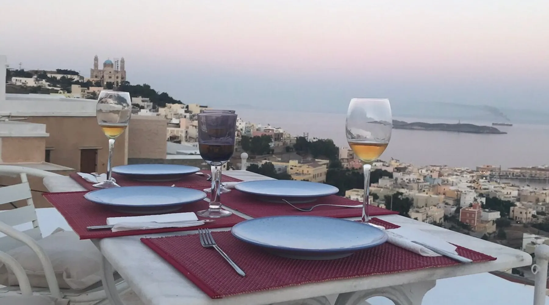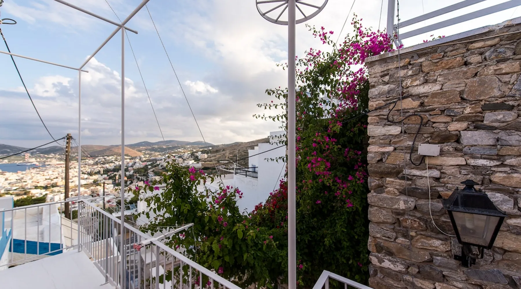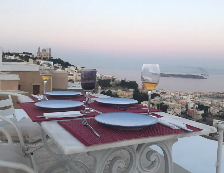 This 2floor traditional house dating from the late 19th century is located in Ano Syros, the medieval town of Syros which is blissfully free of motor vehicles. It is situated right on the Square of Markos Vamvakaris, next to Piazza, the main street of the settlement, along which there are restaurants, cafés, a grocery store and cozy shops selling handicrafts. The space This 2floor traditional house, dating from the late 19th century, is located in Ano Syros, the medieval town of the island of Syros. It is located right on the Markos Vamvakaris Square, 50 m. away from the Piazza, the main commercial street of the town, where the visitor can find restaurants, cafés, a grocery store and cozy handicrafts stores. There is a pharmacy close by the Kamara (URL HIDDEN) be noted that no vehicles are allowed in Ano Syros. This exceptional house (119m2), was renovated in 2003. It includes 2 bedrooms with one king size bed each, and one sofa double bed in the living room. There is one WC with shower on the first floor and one en suite bathroom on the ground floor bedroom. The kitchen is bright, comfortable and fully equipped while from the living room’s windows or the large terrace you can enjoy the view to the town of Ermoupolis, the port and the fantastic deep blue sea water, overlooking Tinos, Mykonos and Paros islands. The house is an excellent choice for families, couples on romantic getaways or a group of people up to 6 persons. Guest access Kamara entrance in Ano Syros is just 10min from town by mini bus. You can also get there by taxi, car or motorbike, choosing Portara entrance, in a 5min drive. In Portara there is a parking area and the house is in 200m distance. Other things to note Washing machine and dishwasher are available for use to our hosts. Prefer to drink bottled water. For hot water, turn on the water heater for 15 mins. Please do not forget to turn off water heater and air condition, saving energy and respecting the environment. Remember to lock the main entrance when you leave from the house. Please leave rubbish seperately in the trash cans on both entrances. We provide you with clean bed linens and towels. In case of long term reservations, bed linens and towels are available once a week. Registration details 00000217352