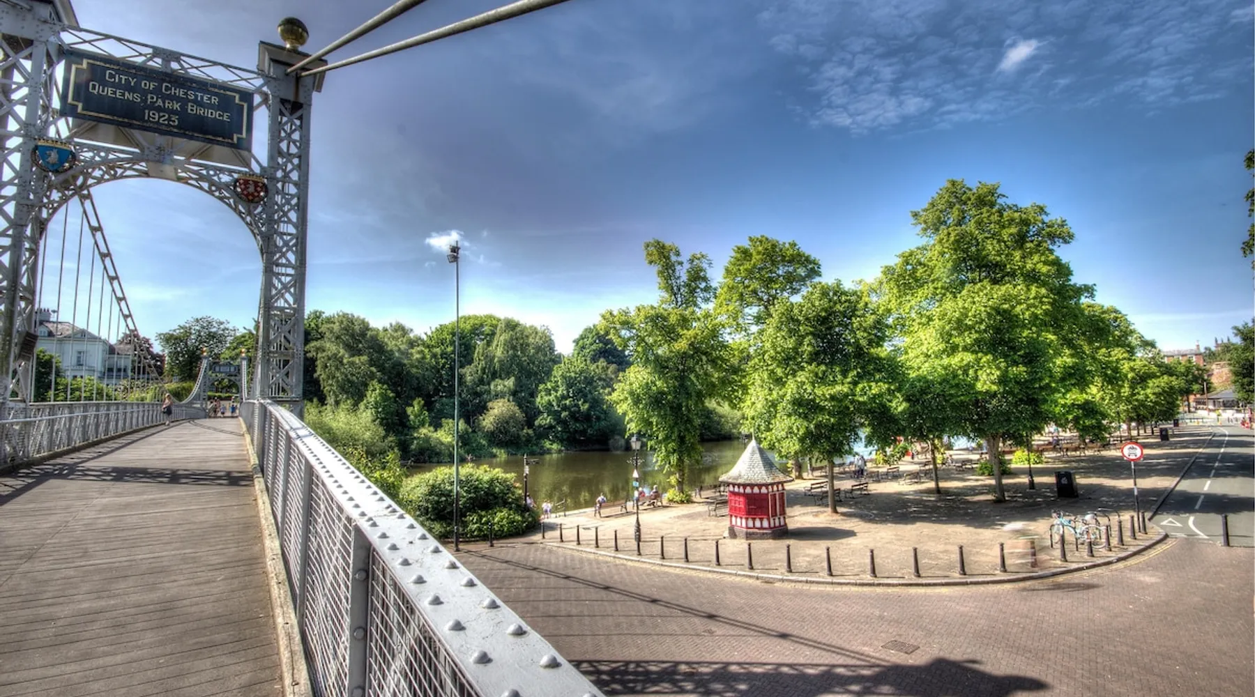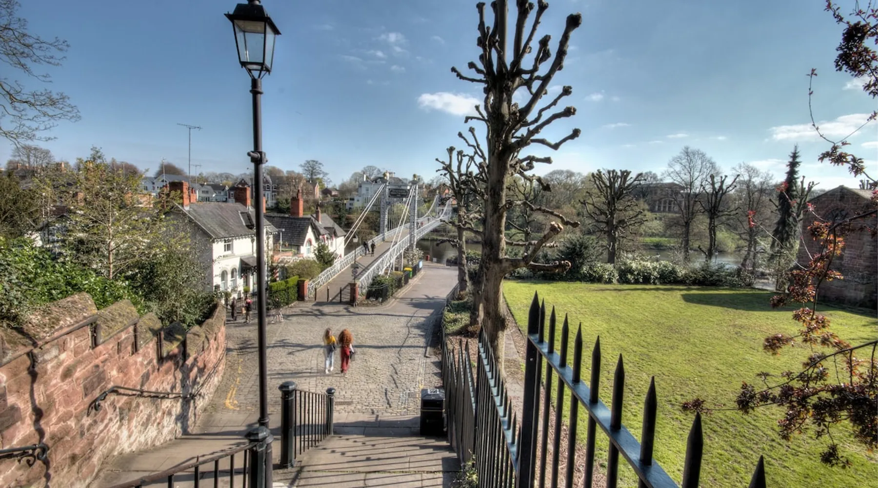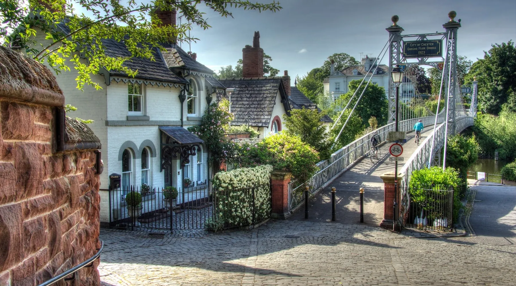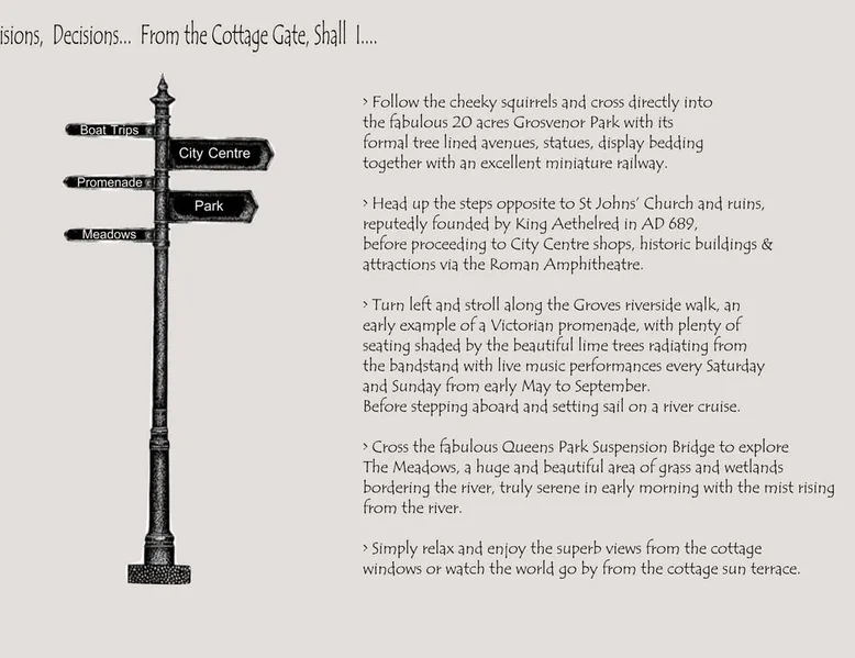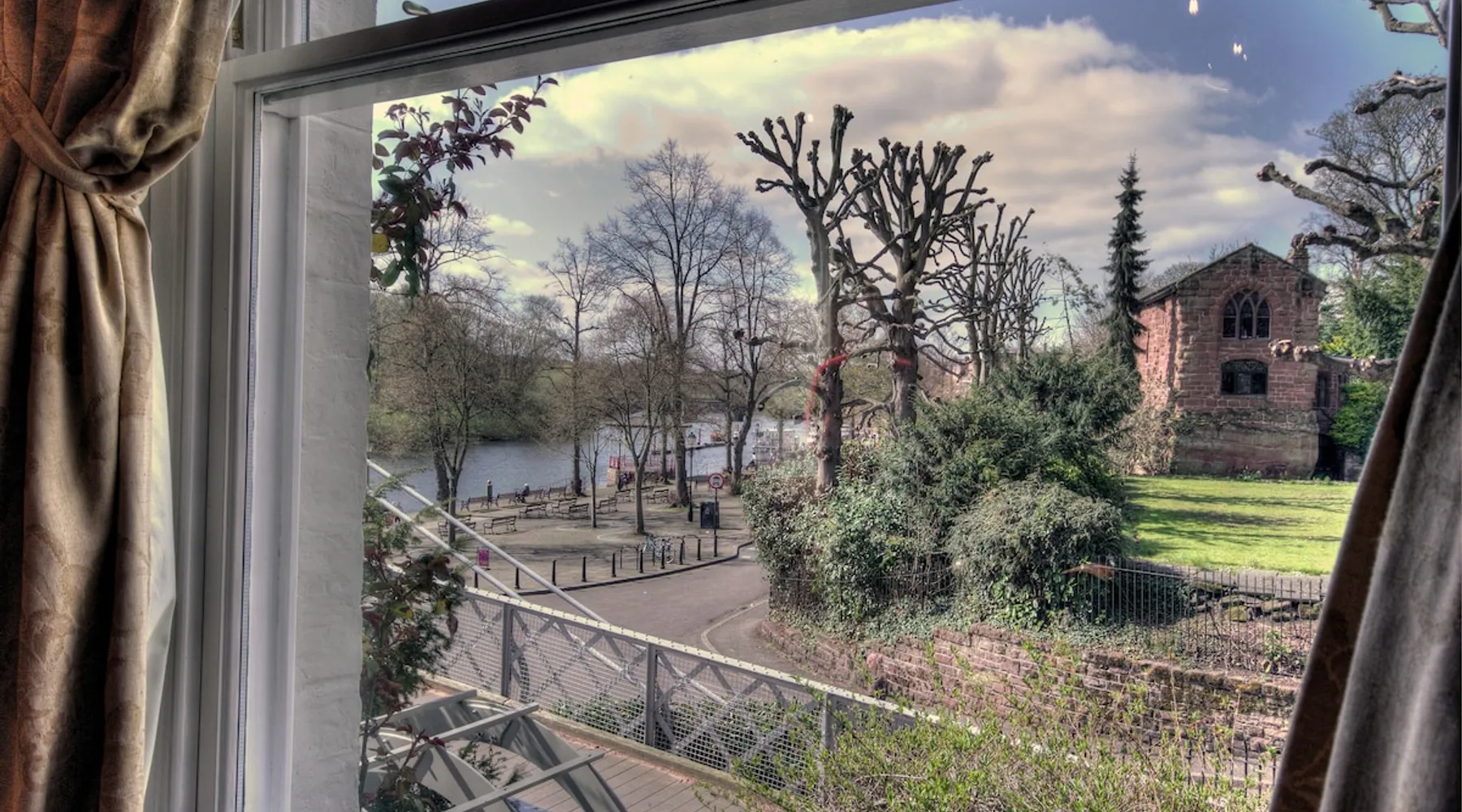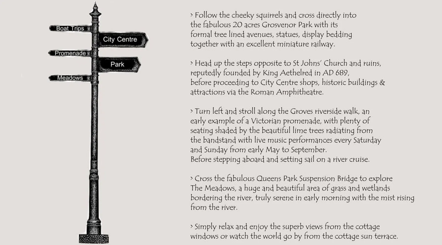 Located on the picturesque banks of the River Dee in the area of the city known as The Groves, one of the most attractive and popular tourist areas in the heart of Chester, Riverbridge Cottage is the holiday cottage to choose. This charming and characterful Victorian cottage is in a truly exceptional position set aside the entrance to the delightful pedestrian footbridge over the River Dee, opposite the gates to Grosvenor Park and the steps up to St John’s Church & City beyond (2 mins walk) The space Stunning views from the cottage across the vibrant Groves Riverside promenade area with its newly renovated bandstand and the cute ice cream kiosks. Historic views of the Old Dee Bridge, Anchorite’s Cell and St John’s Church from the cottage windows. As you enter via the gated courtyard and open the door to Riverbridge Cottage you know you are in for a treat. Lovingly renovated with considerable thought and care over a number of years and uniquely & lavishly furnished. The cottage is immediately welcoming. Set over 3 floors with the main living space upstairs to take full advantage of the splendid views. The delightful accommodation comprises of:- Bedroom 1:- An elegant master bedroom with two large arch top sash windows and impressively high ceiling set with a gleaming crystal chandelier above a kingsize double brass bedstead headed by a beautiful tapestry wall hanging. A comfy armchair also awaits you in the corner, a great place to read and relax. Bedroom 2:- A superb French-inspired twin room with a pair of ornate French beds headed by a French tapestry wall hanging and an amazing crystal chandelier. Also features a wonderful ornate mirror with candle sconces. This room boasts more amazing views. Bedroom 3:- French-inspired twin room with a pair of ornate French beds and button back reading chair. Two fabulous lounge sitting rooms:- Main lounge:- Elegantly furnished with triple aspect windows offering amazing views – great for people watching and relaxing. Also features access to the splendid rooftop terrace with patio furniture and sunshade. A great place to unwind. Lower floor lounge :- This room with interesting features includes an inglenook fireplace. A wonderful room to relax in. Reception room:- Welcoming ground floor reception room with two large arch top sash windows and an impressively high ceiling encircled with fascinating plaques. A feature fireplace with overmantle mirror. Door leading to entrance hall with hat & coat rack and features a Victorian tiled floor. Two separate bathrooms: Bathroom 1:- Ground floor bathroom with large walk-in mirrored shower, wash hand basin and WC. Bathroom 2:- Lower floor bathroom with large bathtub, shower cubicle, wash hand basin and WC. Kitchen/dining room:- The kitchen and dining area is a delightful feature of the cottage. Very well equipped with quality AEG appliances. The dining area features a large 6 seat dining table and chairs. Double patio doors open onto a walled furnished patio area with rose-covered ornate pergola, making a great outside space to relax in. Utility: Utility area with a washer-dryer, ironing facilities, sink & drainer and first aid cabinet. Further Information. > The cottage has free Wifi > Televisions to each of the two lounge rooms > Towels and bed linen is provided > Maximum occupancy is 6 adults > Minimum stay – 2 nights > No children under 5 years of age > No pets > No smoking > No stag or hen parties