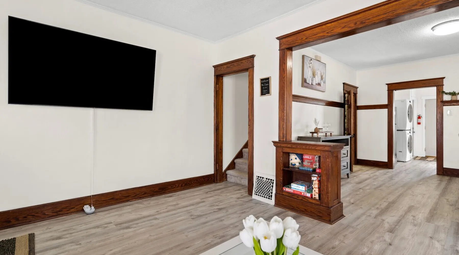 Bienvenidos! This beautiful DUPLEX, bursting with character and modern amenities, has been fully renovated from the ground up to make it the perfect home-away-from-home for families and groups visiting Fort Wayne. The main level features an open floor plan with spacious living and dining rooms, and the appeal continues as you make yourself at home in one of the three ample upstairs bedrooms. Abundant amount of free parking. Parking Lot and off street. Parking Passes provided. The space Our spacious 3-bedroom duplex is nestled in a beautiful, walkable neighborhood right in the heart of Fort Wayne. Each of our bedrooms features a plush queen bed, bright white linens, plentiful storage space, and a desk perfect for teleworking. We're located less than an 8-minute drive away from the Coliseum, Embassy Theater, Glenbrook Mall, Grand Wayne Center, and so much more! Choose from a selection of excellent restaurants for unique local takeout, or visit the grocery store down the street if you'd prefer to cook your meals in our fully equipped kitchen. Guest access Enjoy convenient parking options right off-street or in the parking lot directly in front of the house. All parking is free and allowed, you will not be towed. Once inside, enjoy over 1,800 square feet of living space! The only excluded areas are the owner's supply closet and the basement/mechanical room, which are off-limits to guests. Other things to note We designed this space with features and amenities to meet everybody's needs. So come and go as you please. This is your house, and we can't wait to welcome you! The property has a SECURITY camera or recording device capable of recording or sending video, audio, or still images- on EXTERIOR OF PROPERTY/ OUTSIDE OF HOME. “Two SECURITY exterior doorbell cameras in entrance of both front doors. One floodlight exterior camera facing backyard. Motion detected. Records audio/video”