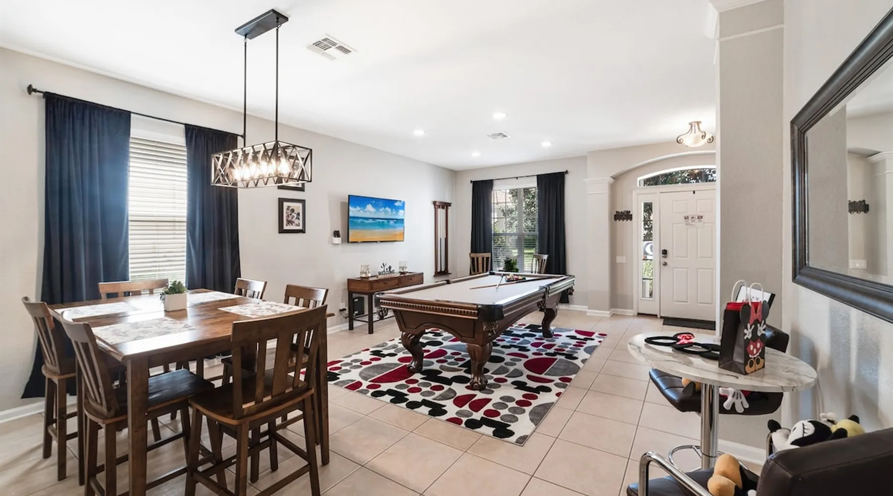 Welcome to our Fantasmic Wonderland, located within the most sought after Windsor Hills Resort. It is 5 minutes from WDW Disney World and 20 minutes from Sea world and Universal Studios. Our vacation home with fully customized themed bedrooms, state of the art Arcade room and private heated pool and spa, is recently renovated to suit your needs. We are offering complimentary Pool Heat and BBQ grill. We offer FREE access to Windsor Hills resort amenities including water park, lagoon style po The space This spacious and beautifully decorated 6-bedroom, 4-bathroom home can accommodate a family or group of up to 15 people. When you walk in, you are greeted with a beautiful Billiard Collection pool table. There is an open living and dining floorpan with a fully equipped gourmet kitchen with essential utensils, pots, pans etc along with all the appliances you will need for your vacation. Enjoy free high speed WiFi, cable and smart TVs in all the rooms, pack n play, baby gate, pool alarm, baby safety pool fence, high chair, stroller and games for the kids. After a long data the parks, you can unwind with the whole family in an air-conditioned fully equipped arcade room. You will fall in love with our state of the art Arcade room including Basketball, Air Hockey, Foosball, 2 side by side Sega Racing Games and Xbox and PS4 gaming system. One of the living areas feature American Heritage Hunter Billiard Collection Pool Table with a table tennis top. Explore Orlando and its magic during the day relax at home with over 100+ classical DVD movies or family board games. games. You can also spend the day at home and grill up dinner in our new gas grill in your own private screened lanai backs onto a shallow wall and a grass area with dining table, lounge chairs, TV, BBQ gas Grill or enjoy your very own private heated pool and spa and get the feel of tropical Florida weather! Our Wonderland has enhanced cleaning protocols in place and has 24/7 security with the video door bell and exterior cameras for your safety and a unique key code for a smart lock so you don’t have to keep track of the keys during your stay, and is a short 2 mins drive to the clubhouse where you will enjoy various waterfront activities, kids splash area, hot tub, water slides in Aqua water park, movie, theater, table tennis, game room, etc. Bedroom Details: Bedroom 1: (Lilo and Stitch - Ohana themed) Queen bed - (Downstairs for privacy) Bedroom 2: (Agrabah - Aladdin themed) King bed - (Upstairs ensuite bathroom) Bedroom 3: (Once upon a tide - Beach themed) King bed (Upstairs ensuite bathroom) Bedroom 4: (Pride Lands - LionKing themed) King bed (upstairs) Bedroom 5: (Galactic World - StarWars themed) Bunk (Twin/Twin) Bunk (Twin/Full) Bedroom 6: (Marvel - SuperHero themed) Bunk Twin/Twin Bunk Twin/Twin Guest access All guests can enjoy the many resort amenities free of charge including access to Windsor Hills Water park featuring dueling water slides, Olympic size lagoon style pool and hot tub, toddler pool, fitness center with top-of-the-line fitness equipment, recreational park with tennis, putting green, volleyball, children’s playground, a picnic area, game room, movie theater, ATM and market place & grill. Please note, community pool is closed for maintenance for the month of September 2024. Waterpark will still be open.