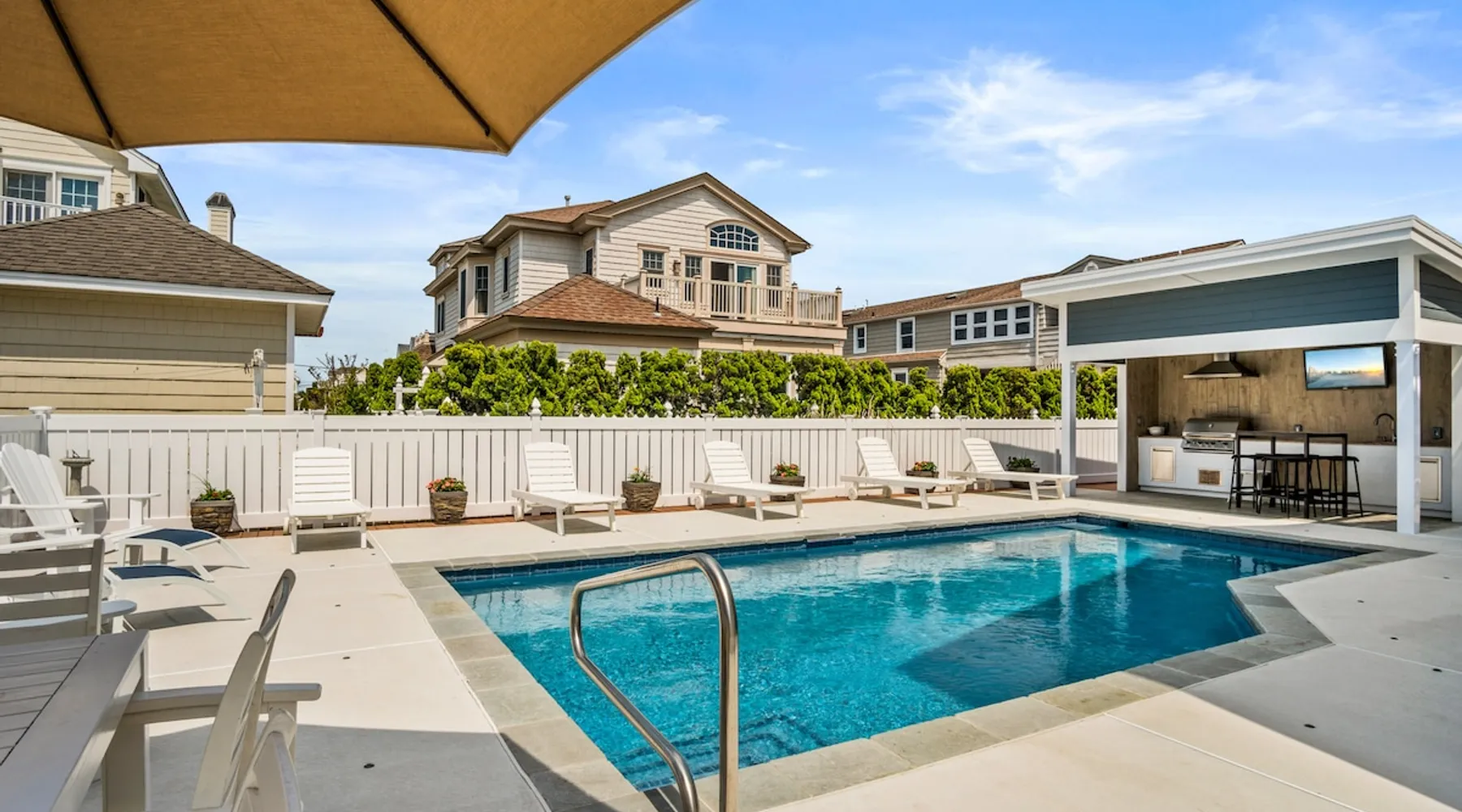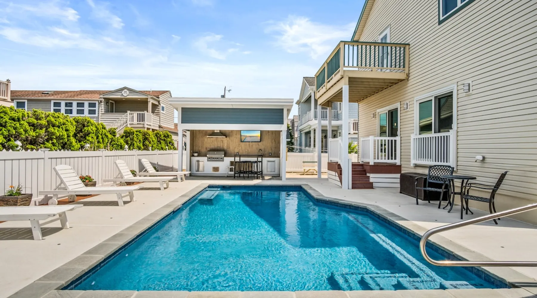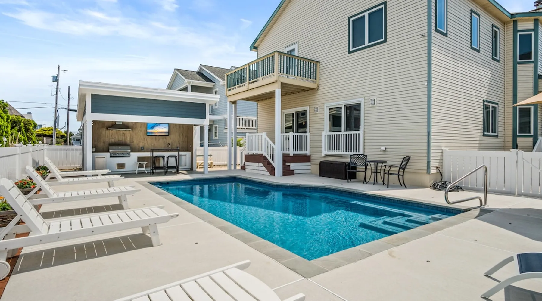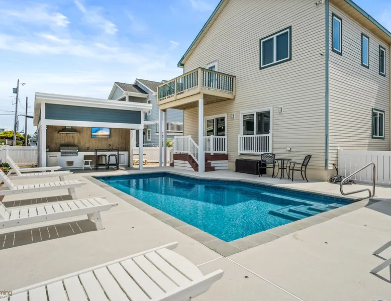 5th house from the finest beach in Stone Harbor, this lovely 5 bedroom, 3.5 bath home ("Villa Char Stone Harbor") is a short stroll to downtown. We added a cabana with outdoor TV & grill as well as a fabulous heated pool in May 2017. Walk to the beach, walk to town, you'll love it ! Other things to note Between Memorial Day Weekend and Labor Day Weekend we require a 7 night minimum (weekly rental).