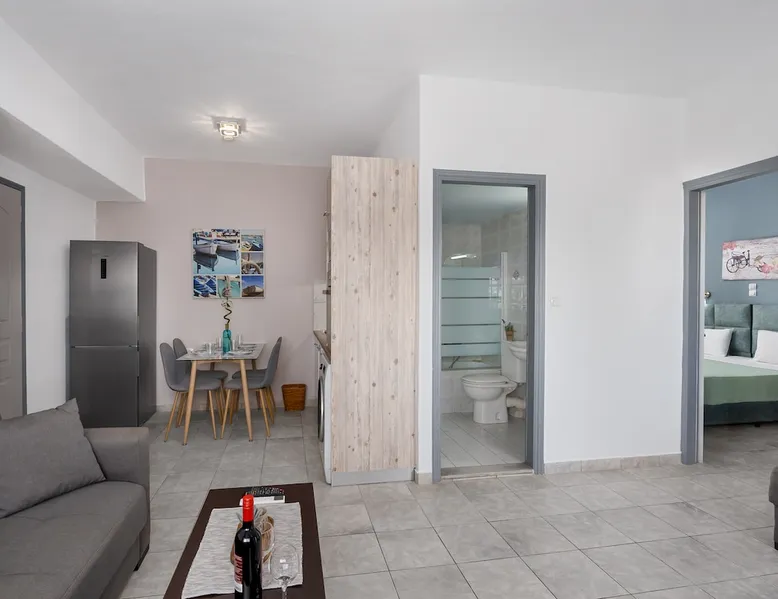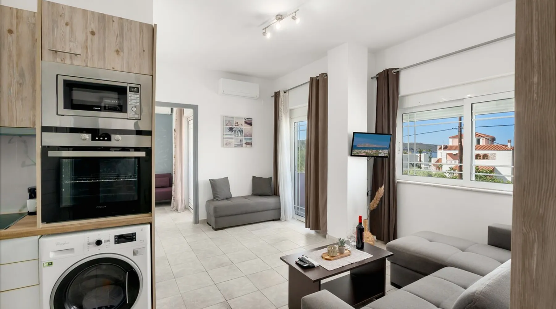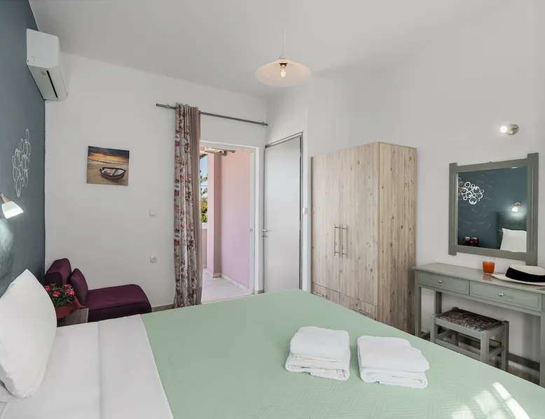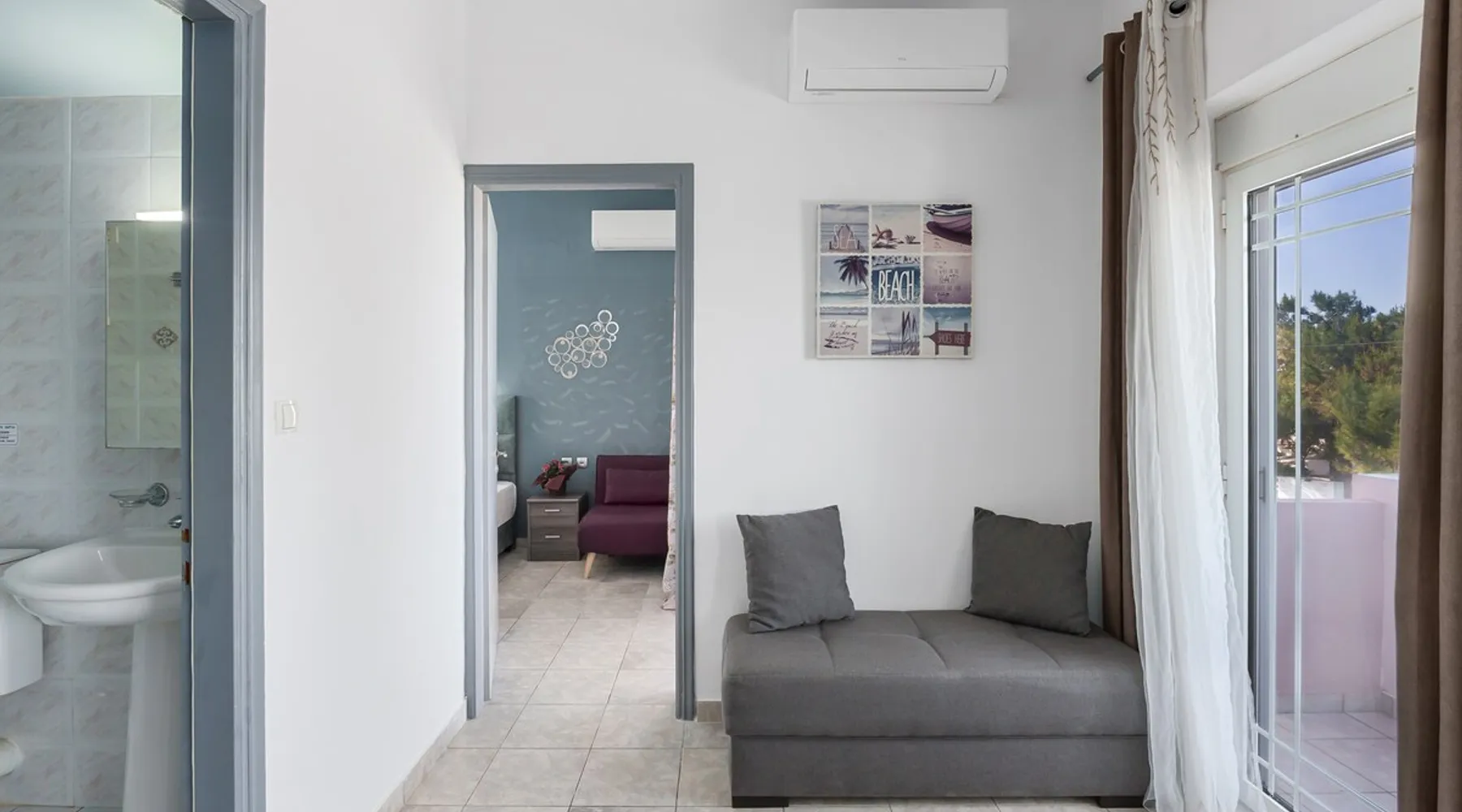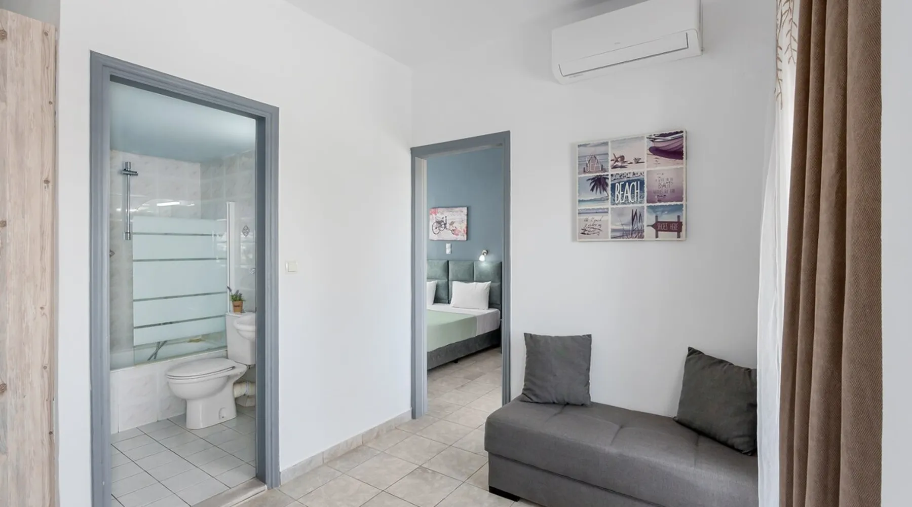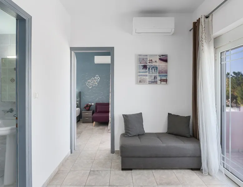 Cozy apartment up to 4 persons close to the beach. It is equipped with kitchen, private bathroom, balcony, and air conditioning. The apartment is just 50 meters from the beach. It is located in the beautiful village of Agia Marina close to Chania (8km) and Chania airport (23km). From the apartment you can easily reach by car the famous sight seeings of west Chania e.g. Mpalos, Falassarna, Elafonisi, when you aren't enjoying the beautiful sandy beach or relaxing on the balcony... The space This cozy apartment is equipted with a kitchen, balcony and airconditioning and can host up to 4 persons. It has a bedroom with a double bed, and a big living room with a sofa bed and the possibility of an extra single bed. Many shops, beach bars, cafes, and supermarkets close by. Registration Details 00000104429