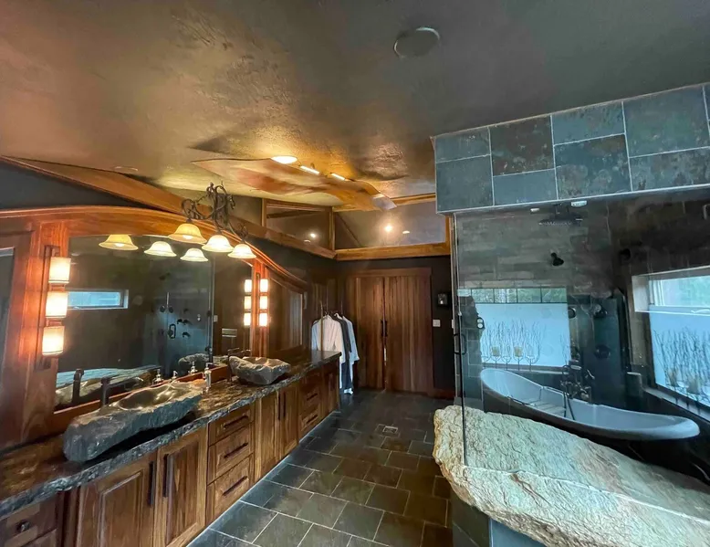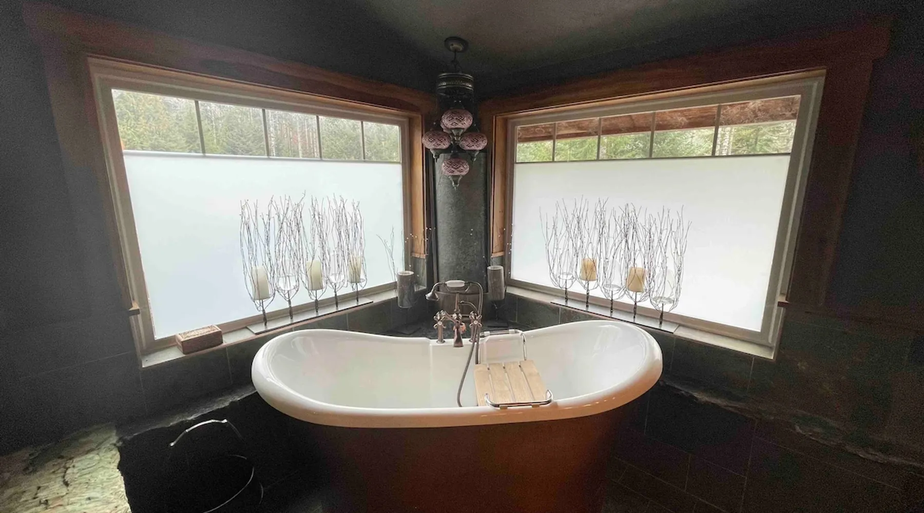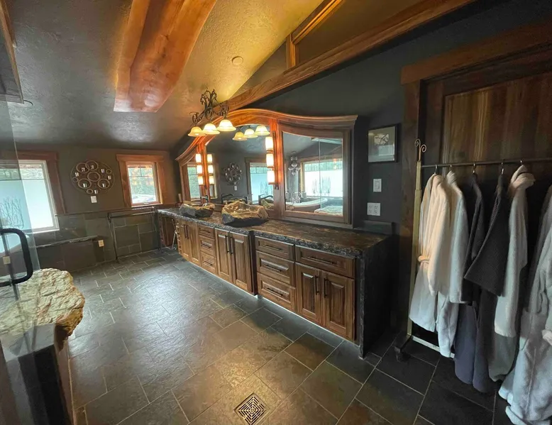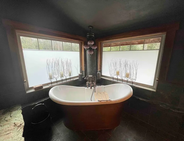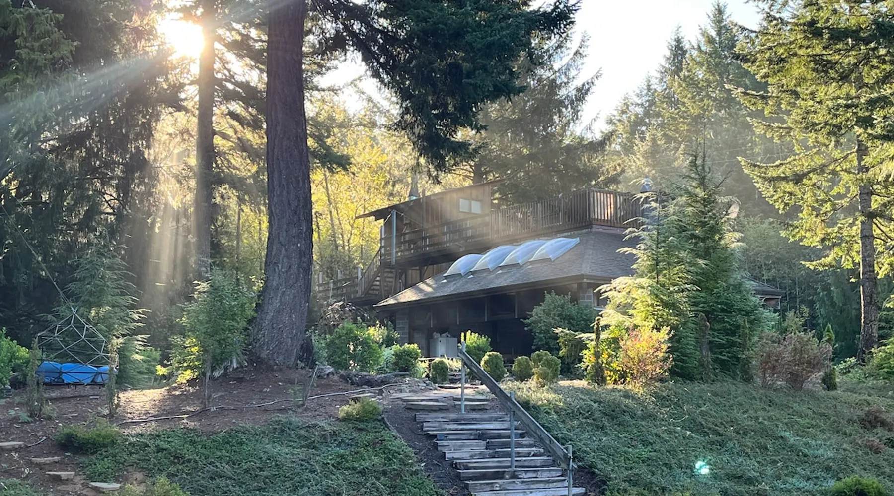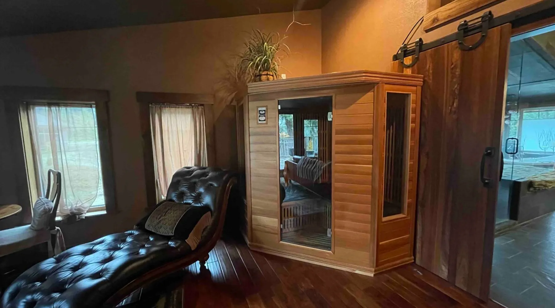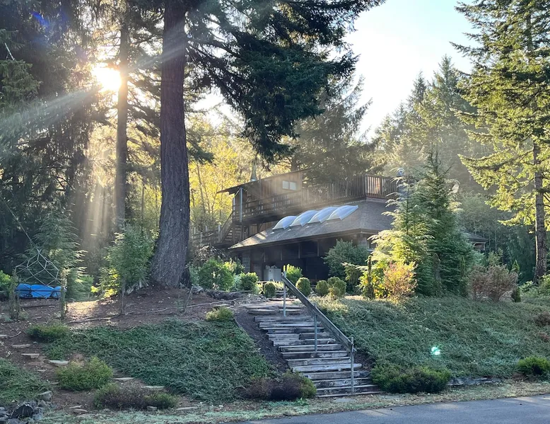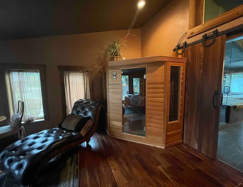 Come bathe in the forest’s beauty hiking our trails or spending the day at the beach. Return in the evening to a relaxing shower sitting atop a 4 thousand pound rock built into our custom shower. Finish the day in the dry sauna, or gazing beneath a full sky of stars. Perfect for couple get-aways and a paradise for friendly doggies. The space The room is attached to the house, but is insulated for utmost privacy.