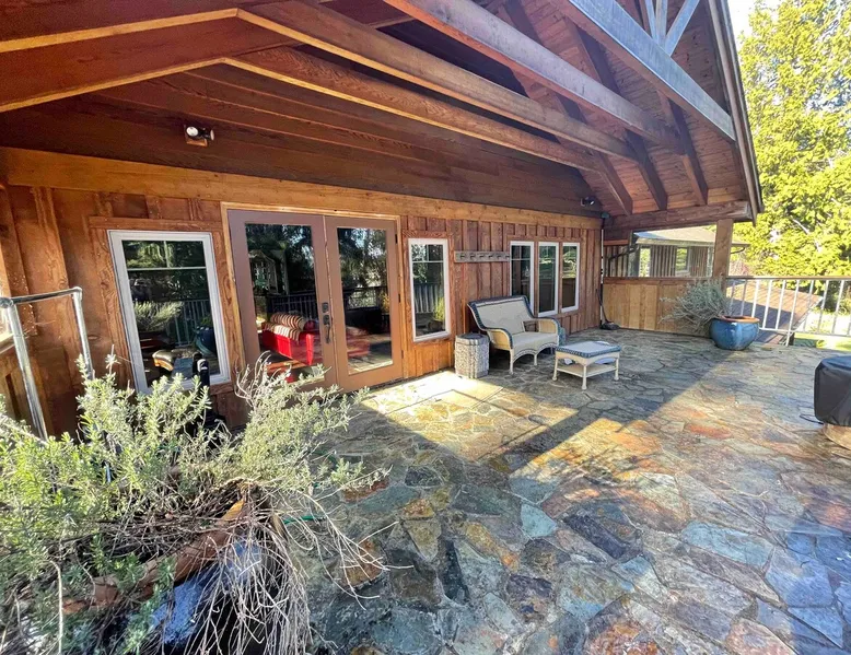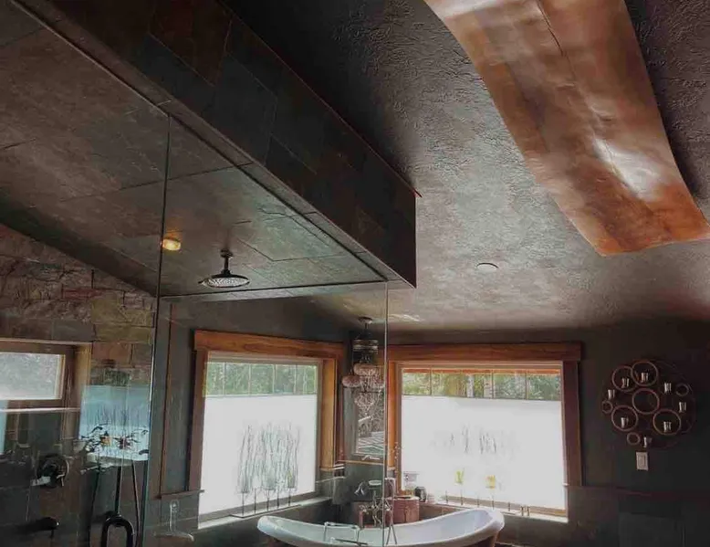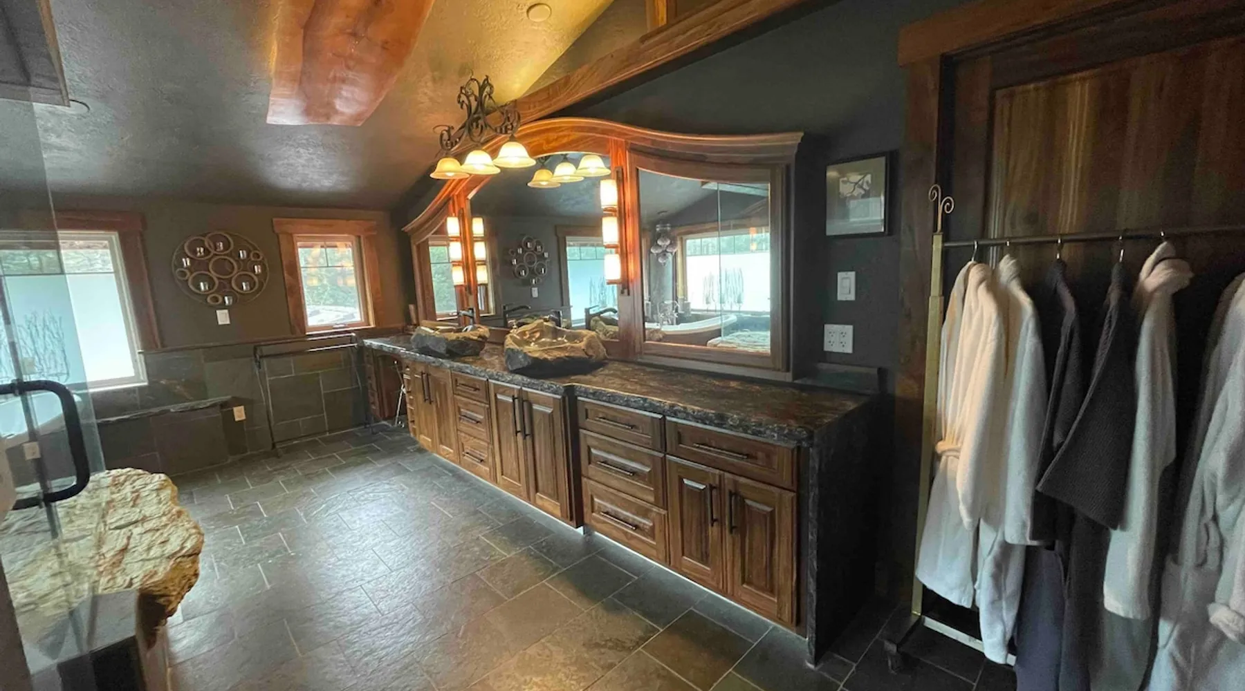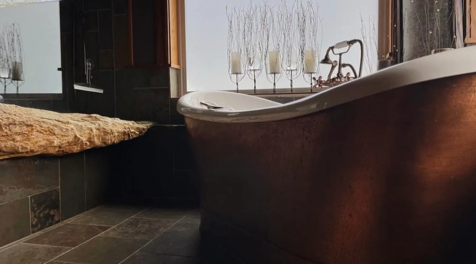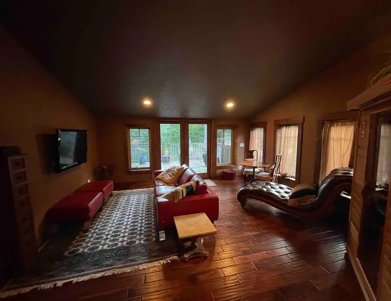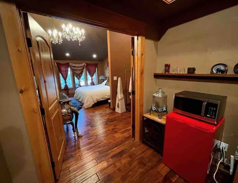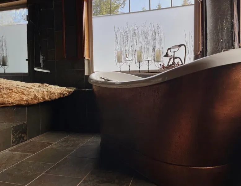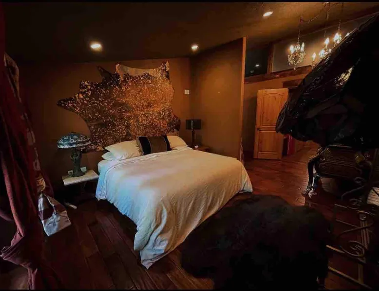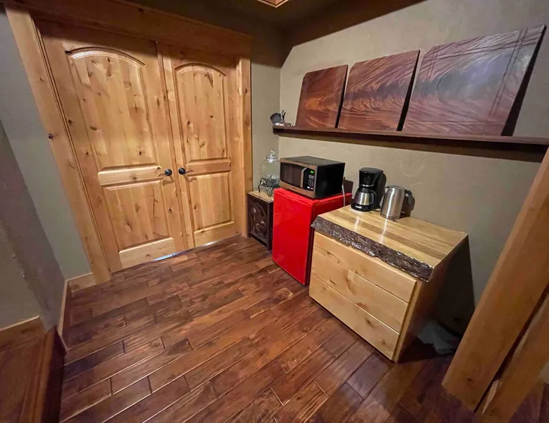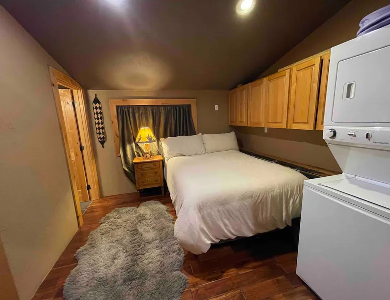 Come bathe in the forest’s beauty hiking our trails or spending the day at the beach. Return in the evening to a relaxing shower sitting atop a 4 thousand pound rock built into our custom shower. Finish the day in the dry sauna, or gazing beneath a full sky of stars. Perfect for couple get-aways and a paradise for friendly doggies. The space The room is attached to the house, but is insulated for utmost privacy.