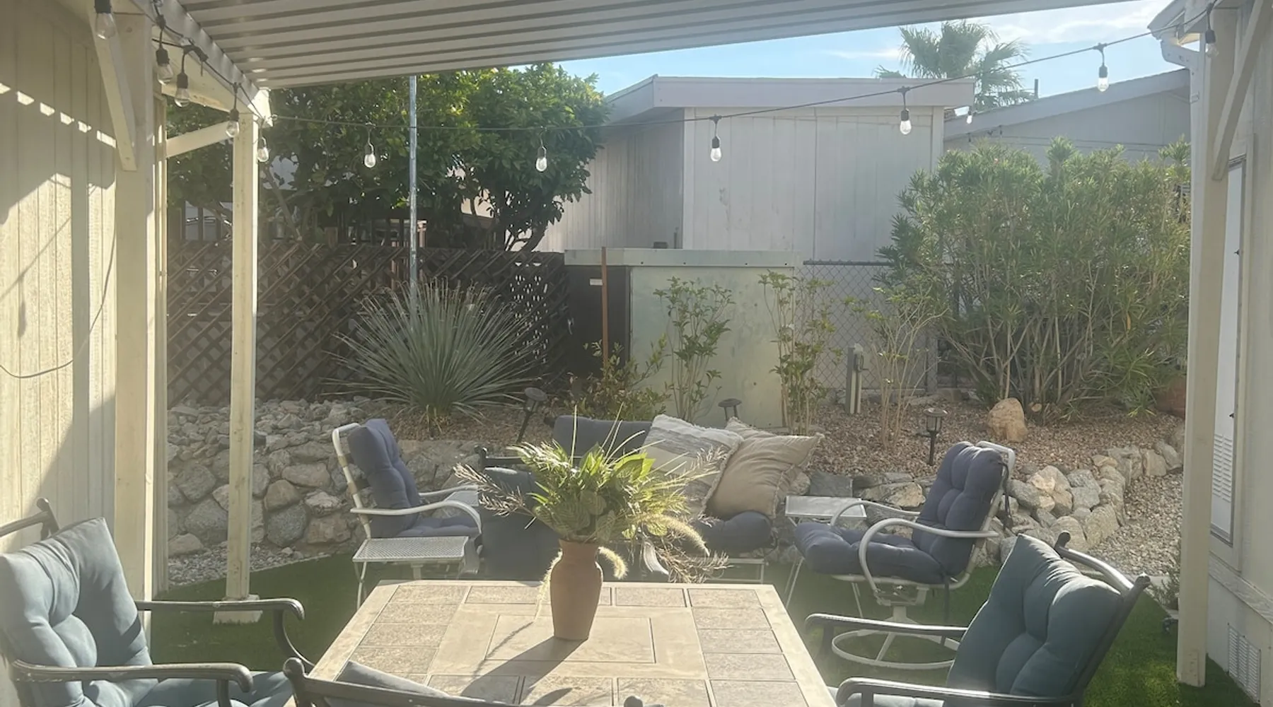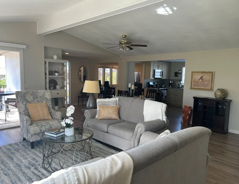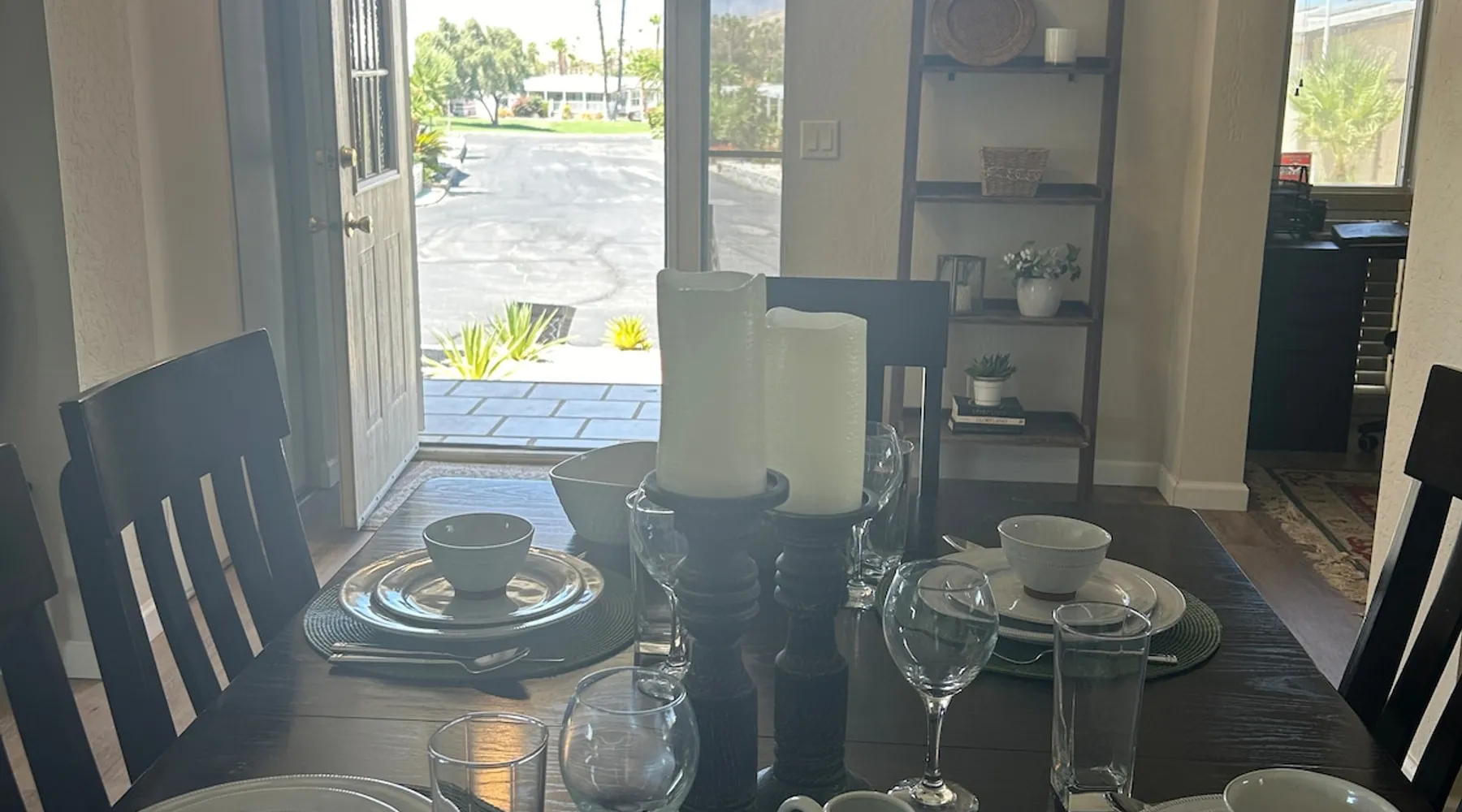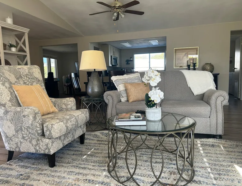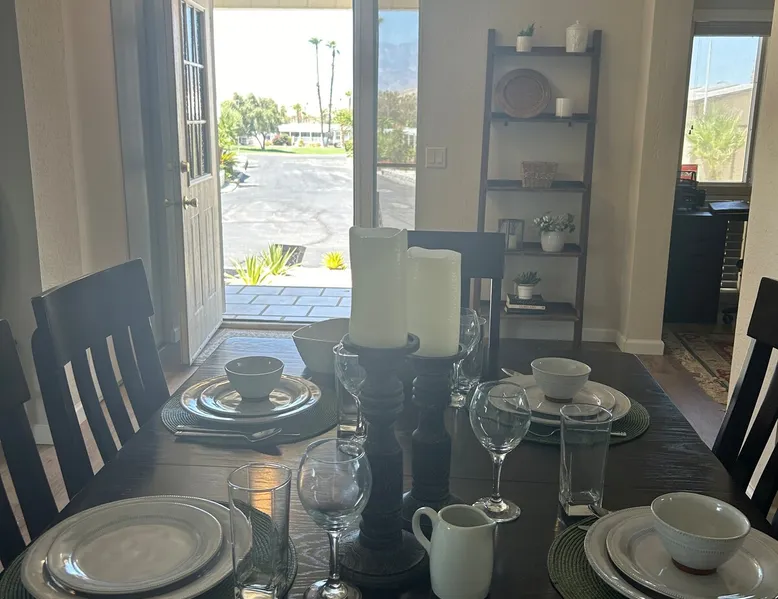 Relax at our peaceful and spacious house, watching sunsets over the mountains from our newly renovated living room and kitchen. Conveniently located 20 minutes from Palm Springs and 45 min. from Joshua Tree. Located in a quiet street with a 3-4 minute walk to pools and mineral pools. The sizeable master bedroom comes attached with a bathroom, walk-in closet and a very comfortable queen bed. Amenities include a full kitchen with new stainless steel appliances, dishes and cooking utensils. The space HOUSE: This two bedroom, two full bathroom home is not only in an exceptional location near the pools but has an equiped office with a beautiful view, a deck and back patio. You will enjoy your stay both for the spacious home and outdoor space complete with mountain views. The home has a bright and cozy living space with wall to wall windows to take in the views. Enjoy watching your favorite shows two large TV screens with cable. The kitchen is a very newly renovated modern kitchen with new stainless steel stove and refridgerator. It is fully stocked with everything you need to cook including a Keurig, coffee pot, kettle, coffee and tea, dishes, cooking utinsels, etc. The primary bedroom is very spacious with a very comfortable queen sized bed, a walk-in closet, attached full bathroom with two sinks and ample storage. The second bedroom has a double size bed with dresser and under bed storage, large closet. --perfect for one or two people to stay and enjoy their own space. The front deck off the front room has a lovely seating area perfect for a drink to enjoy the beautiful sunsets over the San Jacinto Mountains. The back patio is private with a BBQ, fire pit, comfortable outdoor seating to enjoy reading a book or sitting around with friends. Off the patio is a spacious backyard with a reclining lounge chair to catch some sun. This home has many areas where one can relax. This home comes with tennis rackets and balls and pool towels. SAFETY: Our home is professionally cleaned and sanitized before and after each guest to ensure you have a safe experience. PARKING: Our home has a driveway that can hold two cars back to back if needed. The resort is completely walkable and this home is very close to the east side clubhouse with the mineral pools and hot tubs. RESORT: Sky Valley Resort is the favorite of many people. Tiny houses and mid century style manufactured homes meander around the lakes and trails. There are 13 natural mineral pools in addition to hiking trails, tennis, pickle ball and basketball courts. There is even a farmer's market every Wednesday (weather permitting) and a little market + cafe at the clubhouse. Guest access Guest access Sky Valley Resort is a secure, gated community. You will be provided a gate code upon your arrival. Parking available for two cars in driveway. The resort is very walkable and bike friendly. Additional guest parking available on the street and at the clubhouse. Most residents use their golf carts to get around. Golf carts are available for guest rental during the season September-May annually. Other things to note OTHER THINGS TO NOTE: This is a quiet & serene community of vacationers and permanent residents in the beautiful Sky Valley Resort. If you are looking for a place to get loud and party, this spot may not be for you. The community appreciates peace and quiet at all times and in all locations. All guests must be at least 25 years old to book and provide a valid photo ID. Guests will sign the resort rental agreement within 48 hours of booking. LONGER STAYS: We require a mini cleaning every 2 weeks for long term stays at $45/cleaning + $125 for the checkout cleaning. Wellness - A special feature of this house/park are the wellness mineral pools and hot tubs. This park is only one of six places in the earth that has natural hot springs with a combination of minerals including magnesium, potassium, etc.. The springs provide clean, odorless and warm natural water full of minerals. Soaking in the pool or hot tubs for at least 15 minutes helps one circulation, etc. For more information read here: 🌿 Discover the Healing Power of Sky Valley’s Natural Hot Mineral Pools 🌿 Only 6 places in the world are known to have this rare combination of odorless, clear, and clean hot mineral water — and Sky Valley is one of them! Our hot spring water is continuously replenished, naturally heated, and enriched with a unique blend of therapeutic minerals known to support the body, mind, and skin. ⸻ 💧 What Makes Sky Valley Water Special? Natural Mineral Content (per liter) • Silica (22.5 mg/L): Known to support skin elasticity, joint health, and collagen production. Helps soften and smooth the skin naturally. • Calcium (39.2 mg/L): Vital for strong bones, muscle function, and nerve signaling. Bathing in calcium-rich water may aid in relaxation and skin repair. • Magnesium (1.0 mg/L): Often called the “relaxation mineral,” magnesium helps calm the nervous system, ease muscle tension, and reduce inflammation. • Sodium (280 mg/L): Assists in hydration balance and can help soothe and soften the skin. Excellent for those with dry skin conditions. • Potassium (6.27 mg/L): Helps with cellular hydration, supports skin barrier function, and encourages natural detoxification. • Chloride (120 mg/L): Plays a role in balancing electrolytes and maintaining skin moisture. • Iron (11.1 μg/L): Essential for oxygen transport and cellular energy. In small amounts, it supports circulation and skin tone. • Lithium (13.2 μg/L): Known for its mood-stabilizing effects, lithium may help enhance emotional well-being and reduce stress when absorbed transdermally. • Manganese (0.38 μg/L): Supports collagen production and acts as an antioxidant, protecting skin cells. • Iodide (0.043 mg/L): A trace mineral important for thyroid support and immune system function. • Dissolved Oxygen (0.2 mg/L): Promotes cellular regeneration and increases the vitality of the 