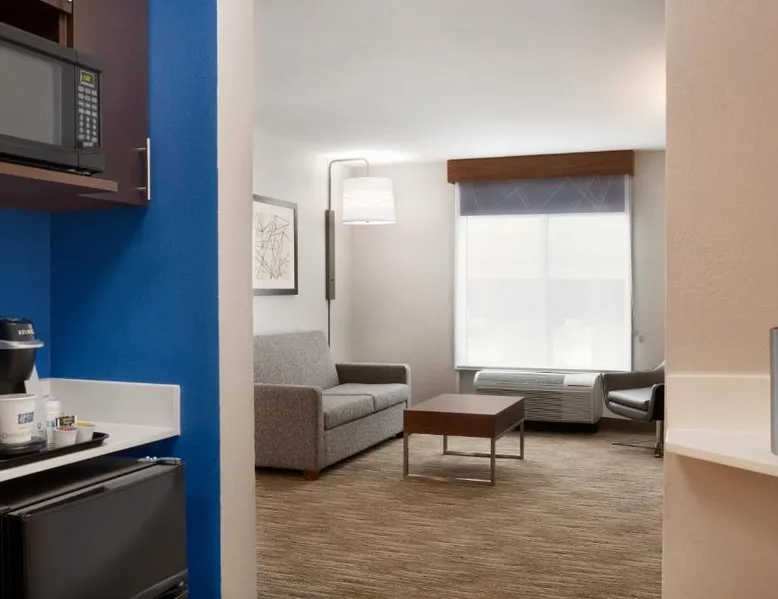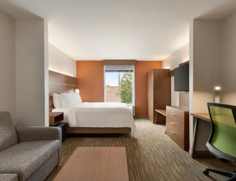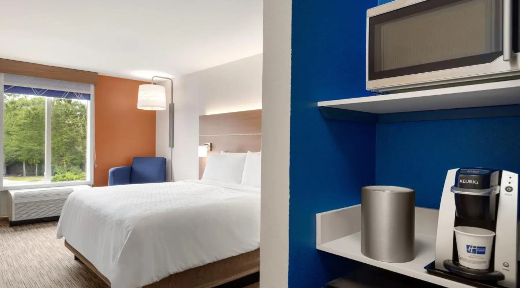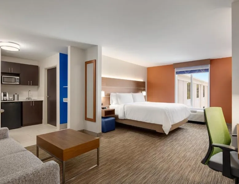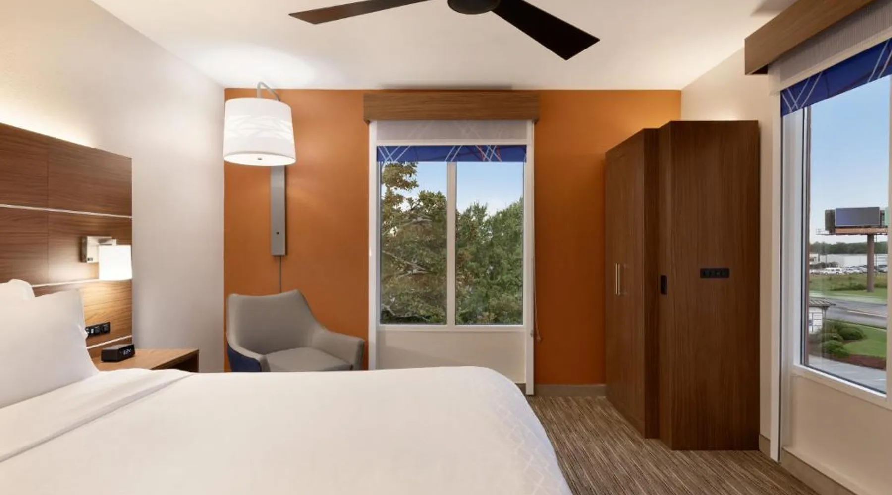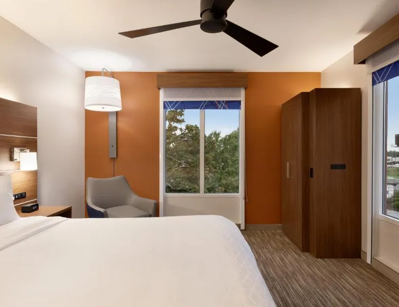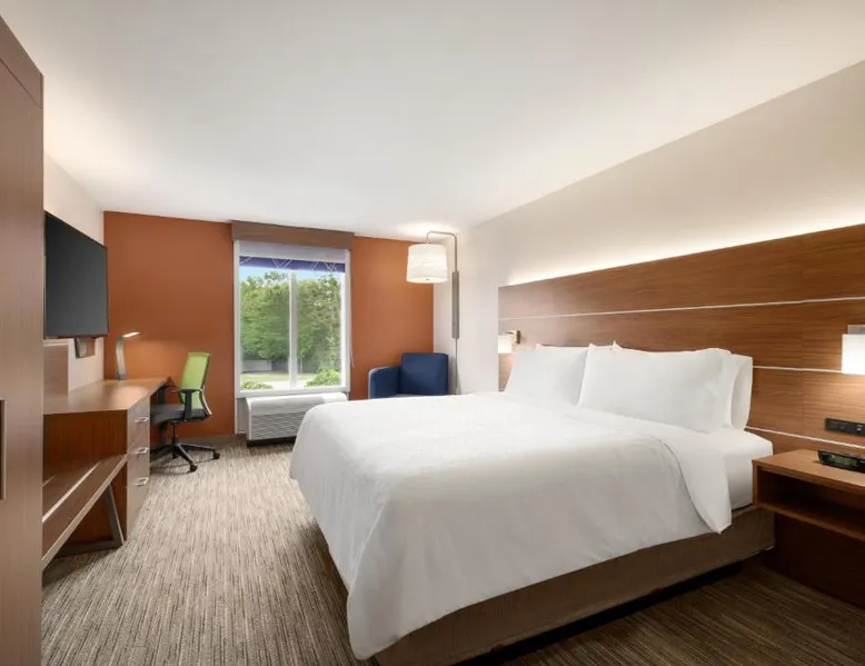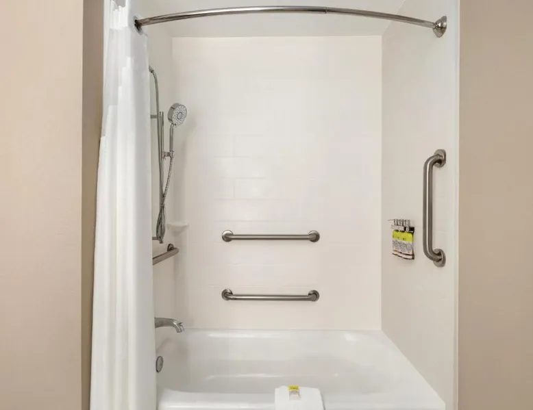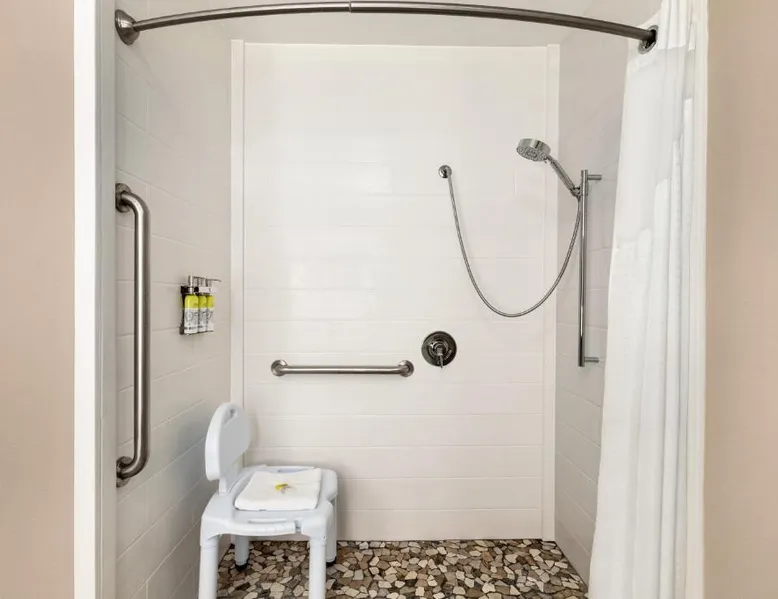 Comfortable Accommodations: Holiday Inn Express Hotel & Suites Auburn - University Area by IHG in Auburn offers clean rooms with air-conditioning, private bathrooms, and modern amenities. Each room includes a work desk, mini-bar, and free WiFi. Leisure Facilities: Guests can enjoy a fitness center, seasonal outdoor swimming pool, and outdoor seating area. Additional facilities include a lounge, 24-hour front desk, minimarket, and free on-site parking. Dining Options: A complimentary American buffet breakfast is served daily, featuring warm dishes, fresh pastries, pancakes, cheese, fruits, and juice. Convenient Location: Located 41 mi from Columbus Airport, the hotel is near attractions such as Auburn University (2.5 mi), Jordan Hare Stadium (2.5 mi), and Toomers Corner (3.1 mi). Highly rated for room cleanliness, staff support, and convenient location. This accessible room features a roll-in shower, cable TV, and coffee-making facilities.