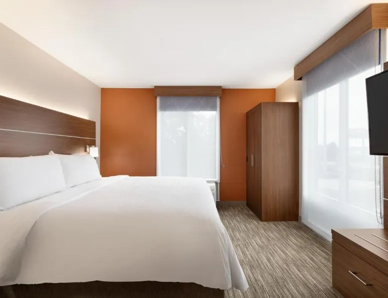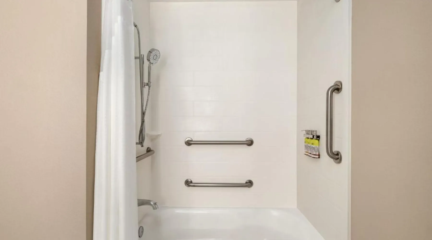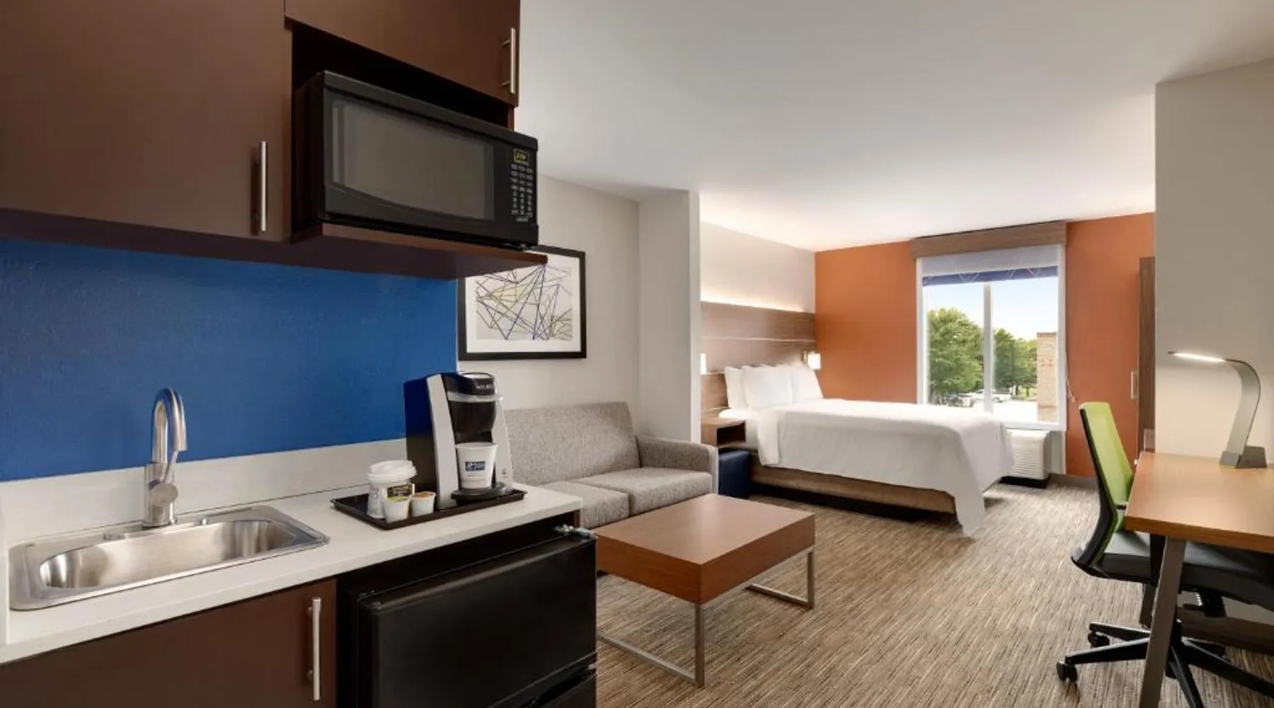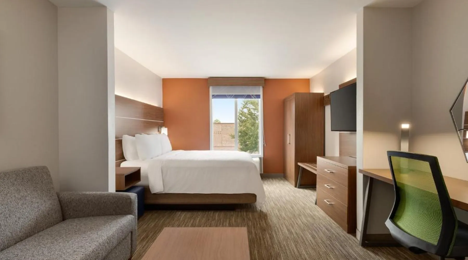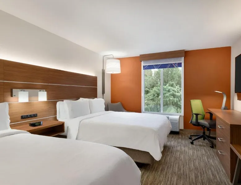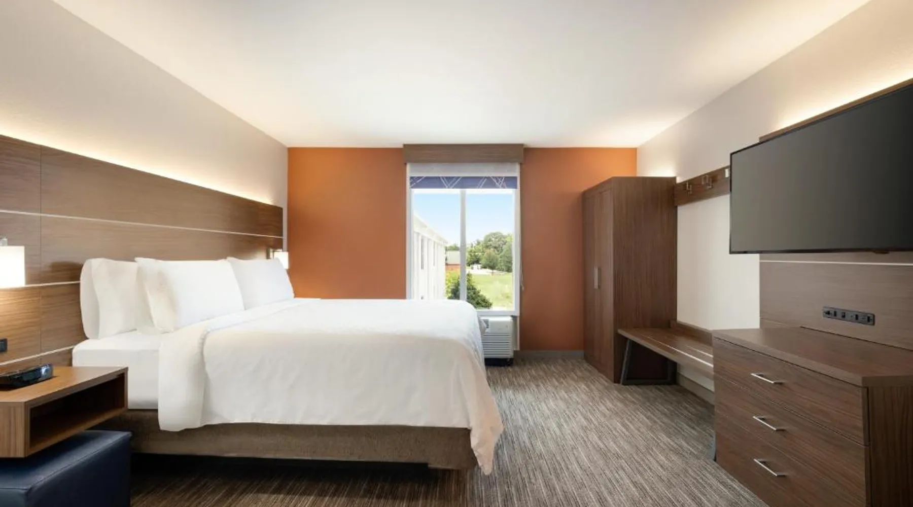 Comfortable Accommodations: Holiday Inn Express Hotel & Suites Auburn - University Area by IHG in Auburn offers clean rooms with air-conditioning, private bathrooms, and modern amenities. Each room includes a work desk, mini-bar, and free WiFi. Leisure Facilities: Guests can enjoy a fitness center, seasonal outdoor swimming pool, and outdoor seating area. Additional facilities include a lounge, 24-hour front desk, minimarket, and free on-site parking. Dining Options: A complimentary American buffet breakfast is served daily, featuring warm dishes, fresh pastries, pancakes, cheese, fruits, and juice. Convenient Location: Located 41 mi from Columbus Airport, the hotel is near attractions such as Auburn University (2.5 mi), Jordan Hare Stadium (2.5 mi), and Toomers Corner (3.1 mi). Highly rated for room cleanliness, staff support, and convenient location. This accessible room features a roll-in shower, cable TV, and coffee-making facilities.