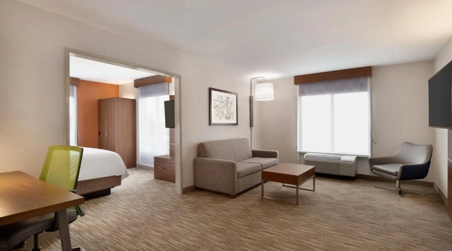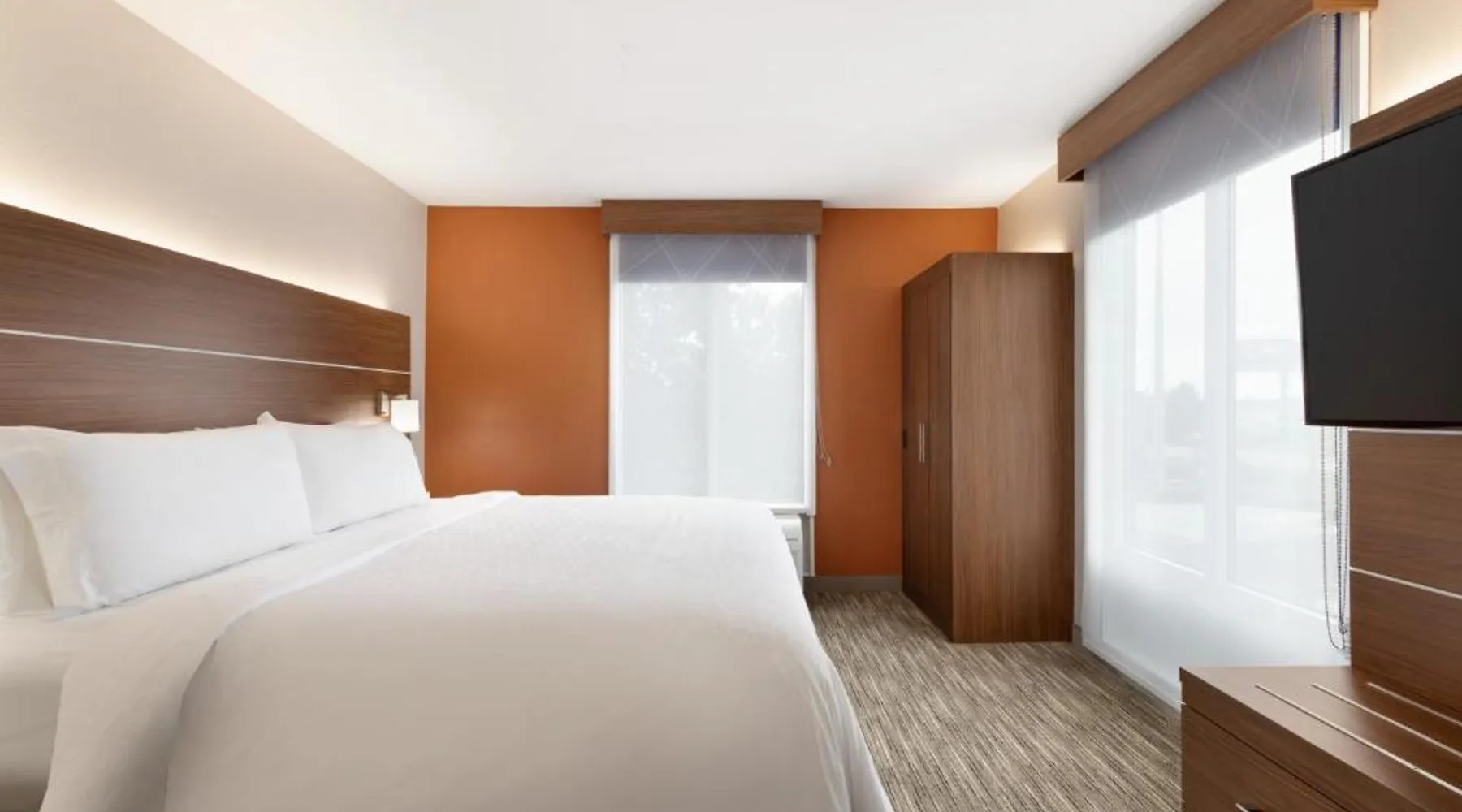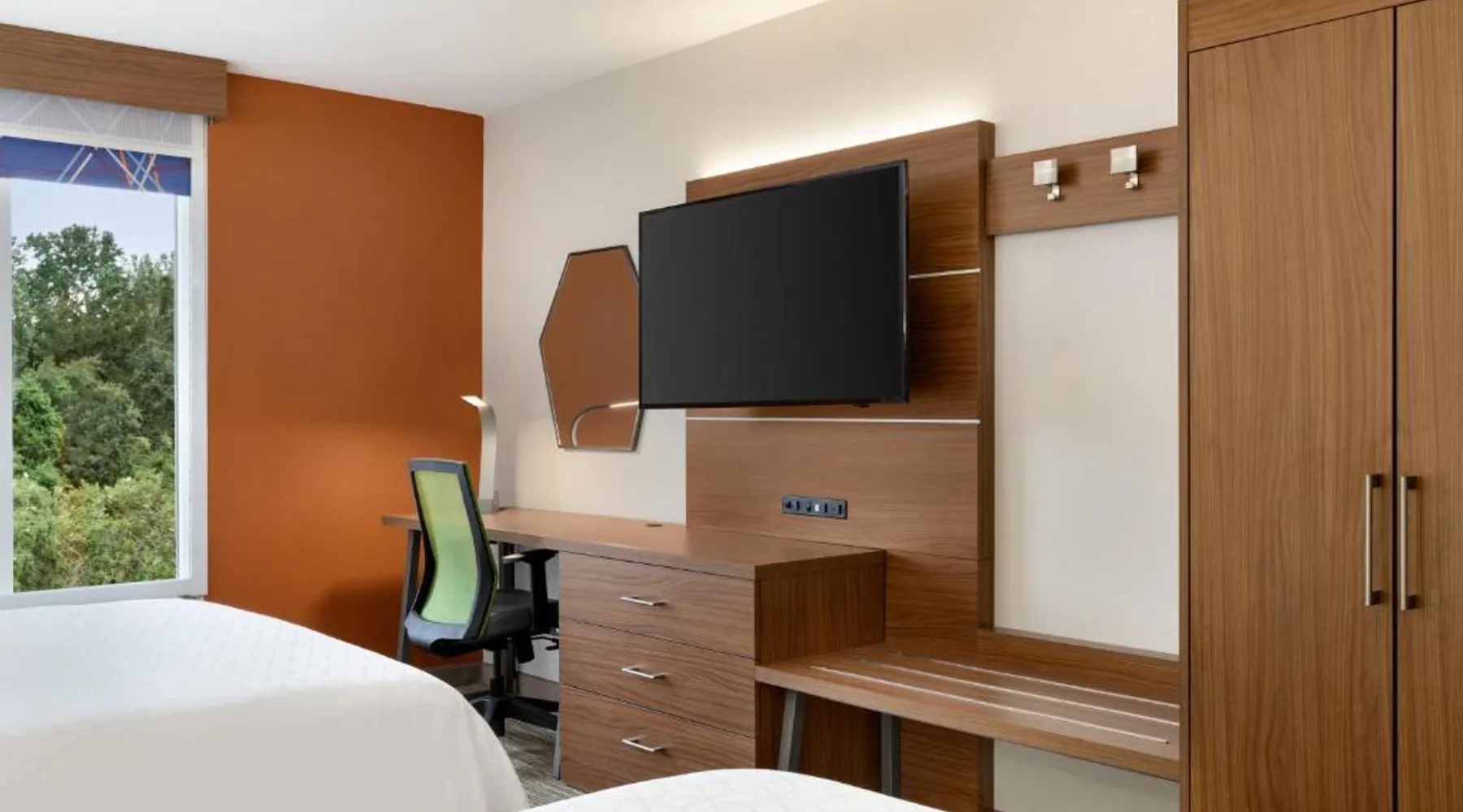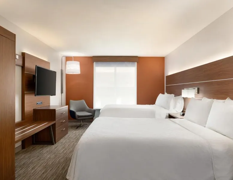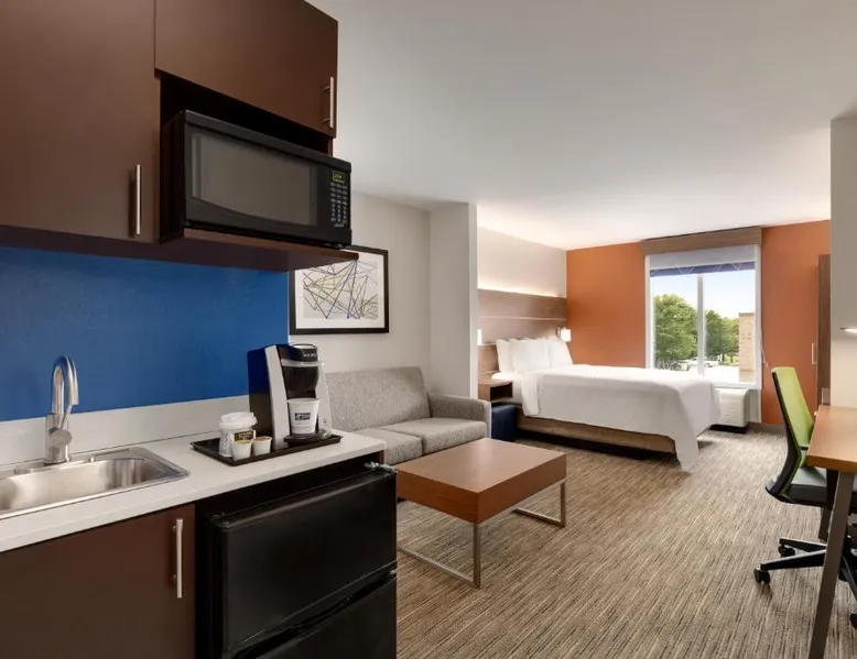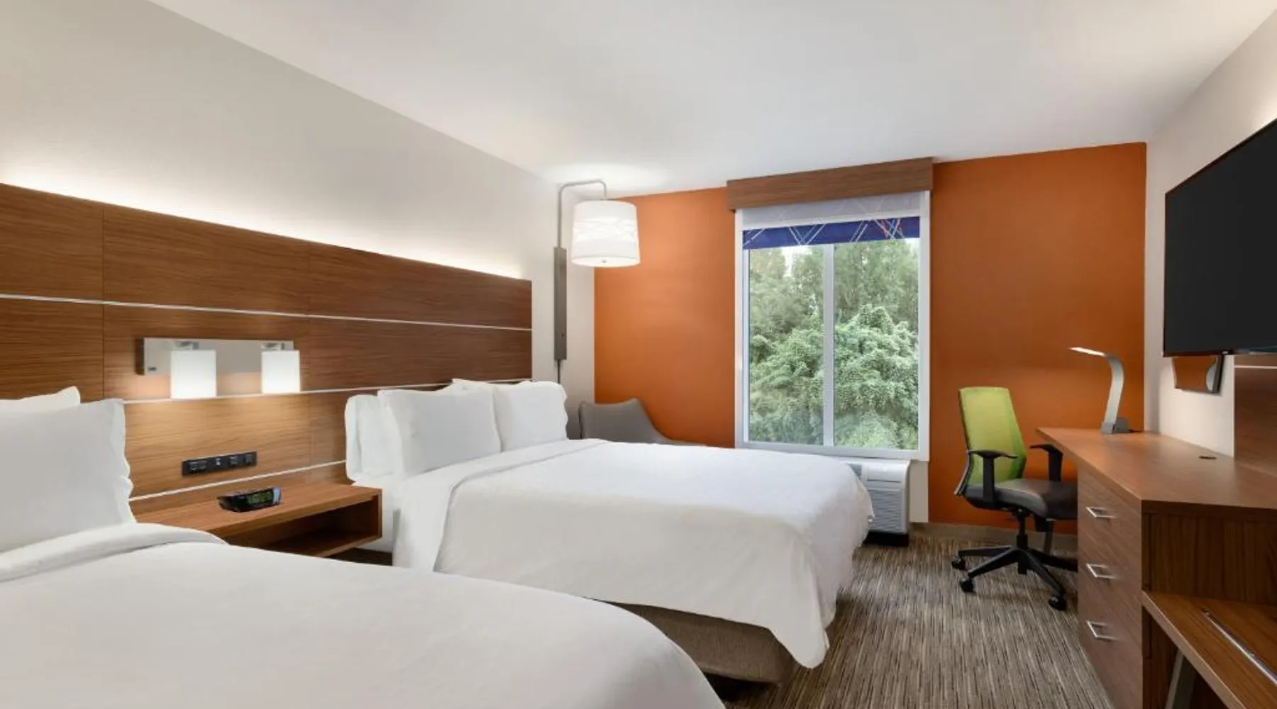 Comfortable Accommodations: Holiday Inn Express Hotel & Suites Auburn - University Area by IHG in Auburn offers clean rooms with air-conditioning, private bathrooms, and modern amenities. Each room includes a work desk, mini-bar, and free WiFi. Leisure Facilities: Guests can enjoy a fitness center, seasonal outdoor swimming pool, and outdoor seating area. Additional facilities include a lounge, 24-hour front desk, minimarket, and free on-site parking. Dining Options: A complimentary American buffet breakfast is served daily, featuring warm dishes, fresh pastries, pancakes, cheese, fruits, and juice. Convenient Location: Located 41 mi from Columbus Airport, the hotel is near attractions such as Auburn University (2.5 mi), Jordan Hare Stadium (2.5 mi), and Toomers Corner (3.1 mi). Highly rated for room cleanliness, staff support, and convenient location. This accessible room features a roll-in shower, cable TV, and coffee-making facilities.