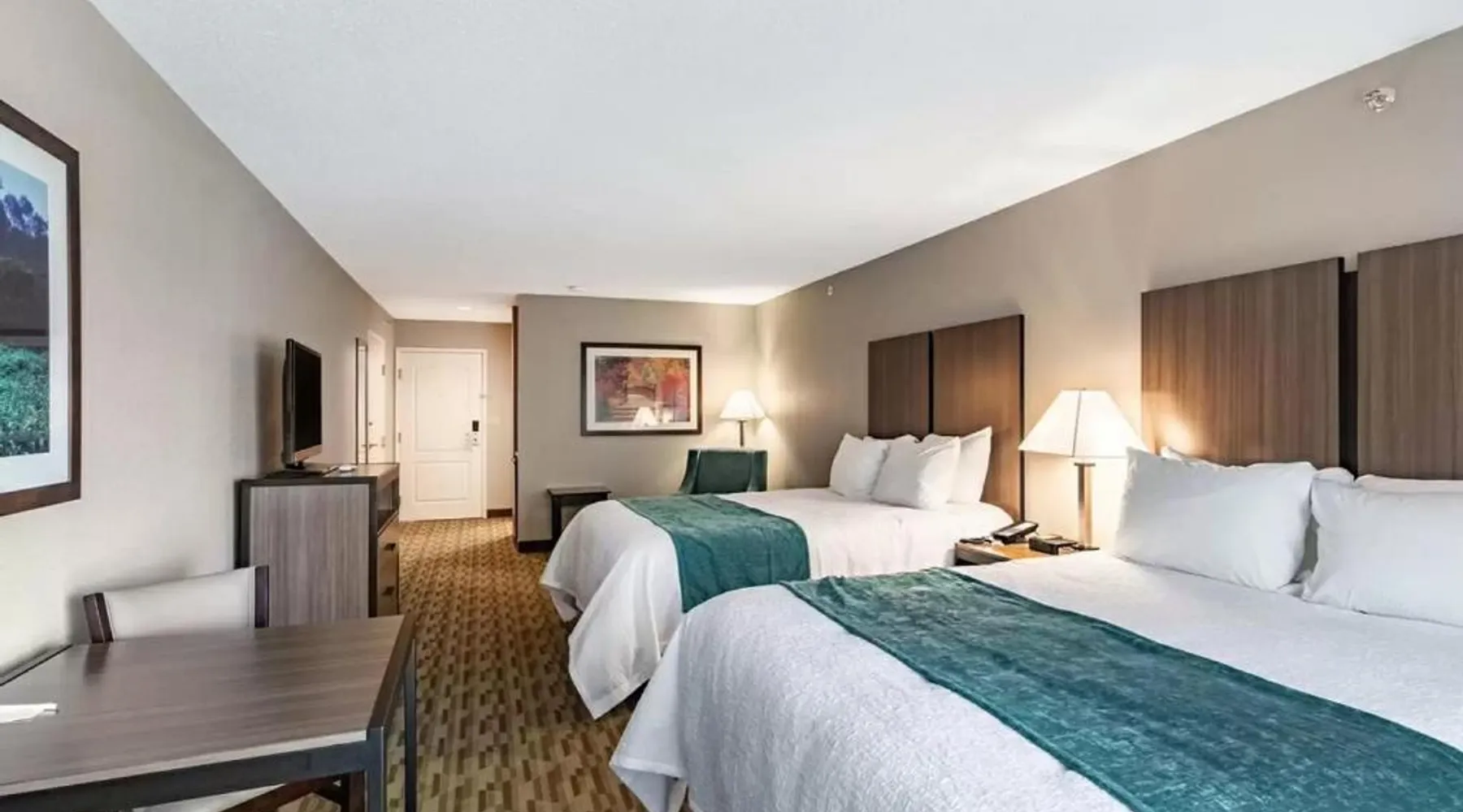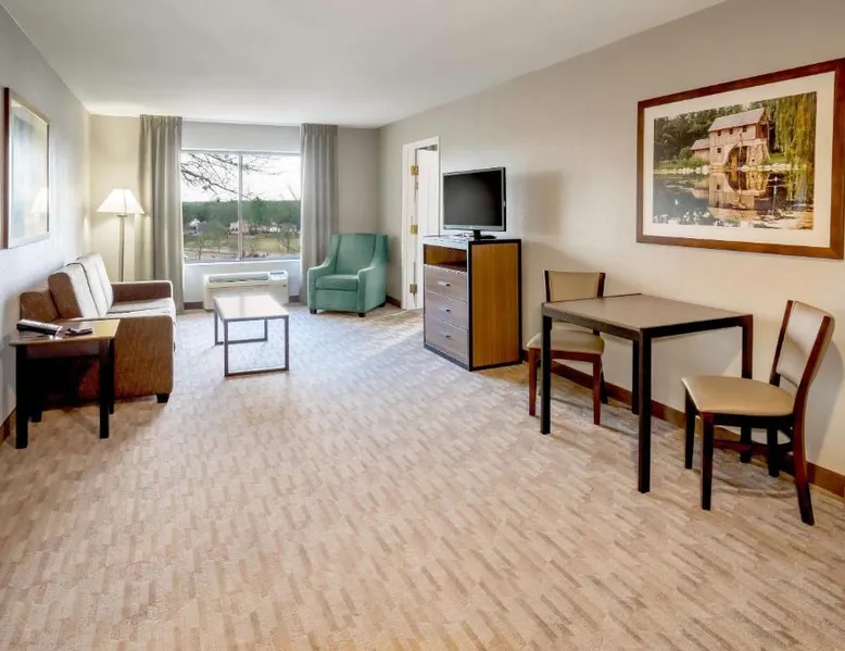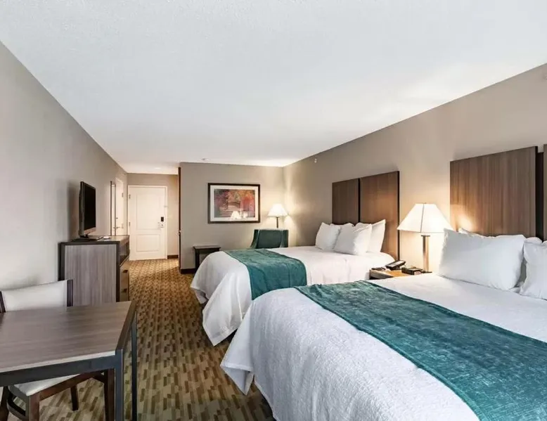 Overlooking the scenic Rock River and 5 miles from Rockford city center, this European-style hotel features a heated indoor pool. Free WiFi is available in every room. Cable TV, a microwave and a small refrigerator are found in each decorative room at Riverview Inn & Suites, an Ascend Collection Hotel. Coffee-making facilities and a sofa bed are also included. A fitness room and a business center are open to all guests of the Riverview Inn & Suites, an Ascend Collection Hotel. A complimentary hot breakfast is offered to each guest. Rock Cut State Park is less than 10 miles from the resort. Tinker Swiss Cottage Museum and Gardens is 15 minutes’ drive away. This family room has a tea and coffee maker, a seating area and a TV. The unit has 2 beds.