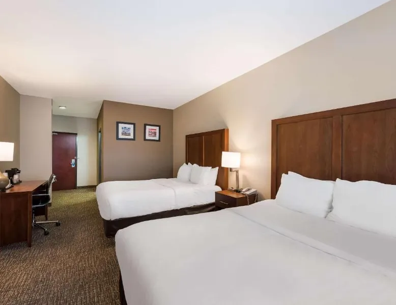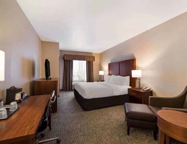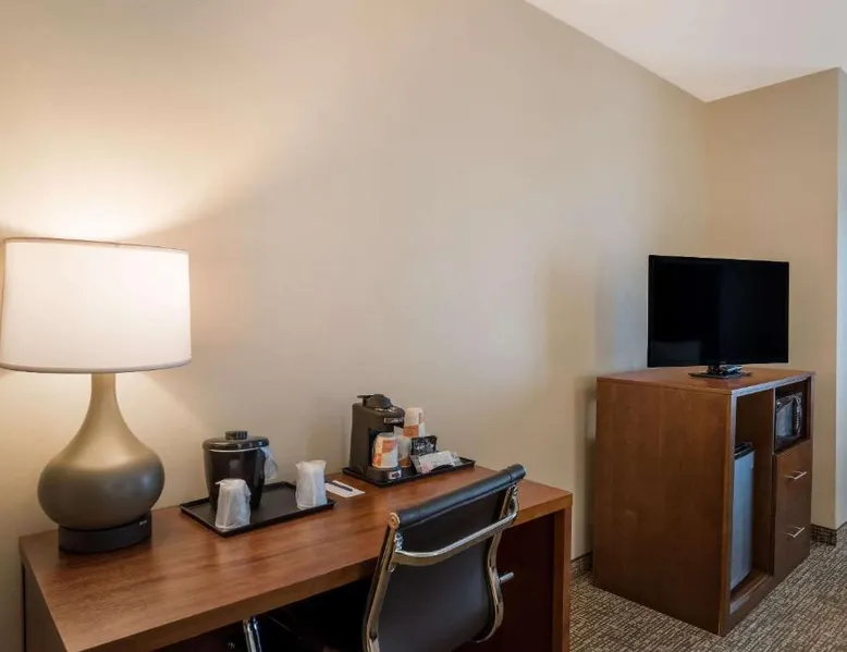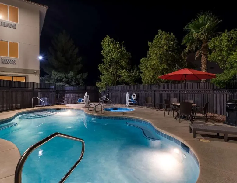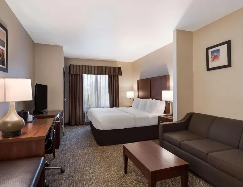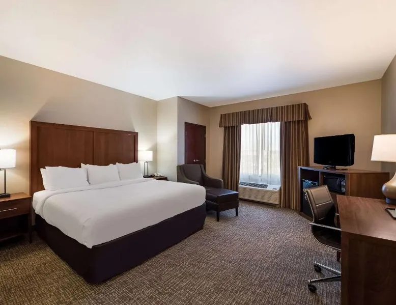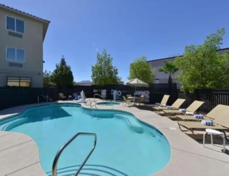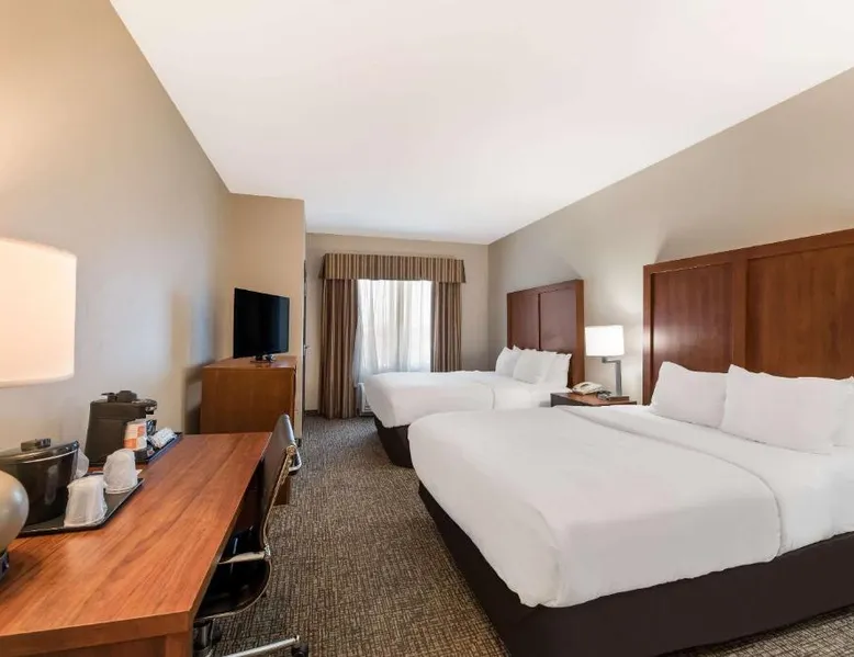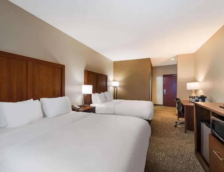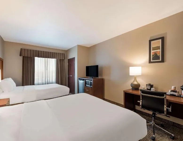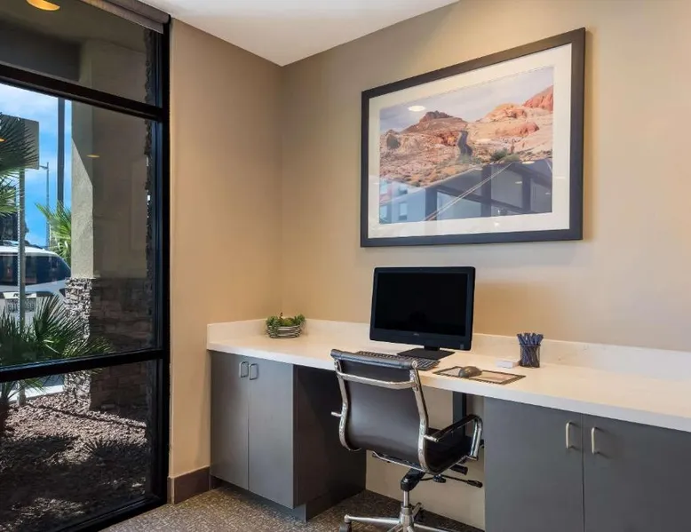 Comfortable Accommodations: Comfort Inn & Suites Las Vegas - Nellis in Las Vegas offers family rooms with air-conditioning, private bathrooms, and modern amenities. Each room includes a tea and coffee maker, refrigerator, work desk, and free toiletries. Leisure Facilities: Guests can enjoy a spa and wellness center, fitness center, seasonal outdoor swimming pool, and hot tub. Free WiFi is available in public areas, ensuring connectivity during the stay. Convenient Location: Located 14 mi from Harry Reid International Airport, the hotel is near attractions such as Mob Museum (7.5 mi) and Fremont Street Experience (8.1 mi). Free on-site private parking is provided. Guest Services: The property features a 24-hour front desk, business area, and luggage storage. Additional amenities include a fitness room, elevator, and continental breakfast. Spacious room that includes cozy beds, a flat-screen TV, a microwave and refrigerator.