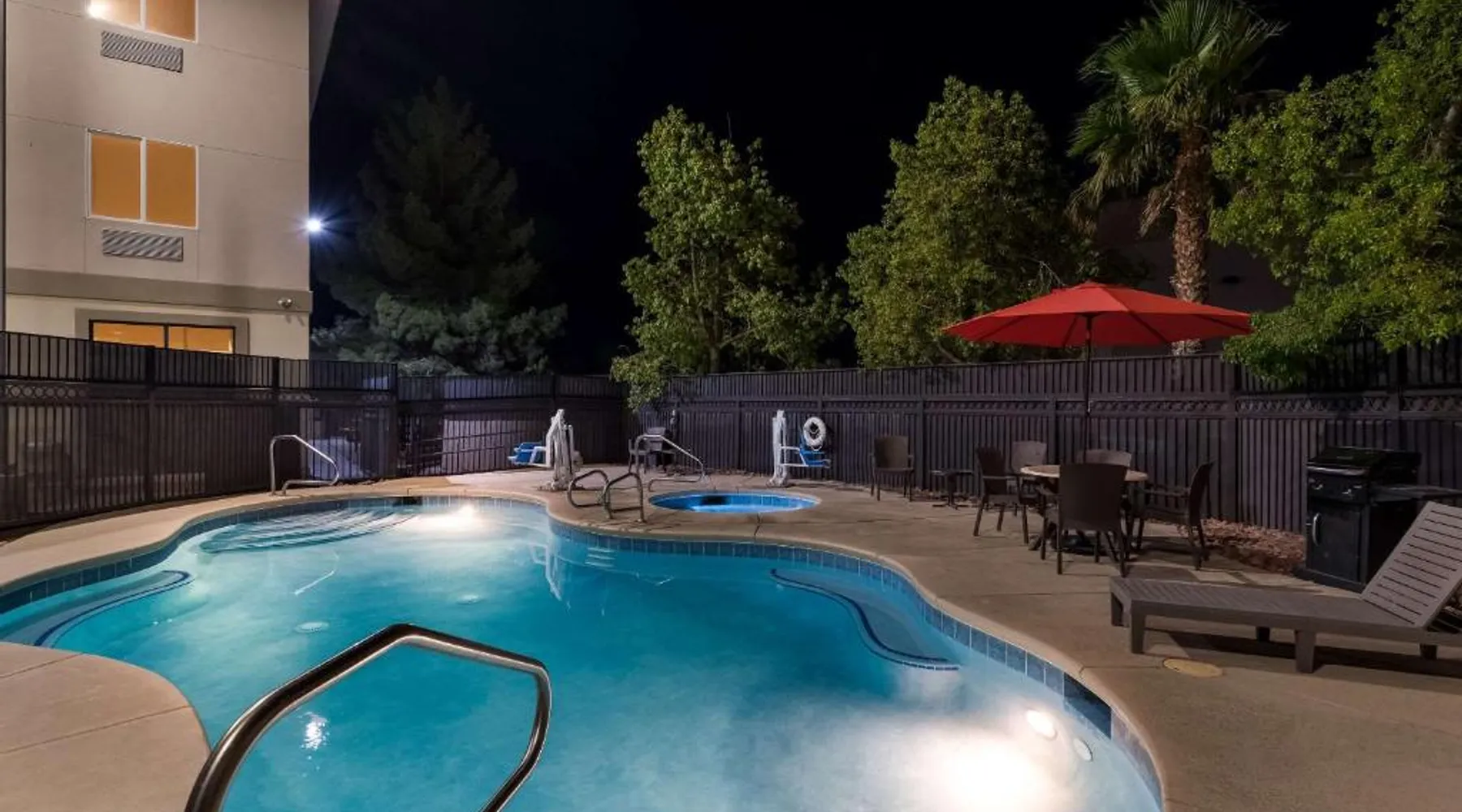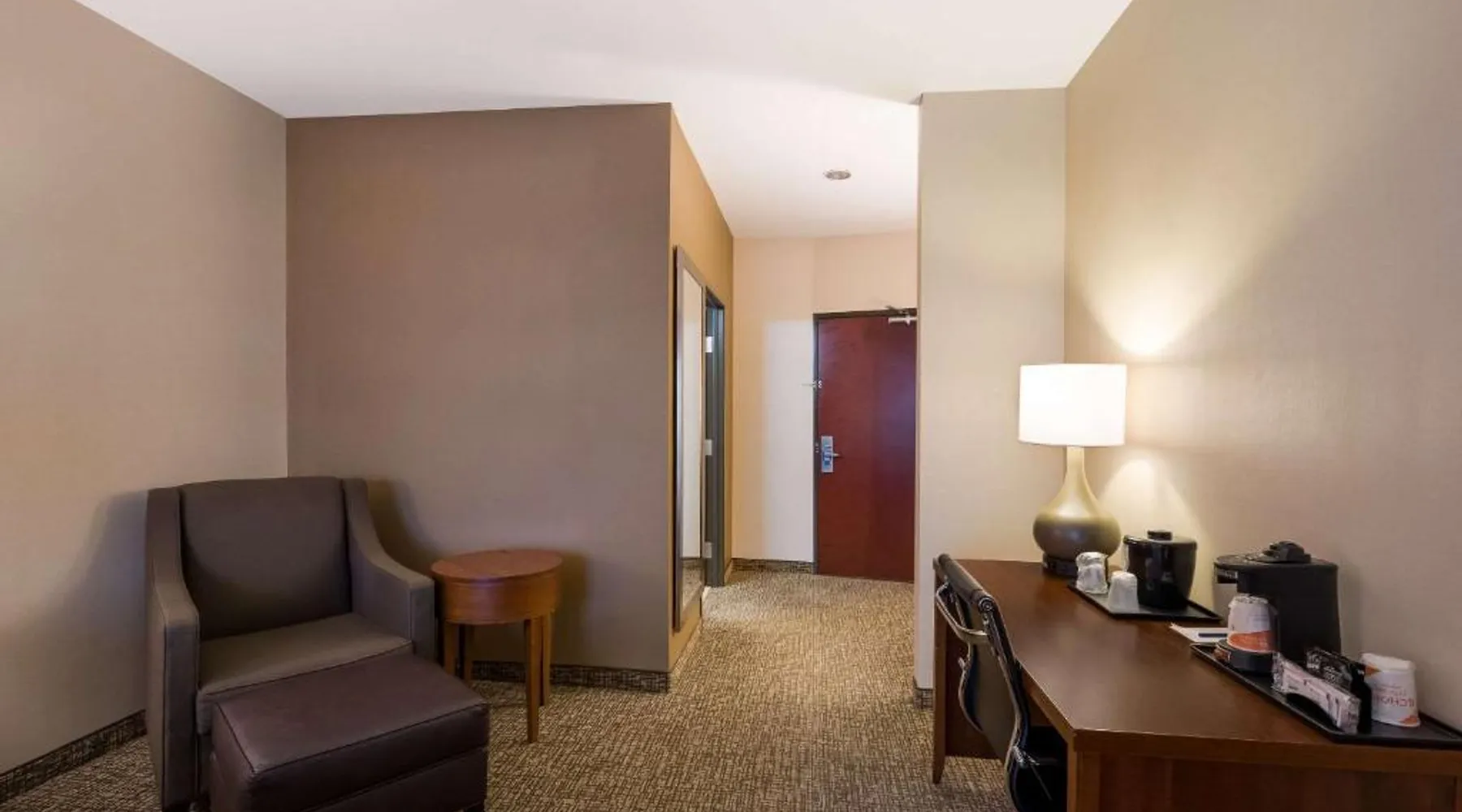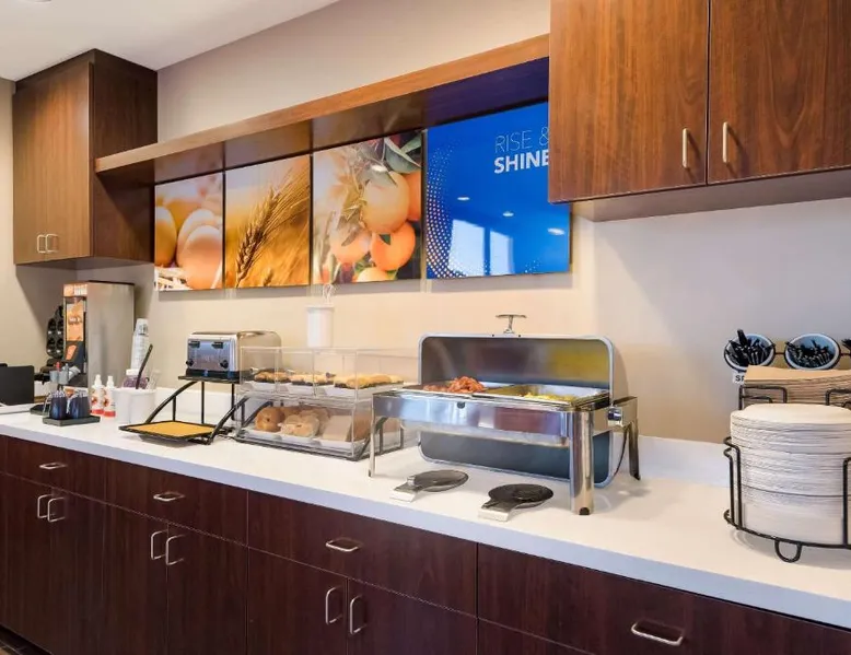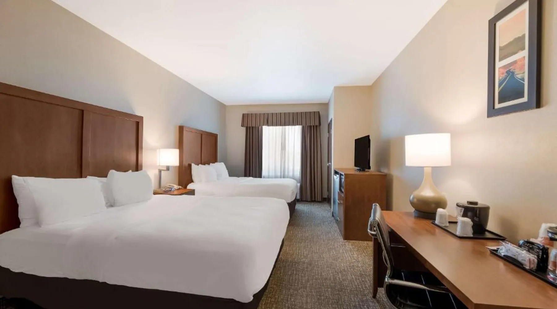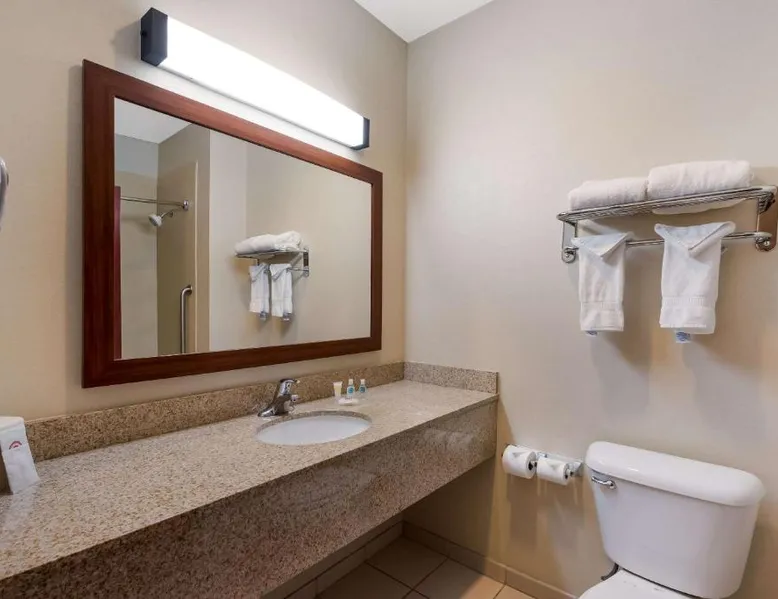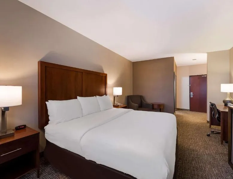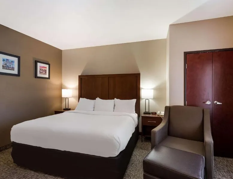 Comfortable Accommodations: Comfort Inn & Suites Las Vegas - Nellis in Las Vegas offers family rooms with air-conditioning, private bathrooms, and modern amenities. Each room includes a tea and coffee maker, refrigerator, work desk, and free toiletries. Leisure Facilities: Guests can enjoy a spa and wellness center, fitness center, seasonal outdoor swimming pool, and hot tub. Free WiFi is available in public areas, ensuring connectivity during the stay. Convenient Location: Located 14 mi from Harry Reid International Airport, the hotel is near attractions such as Mob Museum (7.5 mi) and Fremont Street Experience (8.1 mi). Free on-site private parking is provided. Guest Services: The property features a 24-hour front desk, business area, and luggage storage. Additional amenities include a fitness room, elevator, and continental breakfast. Spacious room that includes cozy beds, a flat-screen TV, a microwave and refrigerator.