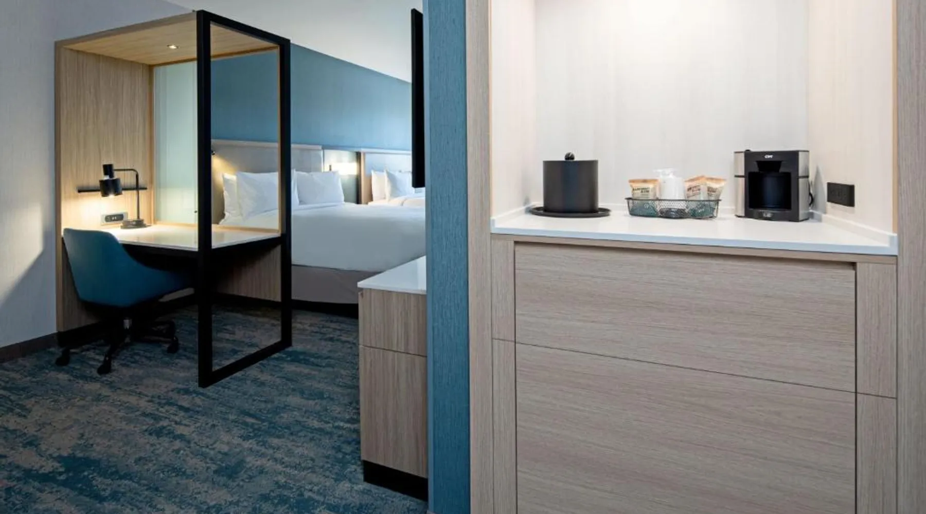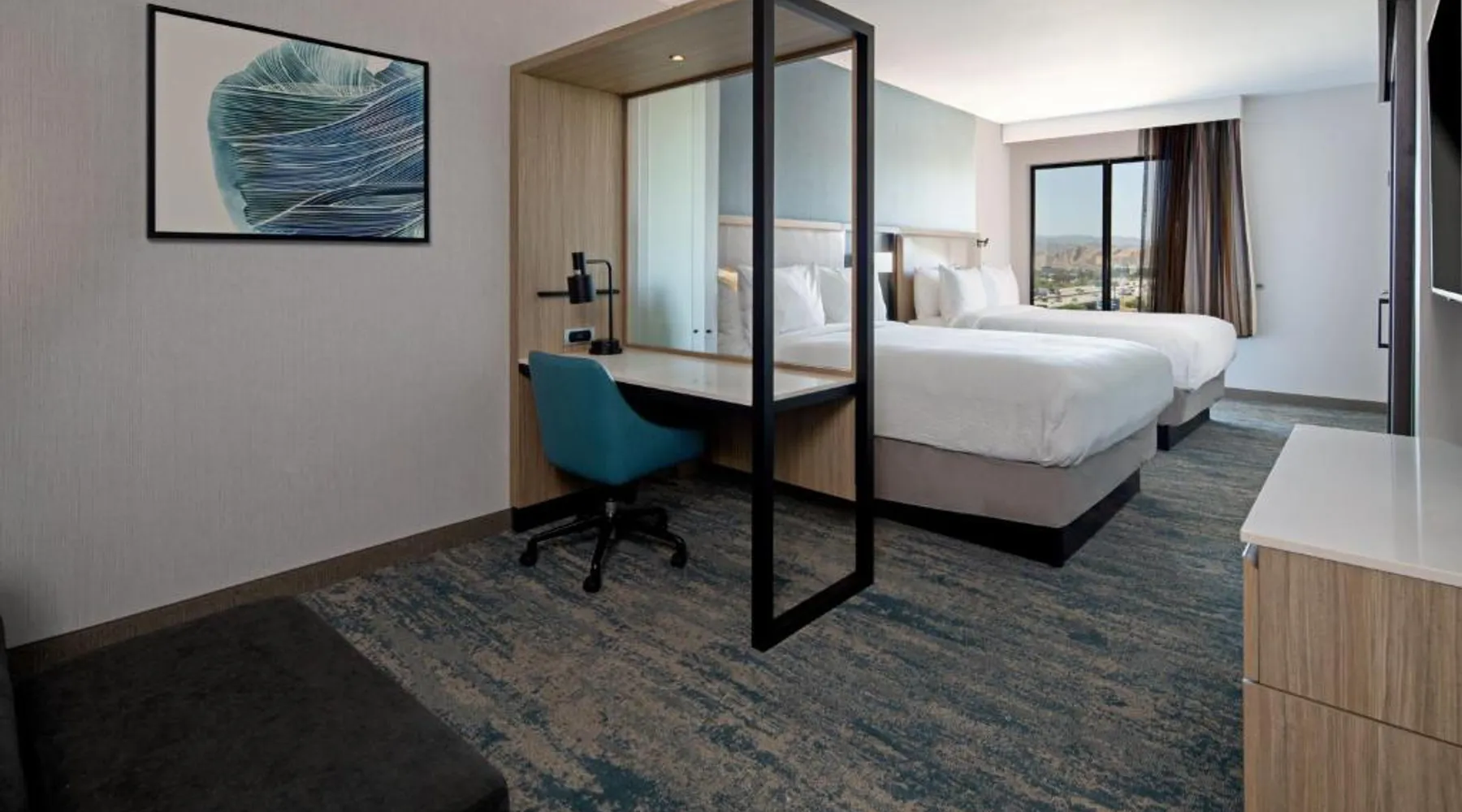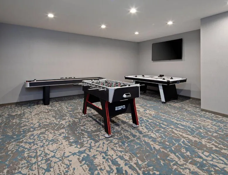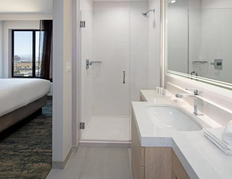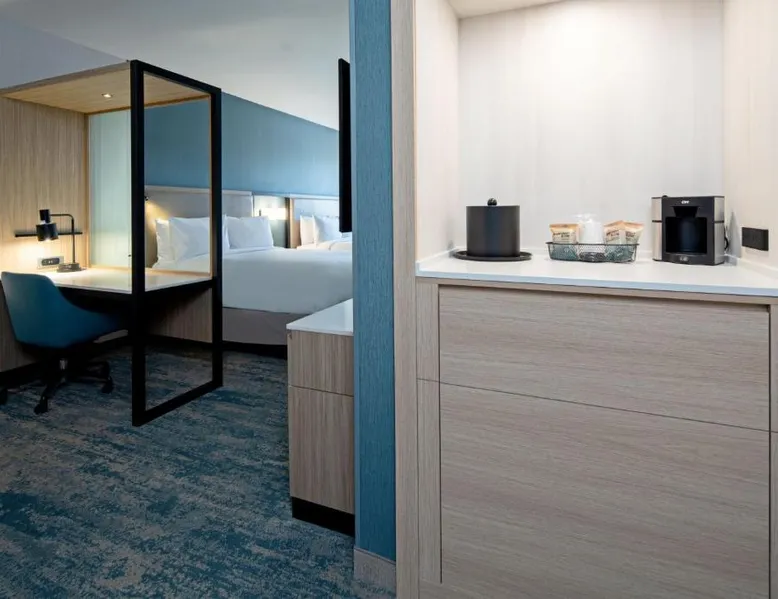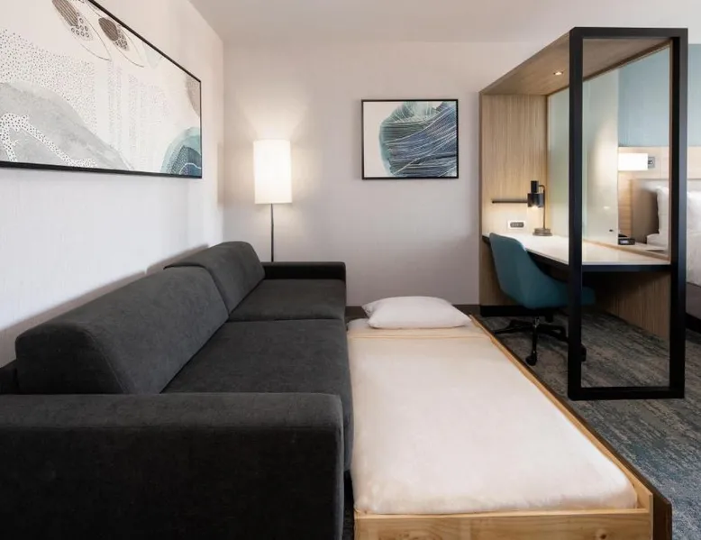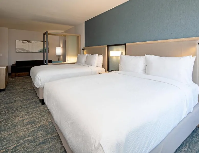 Comfortable Accommodations: SpringHill Suites by Marriott Valencia in Valencia offers spacious rooms with air-conditioning, private bathrooms, and modern amenities. Guests enjoy free WiFi, streaming services, and comfortable sofa beds. Exceptional Facilities: The hotel features a fitness center, bar, year-round outdoor swimming pool, and an outdoor fireplace. Additional facilities include a lounge, business area, and games room. Delicious Breakfast: A variety of breakfast options are available, including continental, American, buffet, vegetarian, and gluten-free. Guests can enjoy warm dishes, fresh pastries, fruits, and juices. Prime Location: Located 21 mi from Hollywood Burbank Airport, the hotel is near attractions such as Six Flags Magic Mountain (2.1 mi) and Nethercutt Museum (12 mi). Guests can enjoy hiking, cycling, and rafting in the surrounding area. The air-conditioned suite has 1 bedroom and 1 bathroom with a shower and a hairdryer. The suite features carpeted floors, a seating area with a flat-screen TV with streaming services, a tea and coffee maker, a wardrobe, as well as heating. The unit has 3 beds.