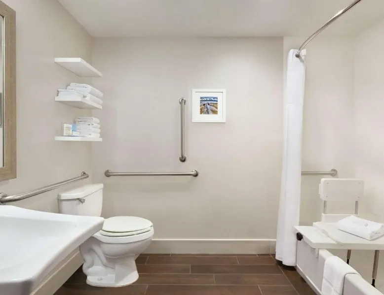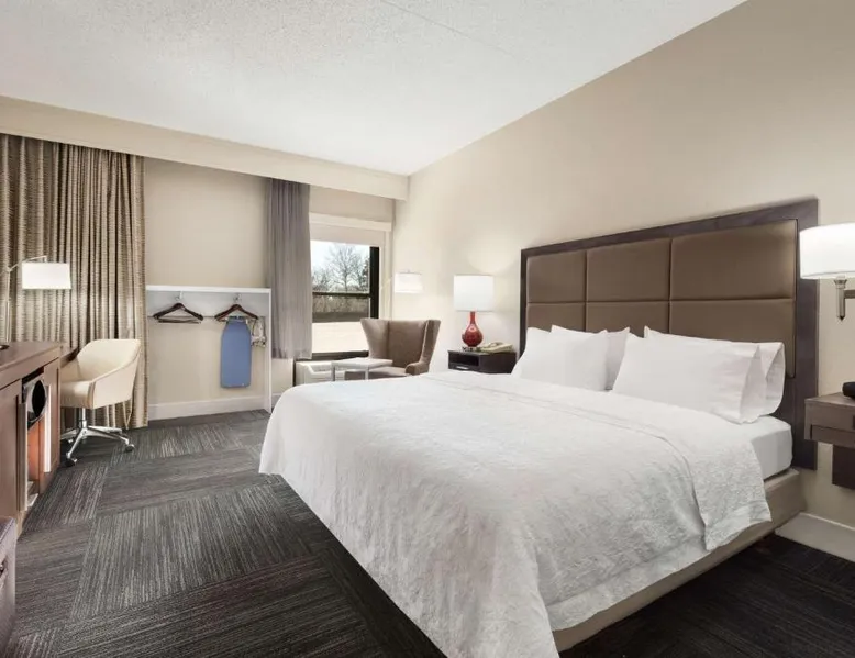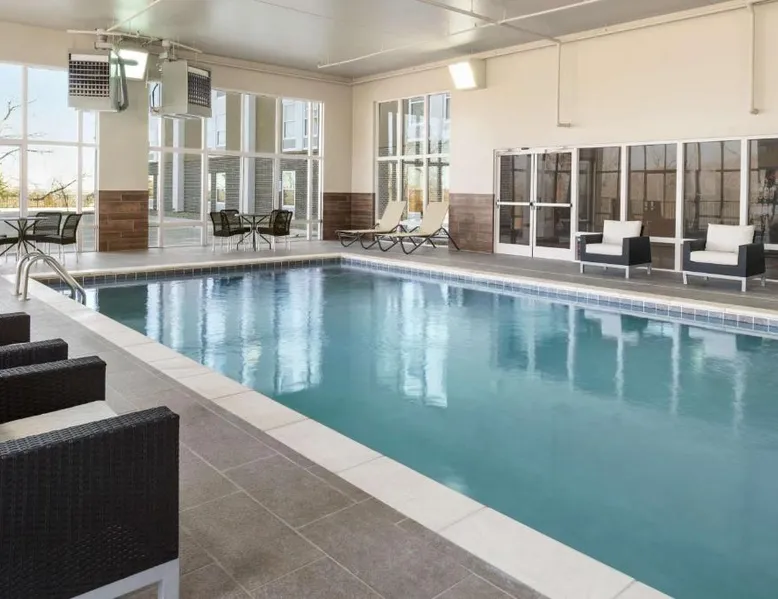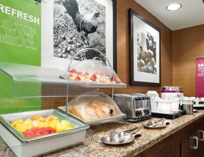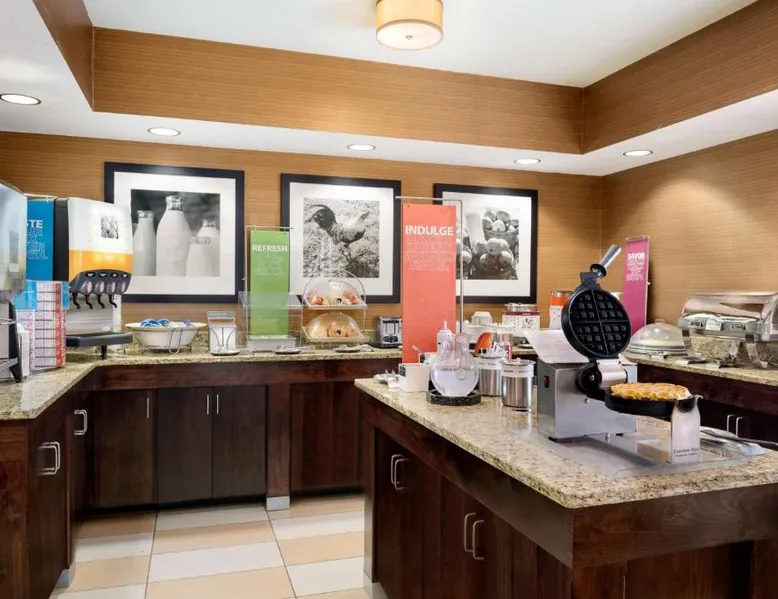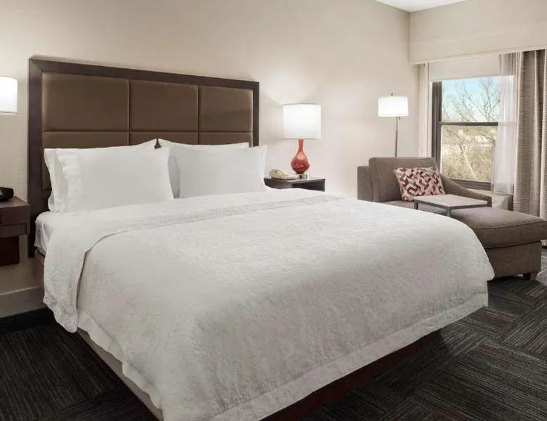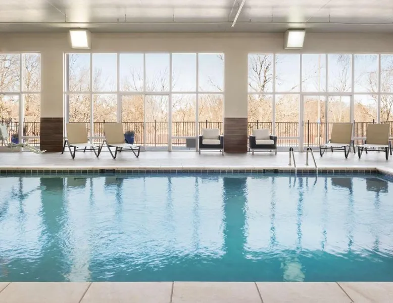 Comfortable Accommodations: Hampton Inn Lawrence in Lawrence offers comfortable rooms with free WiFi, air-conditioning, and modern amenities. Each room includes a tea and coffee maker, hairdryer, refrigerator, free toiletries, microwave, and TV. Leisure Facilities: Guests can enjoy a saltwater swimming pool, indoor swimming pool, and a fitness center. The hotel provides free on-site parking, a fitness room, elevator, 24-hour front desk, daily housekeeping service, business area, and luggage storage. Dining Options: A continental, American, and buffet breakfast is served with warm dishes, juice, fresh pastries, cheese, and fruits. Location and Attractions: Located 43 mi from Kansas City International Airport, the hotel is near Kansas Memorial Stadium (1.9 mi), Great Wolf Lodge Kansas City (28 mi), and Schlitterbahn Waterpark Kansas City (29 mi). Offering free Wi-Fi and a flat-screen TV, this room includes a small refrigerator and tea and coffee-making facilities.