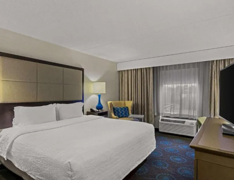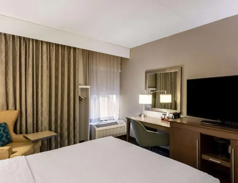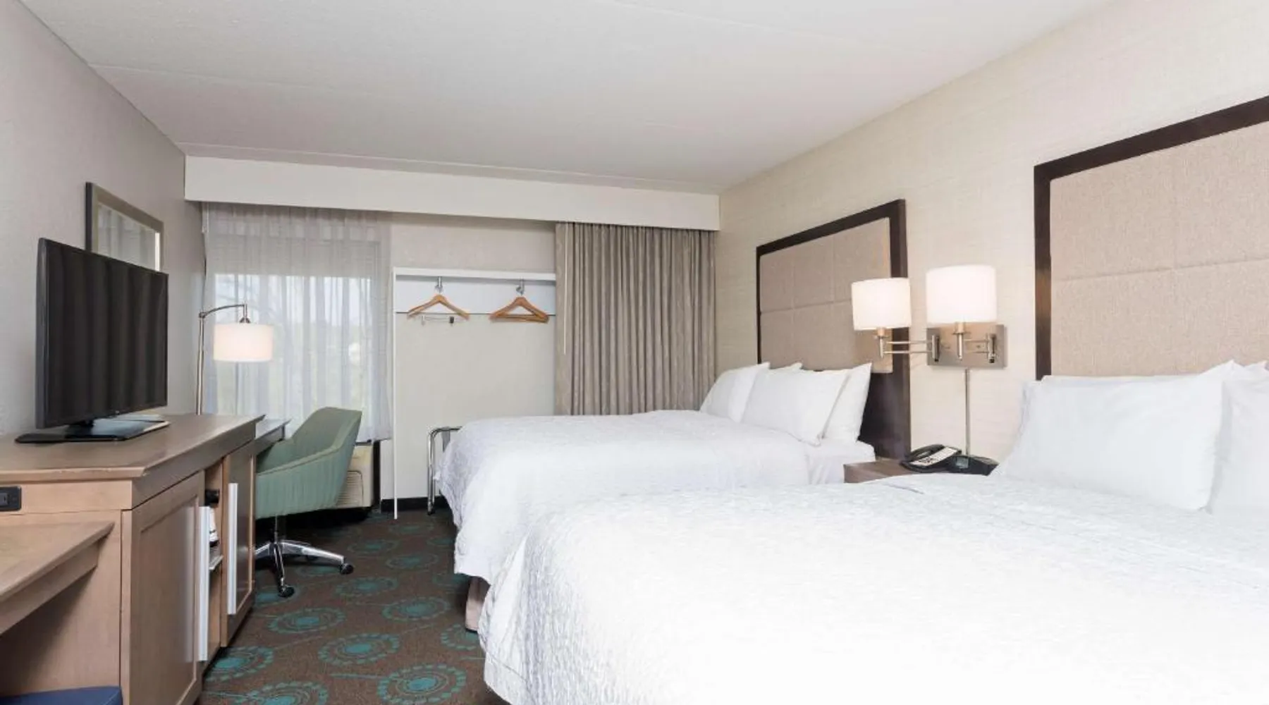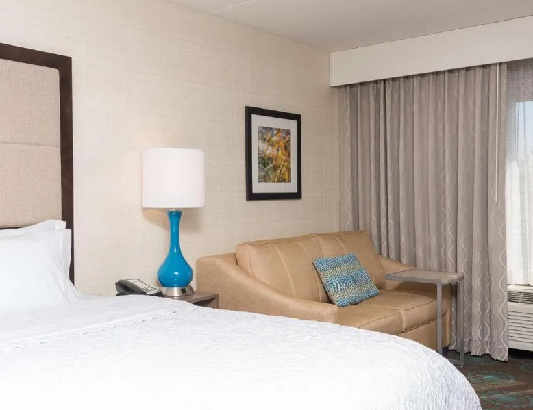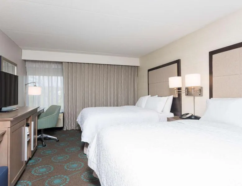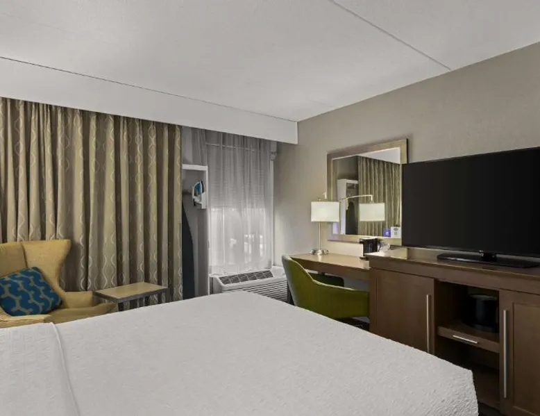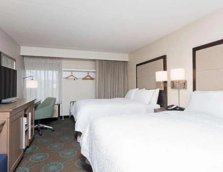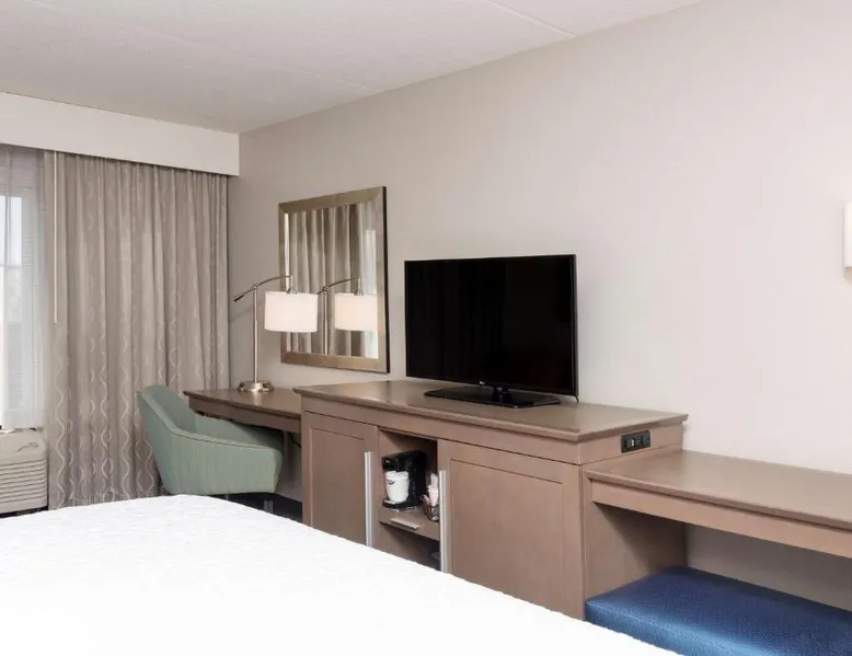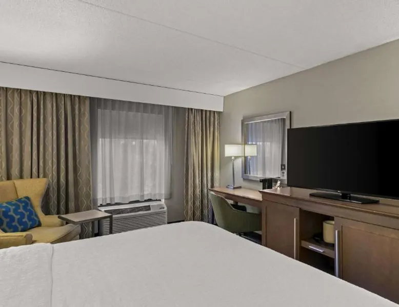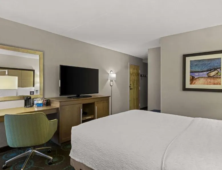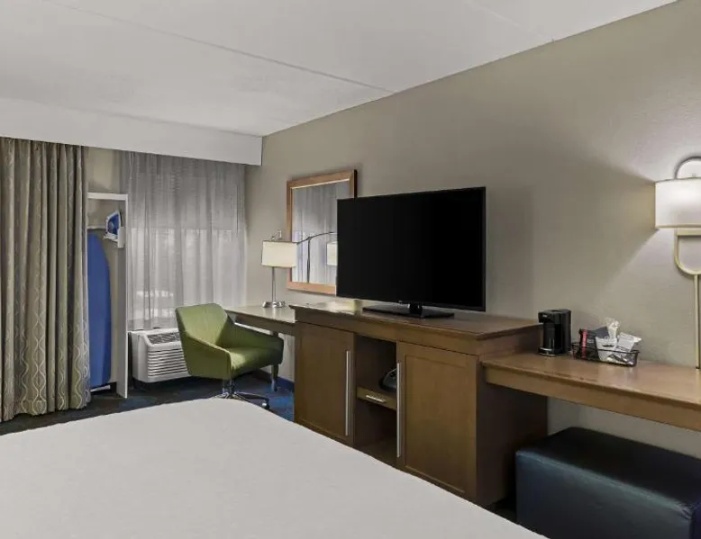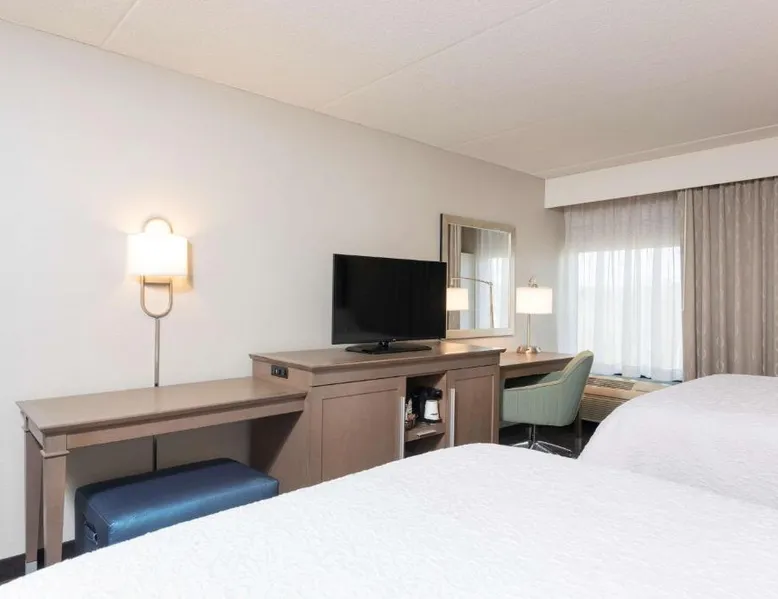 Comfortable Accommodations: Hampton Inn Bloomington in Bloomington offers family rooms with air-conditioning, free WiFi, and modern amenities. Each room includes a work desk, refrigerator, and TV, ensuring a pleasant stay. Leisure Facilities: Guests can enjoy a fitness center, sun terrace, and seasonal outdoor swimming pool. Additional facilities include a fitness room, outdoor seating area, and picnic spots, providing ample opportunities for relaxation and leisure. Dining Options: A variety of breakfast options are available, including continental, American, buffet, vegetarian, gluten-free, and kosher. Breakfast selections feature warm dishes, fresh pastries, fruits, and juices, catering to diverse dietary needs. Convenient Location: Located 43 mi from Indianapolis International Airport, the hotel is near attractions such as Bloomington Memorial Stadium (18-minute walk) and Simon Skjodt Assembly Hall (1.1 mi). Guests appreciate the attentive staff, room cleanliness, and comfortable beds. This room includes cable TV, a mini-fridge and tea- and coffee-making facilities.