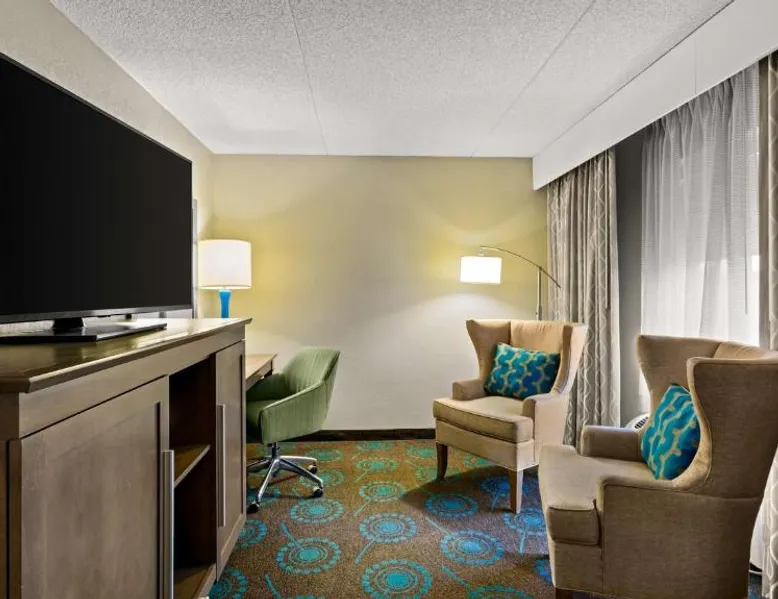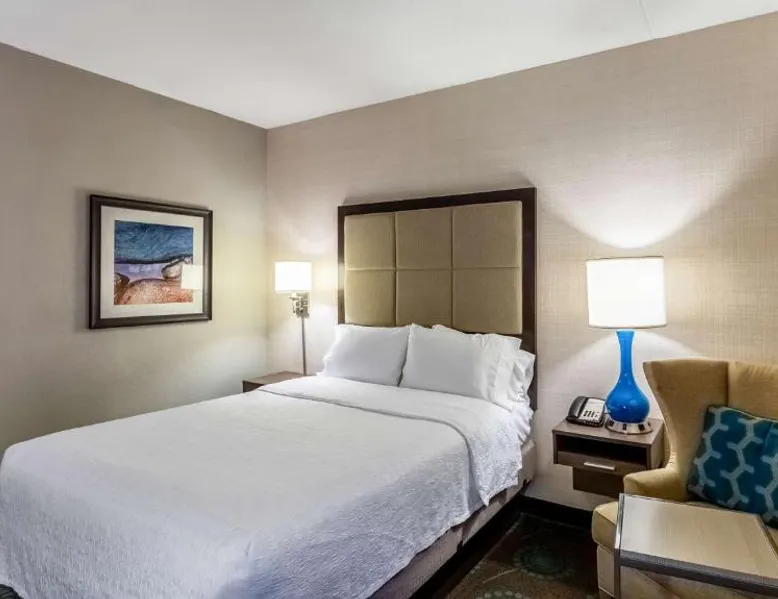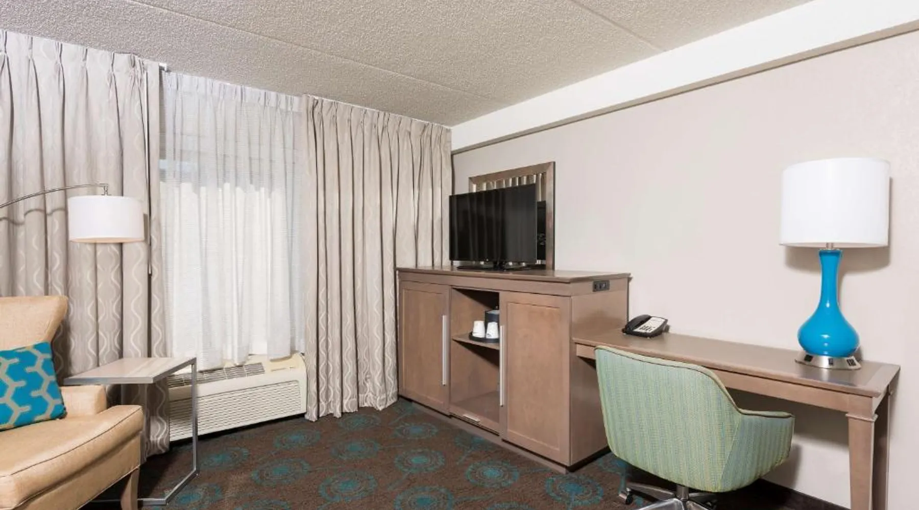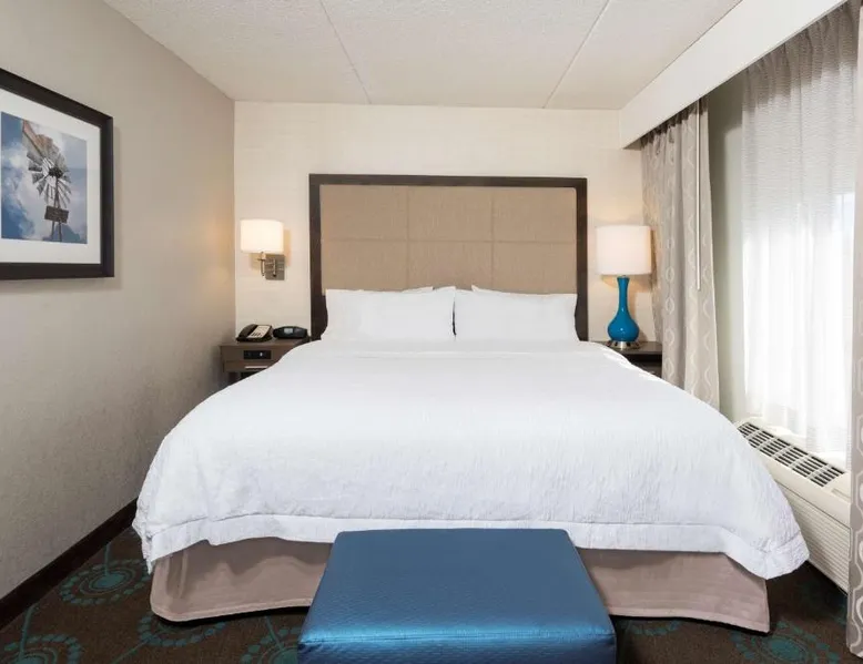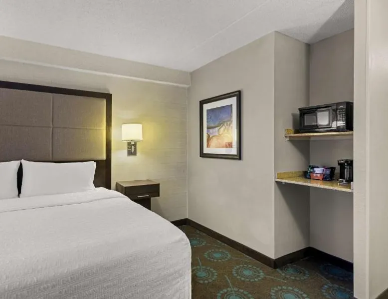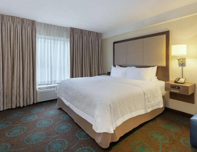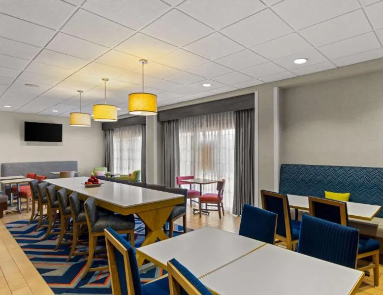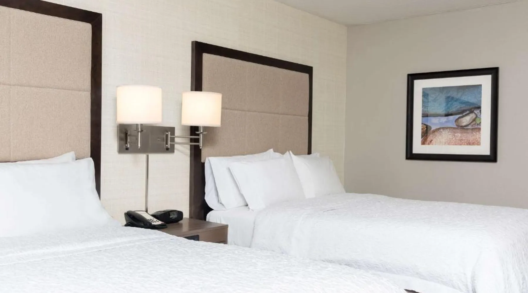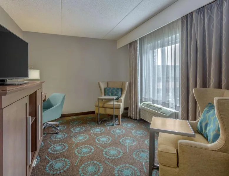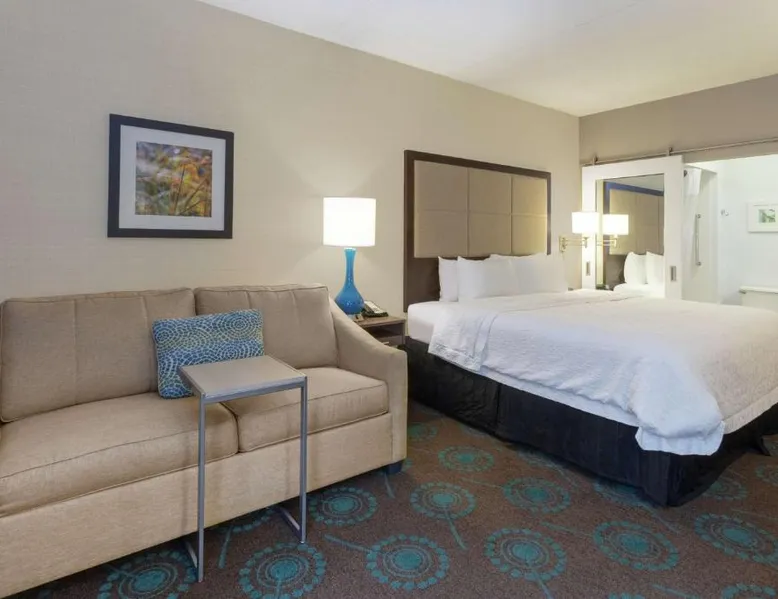 Comfortable Accommodations: Hampton Inn Bloomington in Bloomington offers family rooms with air-conditioning, free WiFi, and modern amenities. Each room includes a work desk, refrigerator, and TV, ensuring a pleasant stay. Leisure Facilities: Guests can enjoy a fitness center, sun terrace, and seasonal outdoor swimming pool. Additional facilities include a fitness room, outdoor seating area, and picnic spots, providing ample opportunities for relaxation and leisure. Dining Options: A variety of breakfast options are available, including continental, American, buffet, vegetarian, gluten-free, and kosher. Breakfast selections feature warm dishes, fresh pastries, fruits, and juices, catering to diverse dietary needs. Convenient Location: Located 43 mi from Indianapolis International Airport, the hotel is near attractions such as Bloomington Memorial Stadium (18-minute walk) and Simon Skjodt Assembly Hall (1.1 mi). Guests appreciate the attentive staff, room cleanliness, and comfortable beds. This room includes cable TV, a mini-fridge and tea- and coffee-making facilities.
