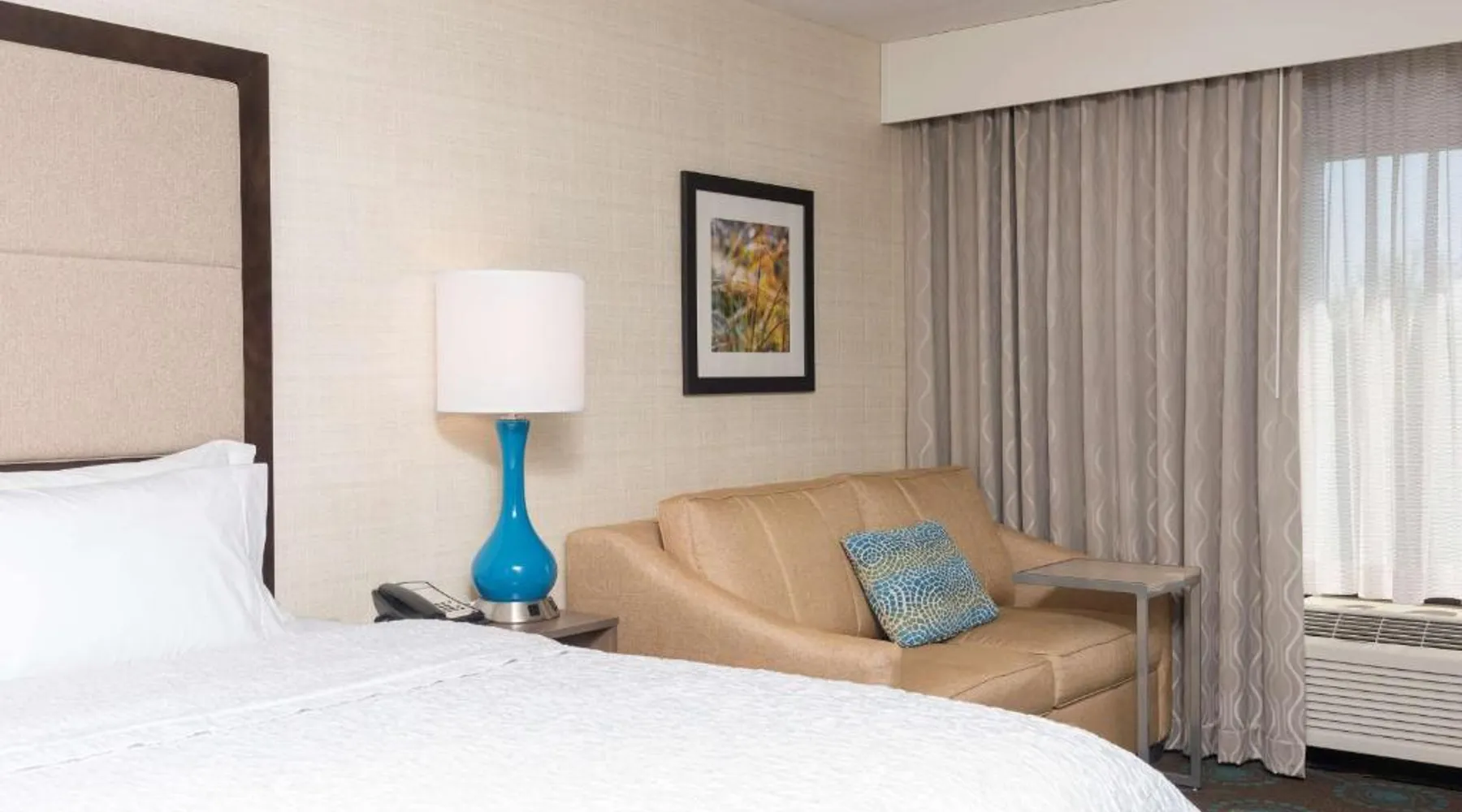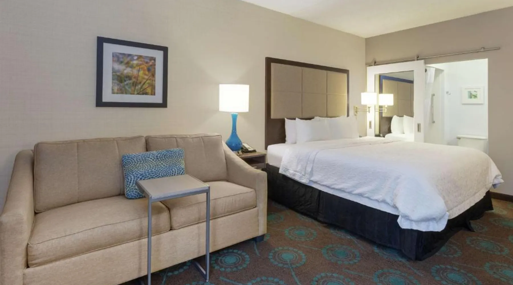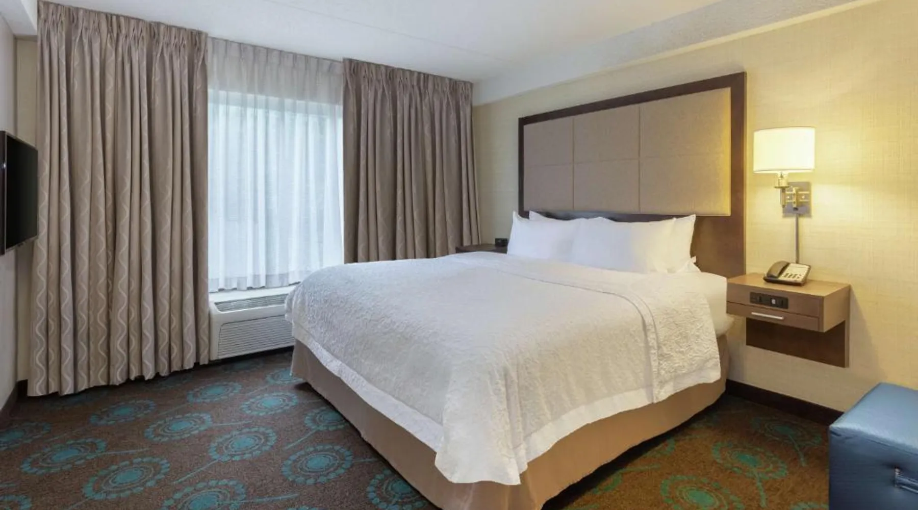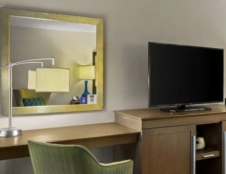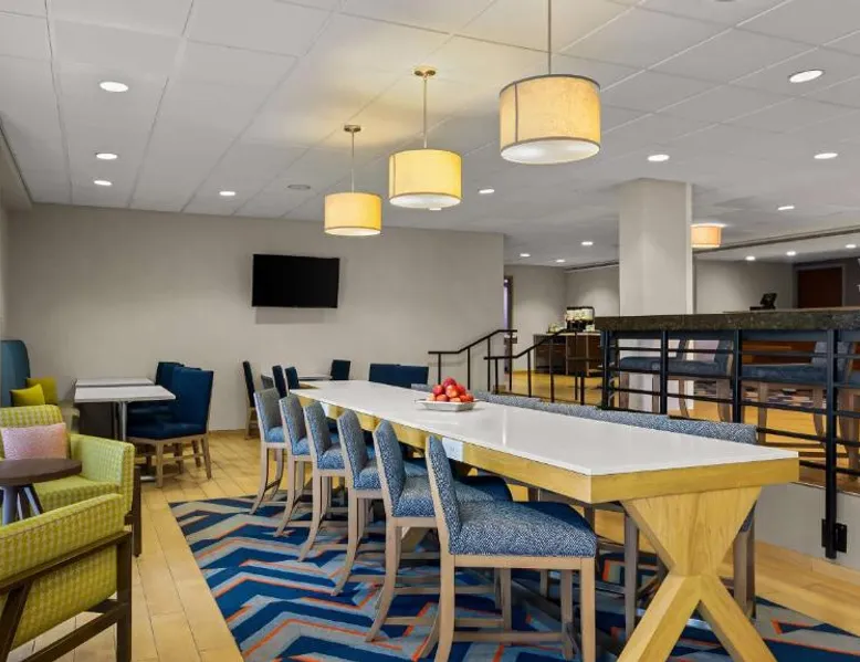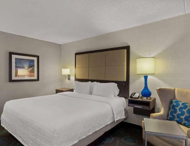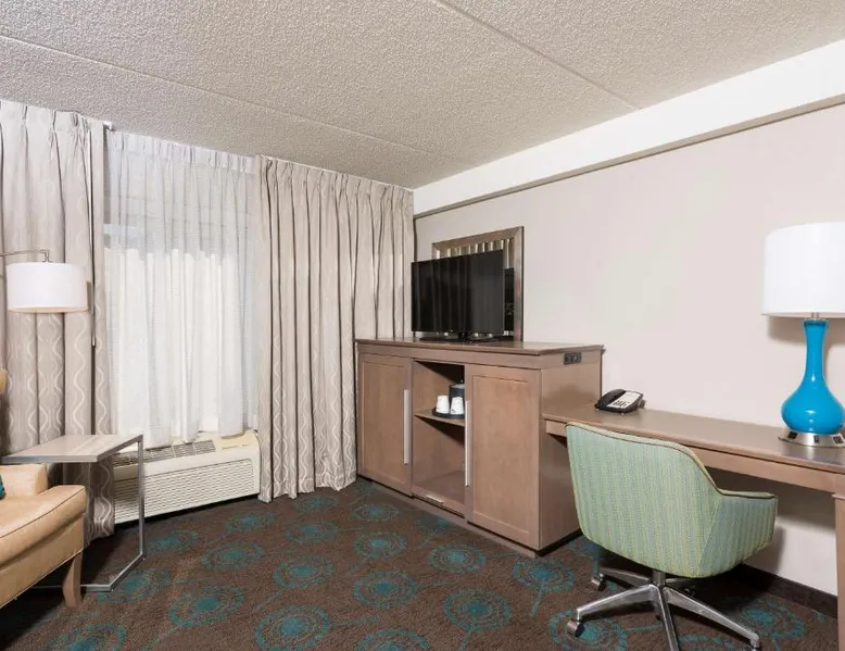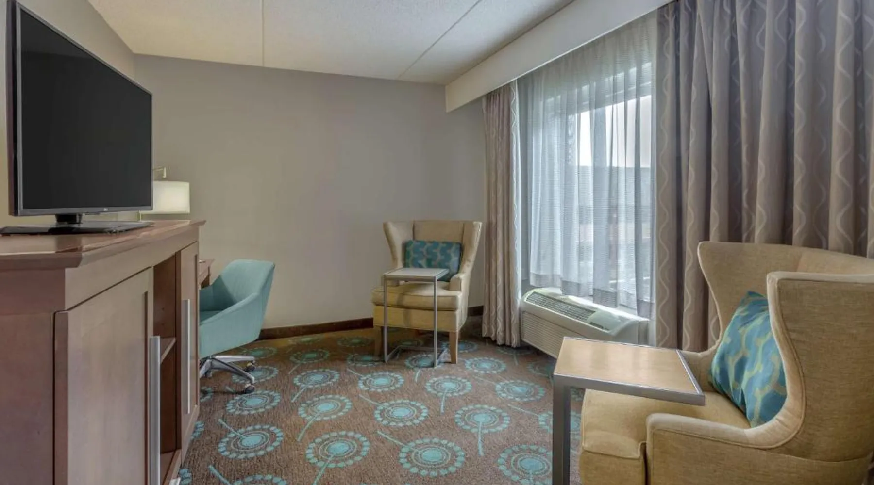 Comfortable Accommodations: Hampton Inn Bloomington in Bloomington offers family rooms with air-conditioning, free WiFi, and modern amenities. Each room includes a work desk, refrigerator, and TV, ensuring a pleasant stay. Leisure Facilities: Guests can enjoy a fitness center, sun terrace, and seasonal outdoor swimming pool. Additional facilities include a fitness room, outdoor seating area, and picnic spots, providing ample opportunities for relaxation and leisure. Dining Options: A variety of breakfast options are available, including continental, American, buffet, vegetarian, gluten-free, and kosher. Breakfast selections feature warm dishes, fresh pastries, fruits, and juices, catering to diverse dietary needs. Convenient Location: Located 43 mi from Indianapolis International Airport, the hotel is near attractions such as Bloomington Memorial Stadium (18-minute walk) and Simon Skjodt Assembly Hall (1.1 mi). Guests appreciate the attentive staff, room cleanliness, and comfortable beds. This room includes cable TV, a mini-fridge and tea- and coffee-making facilities.