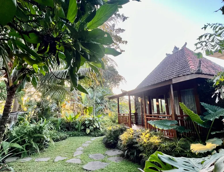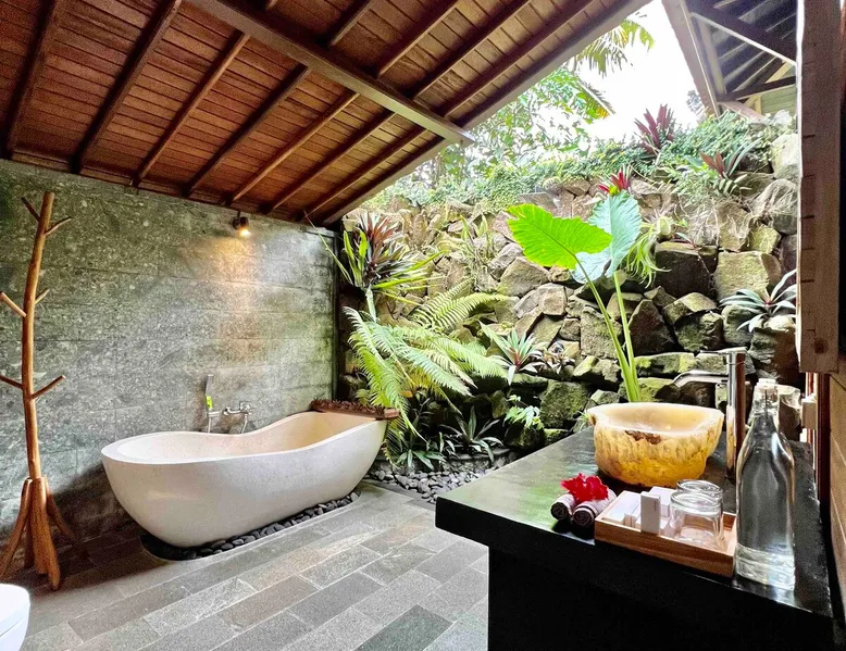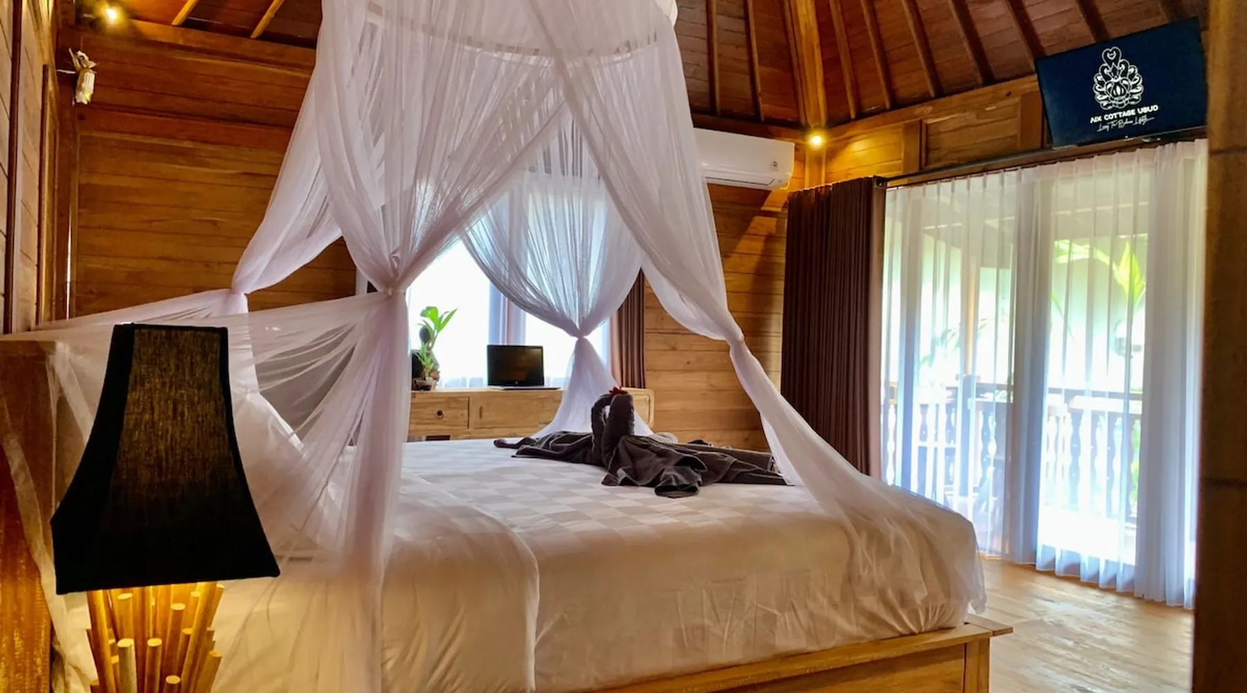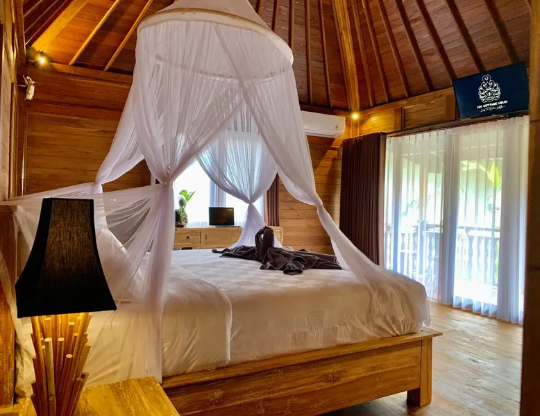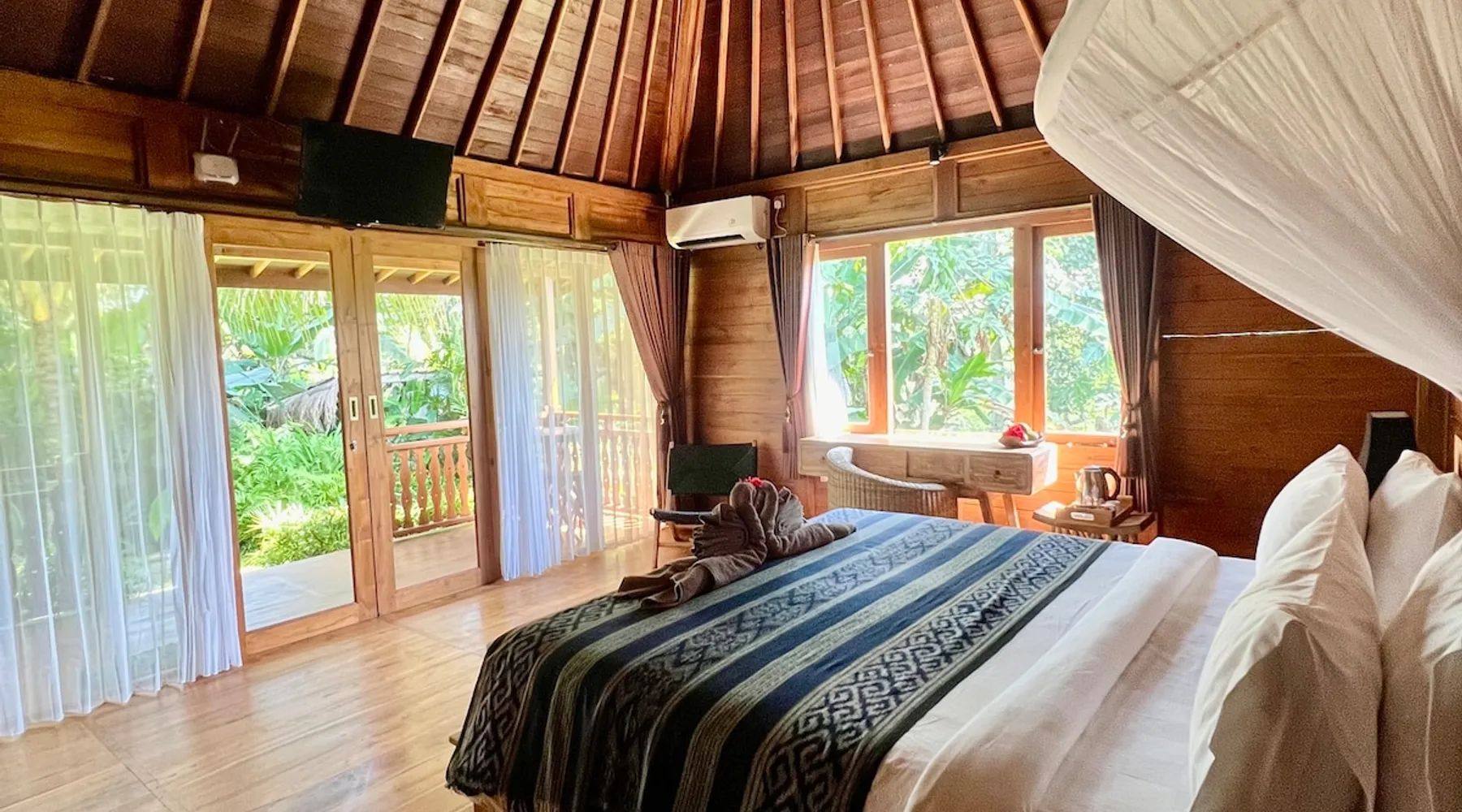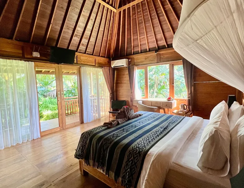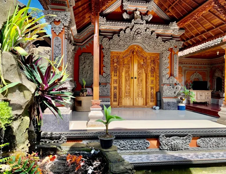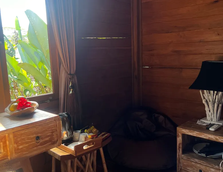 This is very awesome bright modern wooden bedroom with wonderful semi open bathroom also surrounding by green jungle view and garden. Perfect for your ultimate Bali's Countryside escape and see real Bali's CULTURE and NATURE Situated behind my beautiful Balinese family compound that separated by beautiful gate. You will be welcomed by original Balis Engraving architecture, house layout with its own temple. me & my family will taking care of you as a family member. "LIVING THE BALINESE LIFESTYLE" The space Begin from the bathroom, the bathroom is 3m x 4,5m wide has semi open shower that possible to see the sky while you taking shower. than we provide bath tube, toilet, washbasin. you can access hot and cold water by the shower, bath tube and washbasin as well. we provide 2 different hanger for towel and cloths. Moving to the bedroom, in front of the room we have fully glass door with day and night curtain. Bedroom size is 4,5m X 5m wide. Facilitated double bed that very comfy with mosquito net, 2 side bed table with side bed lamp. Working desk by the window with jungle valley view, wardrobe, air conditioning 1 1/2pk, smart tv (can be connect to Netflix, prime video, You tube and many more), room router wi-fi up to 75mbps. The room door we use key lock. Moving to Balcony with green jungle valley view and possibly sunset view, lush garden view, we have round table with pair of chair to enjoy meals and coffee while you enjoying view at the balcony. THE BEDROOM'S FLOOR IS 75cm high from the ground, the floor is totally made from wood. at front of the room at the garden we have beautiful villa's gate and access to the exit of the my family compound with pure original Bali's architecture. Than after 60 meters you will be at our main gate from main road. Guest access guest can acces private kitchen, garden, parking in garage. Other things to note Don't worry, we ready to handle your morning energy ;) Breakfast with Additional Charge. SEE YOU