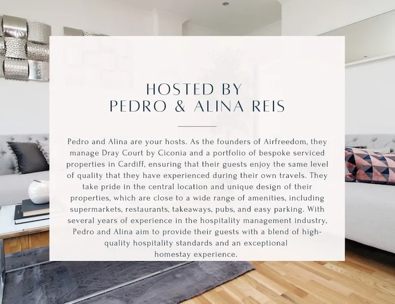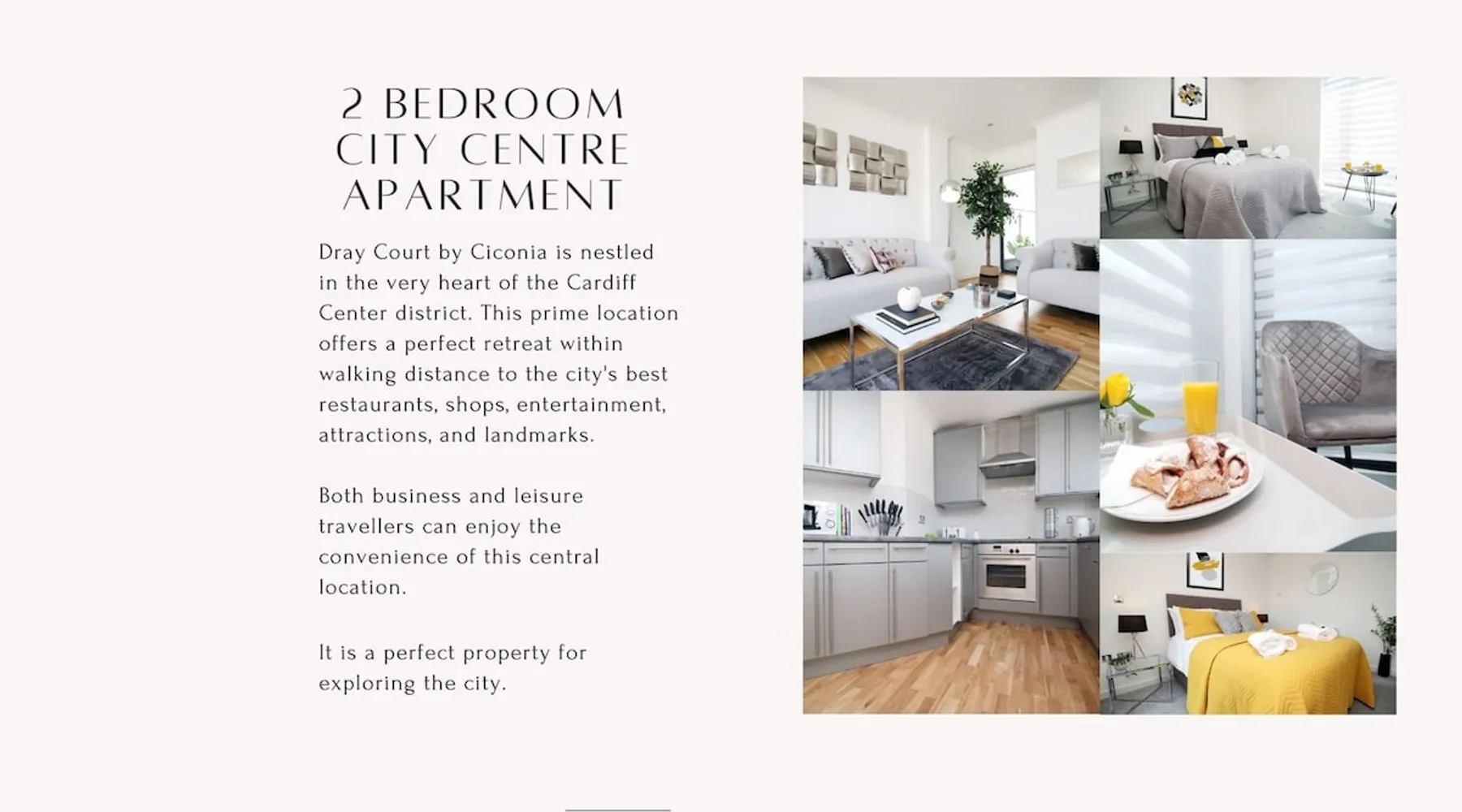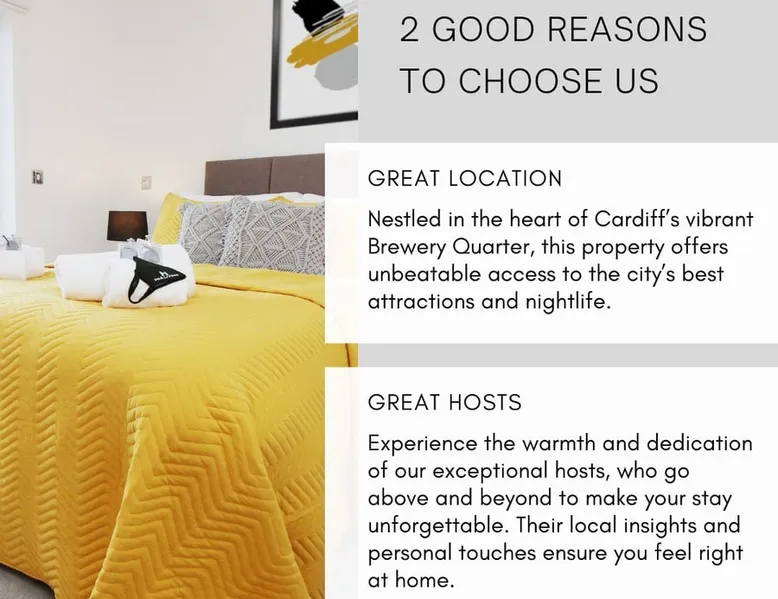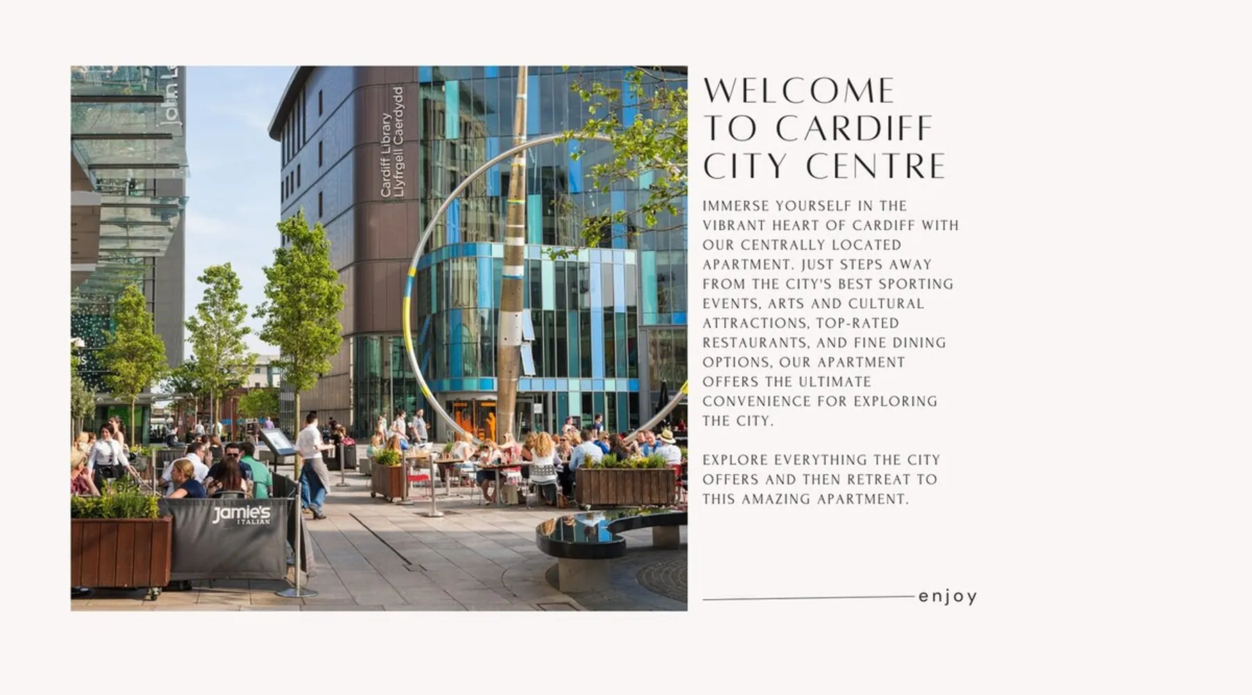 Experience city life in this elegant 2Bedroom 2Bathroom apartment situated in the very heart of Cardiff's City Centre. Its prime location offers easy access to top restaurants, shops, entertainment, attractions, and landmarks. Explore everything the city offers and then retreat to this lavish apartment with stunning views. ✔ Central ✔ 2 Comfortable Bedrooms ✔ Open Design Living ✔ Fully Equipped Kitchen ✔ Balconies feat. City Views ✔ Smart TV ✔ High-Speed Wi-Fi Learn more below! The space Dray Court by Ciconia is located in the city centre, above the Brewery Quarters. As soon as you step foot in this apartment, you're welcomed by a very stylish yet highly comfortable open concept living area. It is designed and decorated in an elegant manner that complements the excellent location in the very heart of Cardiff. The fully equipped kitchen and adjacent dining area are where you'll get to prepare and enjoy delicious meals with your loved ones before relaxing in the living room, which sets the stage for memorable evenings. Large windows and balcony doors allow for plenty of natural light to illuminate the space while allowing you to gaze at the mesmerizing view of the city. Finally, you'll be able to catch a breath of fresh air, soak up the sun, and marvel at the gorgeous city views. Once the sun sets and you decide it's time to rest, retreat to two comfortable bedrooms to recharge after an exciting day of sightseeing. ★ LIVING ROOM ★ Find your place on the comfy sofa, cuddle up with a good book, watch your favorite movie, or gather with your family and friends to discuss your plans for the day. ✔ Two Comfortable Sofas with Cushions ✔ Smart TV ✔ Stylish Coffee Tables ✔ Designer Reading Lamp ✔ Access to the Balcony ★ KITCHEN & DINING ★ It is fully equipped with modern cooking appliances that make it suitable for preparing any meal, whether a simple breakfast, quick snack, or a three-course gourmet dinner. Spacious countertops provide plenty of room to work your MasterChef magic. ✔ Microwave ✔ Stove ✔ Oven ✔ Refrigerator/Freezer ✔ Coffee Maker ✔ Kettle ✔ Toaster ✔ Sink - Hot & Cold Water ✔ Glasses ✔ Silverware ✔ Pots & Pans Have a few drinks in the living room while the food is getting ready. Once it's done, serve it at the inviting dining table and enjoy a tasty meal with your loved ones. ✔ Dining Table with Seating for 4 ★ SLEEPING ARRANGEMENTS – 2 BEDROOMS ★ After an unforgettable day of Cardiff adventures, you will be looking to rest for an equally entertaining tomorrow. Once you are ready to relax, please make your way to these comfortable bedrooms. ♛ Bedroom 1: Double Bed ♛ Bedroom 2: Double Bed Both bedrooms are equipped with a similar set of amenities. ✔ Egyptian Cotton Bed Linens, and Sheets ✔ Closets with Hangers and Shelves ✔ Dressers ✔ Night Stands with Reading Lights ✔ Access to the Balcony ★ BATHROOMS ★ There are two relaxing bathrooms fully stocked with fresh towels and essential toiletries, so you don't have to worry about bringing your own. ✔ Bathtub with a Shower ✔ Walk-In Shower ✔ Vanity ✔ Mirror ✔ Toilet ✔ Towels ✔ Hair Dryer ✔ Essential Toiletries ★ BALCONIES ★ A luxurious 4th-floor apartment would not shine in its best light if it did not have a private balcony where you can relax, catch a breath of fresh air, and enjoy the views of the city centre. Choose from the living room and the master bedroom balconies for a perfect place to sip your morning coffee and kick-start the day. ✔ Seating Areas with Table and Chairs We look forward to you finding your happiness in this upscale apartment. This could mean unplugging for a while, watching a movie, curling up on the sofa with a good book, or soaking up the sun on the private balcony. Let us know if you have any questions; we're locals; we have the answers. Happy Travels! Guest access We will provide you with an online concierge app that allows you to check in online and collect all the information needed for your self-check-in. The keys are picked up from a Keynest facility that is a 2 minute walk from the main door. The apartment is exclusively yours, without interruption for the duration of your stay, so relax, unwind, and make yourself at home. The apartment is located in an upmarket residential building. While this provides great safety and security, we kindly ask all our guests to keep noise to a minimum while entering and leaving the building. Accessible via stairs (4 flights) or a lift. Other things to note ★ COVID-19 SANITIZATION ★ Heath, safety, and well-being of our guests are of utmost importance. For this reason, we use a thorough cleaning process after each check-out. ★ PETS ALLOWED ON REQUEST★ We love those little (and not so little) furry bundles of joy. We accommodate pets on request and there's a charge for their stay. ★ NO SMOKING INSIDE ★ Please refrain from smoking inside the apartment! Any smoking evidence will result in a fee for deep cleaning and ozone treatments. ★ ONLINE CHECK-IN ★ Prior to your arrival, you will be asked to submit an online check-in form, which requires you to upload an identification form, pre-authorise a security deposit and sign terms and conditions ★ NO PARTIES/EVENTS ★ We kindly ask you to treat our home as your own to preserve its pristine condition for future guests and your return visits. All guests must be accounted for at the time of bookings and no visitors are allowed.