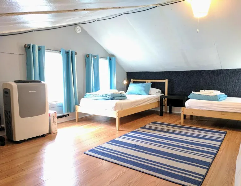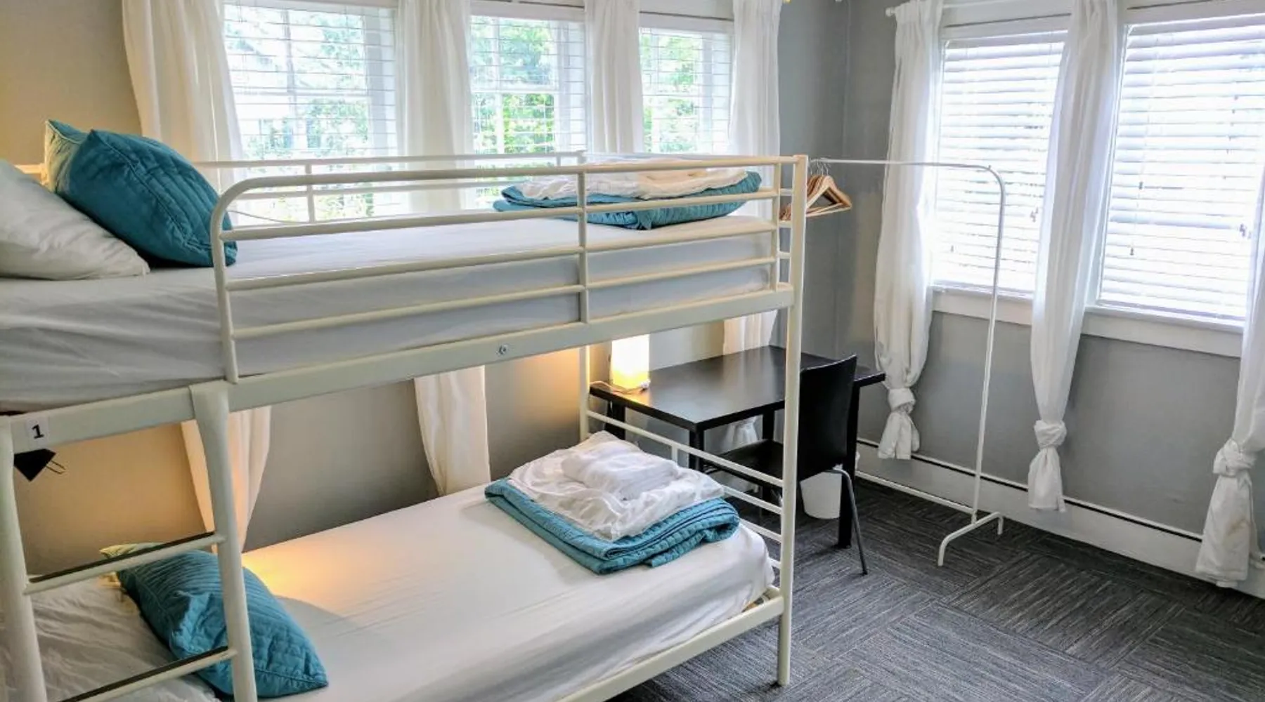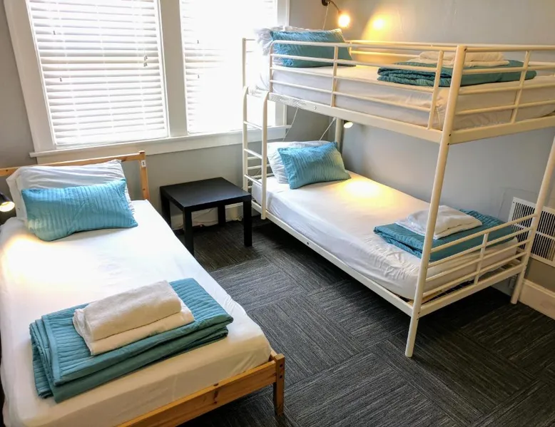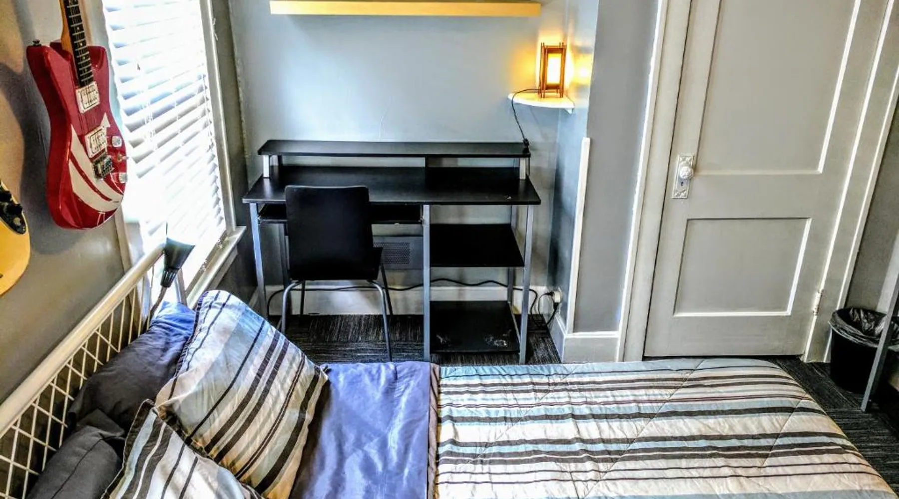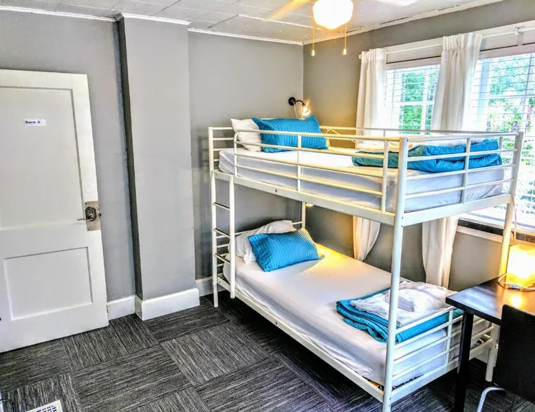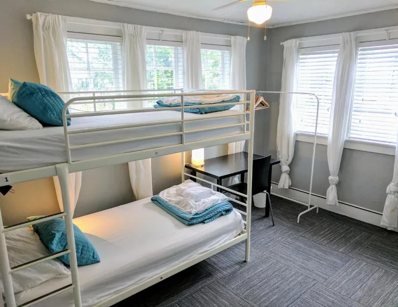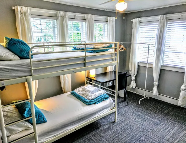 Comfortable Accommodations: The Wayfaring Buckeye Hostel in Columbus offers family rooms with private bathrooms. Each room includes air-conditioning, a work desk, and a wardrobe. Essential Facilities: Guests enjoy free WiFi, a garden, terrace, and free bicycles. Additional amenities include a hot tub, lounge, and games room. Convenient Location: Located 8.1 mi from John Glenn Columbus International Airport, the hostel is near attractions such as the Ohio Historical Center (1.9 mi) and Columbus Zoo and Aquarium (17 mi). Guest Services: The hostel provides a paid airport shuttle, self-service laundry, and free on-site parking. Breakfast includes cheese. This dormitory room has a shared bathroom and a desk.