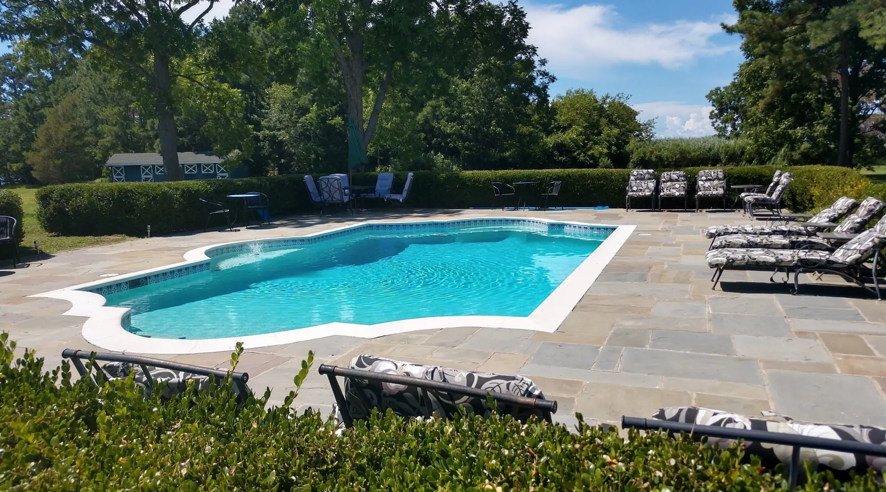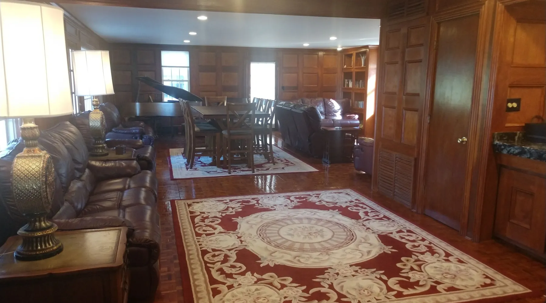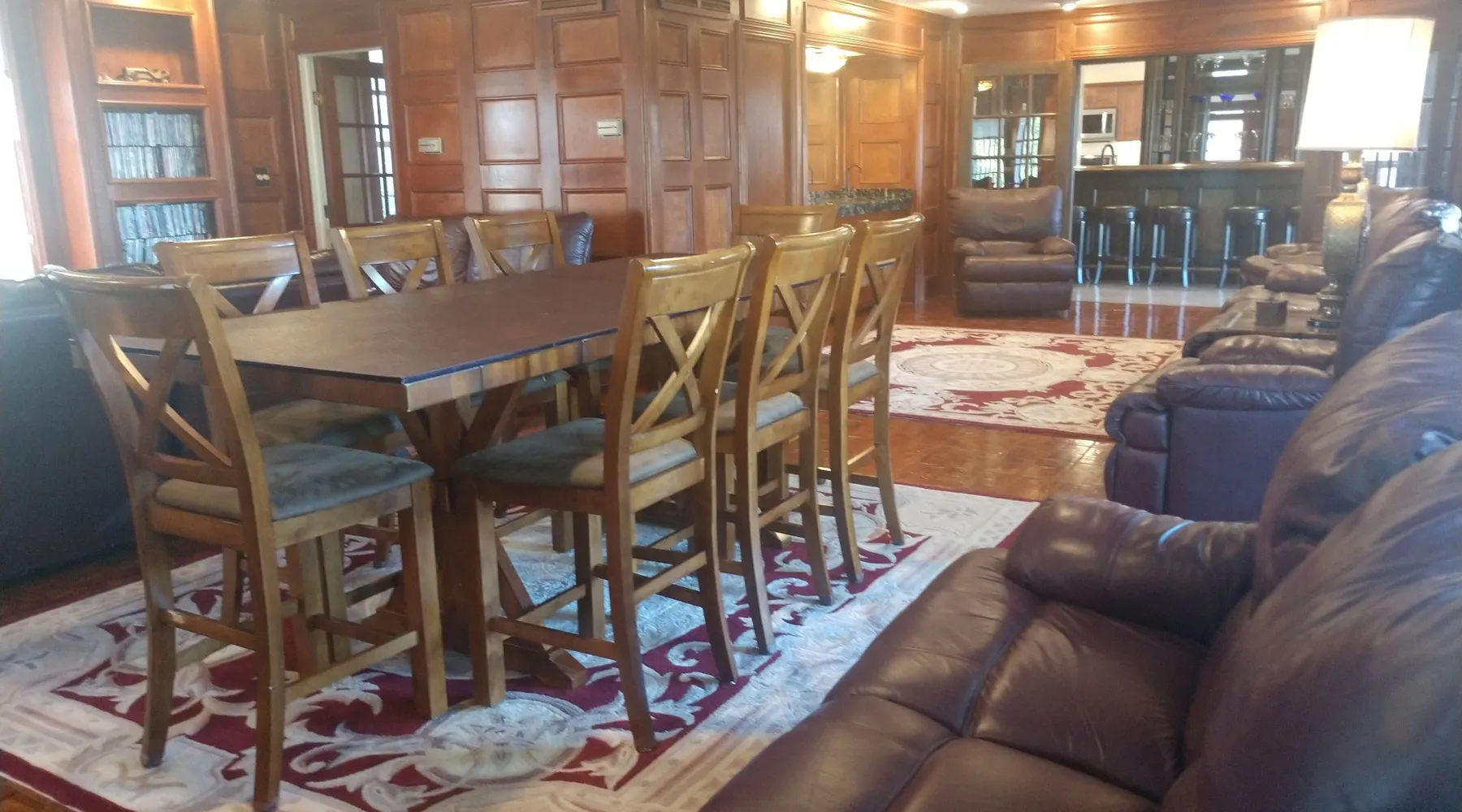 Kingsbay Bayhouse is an exclusive private waterfront house separated by a 70 foot grand solarium hallway off Kingsbay Mansion. Recently, a 350 square foot brand new Kitchen renovation was added, completely out fitted with all new state of art appliances and fully stocked with cooking and serving accessories. In addition, there are two sets of free to use, new washers and dryers. Along, with a custom bar room that seats 12, and a Great Room that provides leather recliner(s) theater seating for 15 people at one time and a counter height dining table center, for eight. Complete with built-in book selves all reminiscence of an Old English Hardwood Paneled Pub and Parlor rooms. You will be renting the 3000 square foot guest house to Kingsbay Mansion called The Bay House. There's a five bedroom three bathroom great room, English Pub bar brand new kitchen and a dedicated swimming pool for you and your guests only. Kingsbay Mansion has five suites, that we rent as a boutique Hotel that is a 13,000 ft house to itself. We also have a property called Kingsbay Dockside with four bedroom three bath Waterfront in ground swimming pool, that you may be also interested in. Please note: KINGSBAY MANSION is our premier property ran as a boutique hotel for nightly stays, or the entire venue for family reunions, weddings and events. This gated, elegant Georgian waterfront estate is one of a kind. Located on Maryland's Eastern Shore, Kingsbay is peninsula on Coulbourn Creek at the mouth of the Chesapeake Bay just north of Crisfield Maryland. It is the largest private home in Somerset County and was designed by Ian McCallum, the architect for Colonial Williamsburg. Built in 1970 on 7 acres and in middle of 500 acres of prime Maryland farmland, this estate offers 11 bedrooms, 10 full baths and 2 half baths. Starting In 2015, Kingsbay Mansion has been transformed into a breathtaking Executive B&B and Private Event Center. Five of its spectacular suites with private baths are being offered as part of the Kingsbay Mansion B&B. The entire estate is available for private functions, corporate events and destination weddings. There is approximately 2000 feet of shoreline with dock for boating and kayaking. Kingsbay has 13K square feet of living space and boasts a three-story rotunda with a domed skylight and Belgian crystal chandelier. The music hall offers vaulted ceilings, another stunning chandelier, grand piano and large theater organ. The formal living room is designed with a doublewide fireplace and an impressive beamed, crown molded ceiling. The formal dining room has a Chinese Chippendale theme with built-mirrored china cupboards, fireplace and chandelier. Other rooms include the family dining room, breakfast room, lounge bar, rear foyer bar, wood paneled library and more. There are two fully stocked bars and the in-ground Grecian swimming pool with slate deck and fountain with magnificent views of the waterfront and the manicured Japanese gardens. Kingsbay Mansion, Bayhouse, Waterside Retreat Compound, Cottage and the Dockside House, vacation rentals properties are available to rent for any occasion to accommodate up to 44 guests.