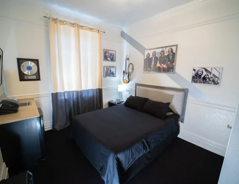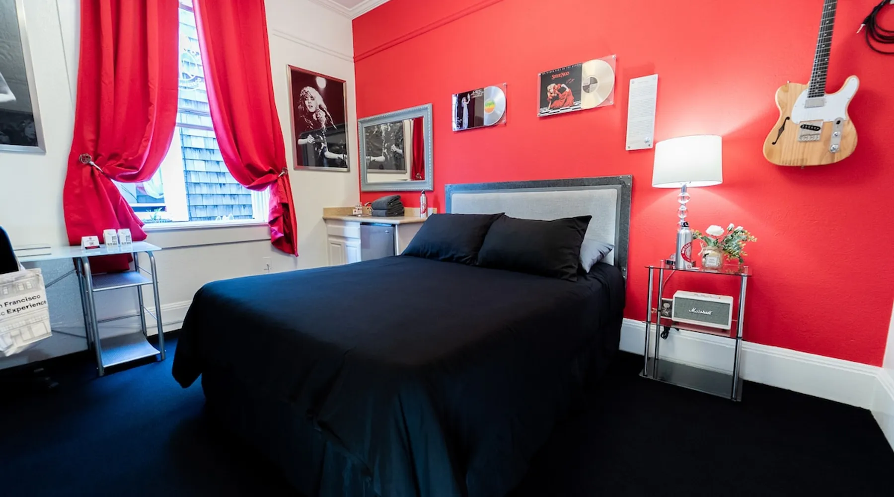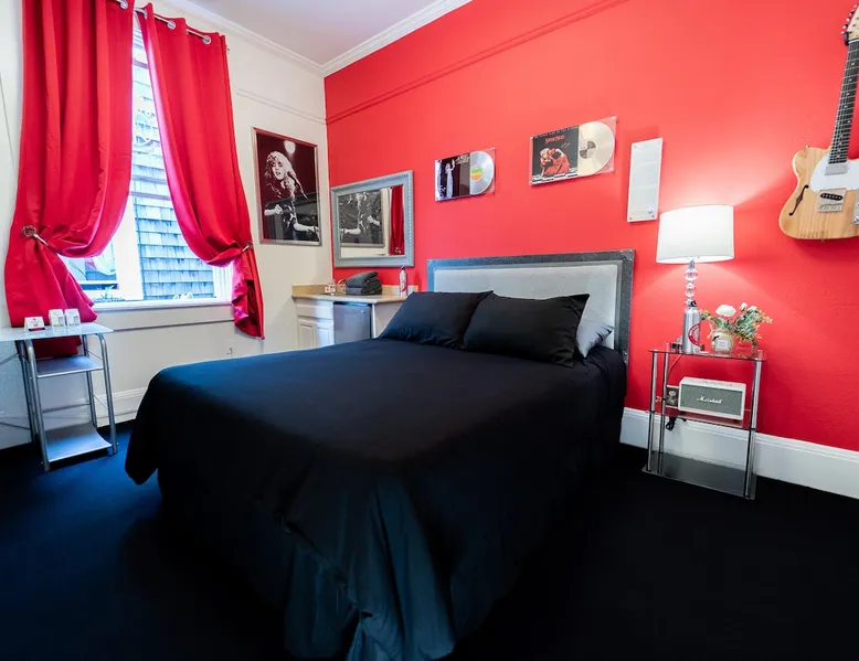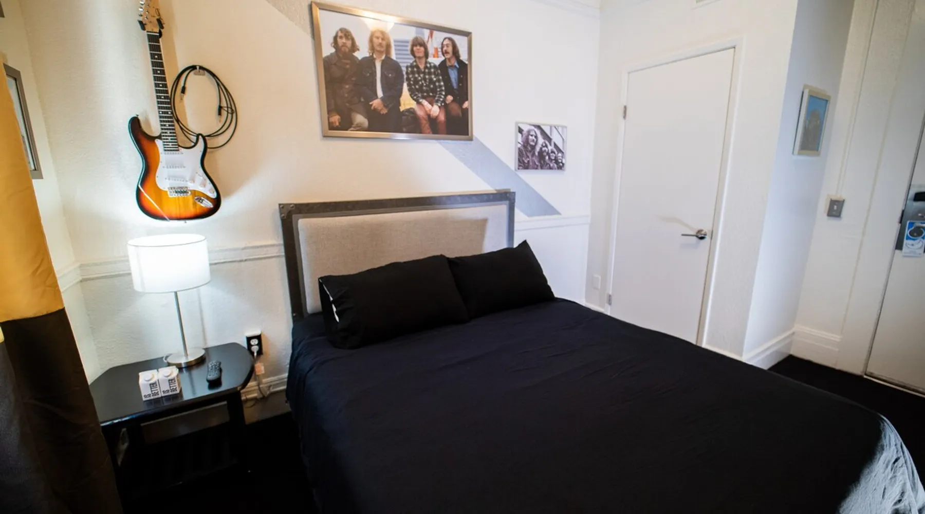 Private room with Queen size bed and shared restrooms/showers located down the hallway (each restroom is single occupancy). Room contains blown up photo, laser printed on metal, of an important Bay Area musician, as well as other images honoring local music. Free access to our Hall of Fame Gallery featuring SF music legends, and original tribute placards. Mini-fridge, sink, closet, TV with HBO inside room. Shampoo, conditioner, soap, and towels provided. The space Immerse yourself with San Francisco’s megastars surrounding you in a living incubator of up and coming artists. Sleep with the stars and walk in their footsteps while you stay inside the first and only San Francisco Music Hall of Fame. It might get loud! Dive into San Francisco’s ultimate music experience—whether it’s a weekend getaway or an extended adventure, immerse yourself in our vibrant community, explore your creative side with our Artist Development and DJ workshops, or simply soak in all the music and creative energy around you Meet fellow travelers and local musicians, jump into a karaoke session, book a jam room, or even host your own DIY party. With ongoing live-streamed performances it’s easy to make music, make memories, and become part of the Music City SF story. We are a bold entertainment company bringing artists and music lovers together to ignite the soul of local culture. At Music City SF, your stay supports independent local artists—it's more than accommodation; it's a movement! Access to the SF Hall of Fame is free for all guests of Music City Hotel and be experienced independently. An audio tour is also available - access points made available in multiple spots of the gallery. Free coffee/tea and fresh fruit are offered daily as well as free luggage storage and free high-speed WiFi. Guest access Room is private room with shared restroom. Restrooms/showers located in several locations down the hallway on each floor. Each restroom/shower is single occupancy. Property contains many common areas to hang out, relax, or do work. There is a Hotel guest specific common room with couches, TV, video and board games, amenity station with coffee/tea, fruit, and paper plates/cutlery. There is also plenty of working space within the main lobby area near the front desk. Other things to note Private rooms require a credit card in your name on file, which can be provided at check in time. If not credit card, a debit card will be acceptable along with a $250 refundable deposit on the debit card. IF YOU WILL BE ARRIVING AFTER 11PM, please contact us! We will need to make special arrangements for your check in since you'll be arriving when our Front Desk is closed. Thank you! Registration details Exempt
