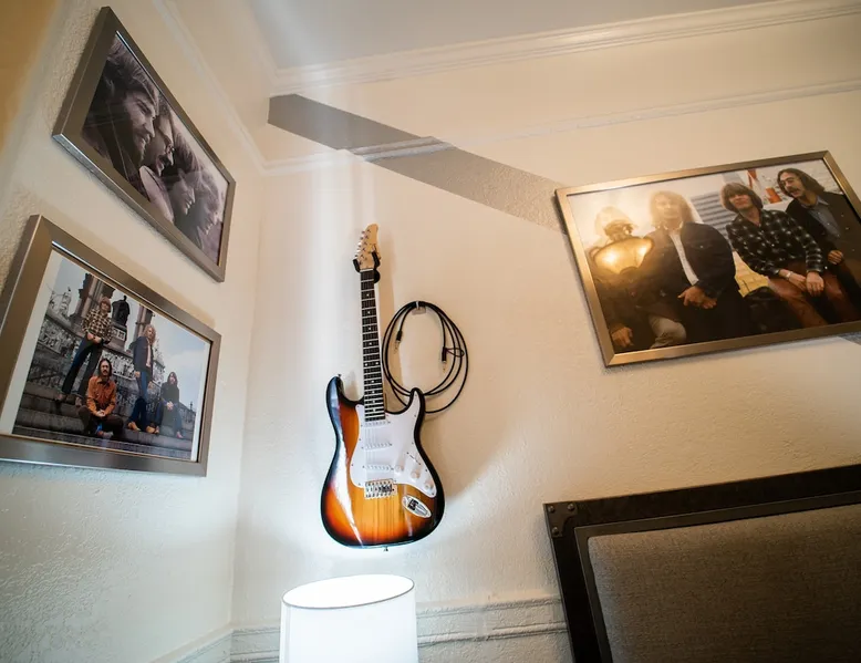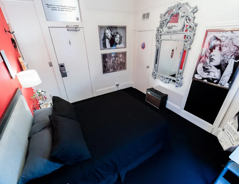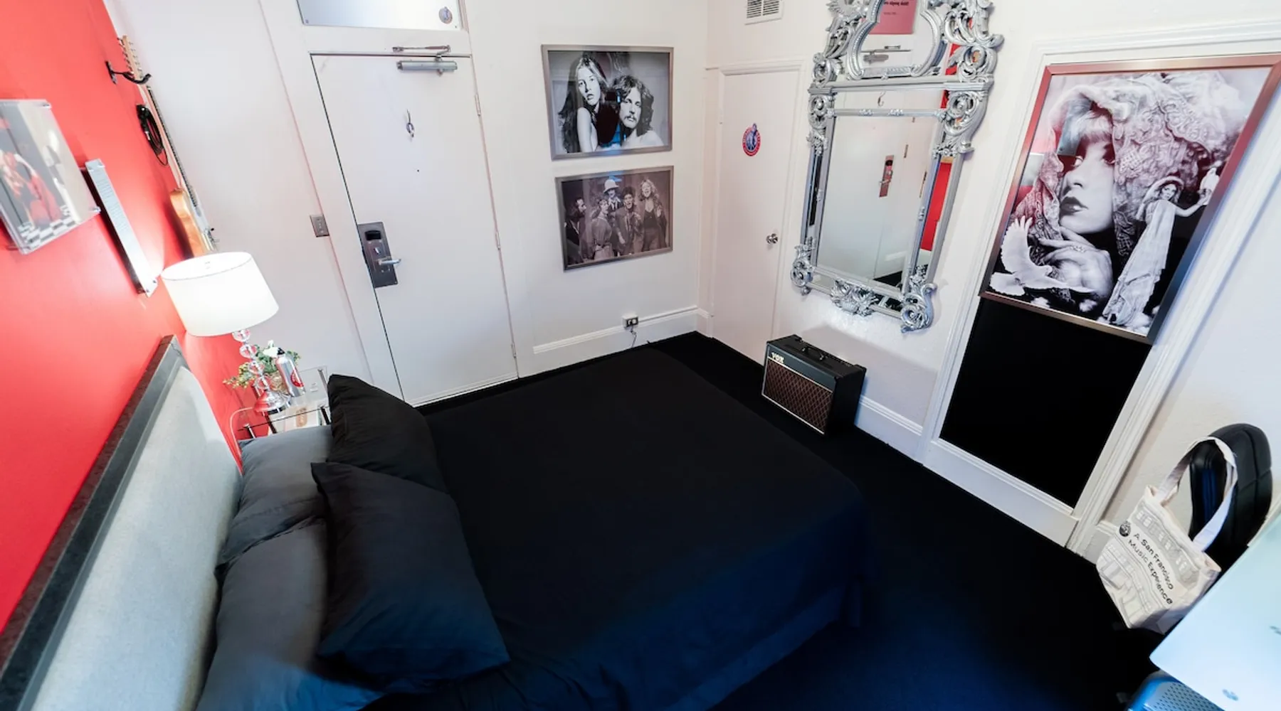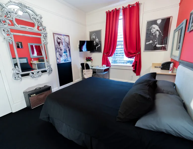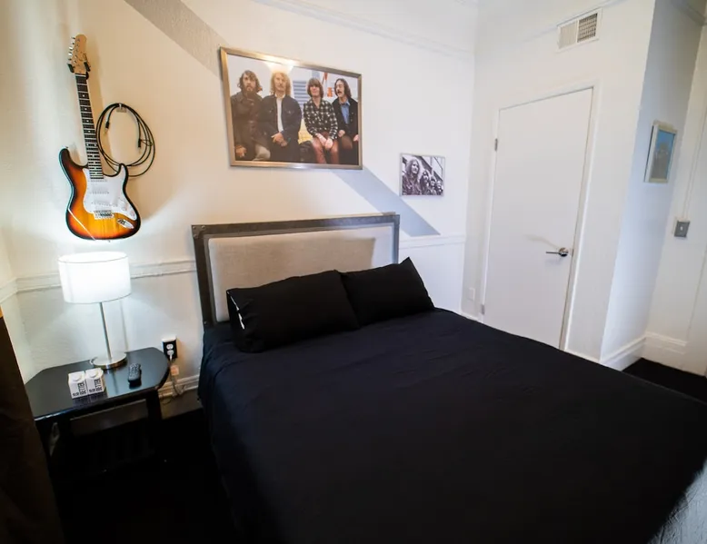 Private room with Queen size bed and shared restrooms/showers located down the hallway (each restroom is single occupancy). Room contains blown up photo, laser printed on metal, of an important Bay Area musician, as well as other images honoring local music. Free access to our Hall of Fame Gallery featuring SF music legends, and original tribute placards. Mini-fridge, sink, closet, TV with HBO inside room. Shampoo, conditioner, soap, and towels provided. The space Immerse yourself with San Francisco’s megastars surrounding you in a living incubator of up and coming artists. Sleep with the stars and walk in their footsteps while you stay inside the first and only San Francisco Music Hall of Fame. It might get loud! Dive into San Francisco’s ultimate music experience—whether it’s a weekend getaway or an extended adventure, immerse yourself in our vibrant community, explore your creative side with our Artist Development and DJ workshops, or simply soak in all the music and creative energy around you Meet fellow travelers and local musicians, jump into a karaoke session, book a jam room, or even host your own DIY party. With ongoing live-streamed performances it’s easy to make music, make memories, and become part of the Music City SF story. We are a bold entertainment company bringing artists and music lovers together to ignite the soul of local culture. At Music City SF, your stay supports independent local artists—it's more than accommodation; it's a movement! Access to the SF Hall of Fame is free for all guests of Music City Hotel and be experienced independently. An audio tour is also available - access points made available in multiple spots of the gallery. Free coffee/tea and fresh fruit are offered daily as well as free luggage storage and free high-speed WiFi. Guest access Room is private room with shared restroom. Restrooms/showers located in several locations down the hallway on each floor. Each restroom/shower is single occupancy. Property contains many common areas to hang out, relax, or do work. There is a Hotel guest specific common room with couches, TV, video and board games, amenity station with coffee/tea, fruit, and paper plates/cutlery. There is also plenty of working space within the main lobby area near the front desk. Other things to note Private rooms require a credit card in your name on file, which can be provided at check in time. If not credit card, a debit card will be acceptable along with a $250 refundable deposit on the debit card. IF YOU WILL BE ARRIVING AFTER 11PM, please contact us! We will need to make special arrangements for your check in since you'll be arriving when our Front Desk is closed. Thank you! Registration details Exempt