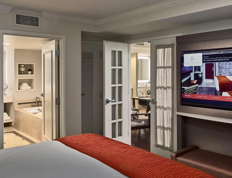 Located on the campus of Auburn University, this hotel offers an outdoor pool, a restaurant and a lounge with live jazz music on the weekends. Every room features a 32-inch flat-screen cable TV. A microwave, fridge, and coffee-making facilities are provided in The Hotel at Auburn University's contemporary rooms. They have free WiFi and MP3 player plug-ins. The bathroom includes a rainfall shower and robes. Auburn University Hotel guests can enjoy a daily breakfast buffet. Ariccia Cucina serves seasonal Italian specialties and offers a terrace. Piccolo serves appetizers, desserts and specialty cocktails. The Jule Collins Smith Museum of Fine Art is just 1 mi from Hotel Auburn University. Auburn Links at Mill Creek is 6.4 miles away. This room offers a 32-inch flat-screen cable TV, a microwave and fridge. The bathroom provides a rainfall shower and robes.