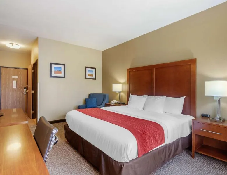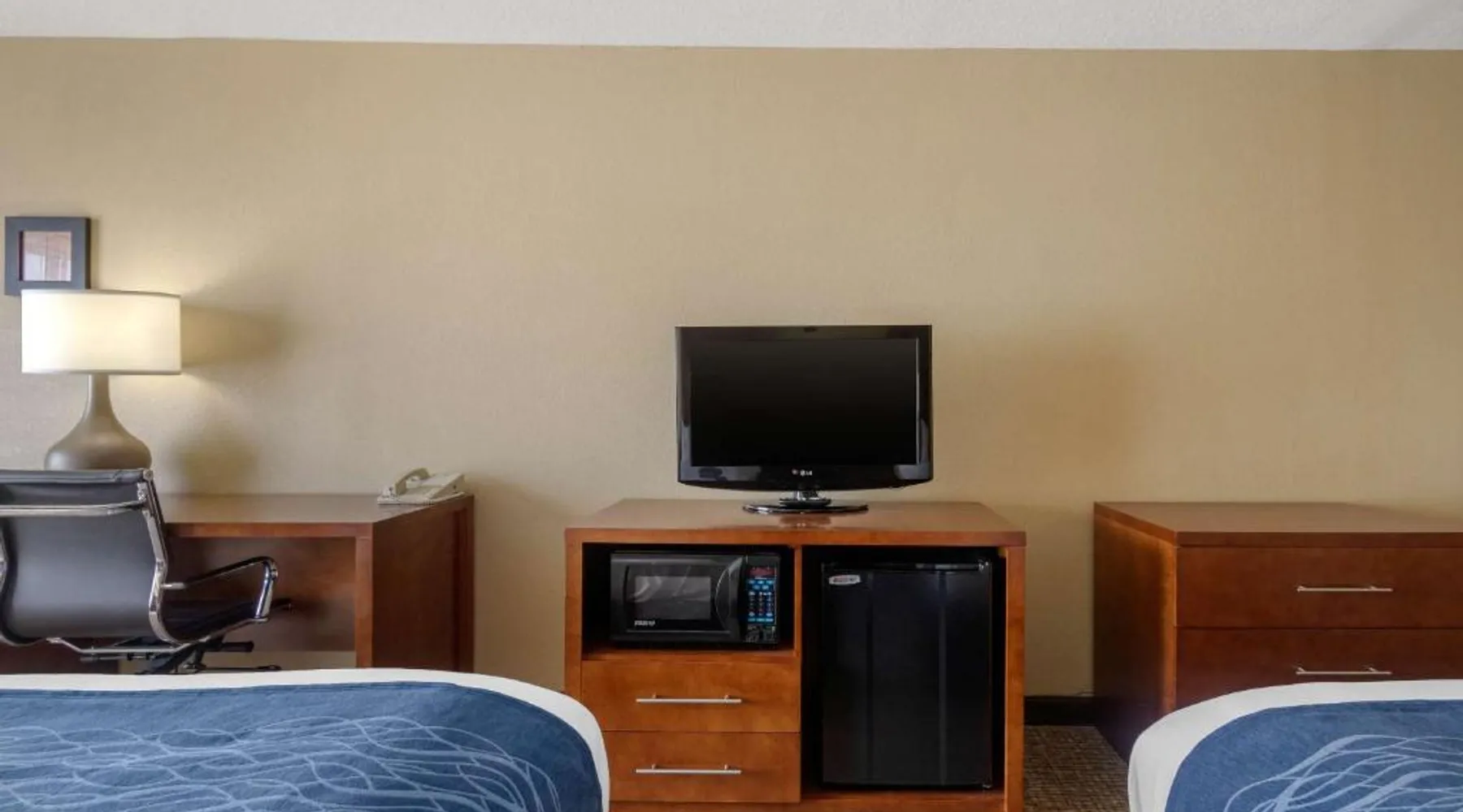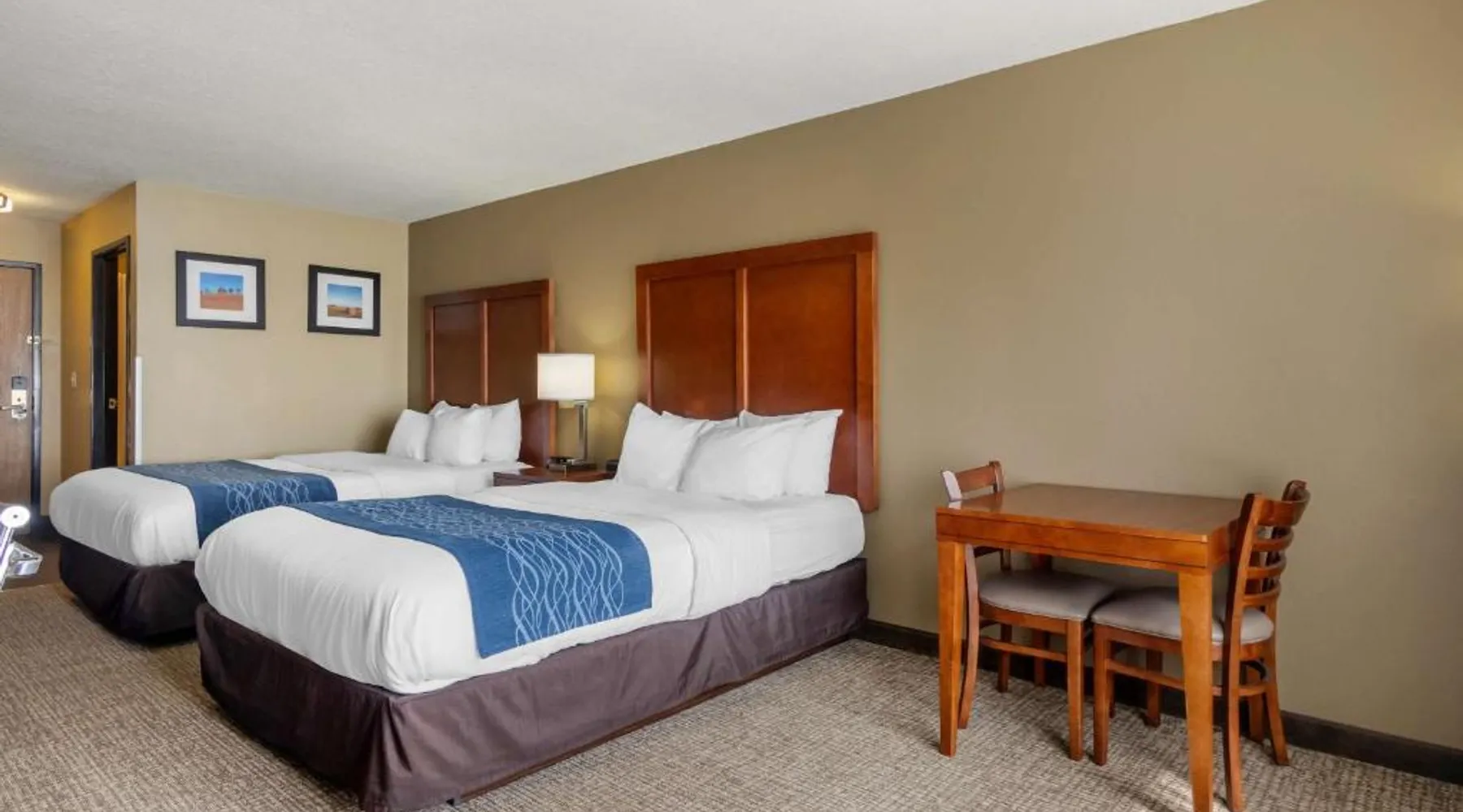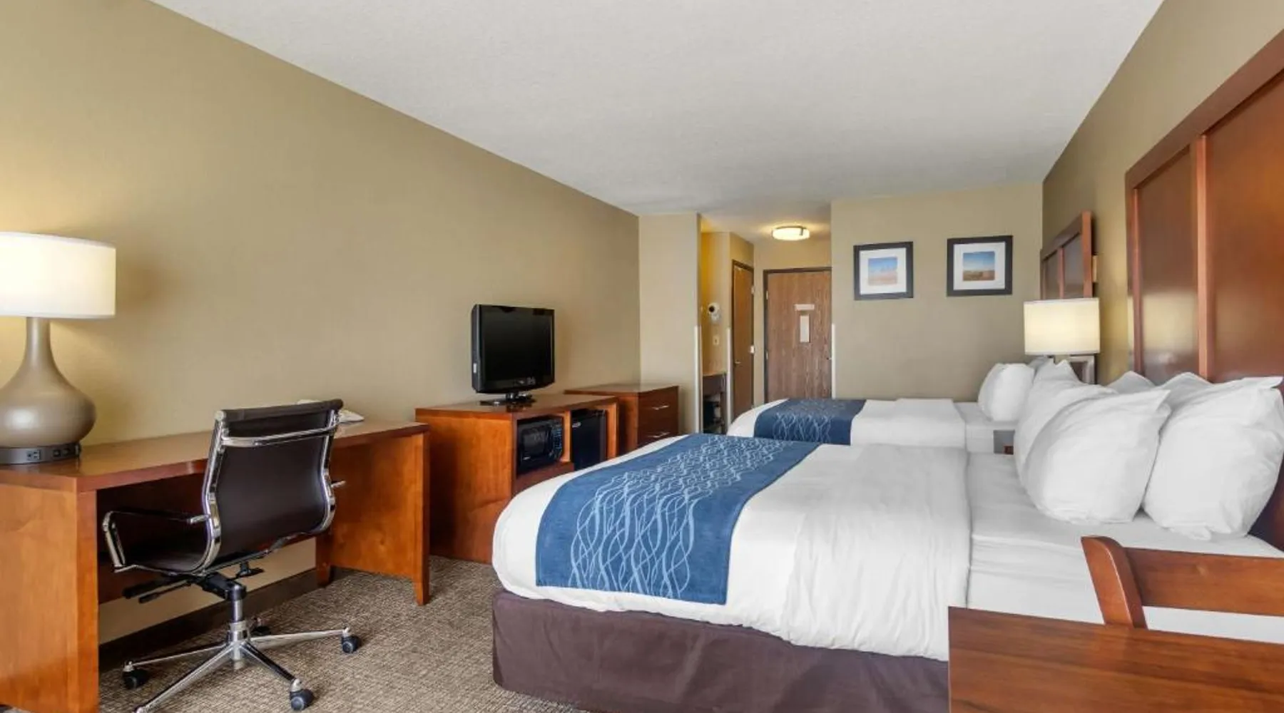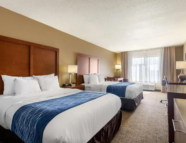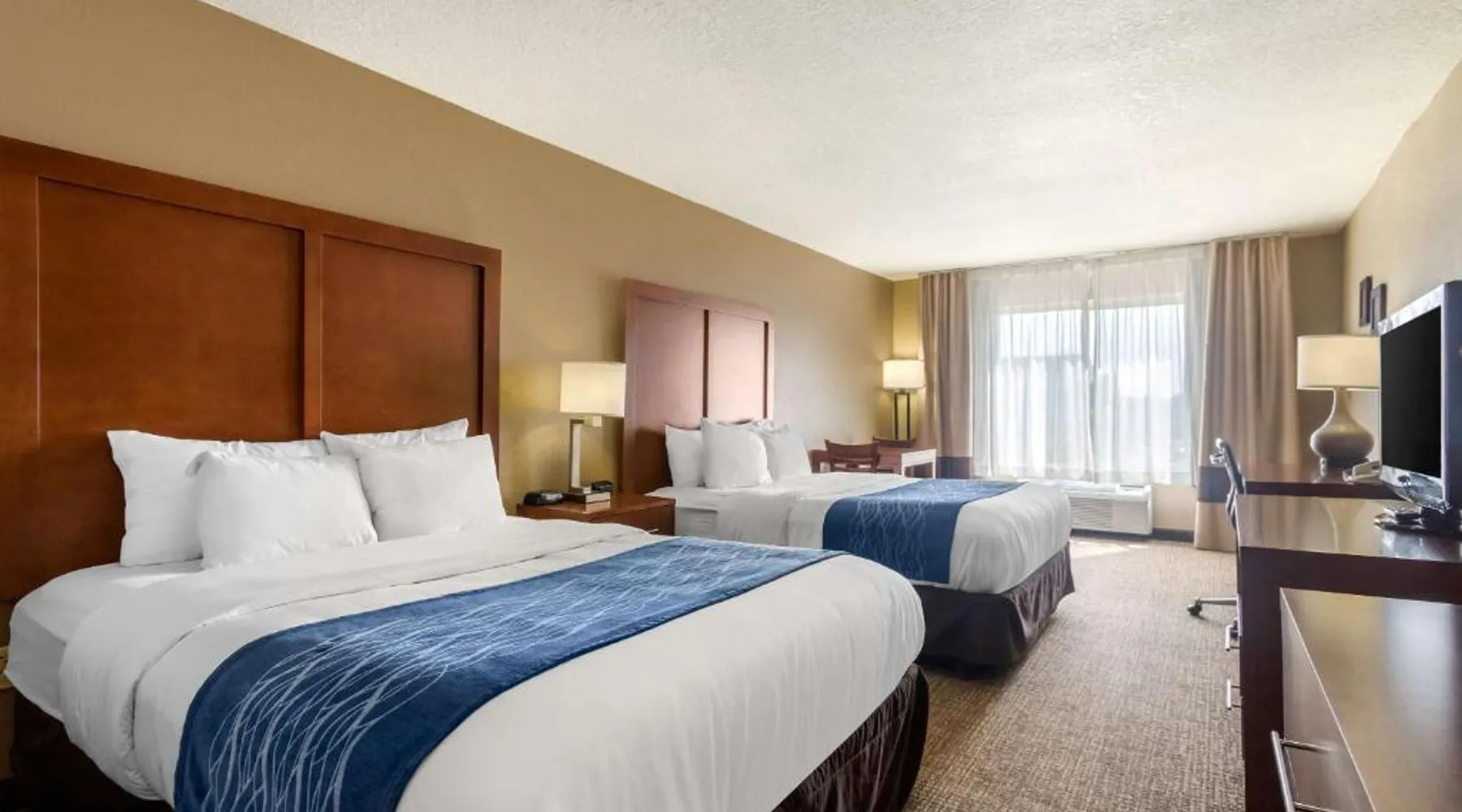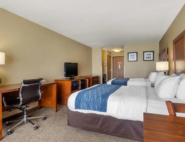 Comfort Inn & Suites Pittsburg KS hotel is located near Four Oaks Golf Course and Pittsburg State University. This Pittsburg, KS hotel is minutes from Fort Scott National Historic Site, the Big Brutus, the Museum of Crawford County and Bone Creek Reservoir. The Pittsburg Memorial Auditorium and Convention Center and Mined Land Wildlife Area are close to the hotel. Several shopping areas are minutes away. A variety of restaurants and cocktail lounges are located in the surrounding area. The city of Pittsburg offers many art and entertainment opportunities for visitors. Each year, the community gathers for special events such as the Fourth of July celebration and Little Balkans Days festival in September. Hotel amenities and features include free wireless high-speed Internet access in all rooms, free local calls and free coffee. Free hot breakfast is also provided. There is also an on-site exercise room. Business travelers can use the business center, access to copy and fax services, desks and voice mail. All guest rooms have hair dryers, coffee makers, irons, ironing boards and cable television. Some rooms come equipped with refrigerators and microwaves. Laundry facility is located on the property for added guest convenience. This is a nonsmoking hotel. Air conditioning, a carpeted floor and heating are provided in this family room. The unit offers 2 beds.