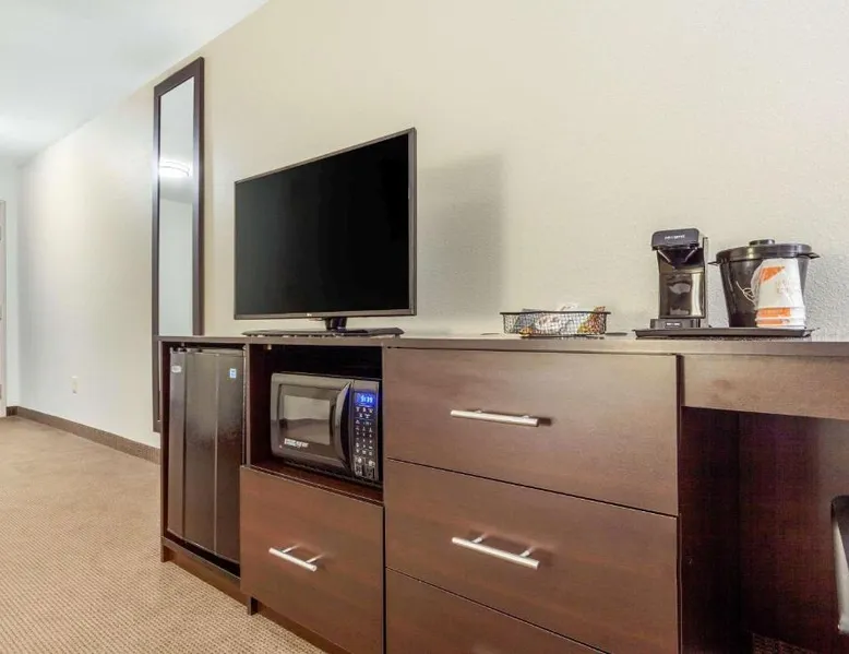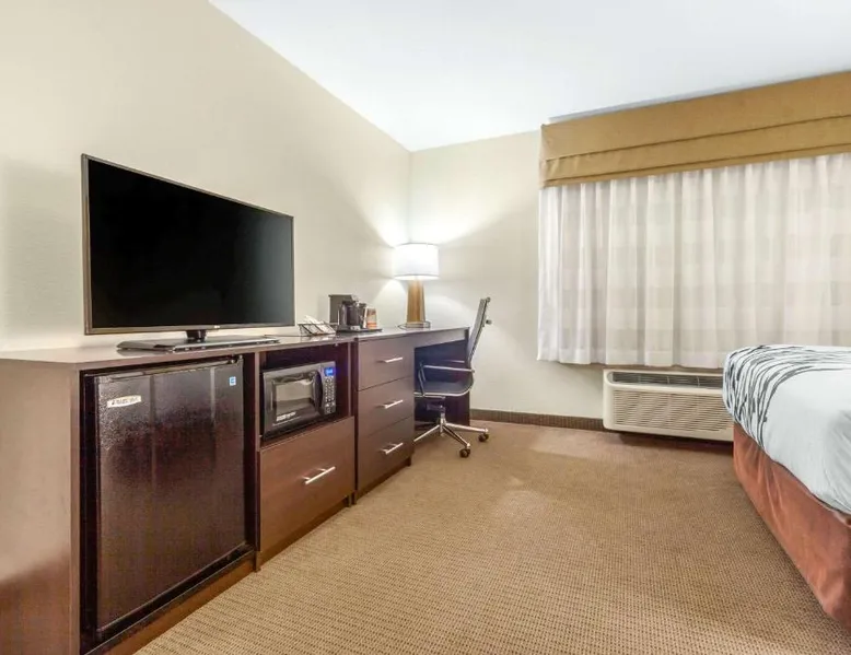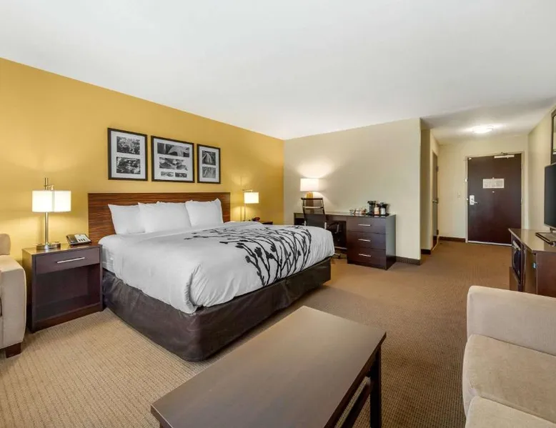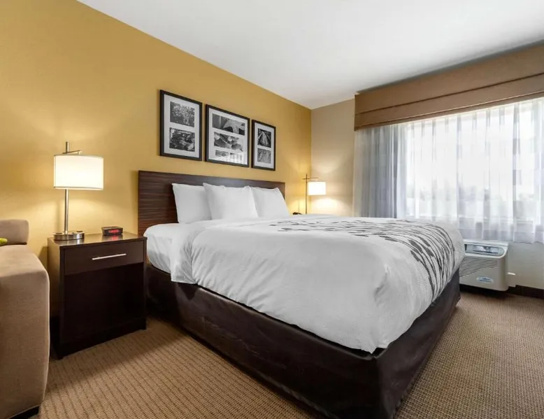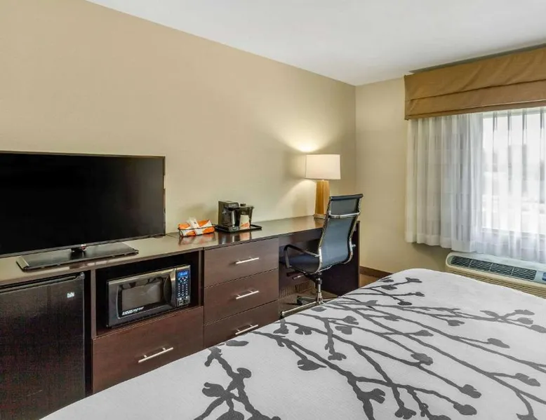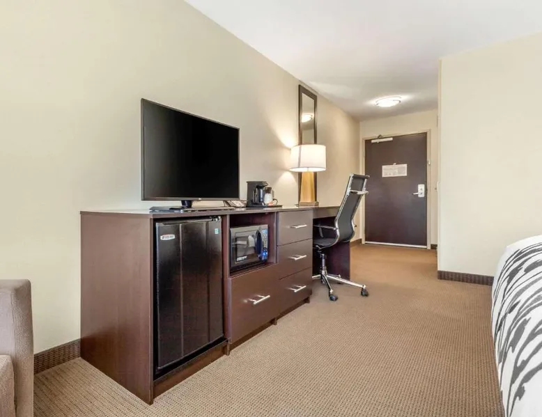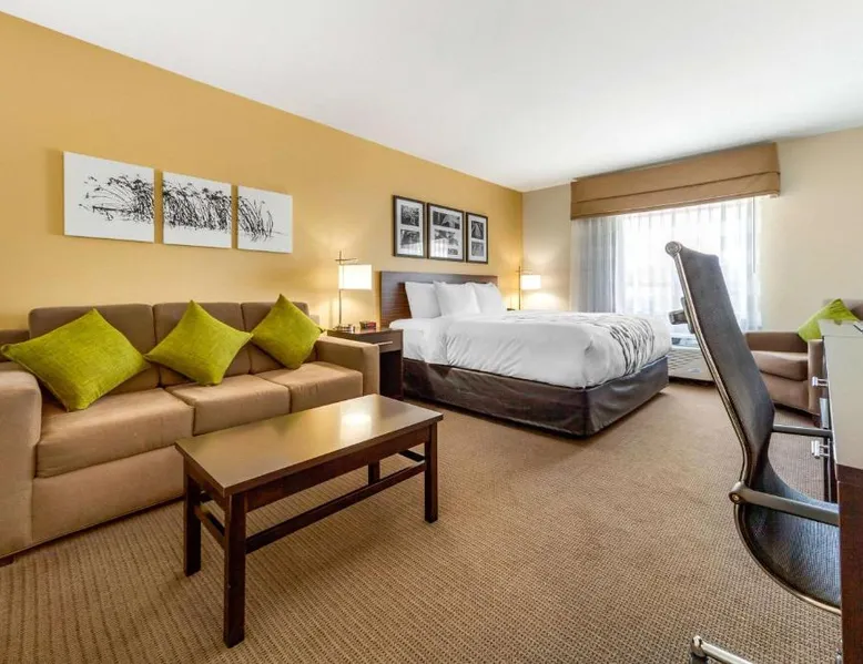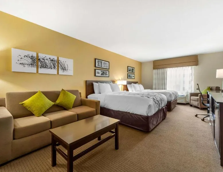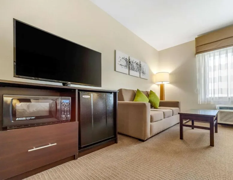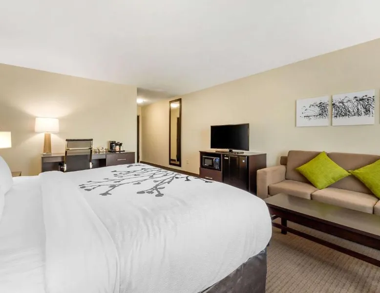 Comfortable Accommodations: Sleep Inn & Suites Lincoln University Area in Lincoln offers comfortable rooms with private bathrooms, tea and coffee makers, and free WiFi. Each room includes a work desk, refrigerator, microwave, and TV. Relaxing Facilities: Guests can enjoy a spa and wellness center, indoor swimming pool, and hot tub. Additional amenities include a elevator, 24-hour front desk, minimarket, and business area. Convenient Location: Located 8.1 mi from Lincoln Airport, the hotel is near attractions such as Lincoln Memorial Stadium (4.3 mi), University of Nebraska State Museum (2.5 mi), and Pinnacle Bank Arena (4.3 mi). Free on-site parking is available. Guest Satisfaction: Highly rated for its attentive staff, excellent breakfast, and immaculate rooms. This suite has a tea and coffee maker, a seating area and a flat-screen TV with cable channels.