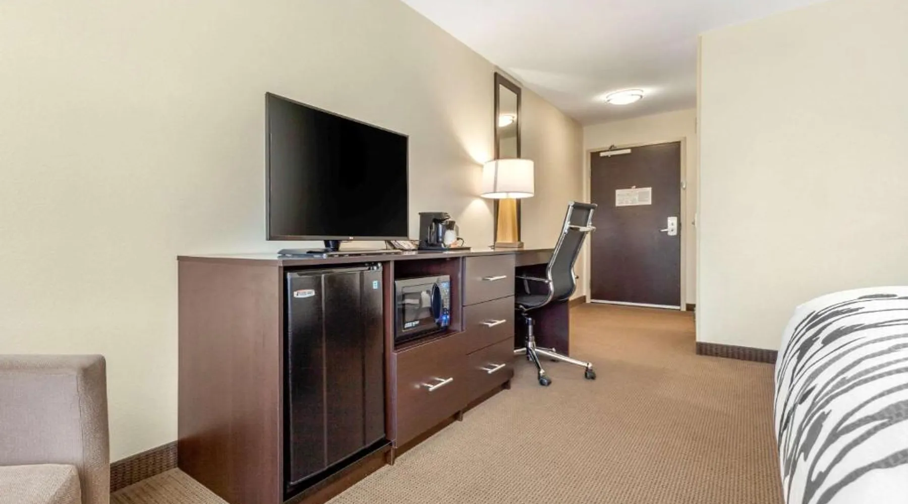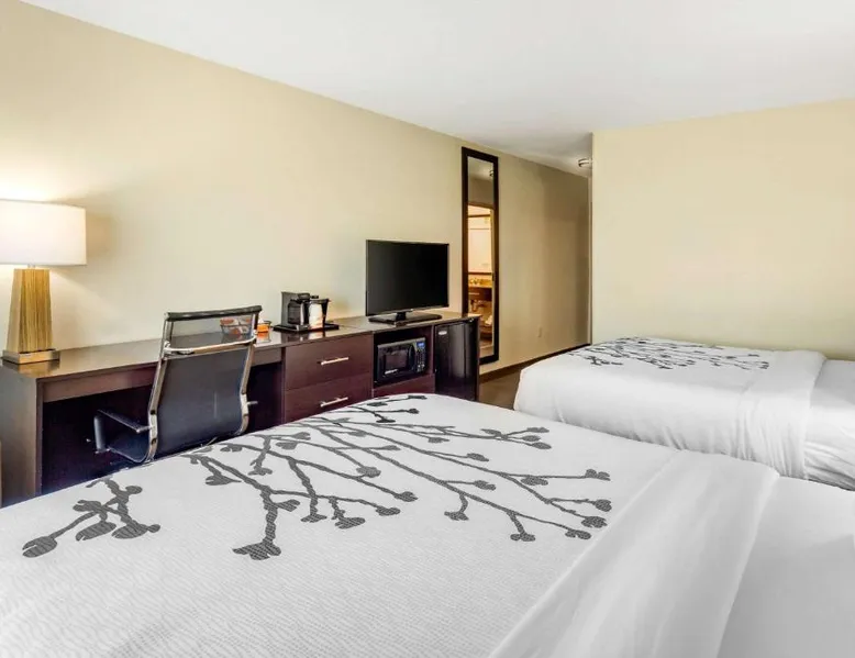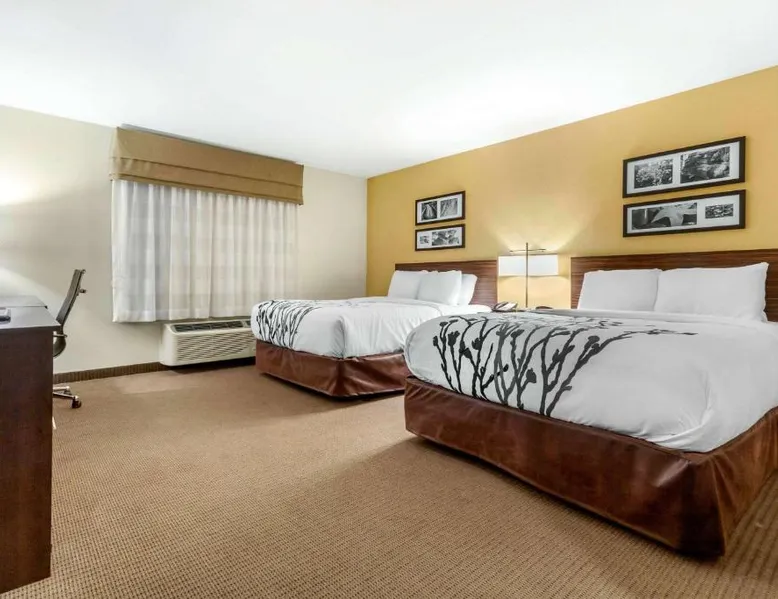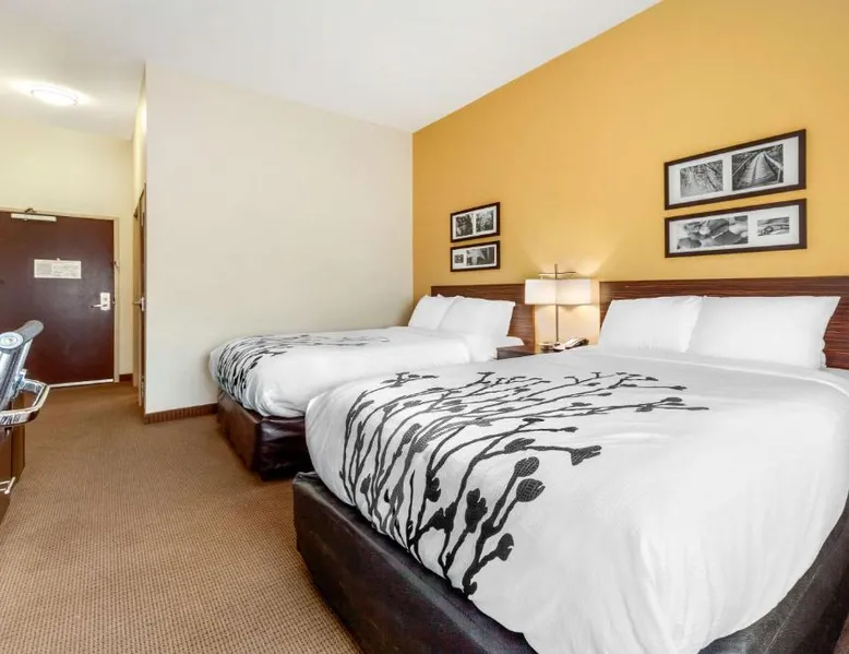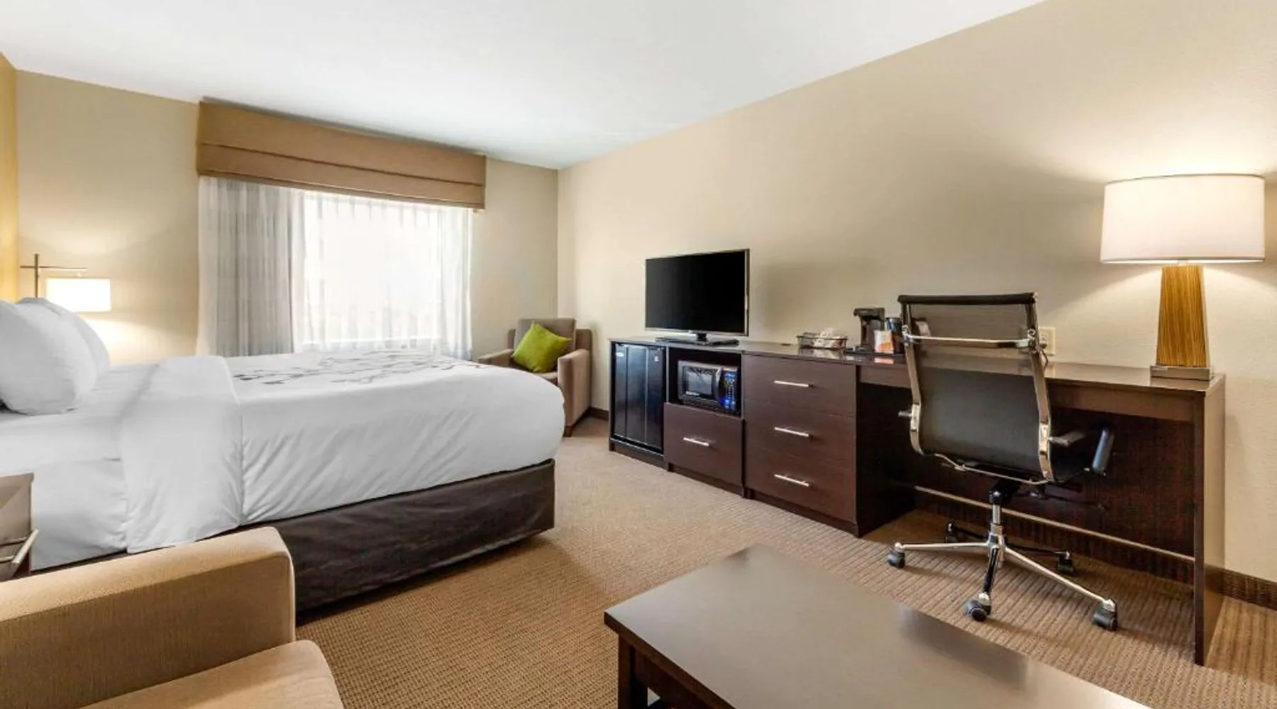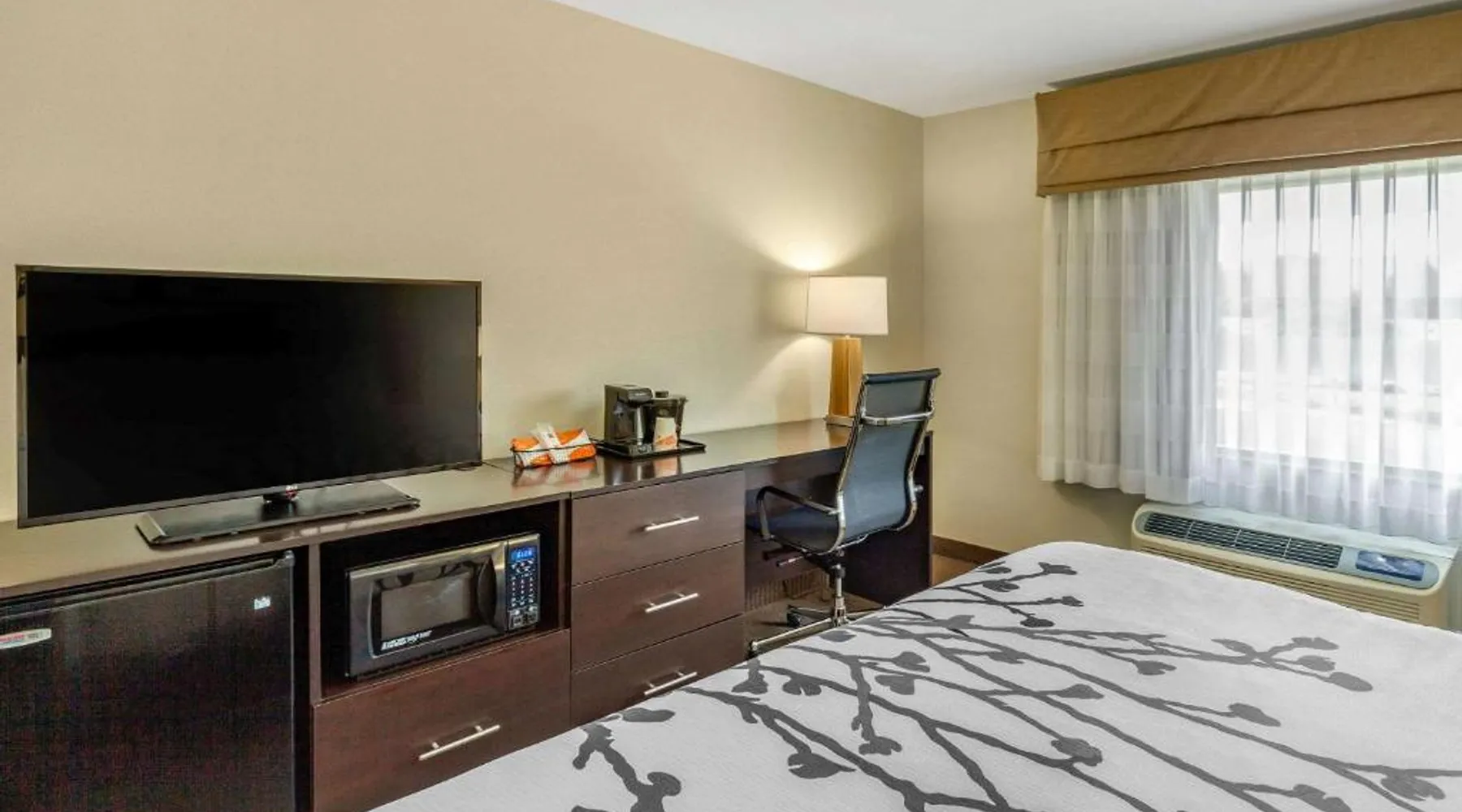 Comfortable Accommodations: Sleep Inn & Suites Lincoln University Area in Lincoln offers comfortable rooms with private bathrooms, tea and coffee makers, and free WiFi. Each room includes a work desk, refrigerator, microwave, and TV. Relaxing Facilities: Guests can enjoy a spa and wellness center, indoor swimming pool, and hot tub. Additional amenities include a elevator, 24-hour front desk, minimarket, and business area. Convenient Location: Located 8.1 mi from Lincoln Airport, the hotel is near attractions such as Lincoln Memorial Stadium (4.3 mi), University of Nebraska State Museum (2.5 mi), and Pinnacle Bank Arena (4.3 mi). Free on-site parking is available. Guest Satisfaction: Highly rated for its attentive staff, excellent breakfast, and immaculate rooms. This suite has a tea and coffee maker, a seating area and a flat-screen TV with cable channels.
