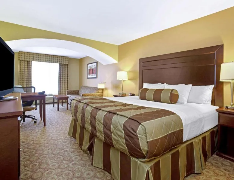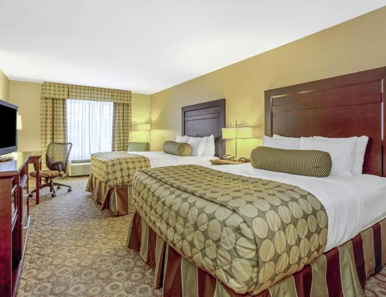 Comfortable Accommodations: La Quinta by Wyndham Dickinson in Dickinson offers adults-only rooms with air-conditioning, private bathrooms, and modern amenities. Each room includes a tea and coffee maker, hairdryer, refrigerator, work desk, free toiletries, microwave, and TV. Leisure Facilities: Guests can enjoy a fitness center, indoor swimming pool, and free WiFi. Additional facilities include a hot tub, bath, sofa bed, walk-in shower, and carpeted floors. Convenient Services: The hotel provides a 24-hour front desk, daily housekeeping, business area, barbecue facilities, and free on-site parking. A continental breakfast is available each morning. Location and Access: Located 6.8 mi from Dickinson Theodore Roosevelt Regional Airport, the hotel offers easy access to local attractions. Offering free toiletries, this triple room includes a private bathroom with a walk-in shower, a bath and a hairdryer. This triple room is air-conditioned and features a flat-screen TV with cable channels, a tea and coffee maker, a wardrobe and tumble dryer.