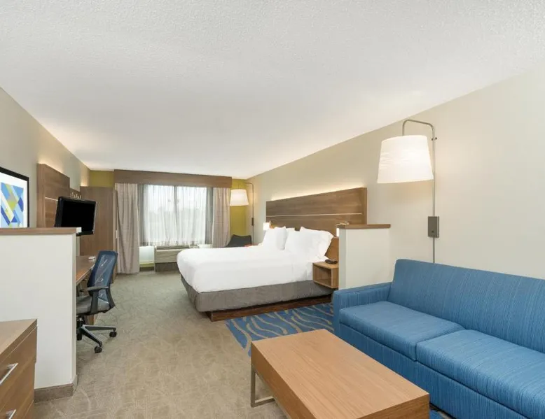 Comfortable Accommodations: Holiday Inn Express Hotel & Suites Frankfort by IHG in Frankfort offers comfortable rooms with air-conditioning, private bathrooms, tea and coffee makers, hairdryers, refrigerators, free toiletries, microwaves, showers, and TVs. Exceptional Facilities: Guests enjoy an indoor swimming pool and free WiFi. The hotel provides a 24-hour front desk, daily housekeeping service, and free on-site parking. Convenient Location: Located 21 mi from Blue Grass Airport, the hotel is near attractions such as Keeneland Race Course (24 mi), Rupp Arena (29 mi), and Lexington Convention Center (29 mi). Guest Satisfaction: Highly rated for its convenient location, breakfast provided by the property, and room comfort. This room features a flat-screen TV, microwave, and refrigerator.