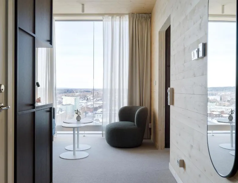 Comfortable Accommodations: The Wood Hotel by Elite in Skellefteå offers family rooms with mountain or garden views. Each room includes air-conditioning, a private bathroom, and modern amenities. Exceptional Facilities: Guests can enjoy spa facilities, a fitness center, restaurant, bar, and free WiFi. Additional services include beauty treatments, a steam room, and wellness packages. Dining Experience: The hotel serves Italian, local, and Asian cuisines with vegetarian, vegan, and gluten-free options. Breakfast is a buffet, and meals are available for brunch, lunch, and dinner. Prime Location: Located 11 mi from Skellefteå Airport, the hotel is less than 0.6 mi from Västerbotten Theater and 3.7 mi from Skellefteå Golf Course. Guests appreciate the scenic views and excellent location. Featuring free toiletries, this twin room includes a private bathroom with a walk-in shower and a hairdryer. The air-conditioned twin room features a flat-screen TV with streaming services, a private entrance, a mini-bar, a wardrobe as well as mountain views. The unit has 2 beds.