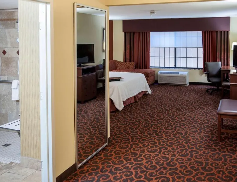 Comfortable Accommodations: Hampton Inn & Suites Watertown in Watertown offers family rooms with air-conditioning, free WiFi, and amenities such as a tea and coffee maker, refrigerator, and TV. Each room includes a bath, sofa bed, and seating area. Leisure Facilities: Guests can enjoy a fitness center, indoor swimming pool, and hot tub. Additional facilities include a lounge, fitness room, elevator, minimarket, and child-friendly buffet. Free on-site parking is available. Dining Experience: A complimentary American buffet breakfast is served daily, featuring warm dishes, fresh pastries, cheese, and fruits. The property also offers a business area and 24-hour front desk. Location and Services: Located 4.3 mi from Watertown Regional Airport, the hotel provides free WiFi, a fitness center, and an indoor swimming pool. Guests appreciate the breakfast, room cleanliness, and attentive staff. Studio features a microwave, a refrigerator and a seating area with a sofa bed.