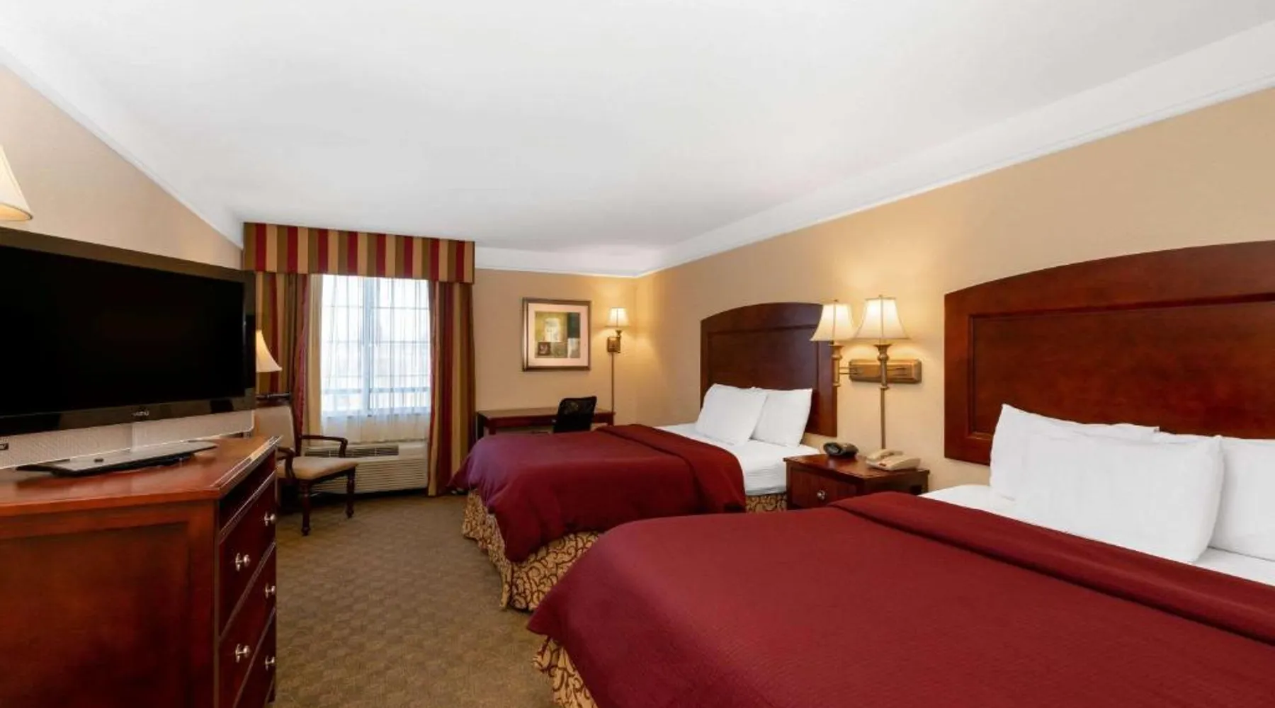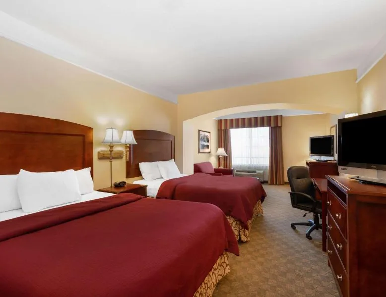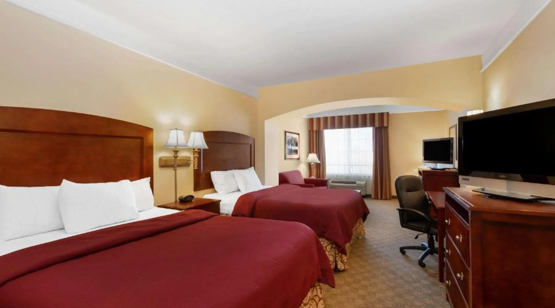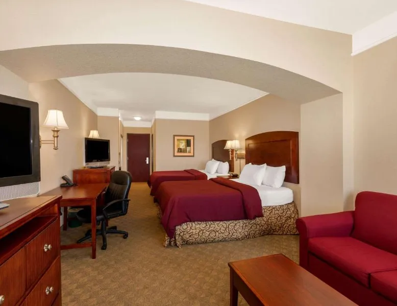 Comfortable Accommodations: La Quinta by Wyndham Dodge City in Dodge City offers family rooms with air-conditioning, private bathrooms, and free WiFi. Each room includes a work desk, TV, and free toiletries. Convenient Facilities: Guests enjoy a public bath, elevator, 24-hour front desk, business area, coffee shop, outdoor seating, picnic area, and luggage storage. Free on-site parking is available. Delicious Breakfast: A continental buffet breakfast with juice, fresh pastries, and fruits is served daily. Guests appreciate the quality and variety. Prime Location: Located 5.6 mi from Dodge City Regional Airport, the hotel is near attractions such as Boot Hill Museum and Fort Dodge. This air-conditioned quadruple room is consisted of of a flat-screen TV with cable channels and a private bathroom. The unit has 2 beds.