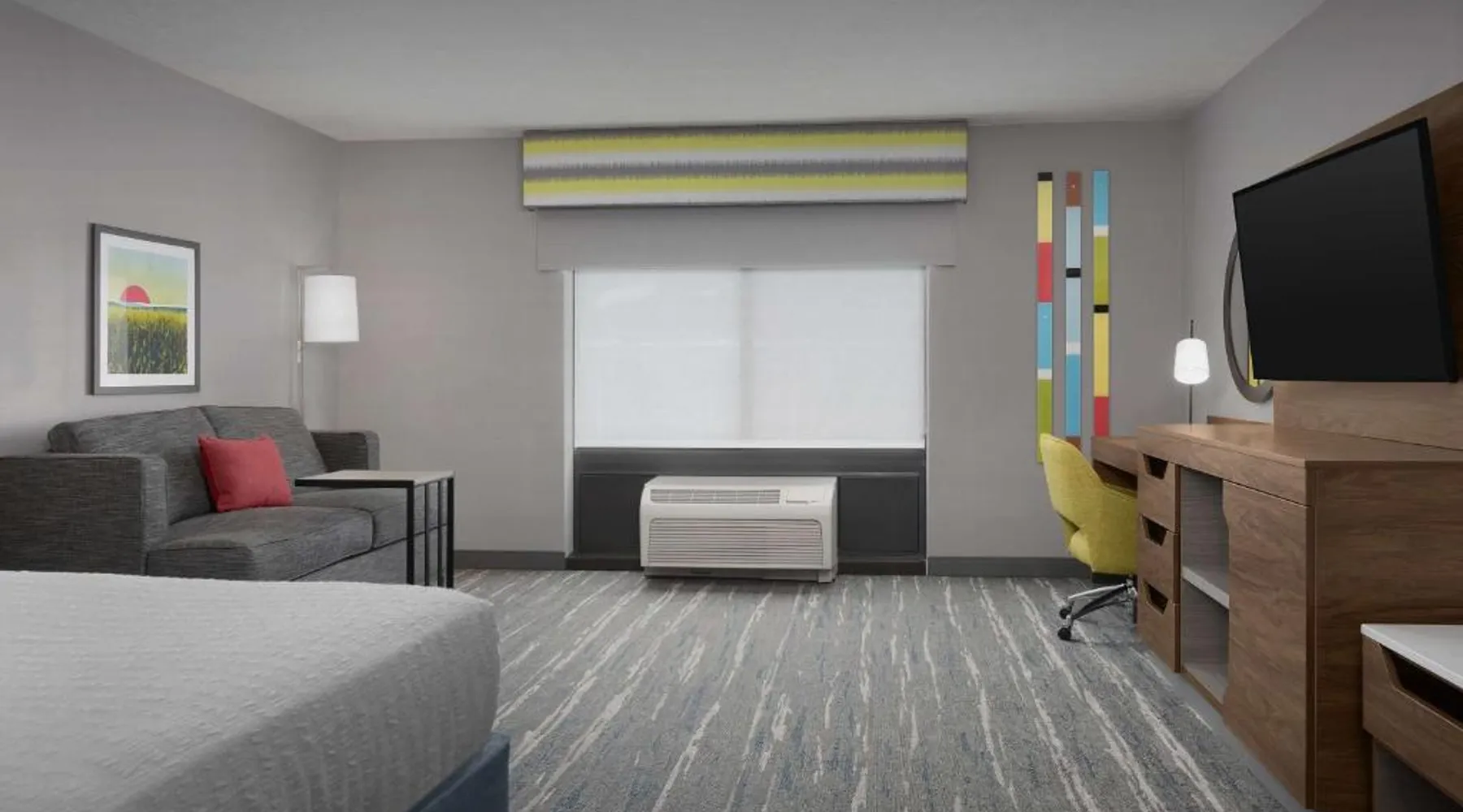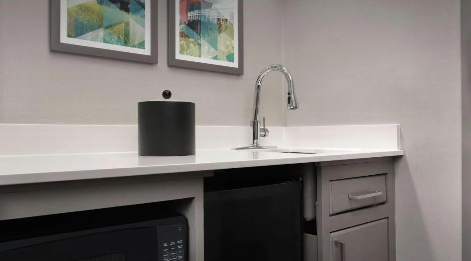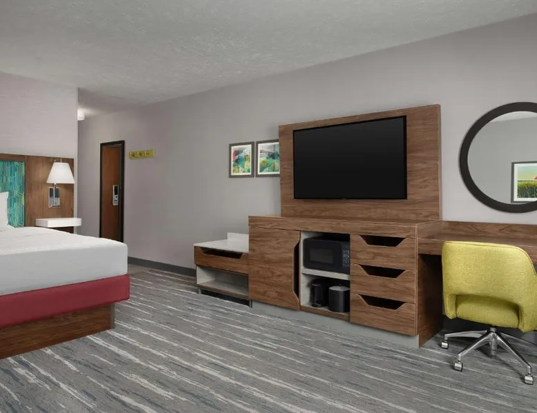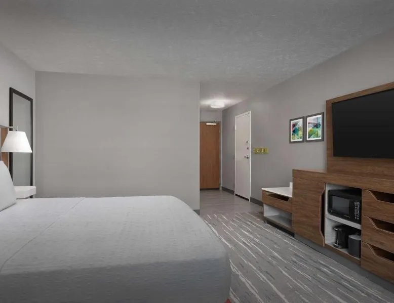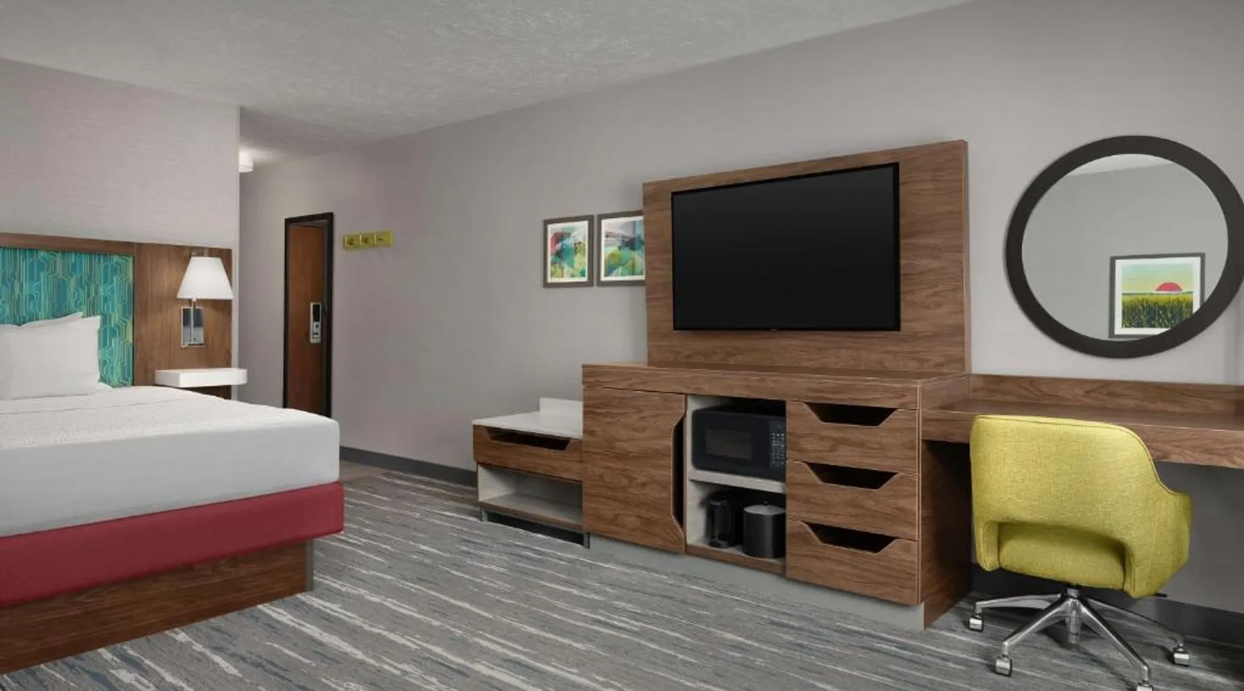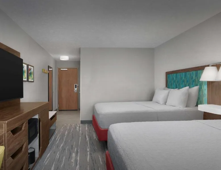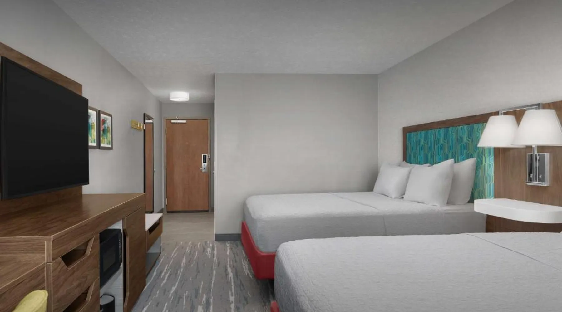 Comfortable Accommodations: Hampton Inn Waterloo in Waterloo offers rooms with free WiFi, air-conditioning, and modern amenities. Guests appreciate the room cleanliness and comfort. Facilities and Services: The hotel features a fitness room, elevator, 24-hour front desk, minimarket, daily housekeeping, electric vehicle charging, and luggage storage. Free on-site parking is available. Breakfast and Dining: A continental buffet breakfast with warm dishes, fresh pastries, cheese, and fruits is served daily. Additional amenities include a sofa bed, free toiletries, shower, and TV. Location and Attractions: Located 7.5 mi from Waterloo Regional Airport and 9.3 mi from Gallagher Bluedorn Performing Arts Center. Guests enjoy easy access to local attractions. This room features WiFi, a 55-inch flat-screen TV, a microwave and a small refrigerator. A desk is provided as well.
