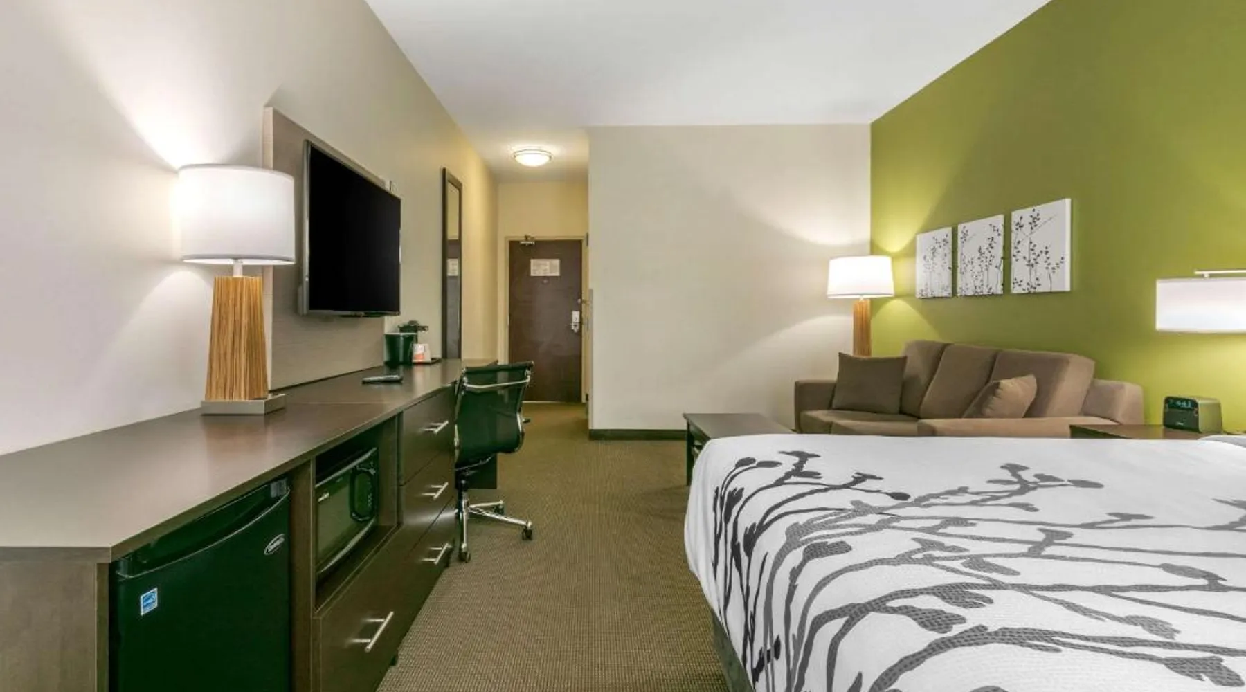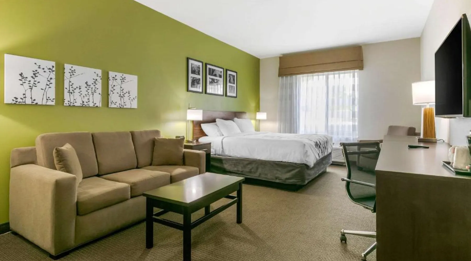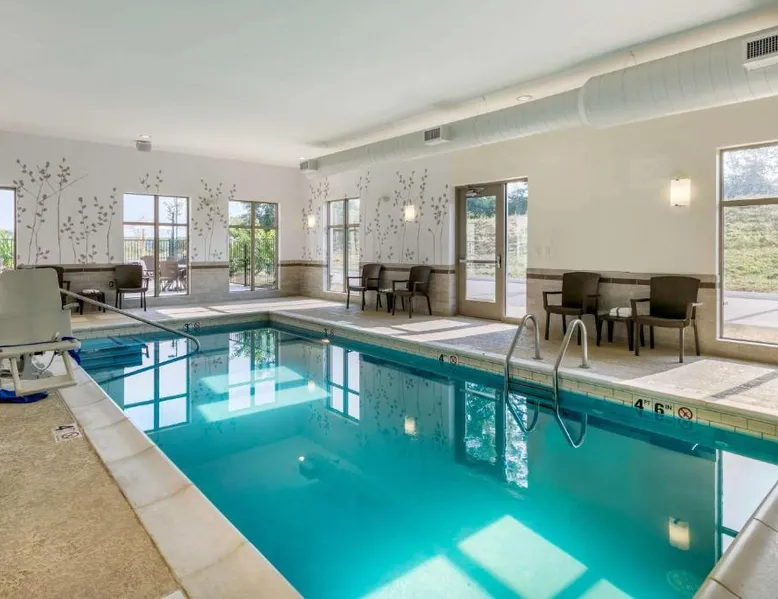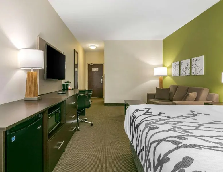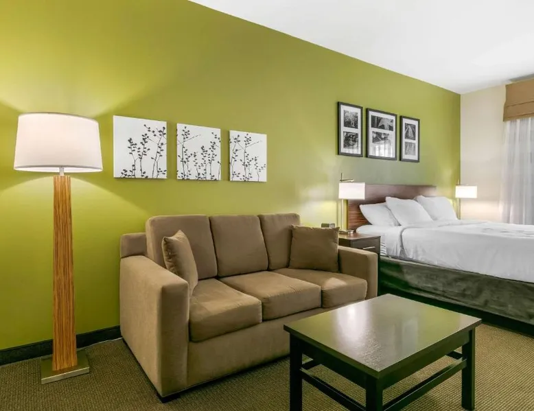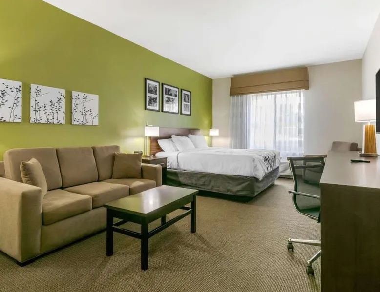 Comfortable Accommodations: Sleep Inn & Suites Columbia I-65 in Columbia offers comfortable rooms with free WiFi, air-conditioning, and modern amenities. Guests appreciate the bed comfort and attentive staff. Facilities and Services: The hotel features a fitness center, indoor swimming pool, and a elevator. Additional services include a 24-hour front desk, daily housekeeping, business area, outdoor seating, and express check-in and check-out. Local Attractions: Located 37 mi from Nashville International Airport, the hotel is near James K Polk House (9.3 mi), Elm Springs (12 mi), Chickasaw Trace Park (12 mi), Carnton and Winstead Hill Park (21 mi), and Lotz House Museum (23 mi). The suite is furnished with a desk and a seating area.