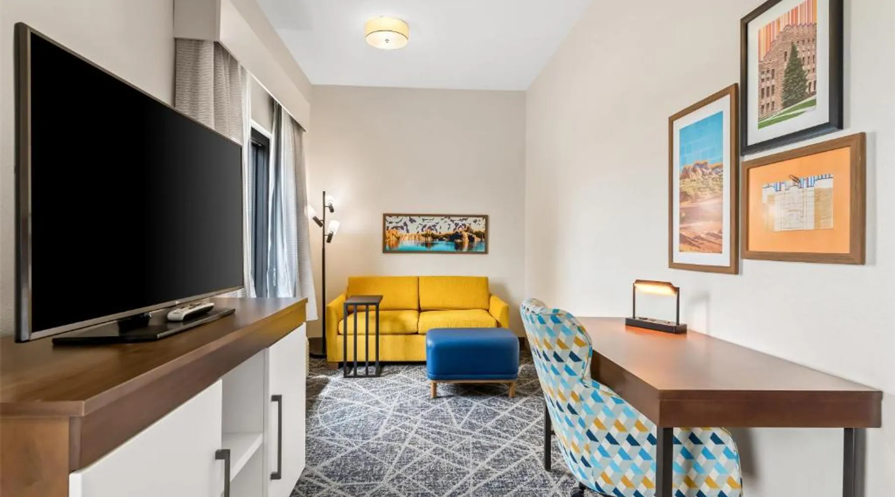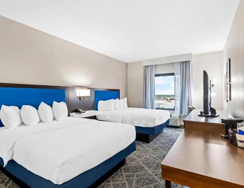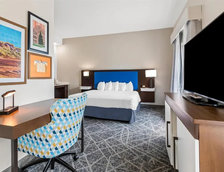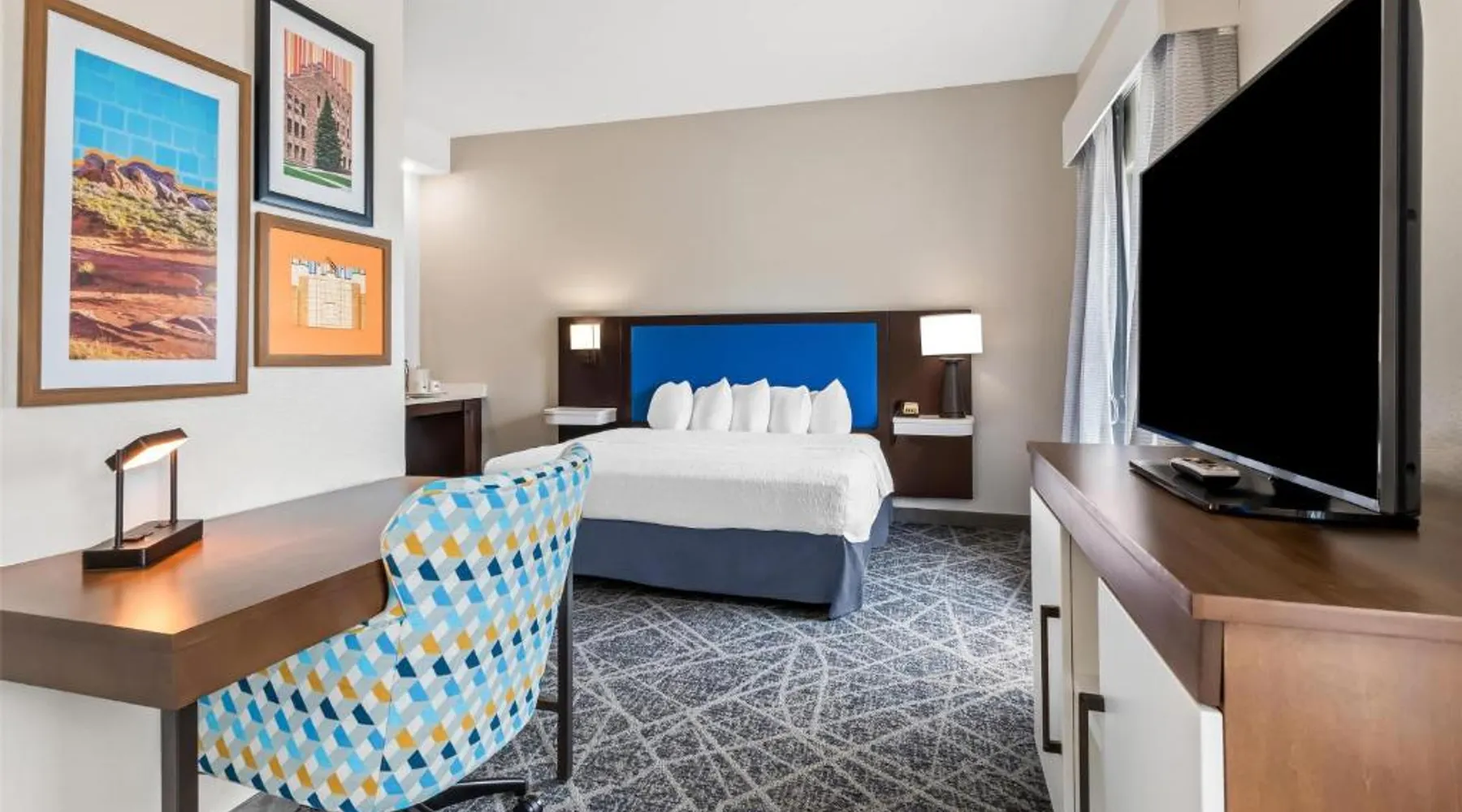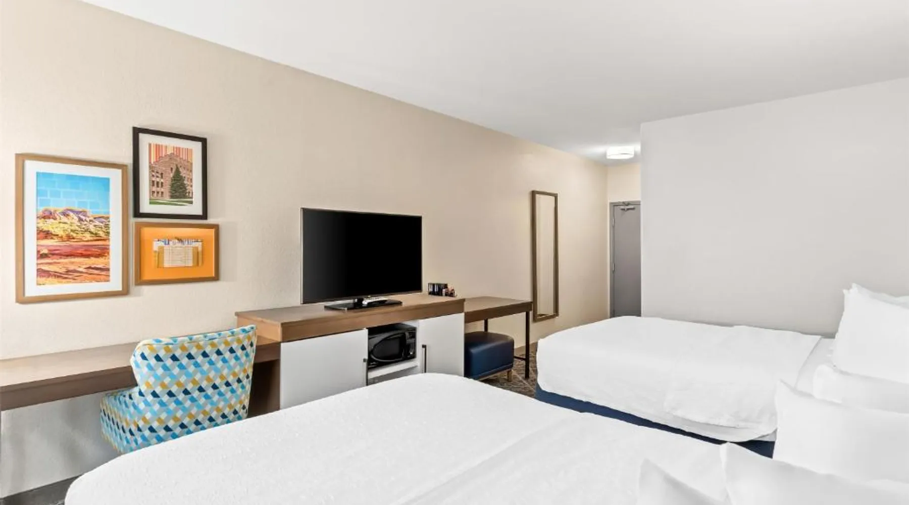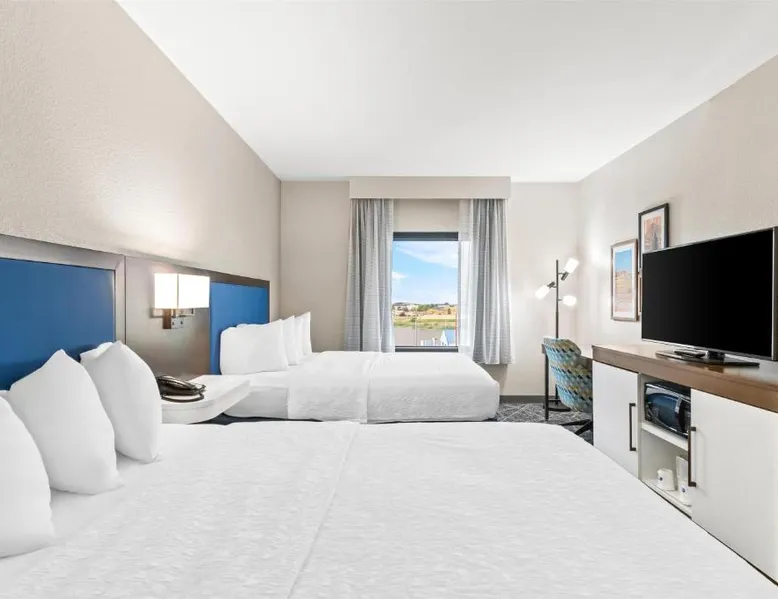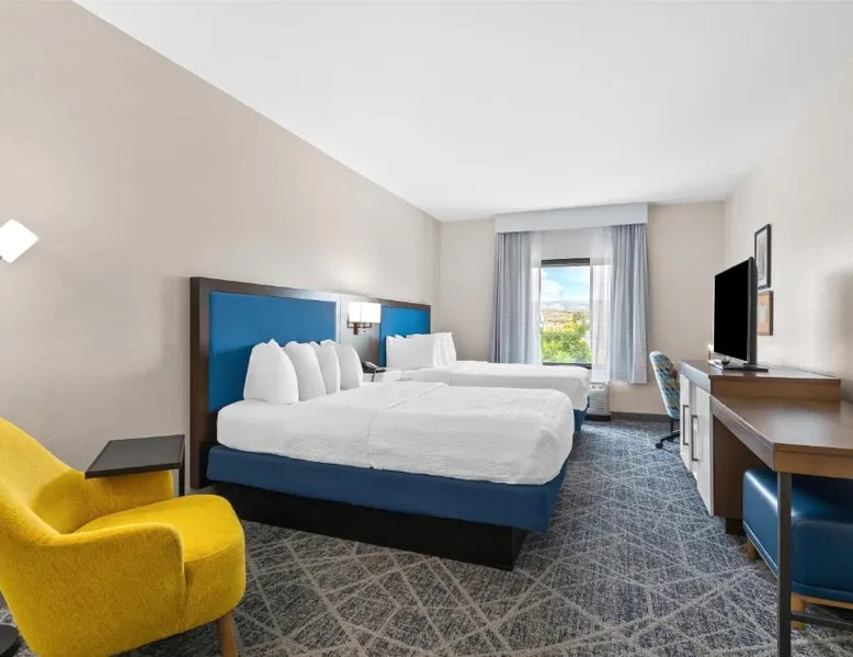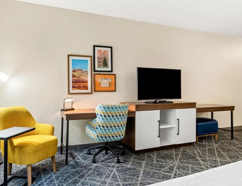 Comfortable Accommodations: Hampton Inn Laramie in Laramie offers family rooms with free WiFi, air-conditioning, and modern amenities. Each room includes a tea and coffee maker, hairdryer, refrigerator, microwave, shower, and TV. Leisure Facilities: Guests can enjoy an indoor swimming pool, fitness center, and hot tub. The property features a fitness room, elevator, outdoor seating area, and a minimarket. Free on-site parking is available. Convenient Location: Located 9.3 mi from Laramie Regional Airport and 1.2 mi from War Memorial Stadium, the hotel is near an ice-skating rink. The surrounding area offers various attractions. Guest Services: The hotel provides a 24-hour front desk, daily housekeeping, room service, and a daily breakfast. Guests appreciate the attentive staff, room cleanliness, and the quality of the breakfast provided by the property. This room features a flat-screen TV, a work desk and tea and coffee-making facilities.