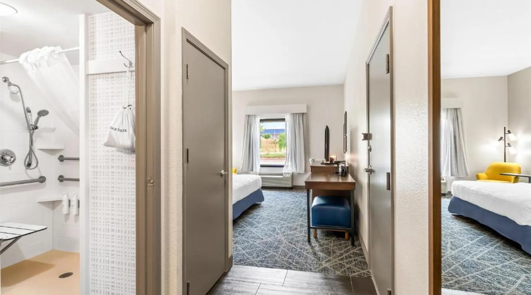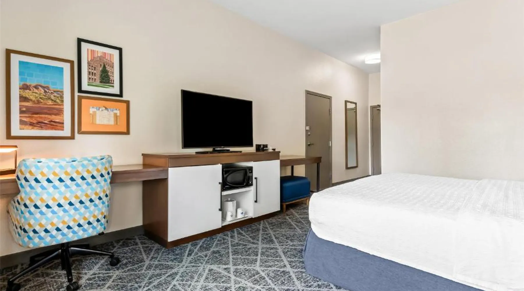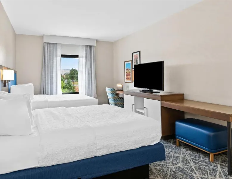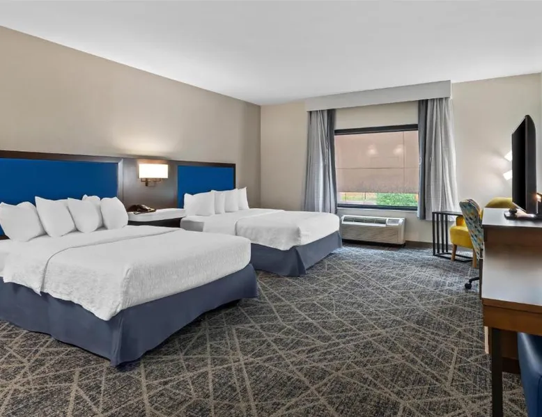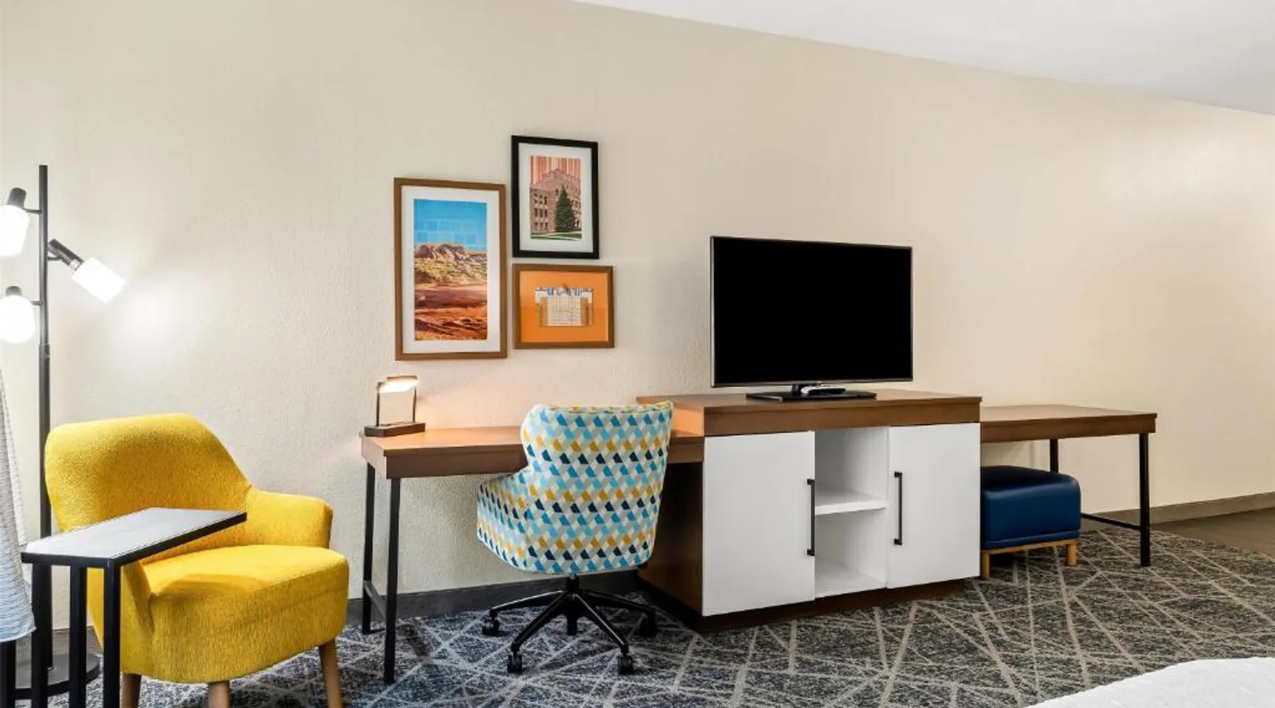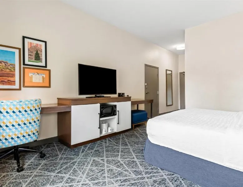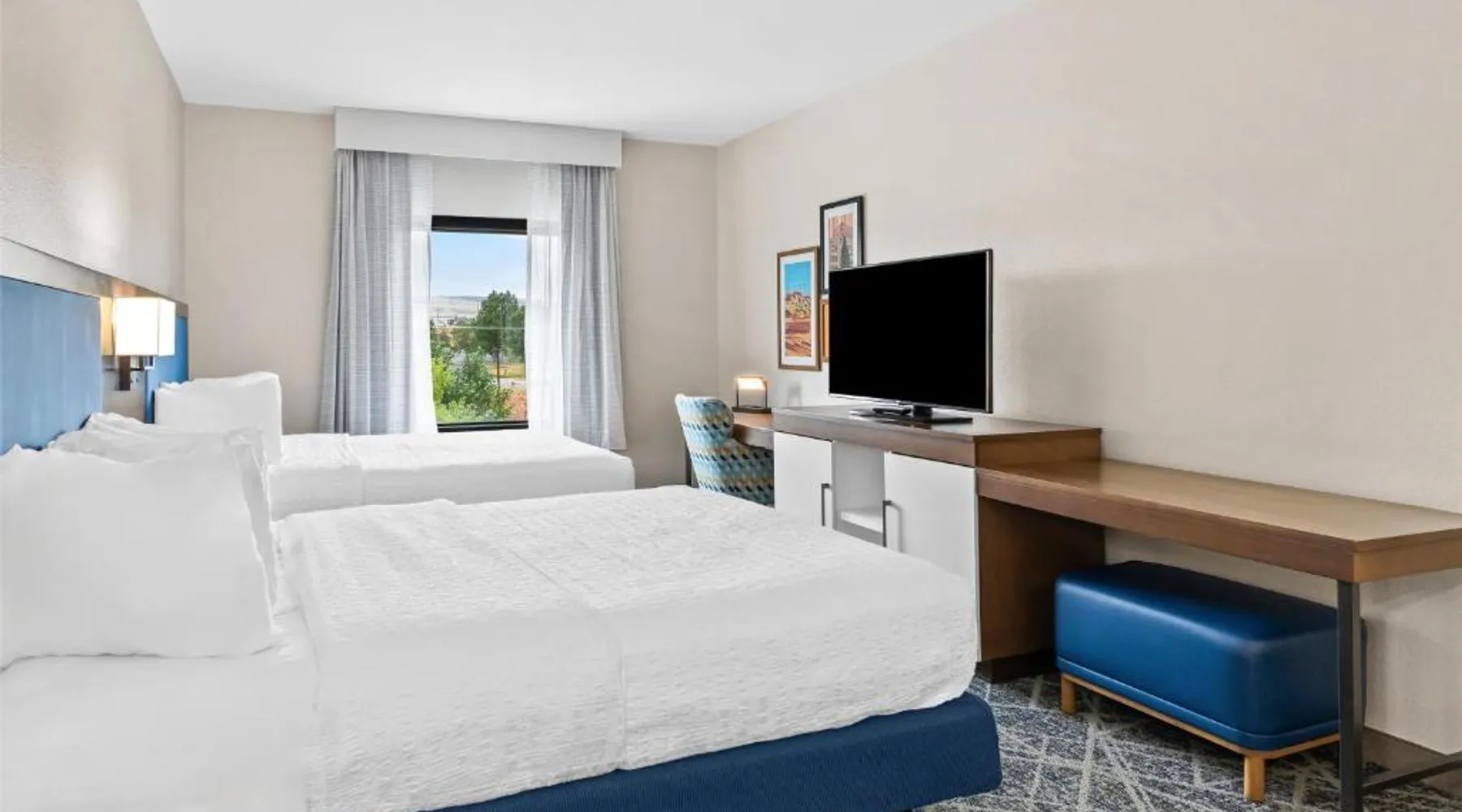 Comfortable Accommodations: Hampton Inn Laramie in Laramie offers family rooms with free WiFi, air-conditioning, and modern amenities. Each room includes a tea and coffee maker, hairdryer, refrigerator, microwave, shower, and TV. Leisure Facilities: Guests can enjoy an indoor swimming pool, fitness center, and hot tub. The property features a fitness room, elevator, outdoor seating area, and a minimarket. Free on-site parking is available. Convenient Location: Located 9.3 mi from Laramie Regional Airport and 1.2 mi from War Memorial Stadium, the hotel is near an ice-skating rink. The surrounding area offers various attractions. Guest Services: The hotel provides a 24-hour front desk, daily housekeeping, room service, and a daily breakfast. Guests appreciate the attentive staff, room cleanliness, and the quality of the breakfast provided by the property. This room features a flat-screen TV, a work desk and tea and coffee-making facilities.